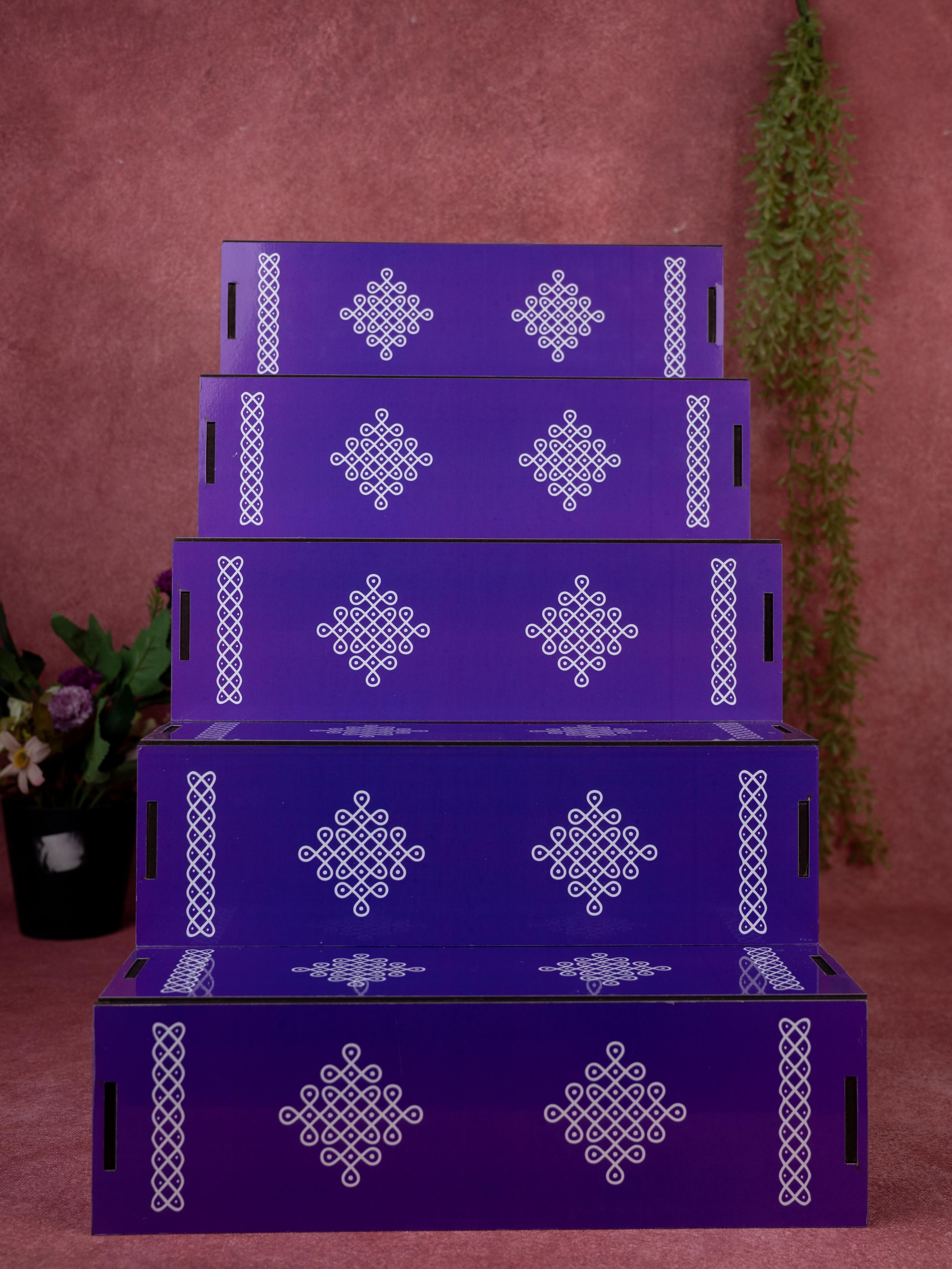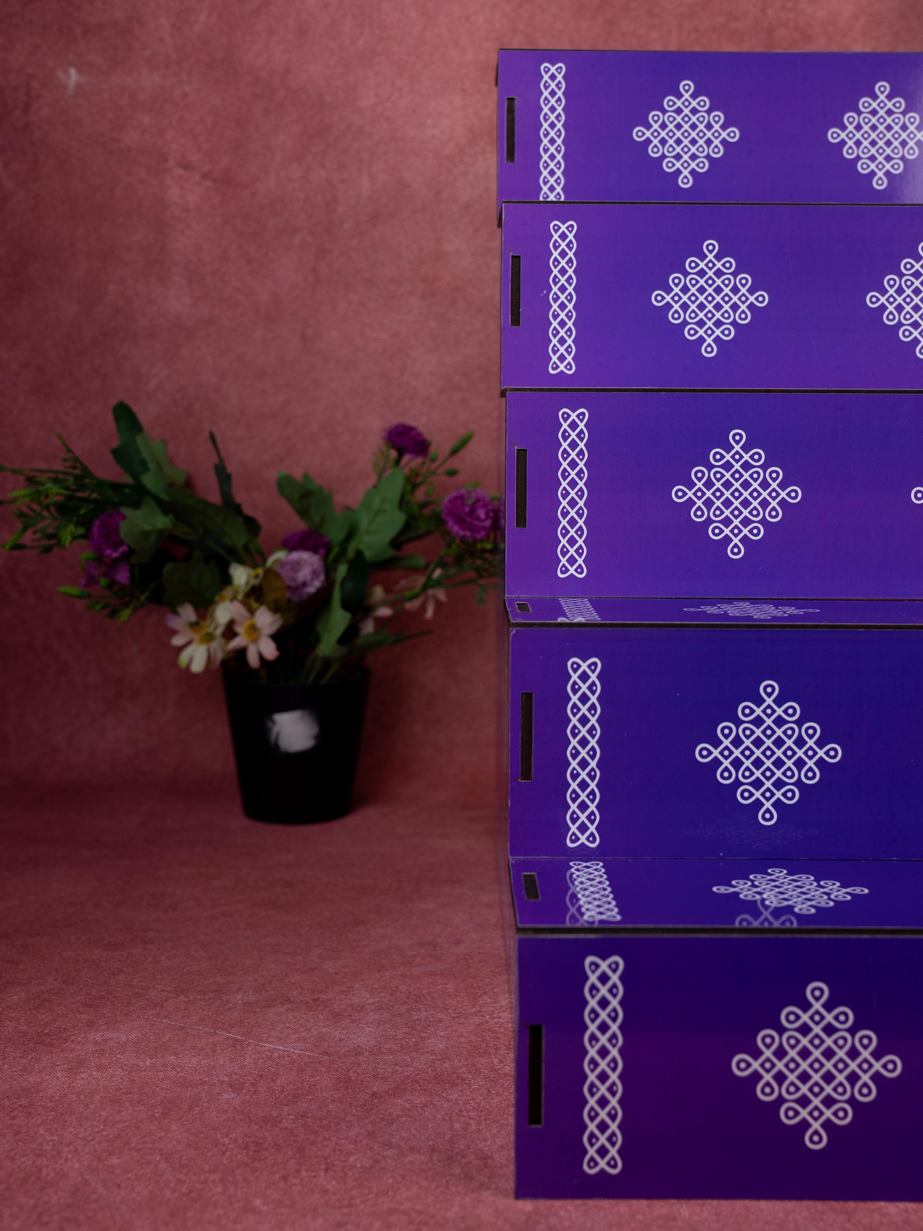 - This Padi here is Made from Purple Colored with a Glossy Finish, each Decorated with White kolam Style Patterns for a Festive Look.