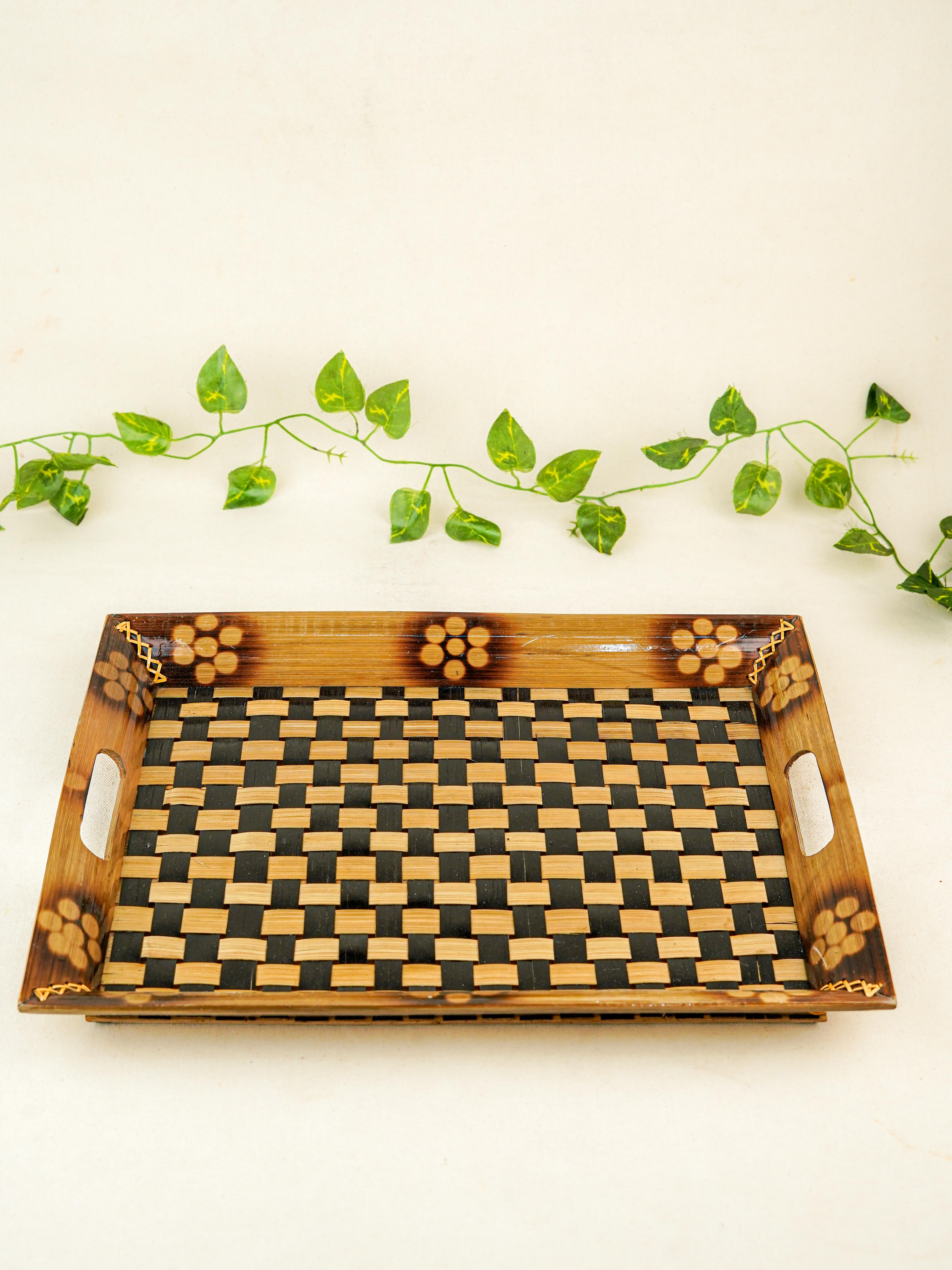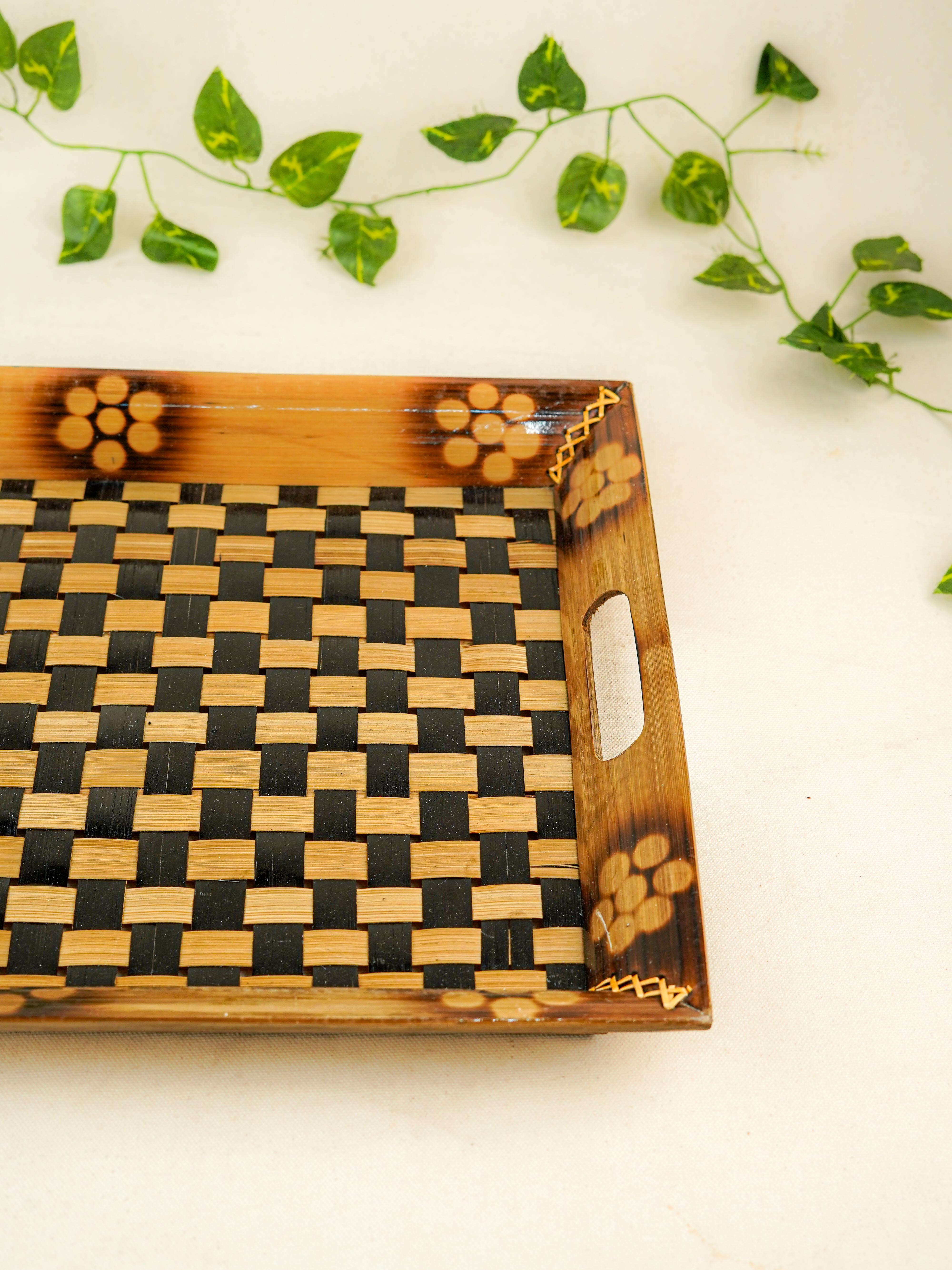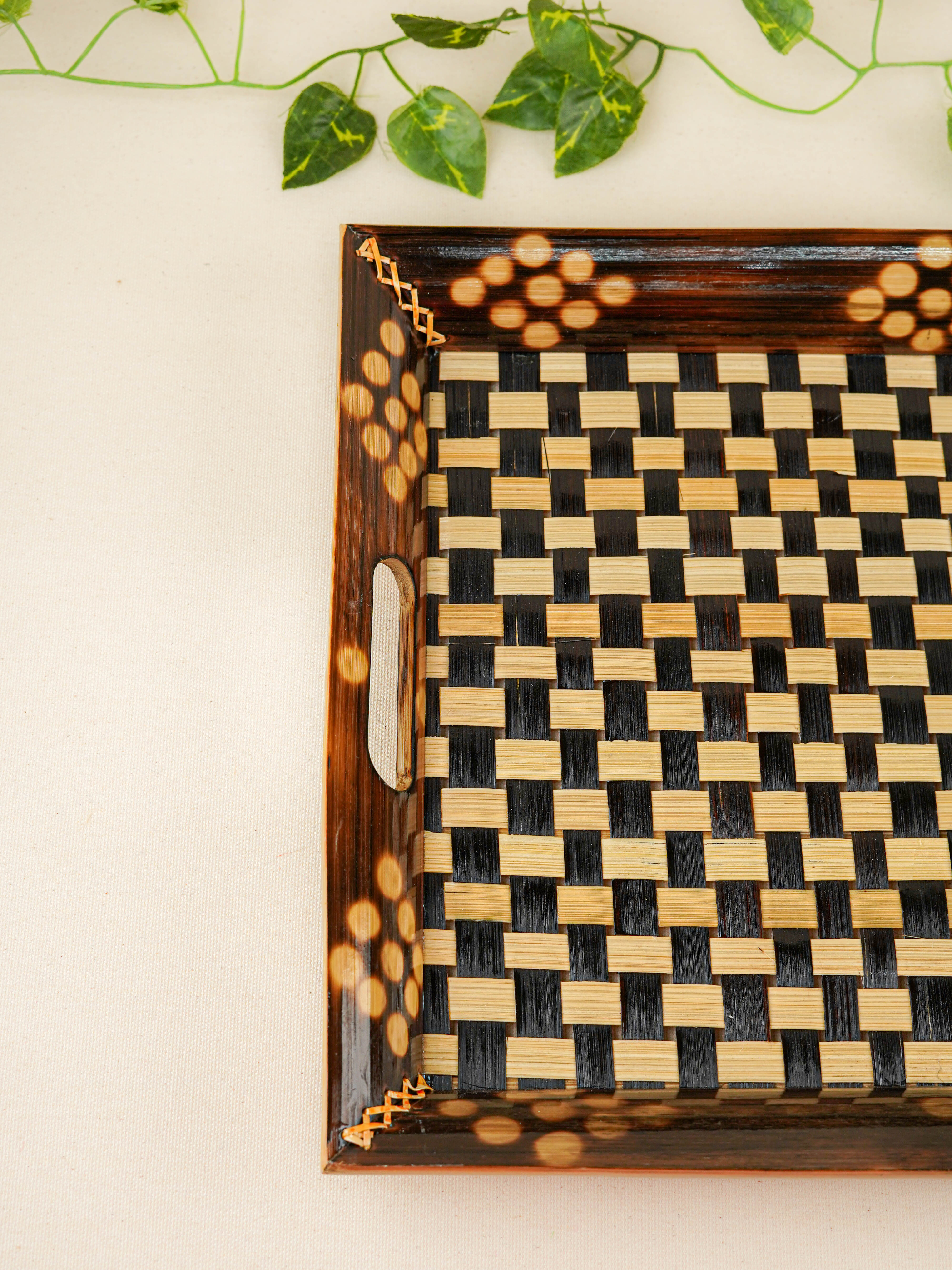 - Bamboo Tray Featuring a Handwoven Checkered Pattern made from Alternating Light and Dark Bamboo Strips.