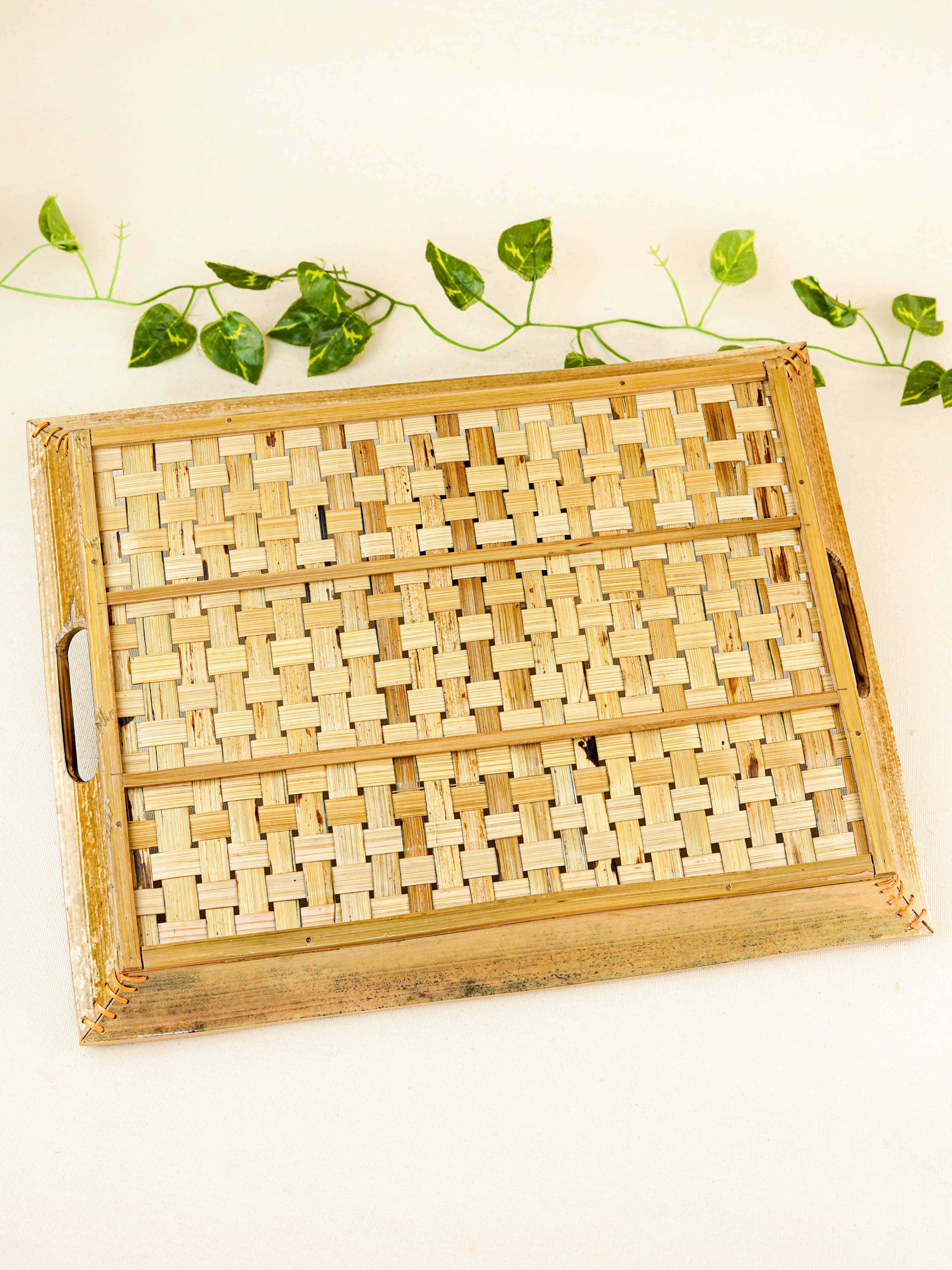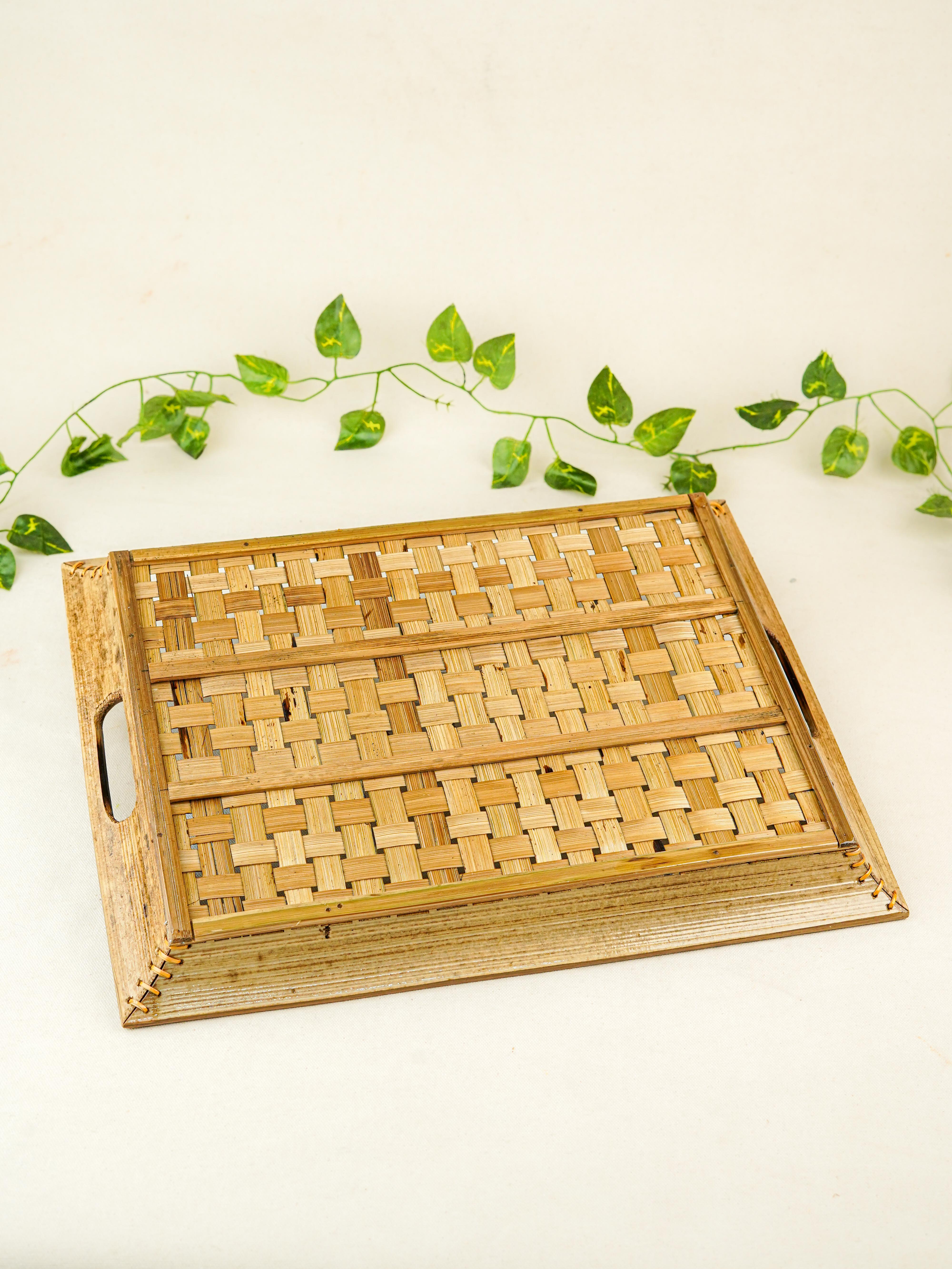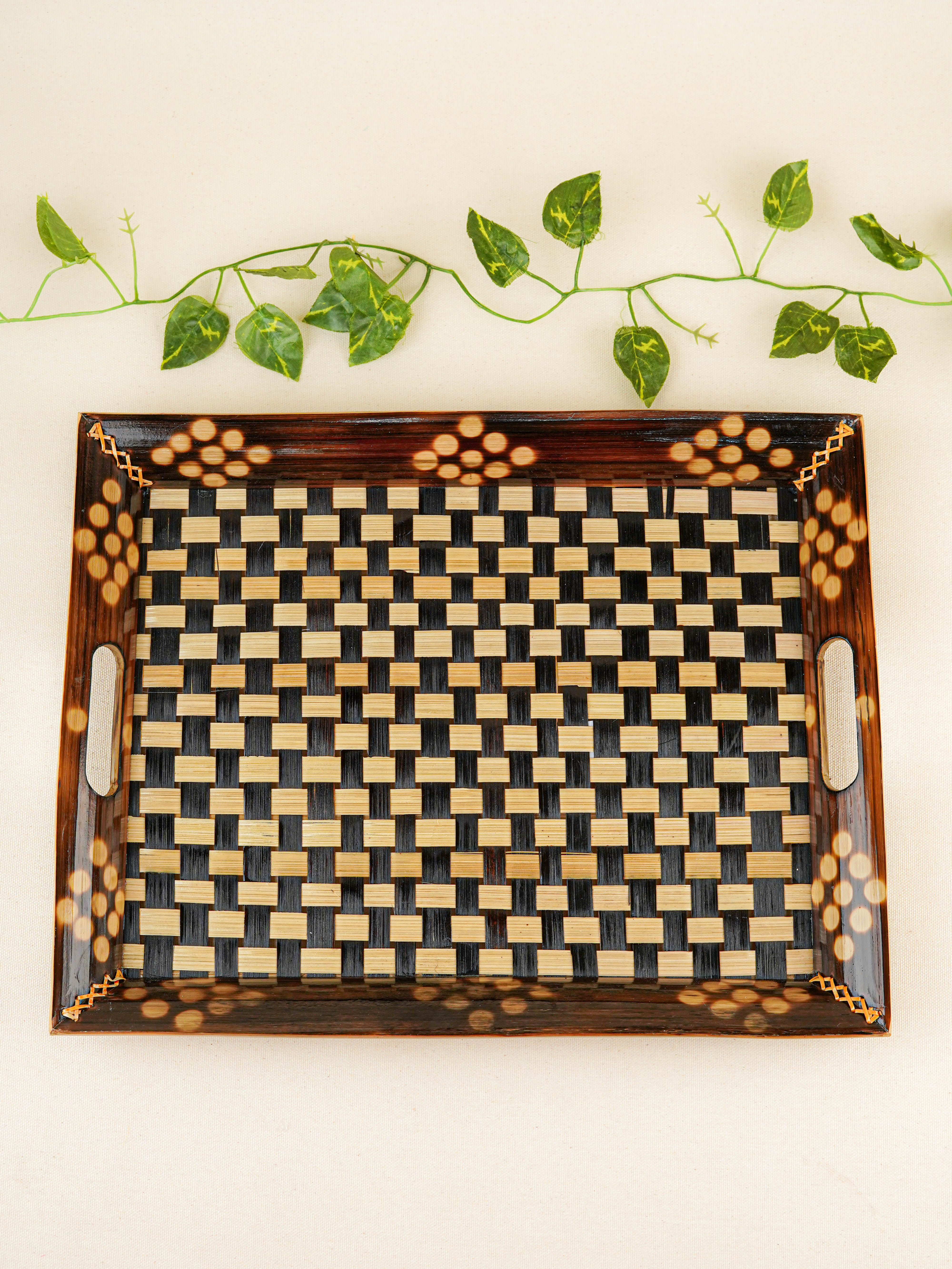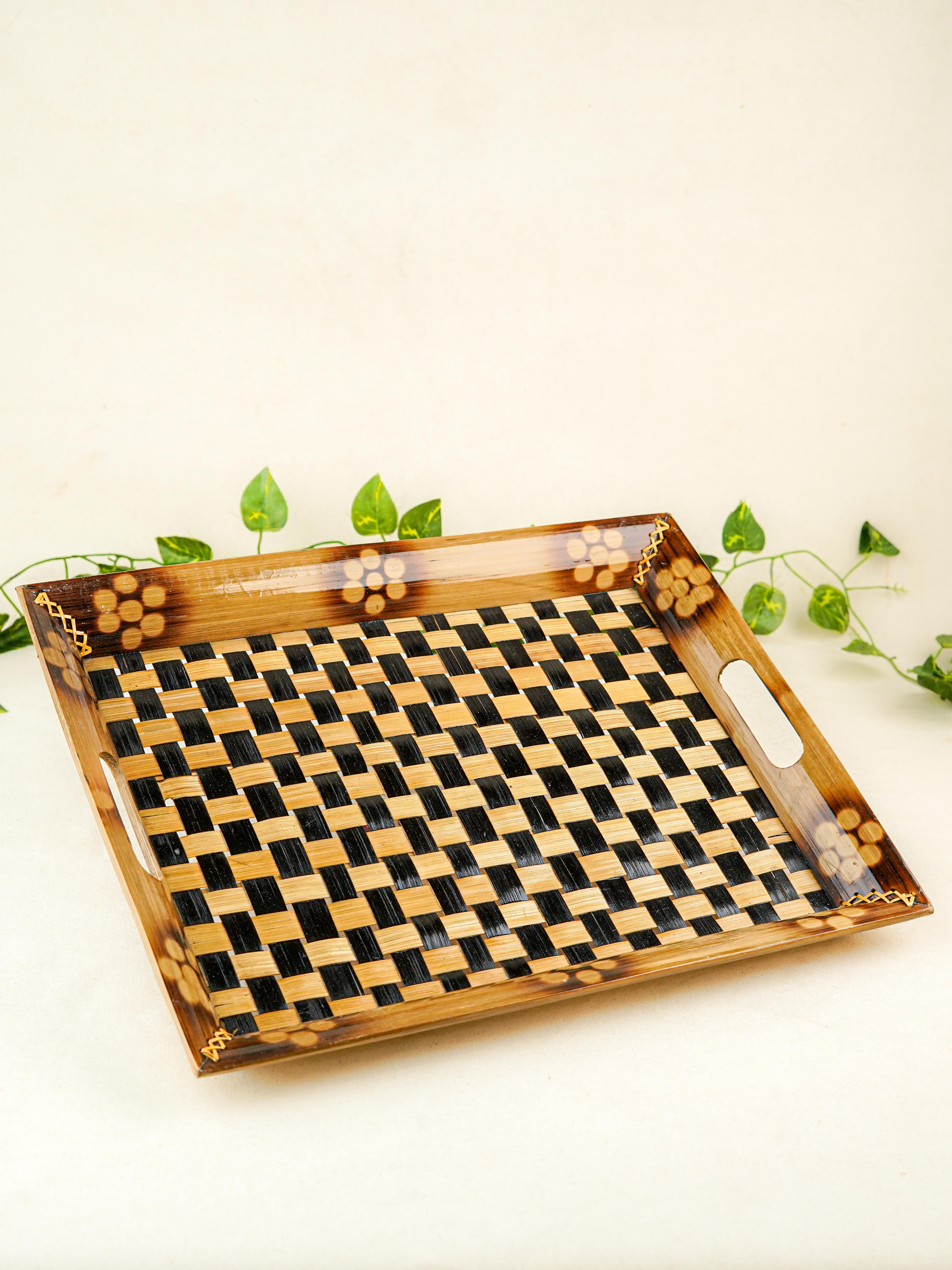 - Bamboo Tray Featuring a Handwoven Checkered Pattern made from Alternating Light and Dark Bamboo Strips.