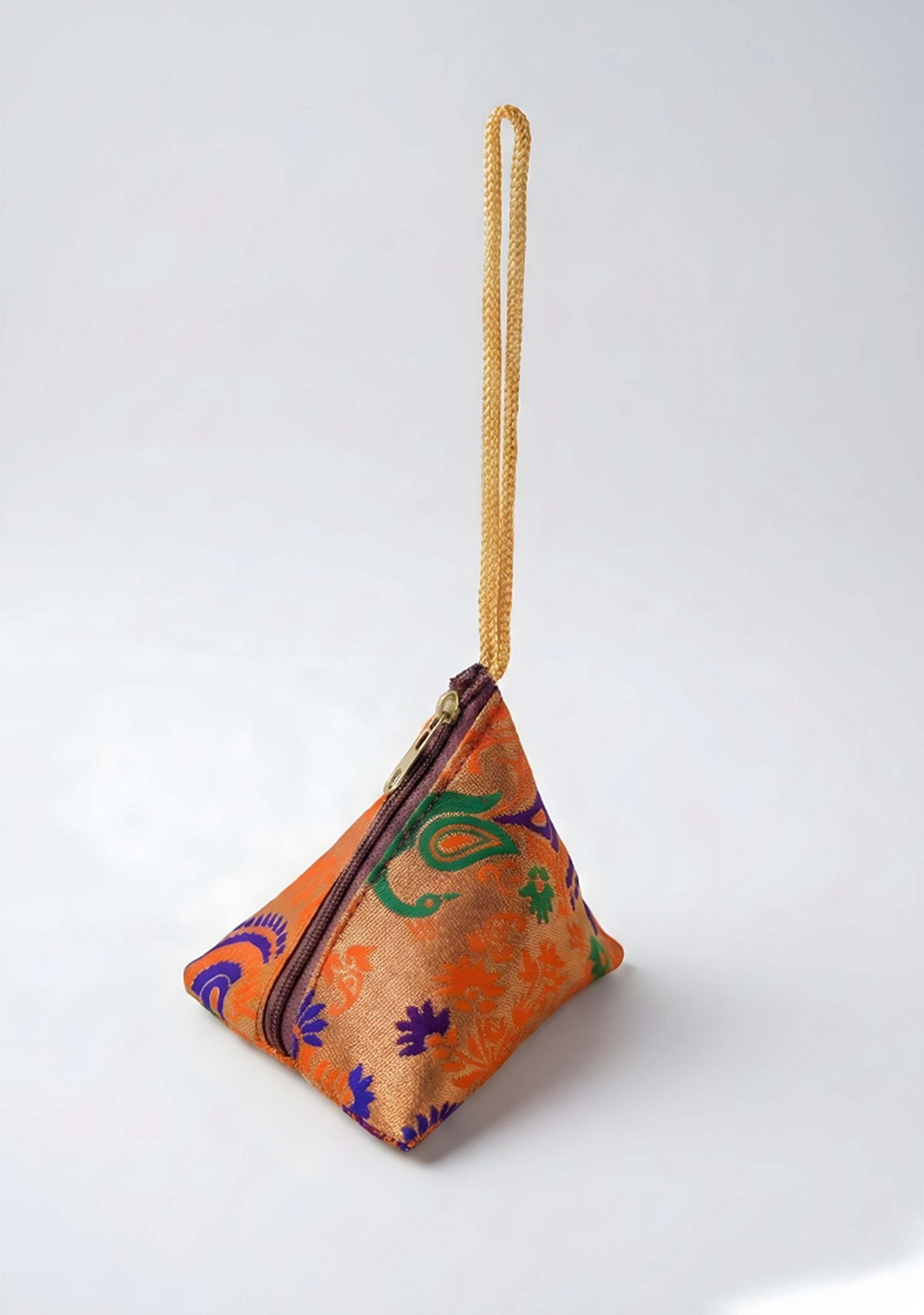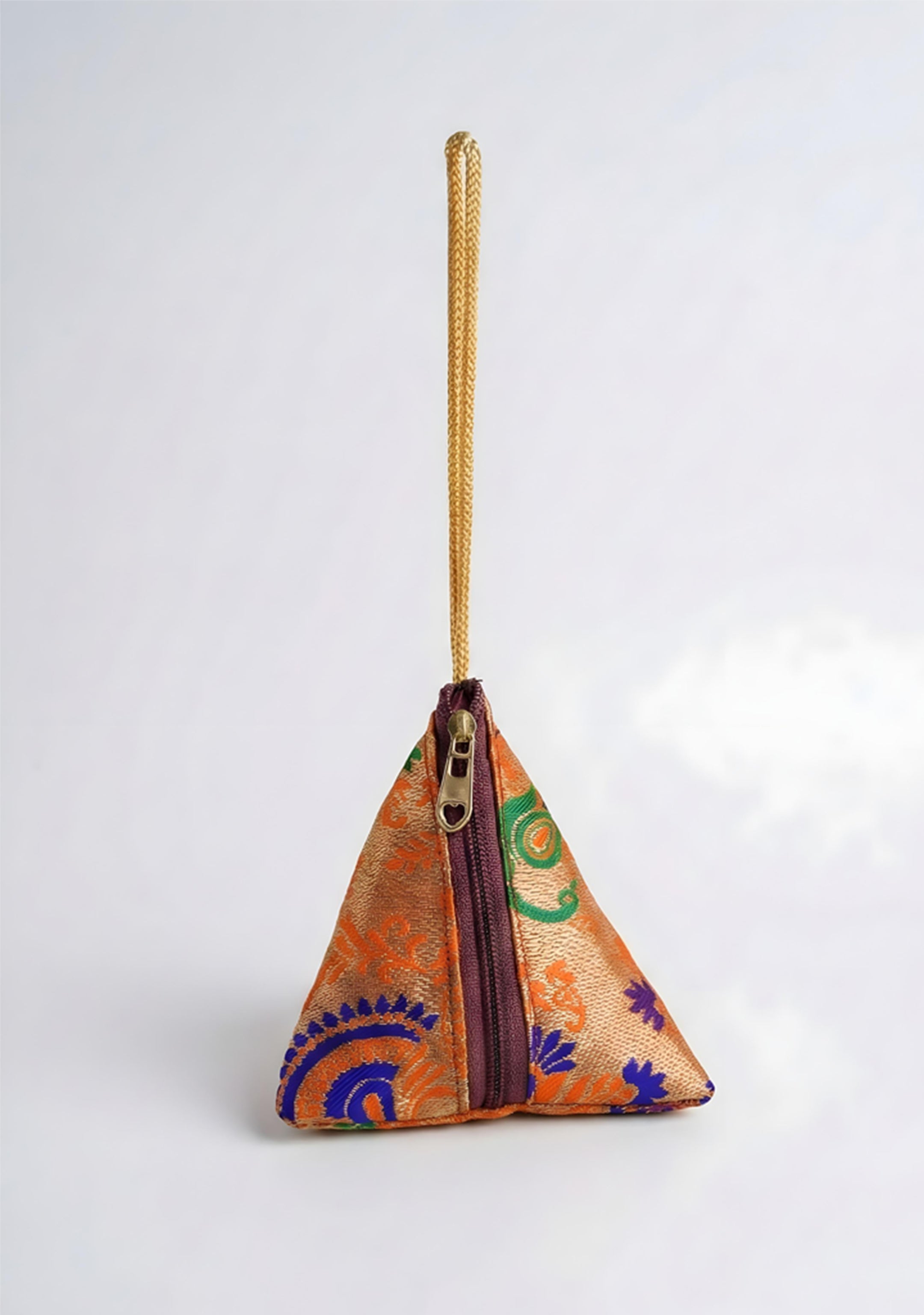 - Small Triangle Shaped Fabric Pouch with an Elegant, Traditional Look.