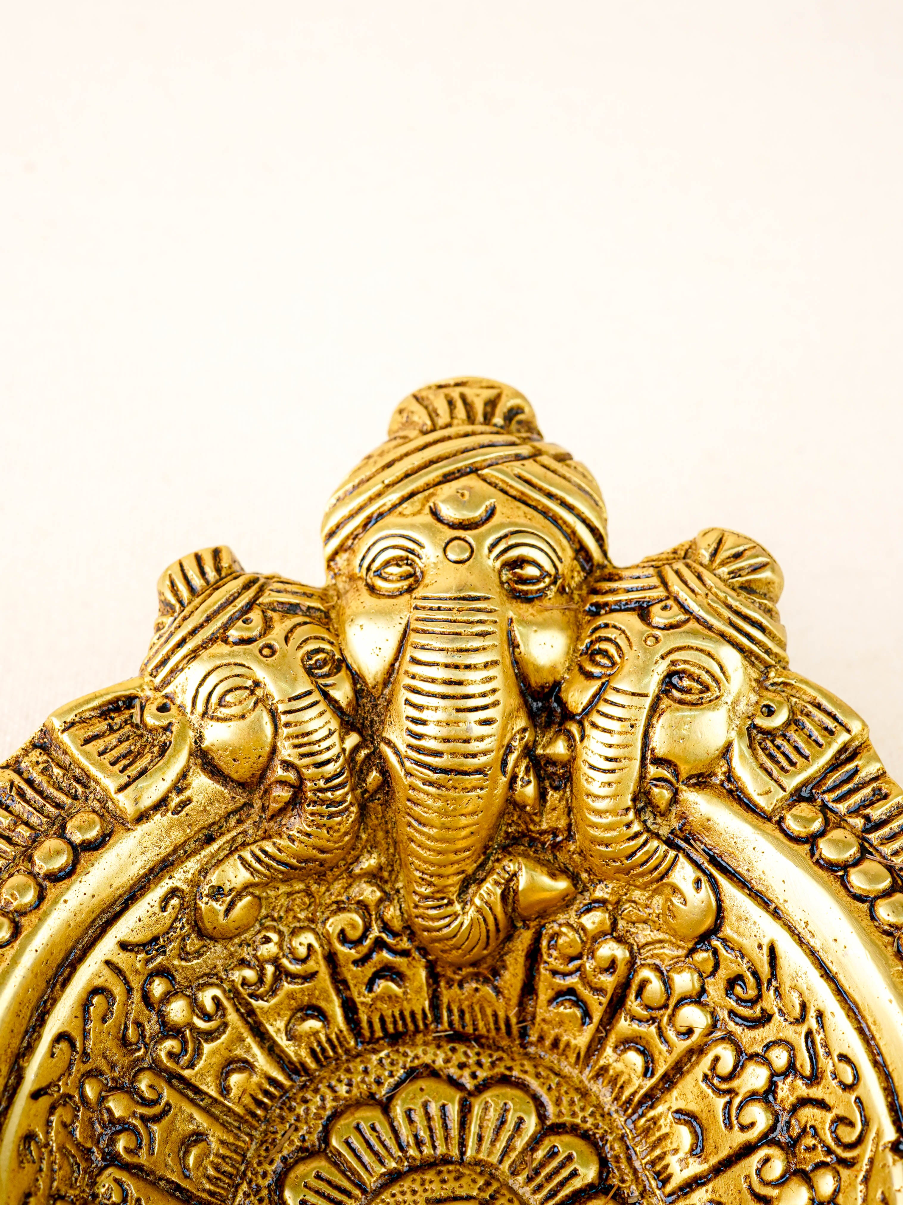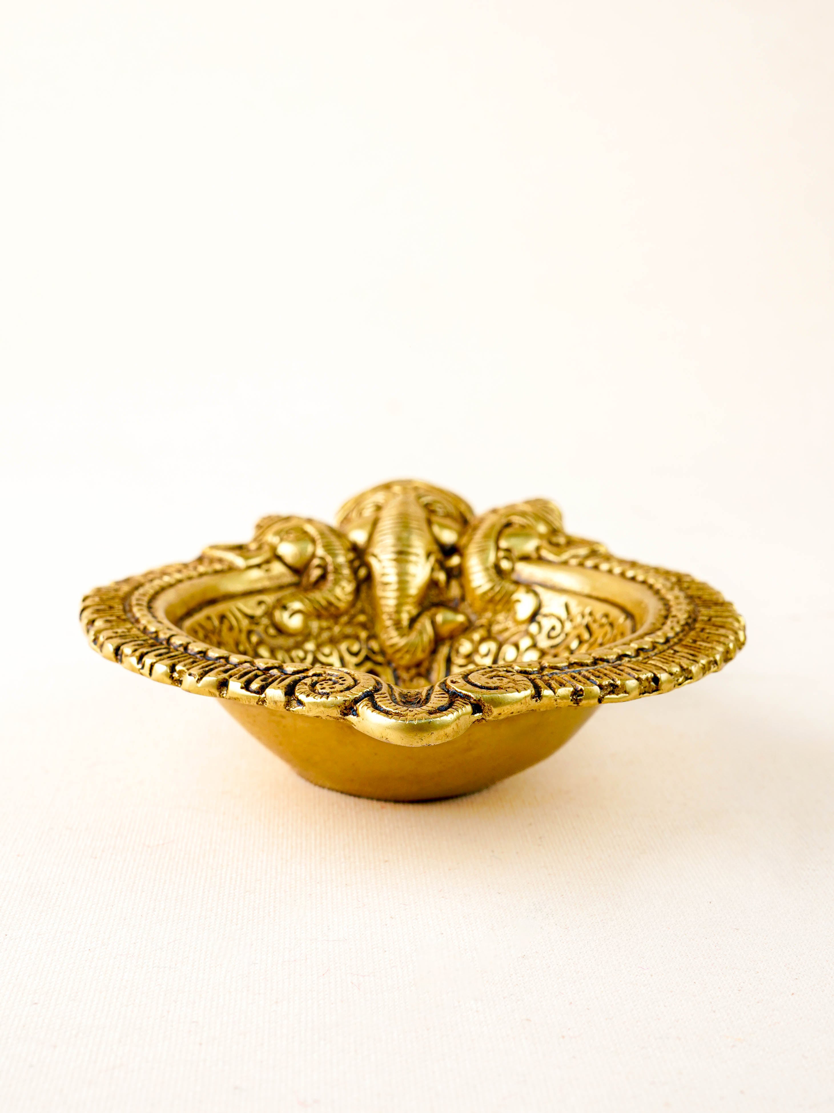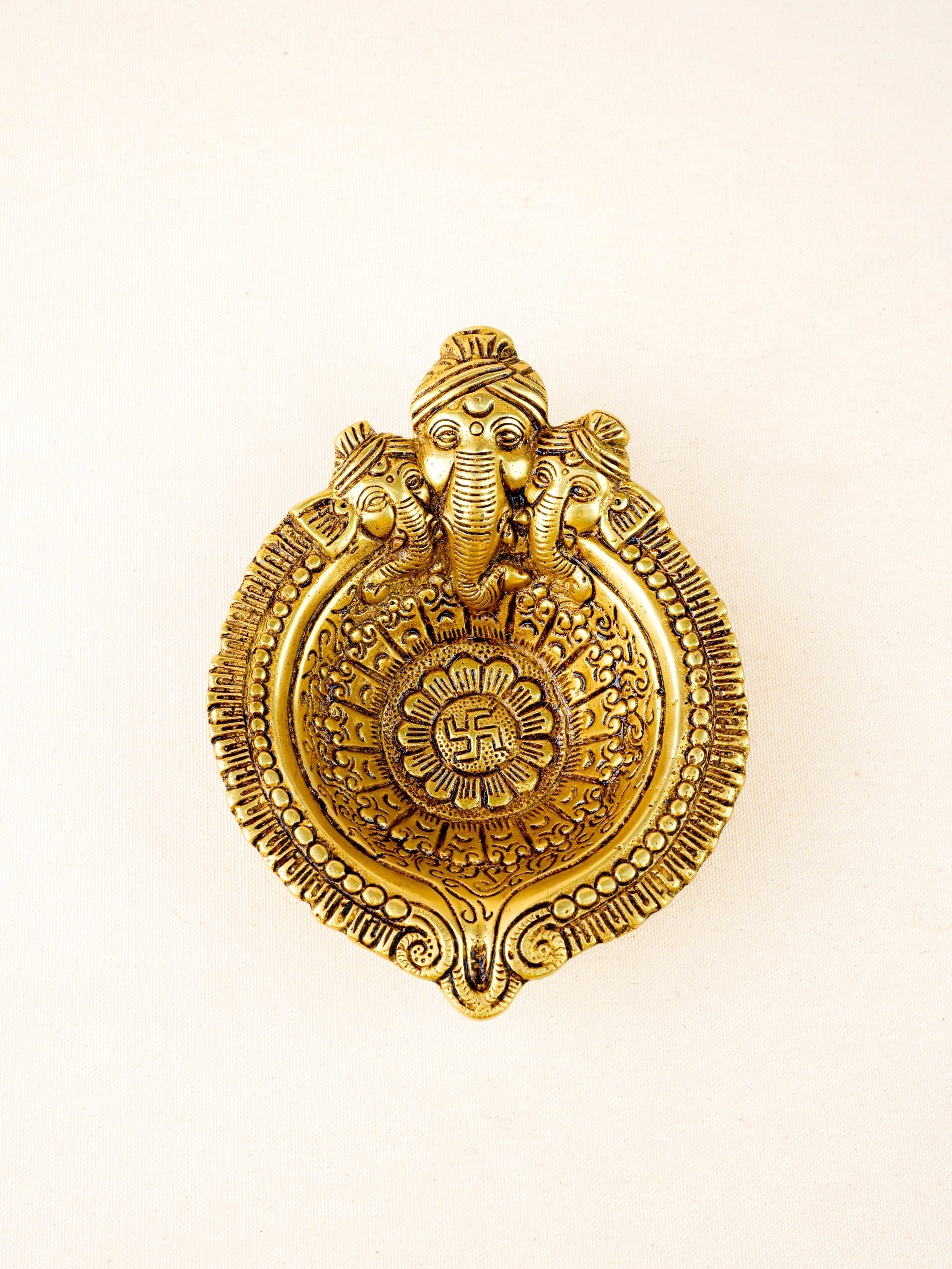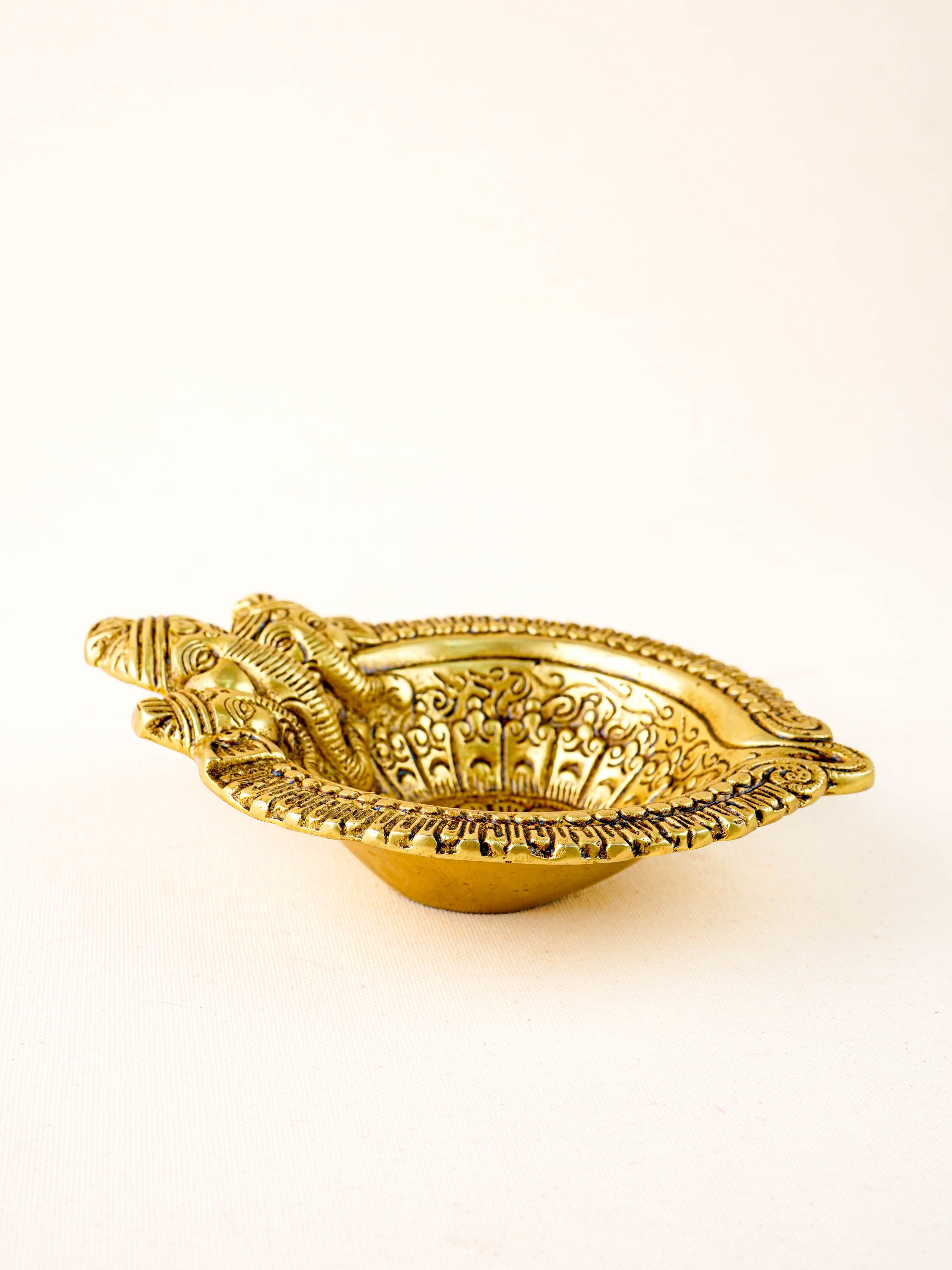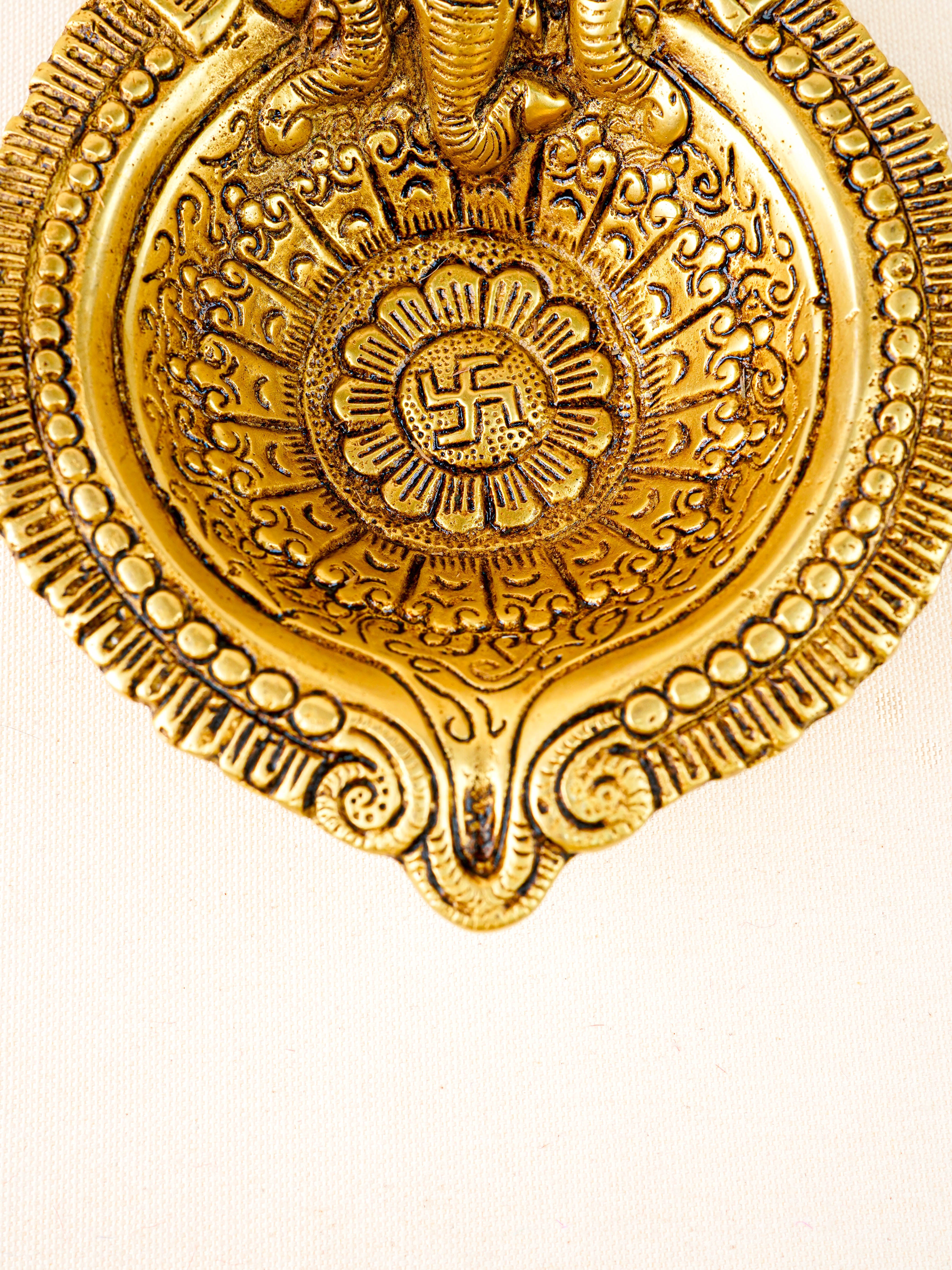 - Beautifully Crafted Brass Diya Featuring the Divine Presence of Lord Ganesha, Symbolizing Wisdom, Prosperity, and the Removal of Obstacles.