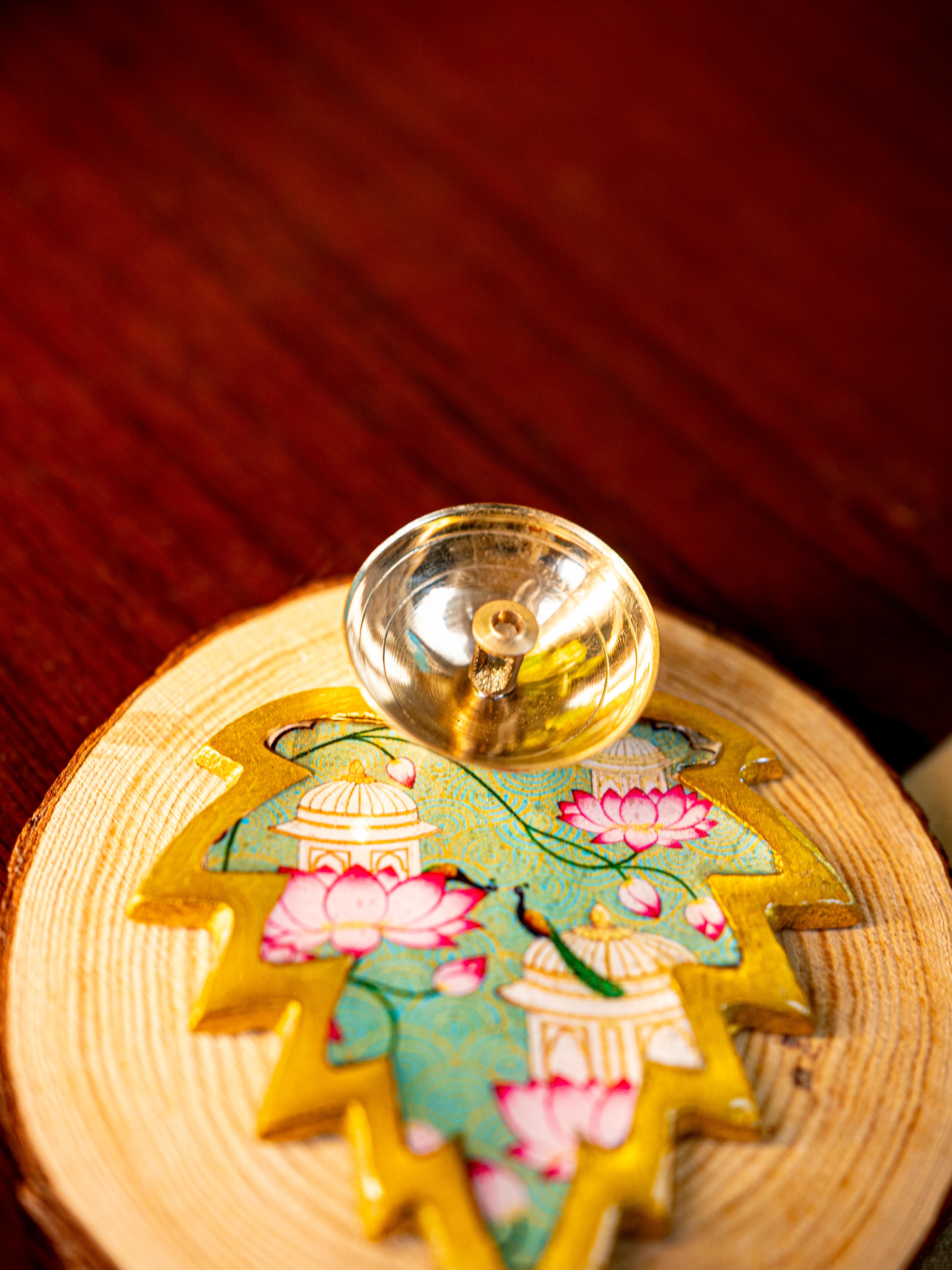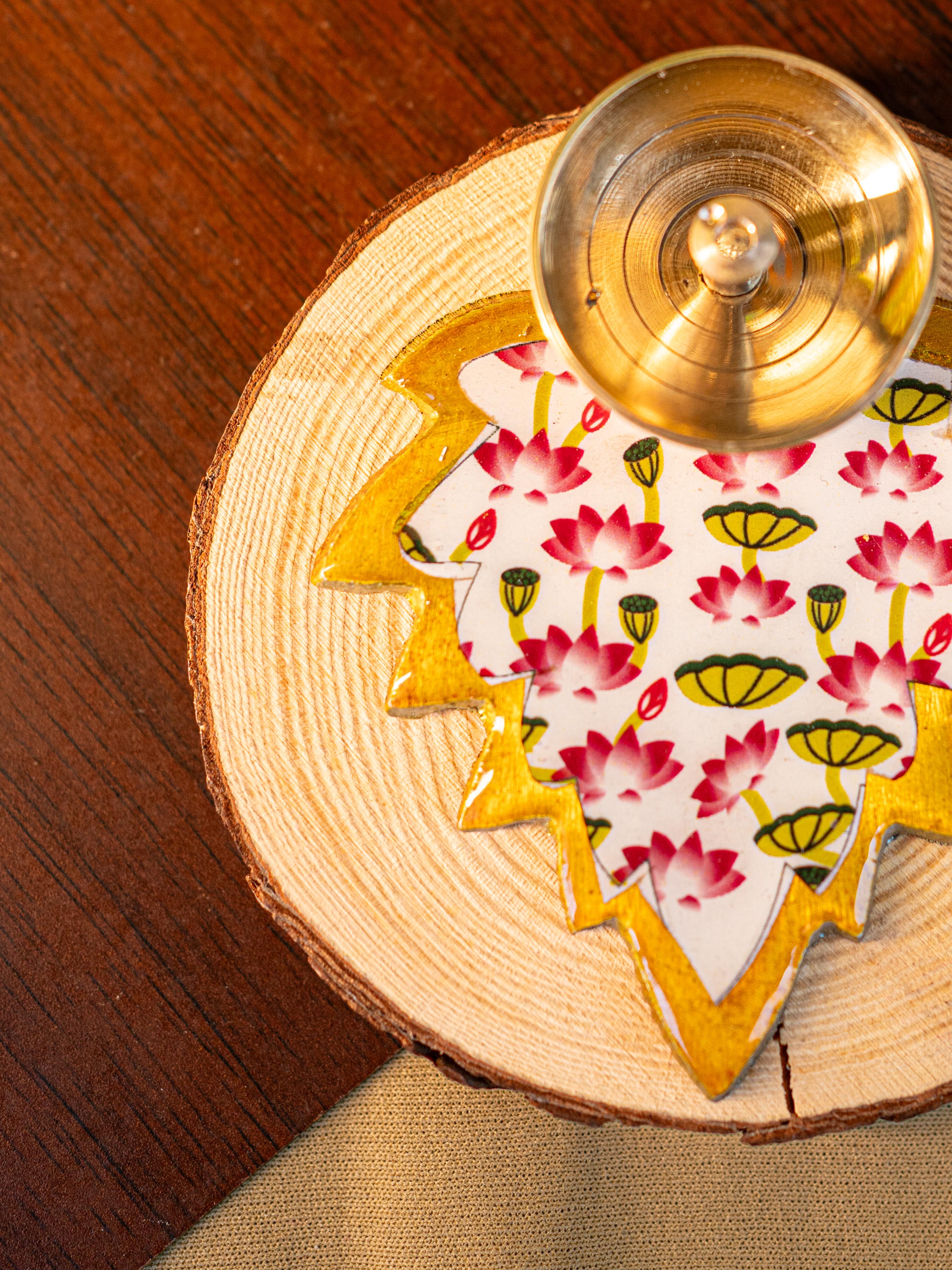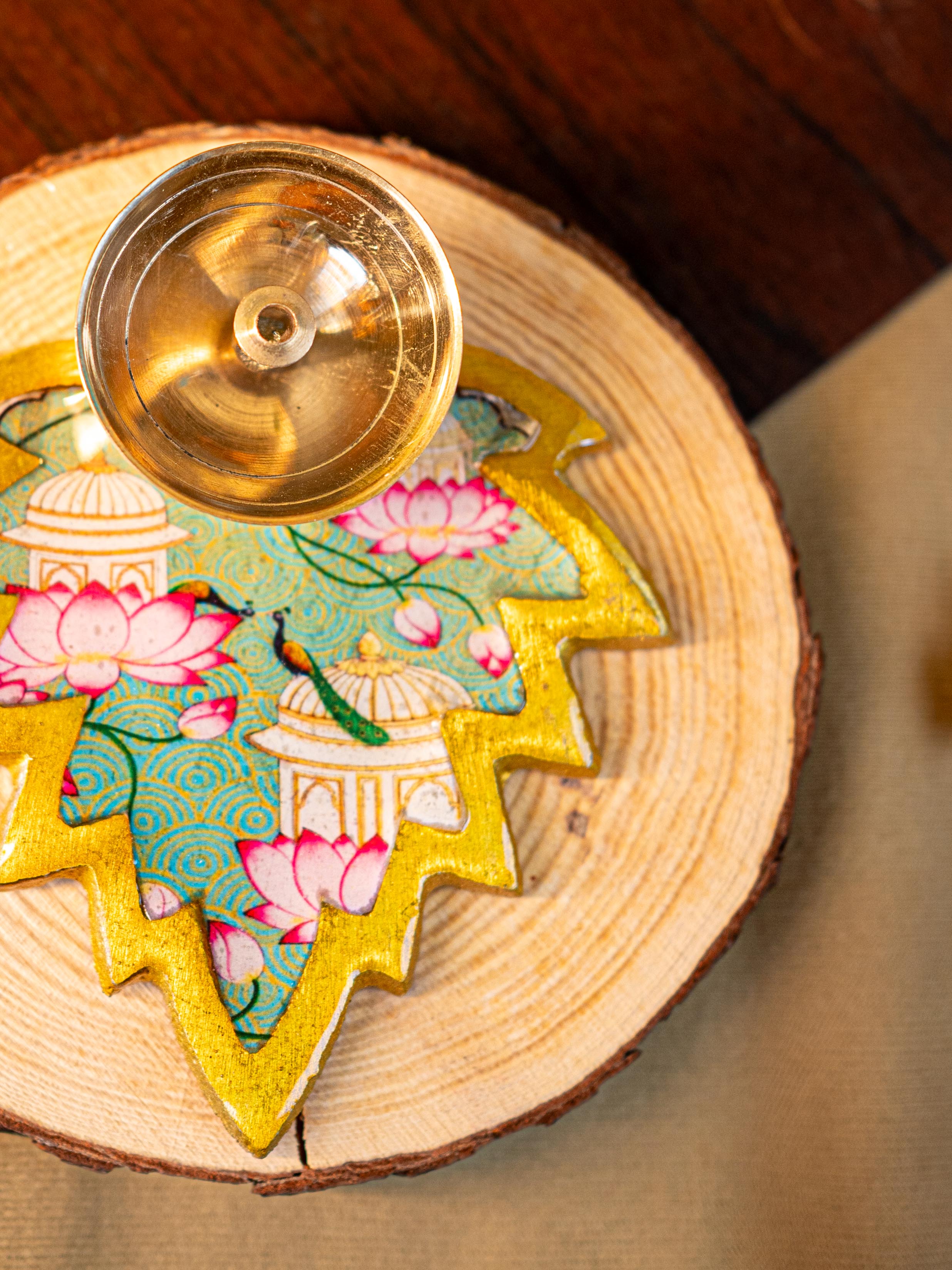 - The Base is Shaped like a Leaf Design with Golden Edges.