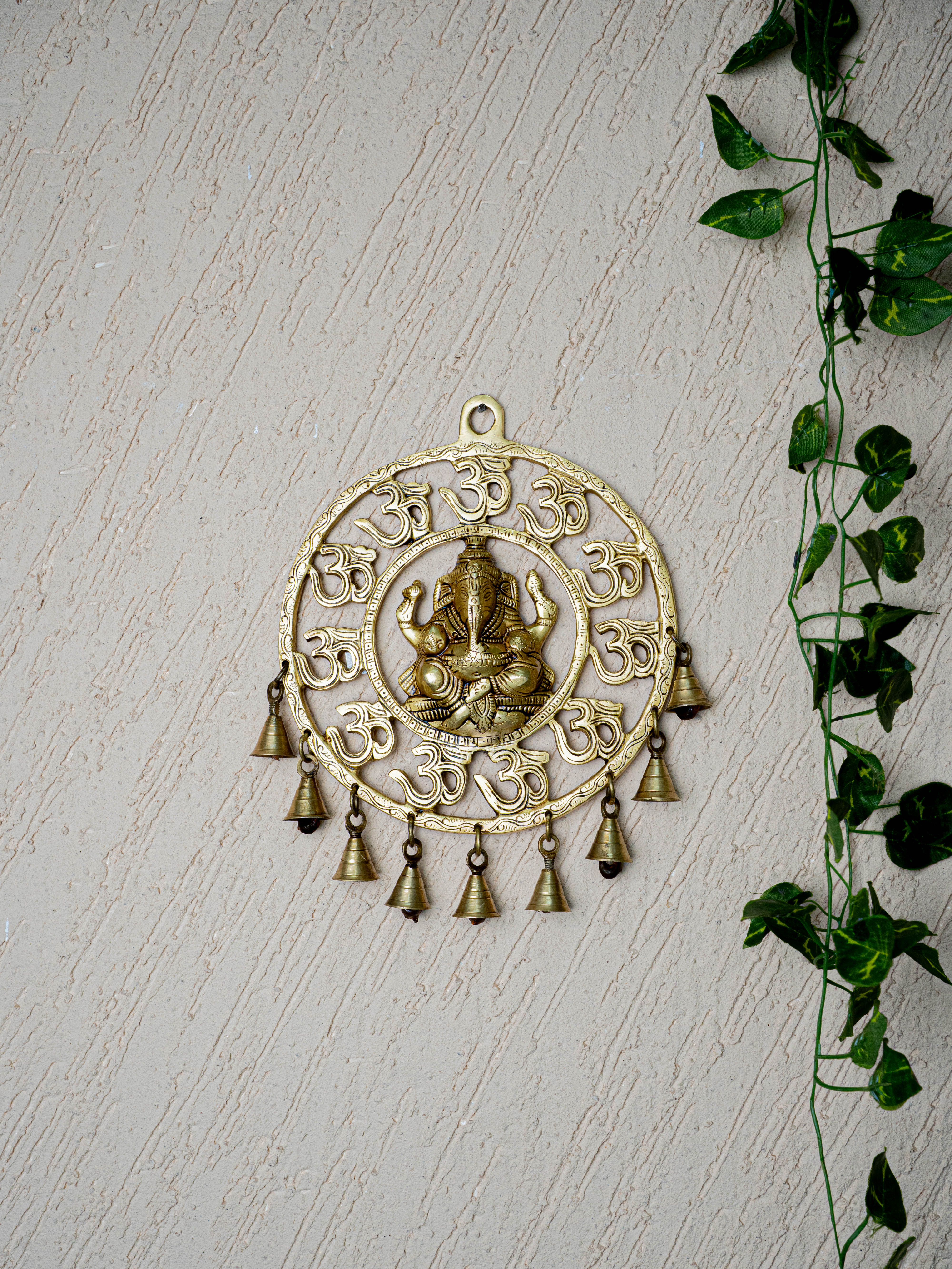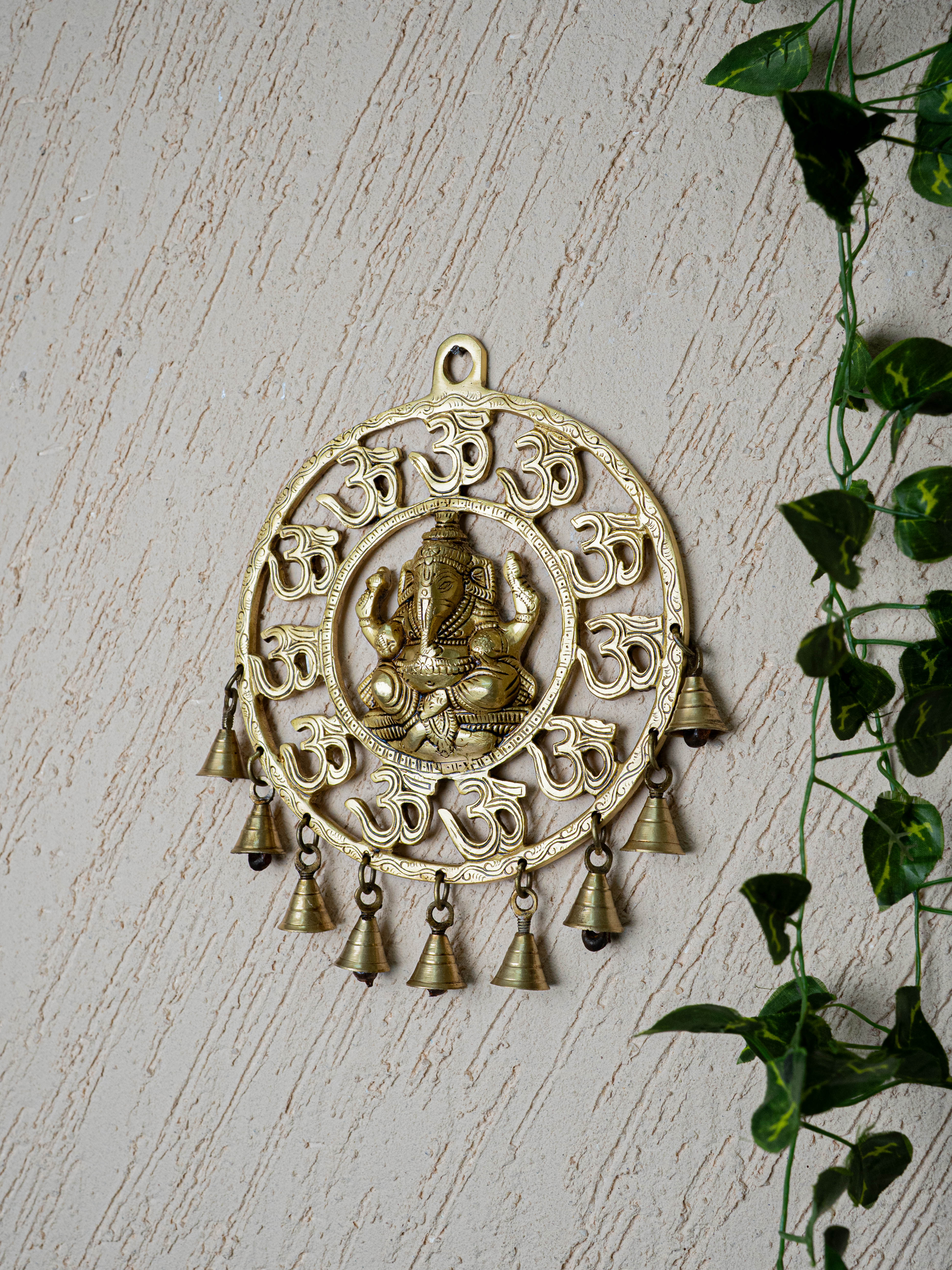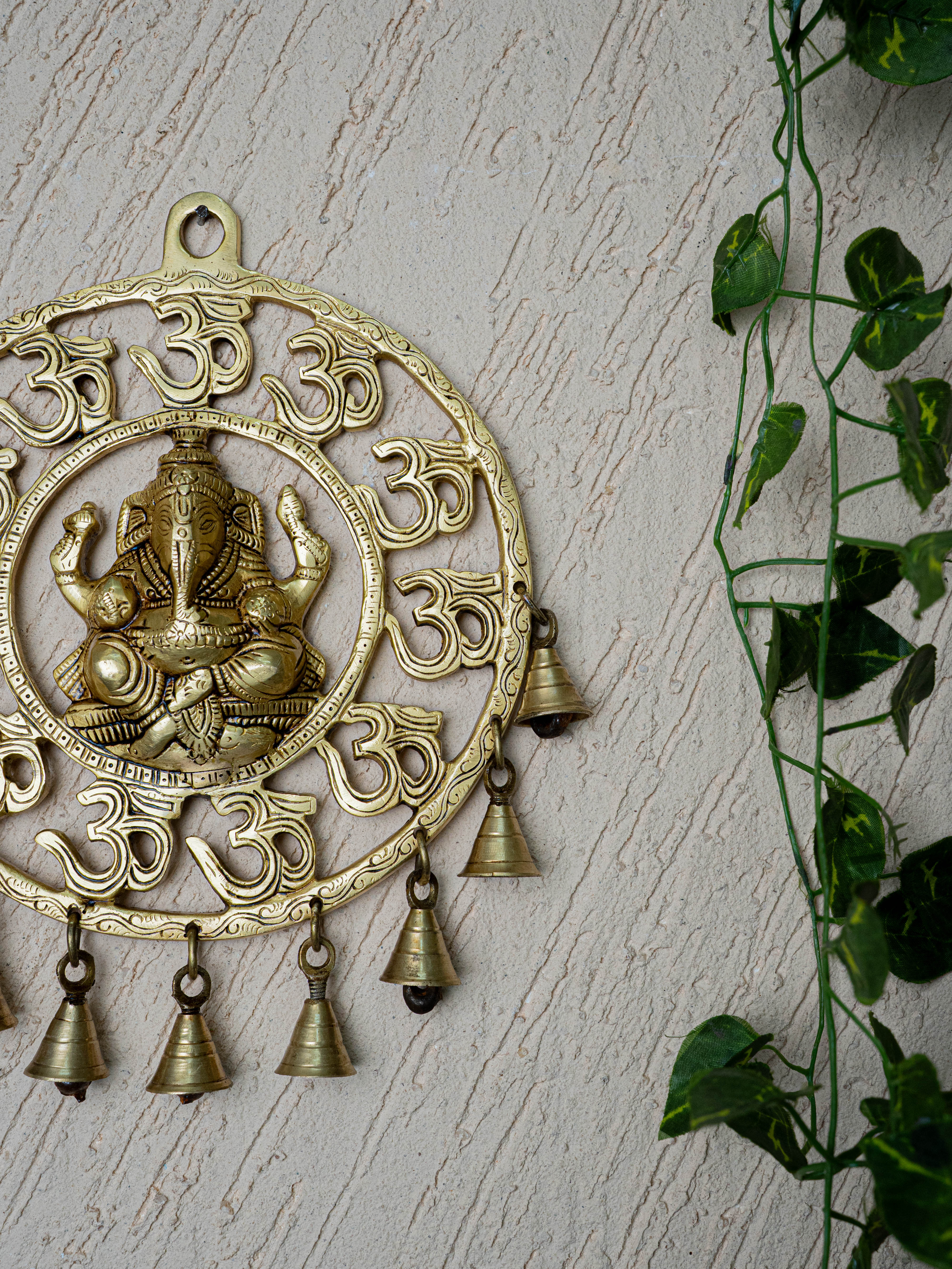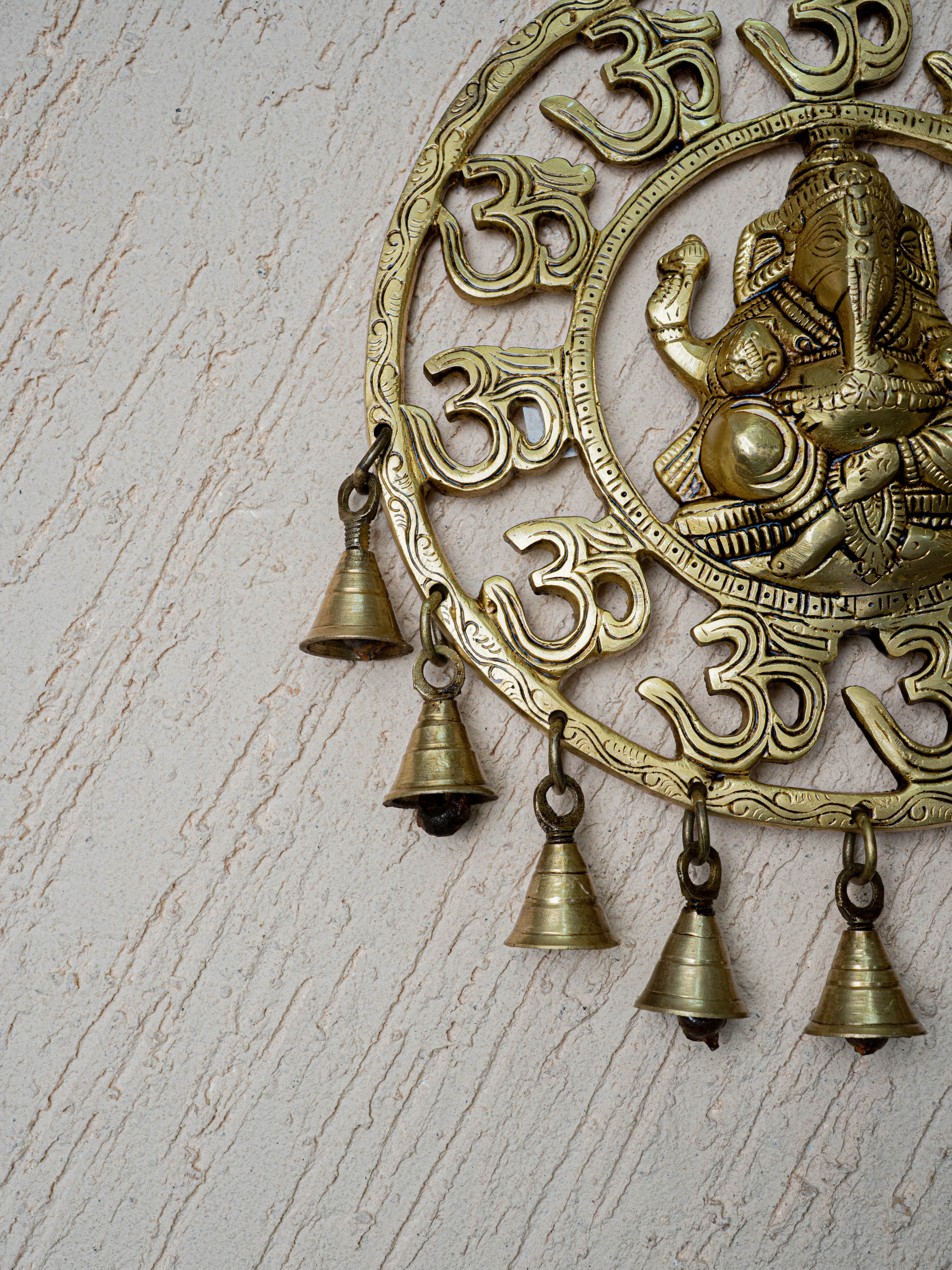 - Surrounding Lord Ganesha, features a traditional Circle-like design embellished with additional detailed carvings of Om Design with 9 Bells.
