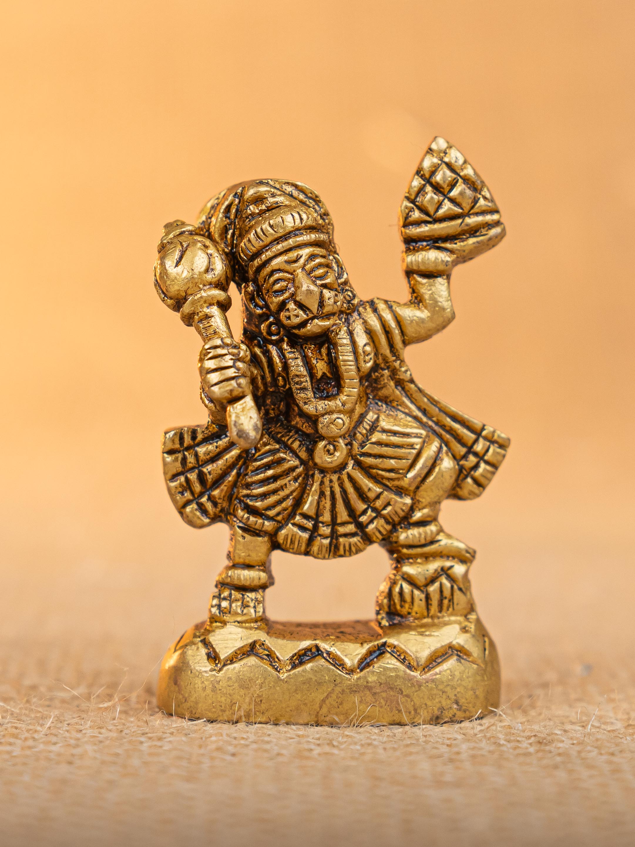 - This Miniature Idol Showcases Lord Hanuman in a Dynamic, Standing Posture with One Hand raised holding the Sanjeevani Mountain and Gada.
