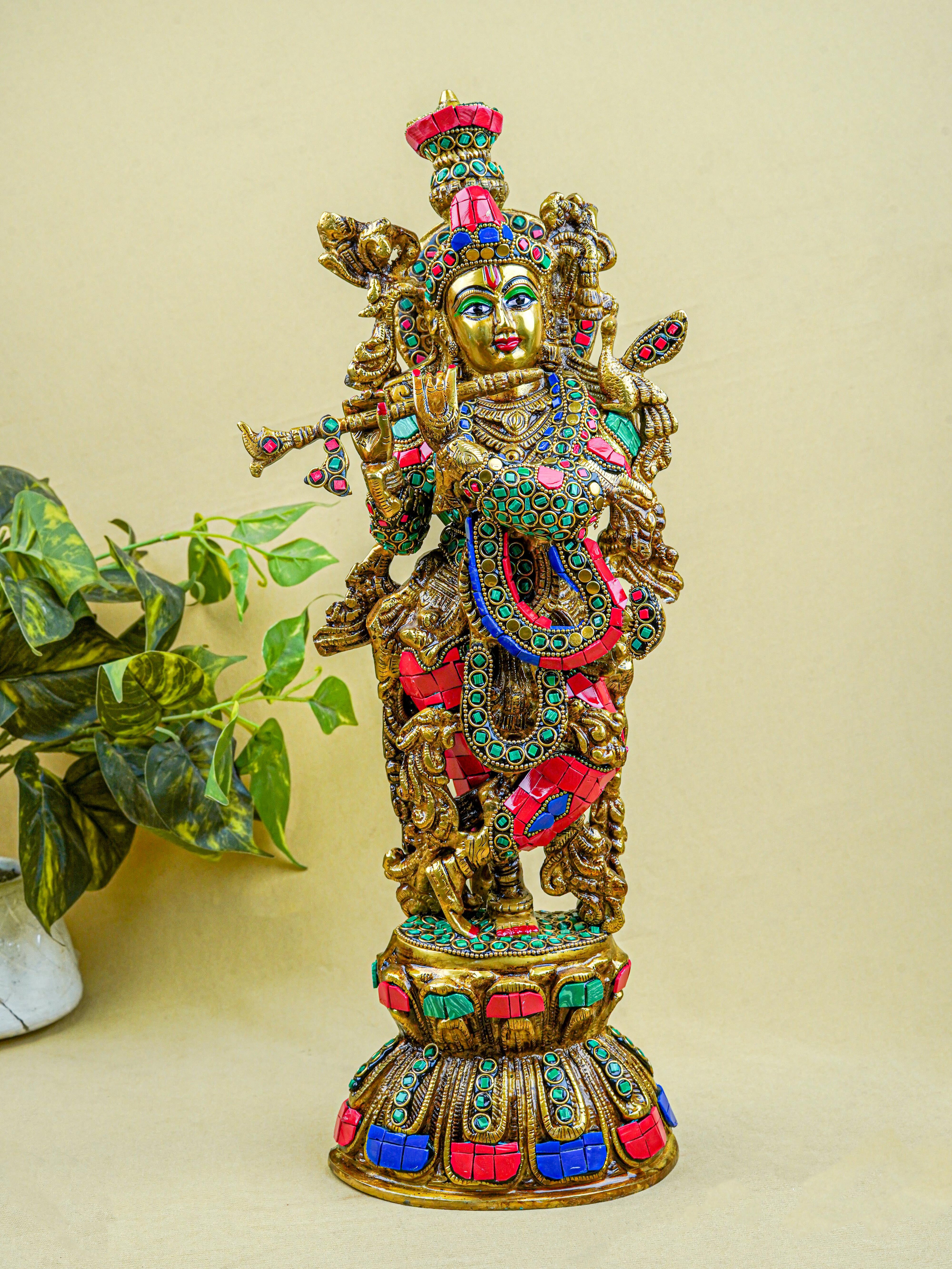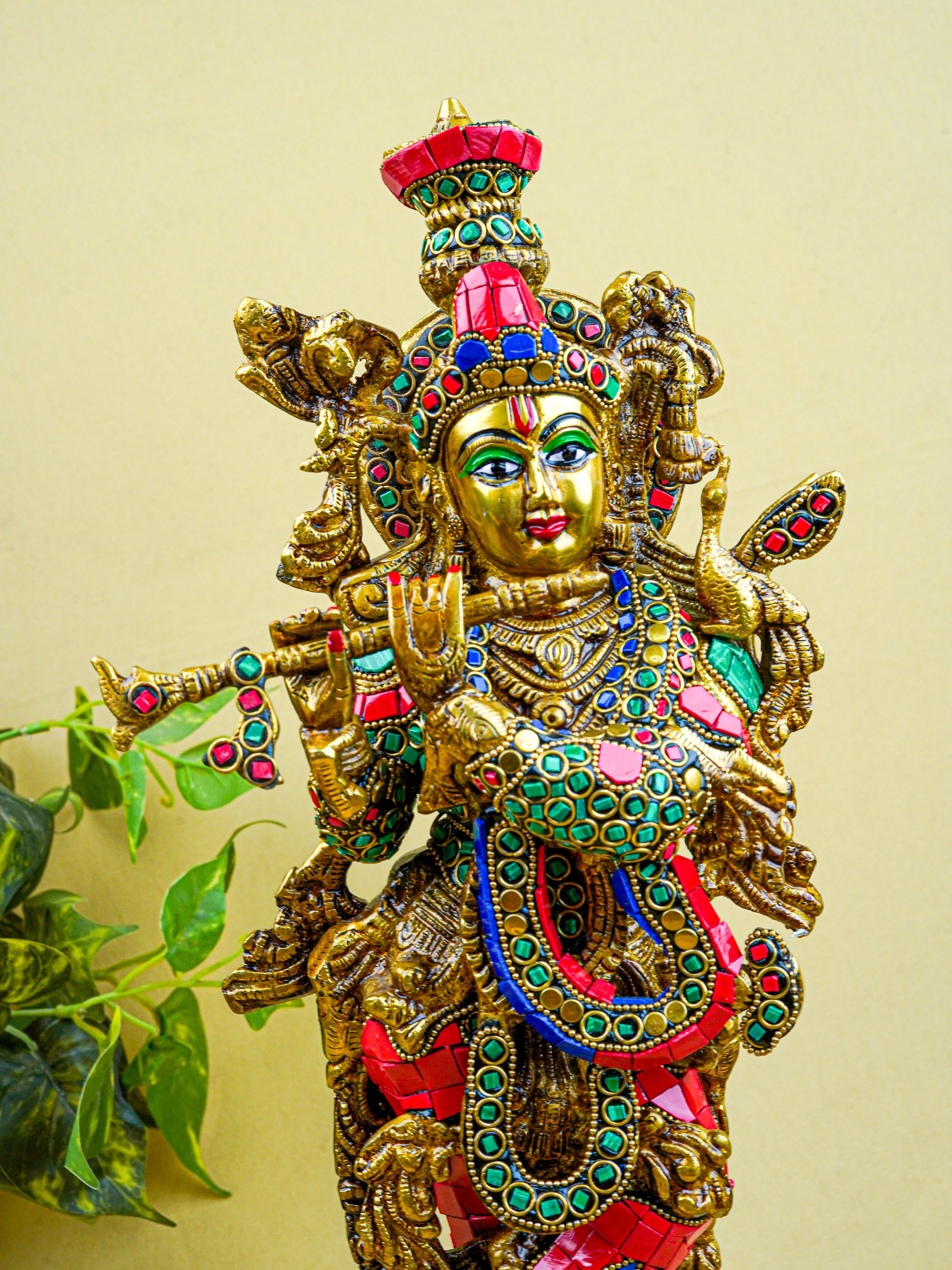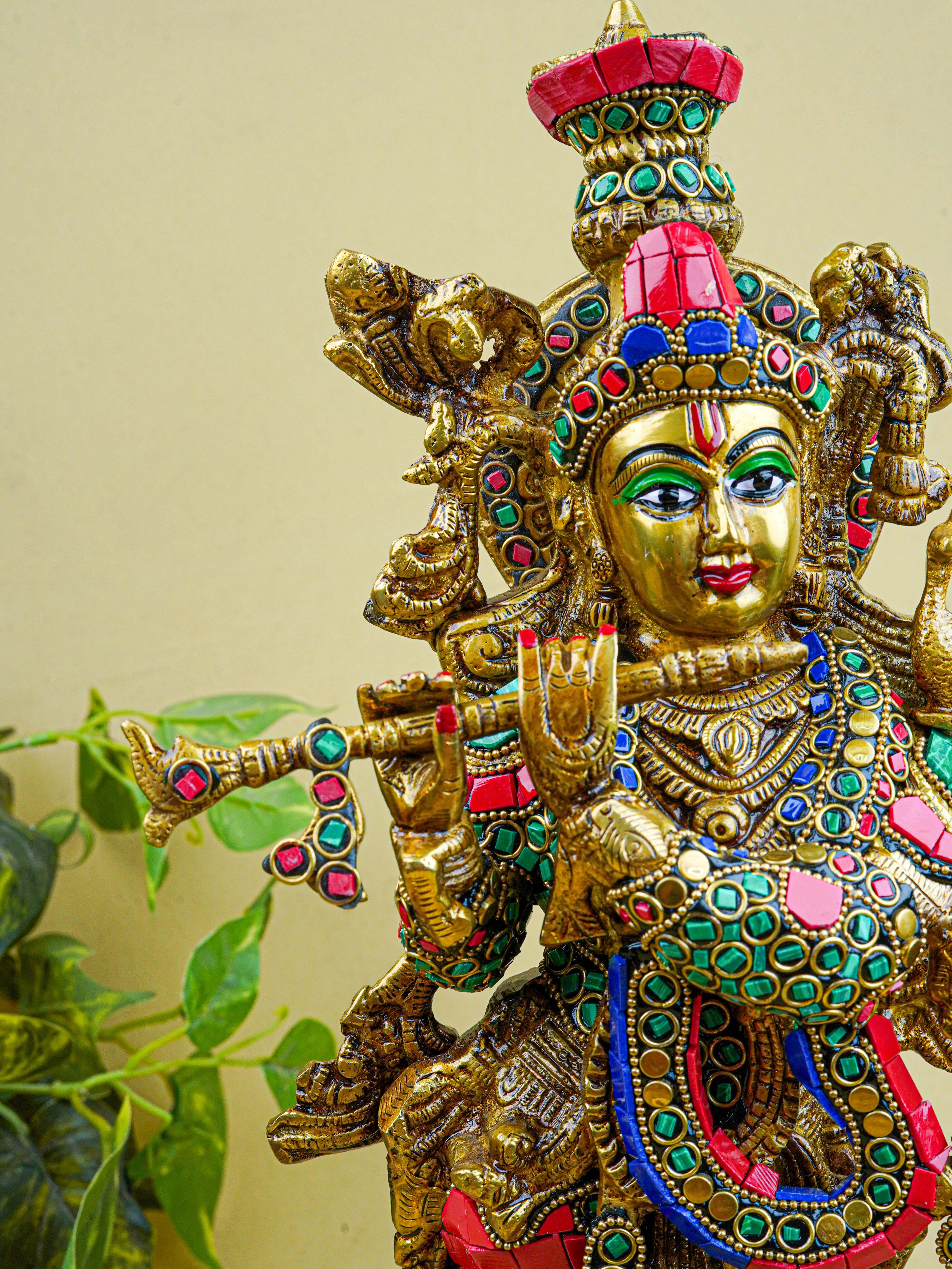 - This magnificent figurine of Lord Krishna is handcrafted out of Brass and embellished with Multi Colour Stone Work all throughout.
