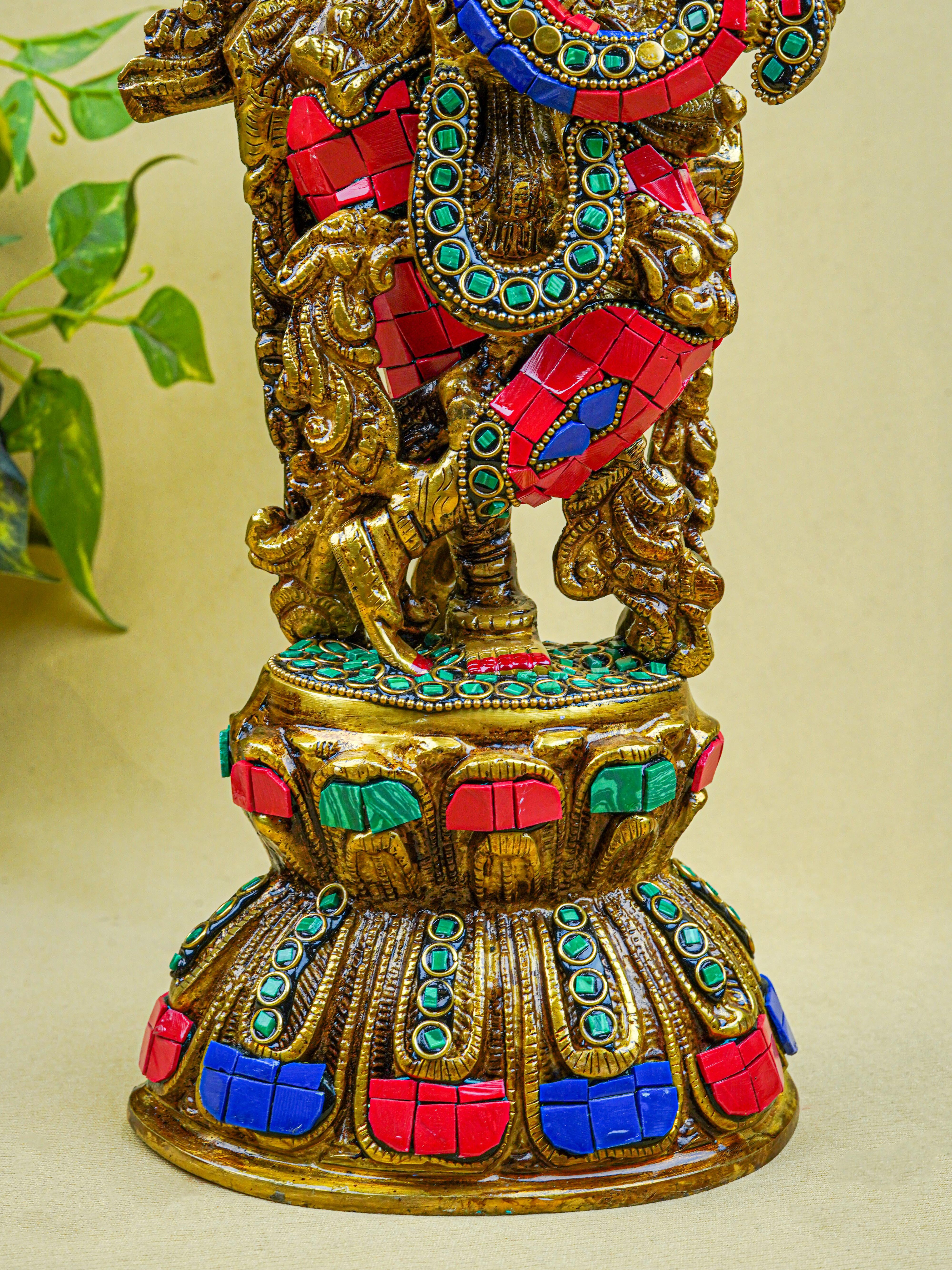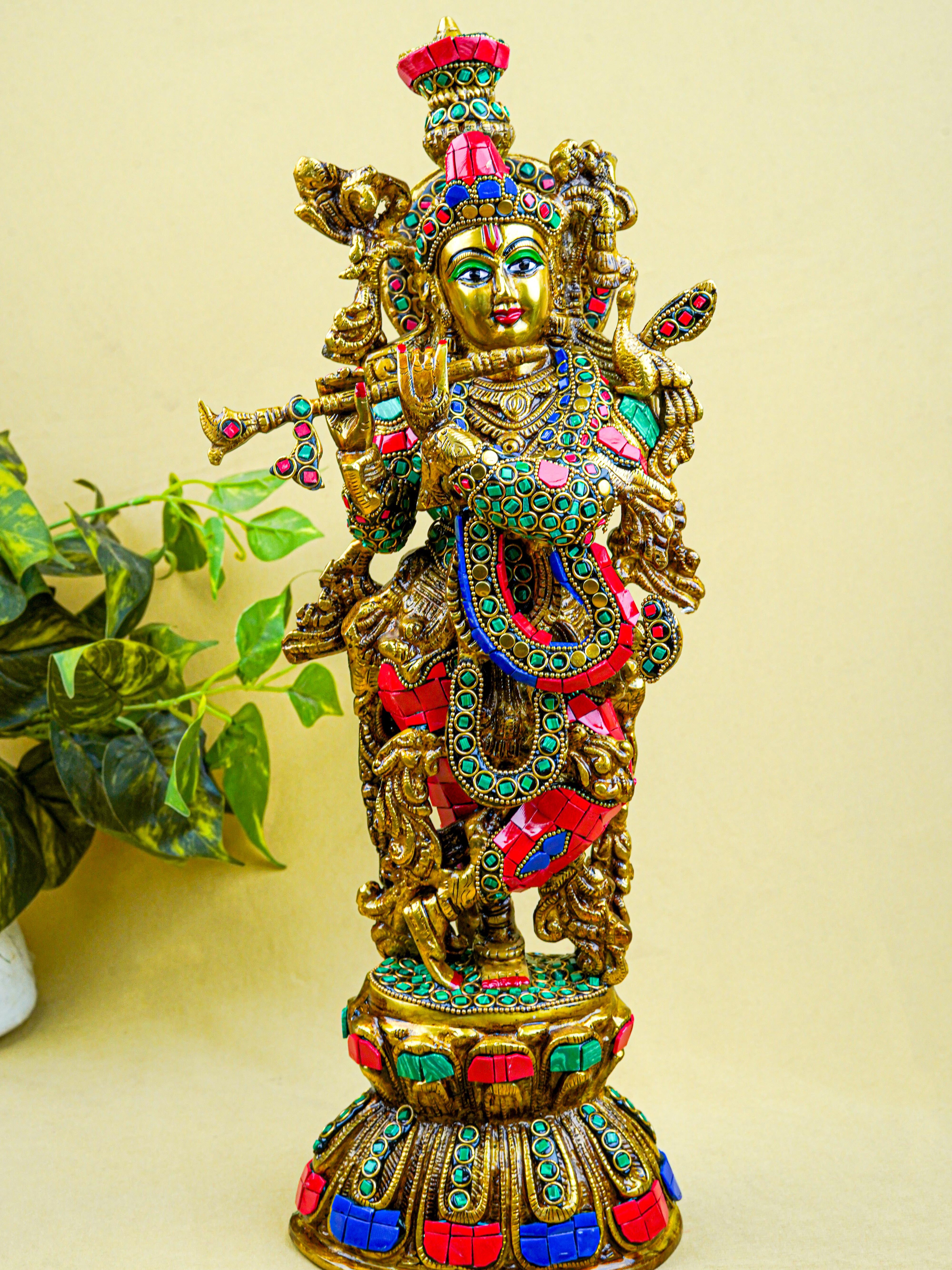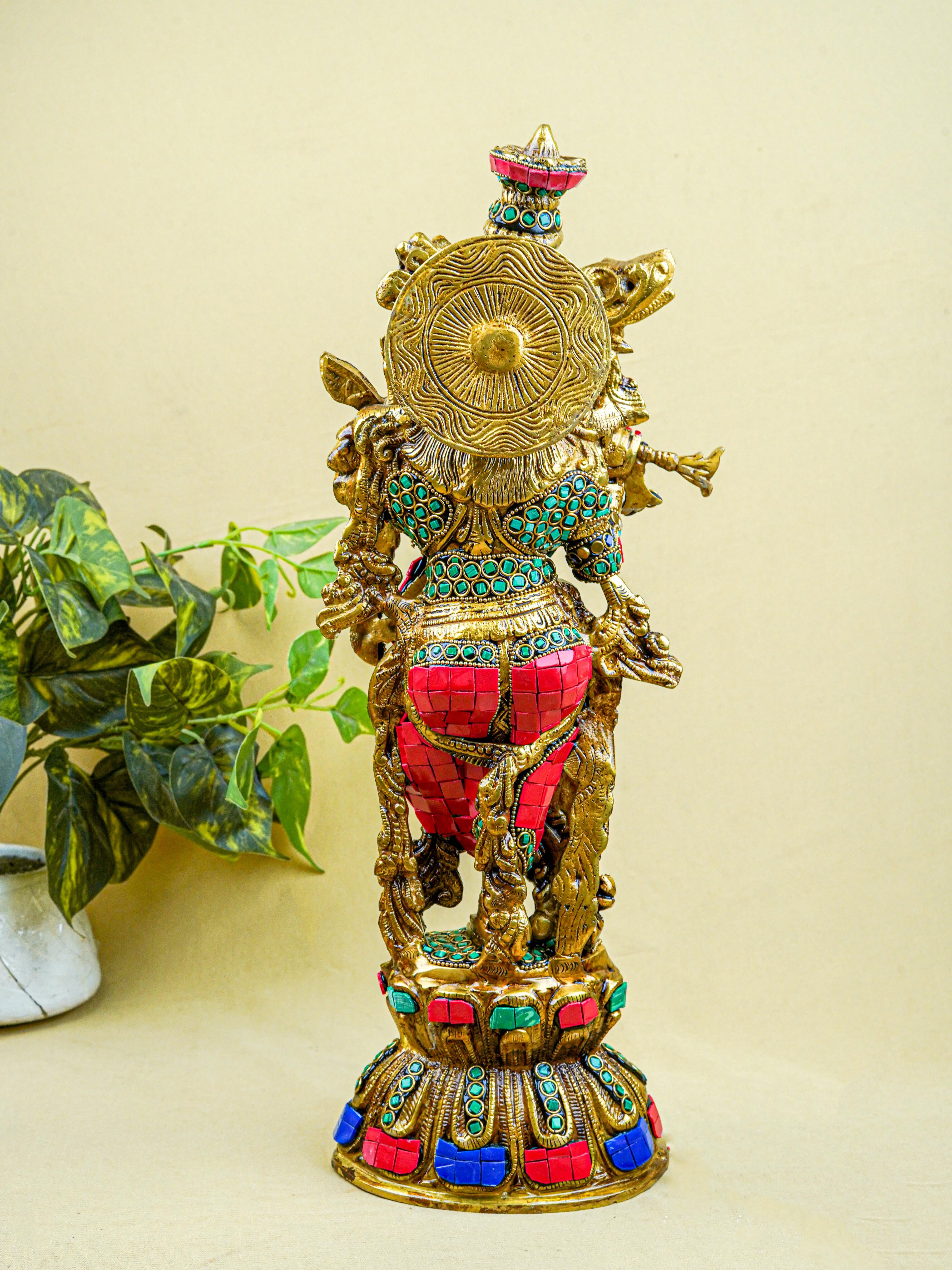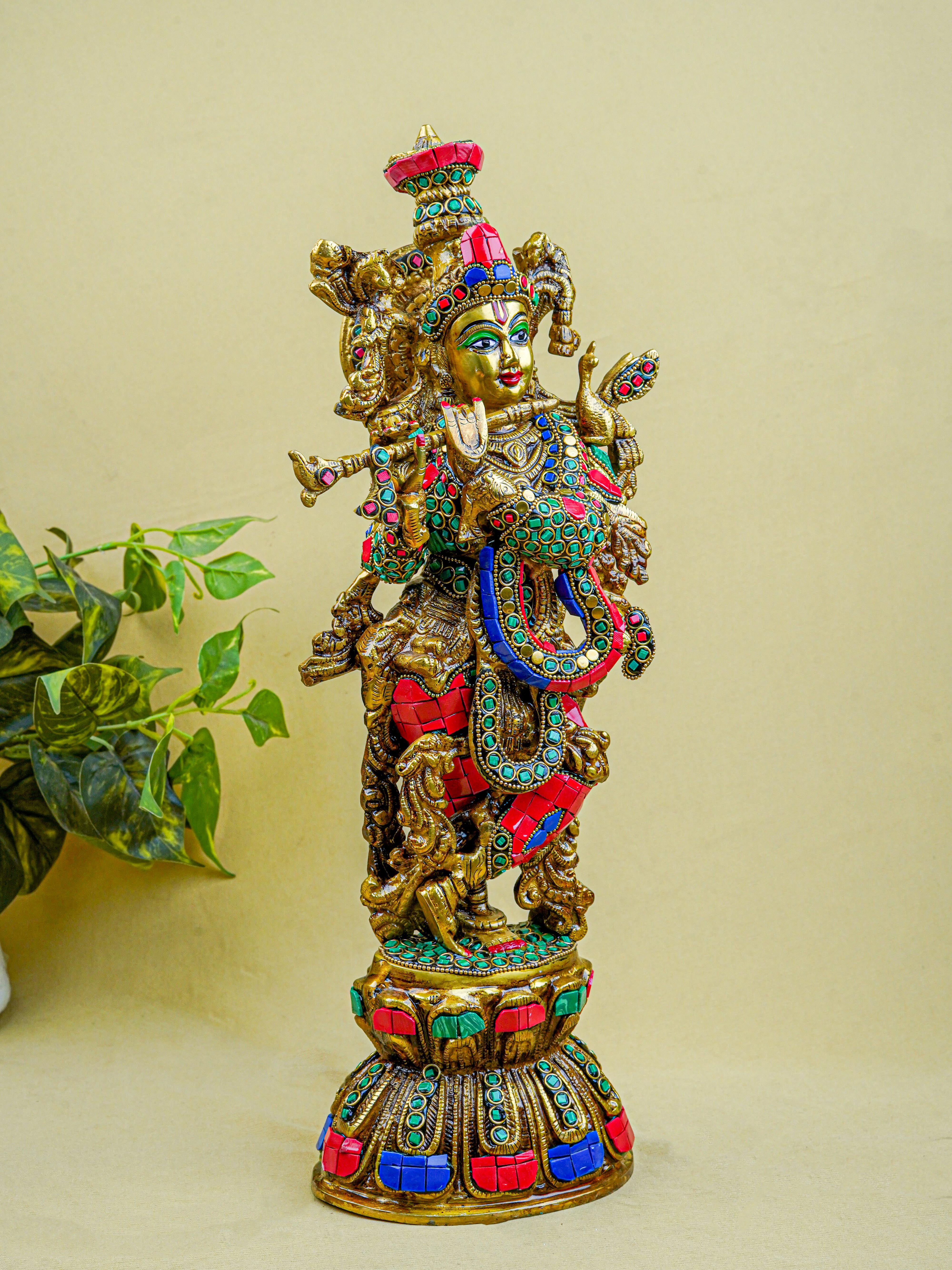 - This magnificent figurine of Lord Krishna is handcrafted out of Brass and embellished with Multi Colour Stone Work all throughout.