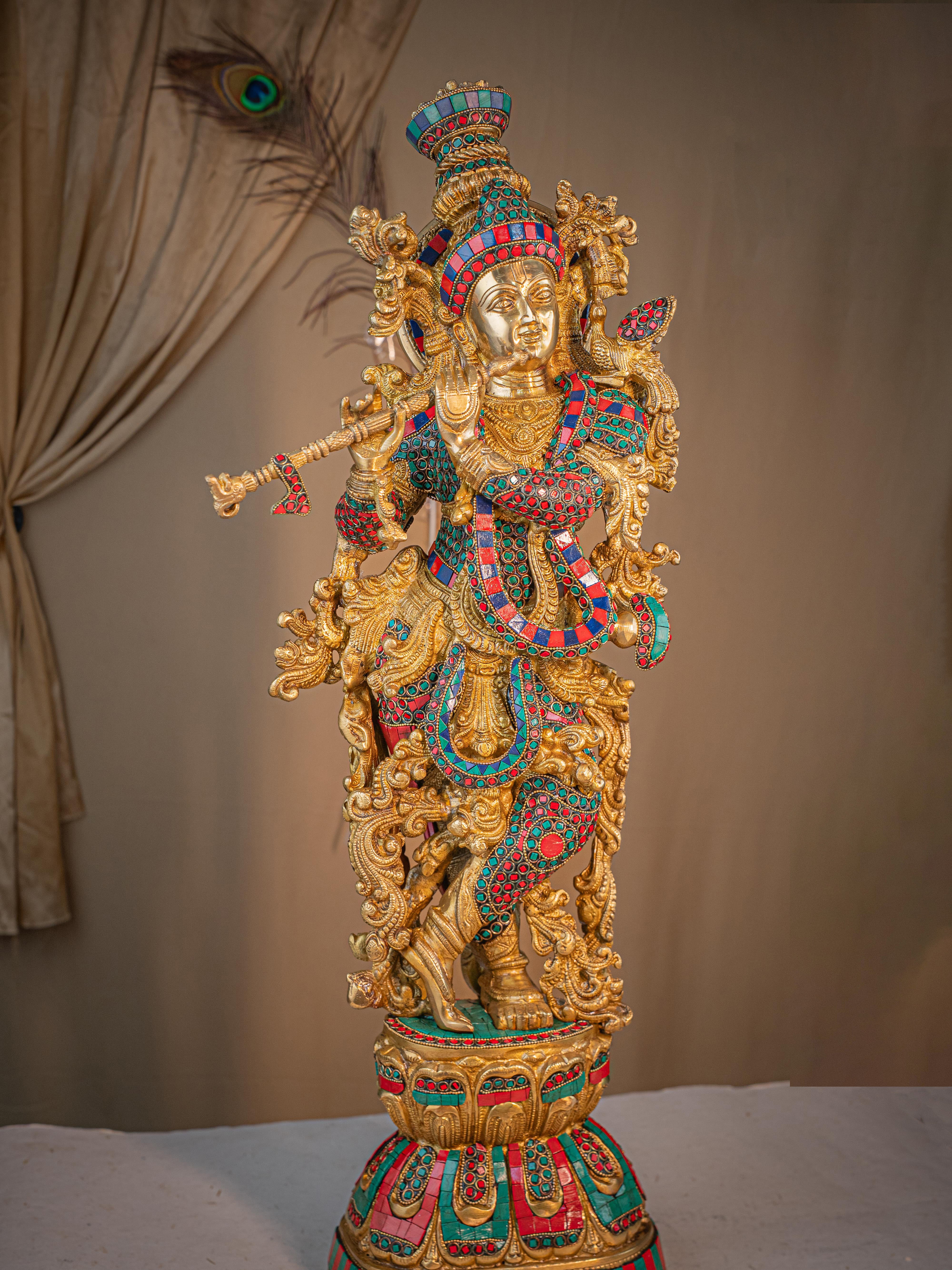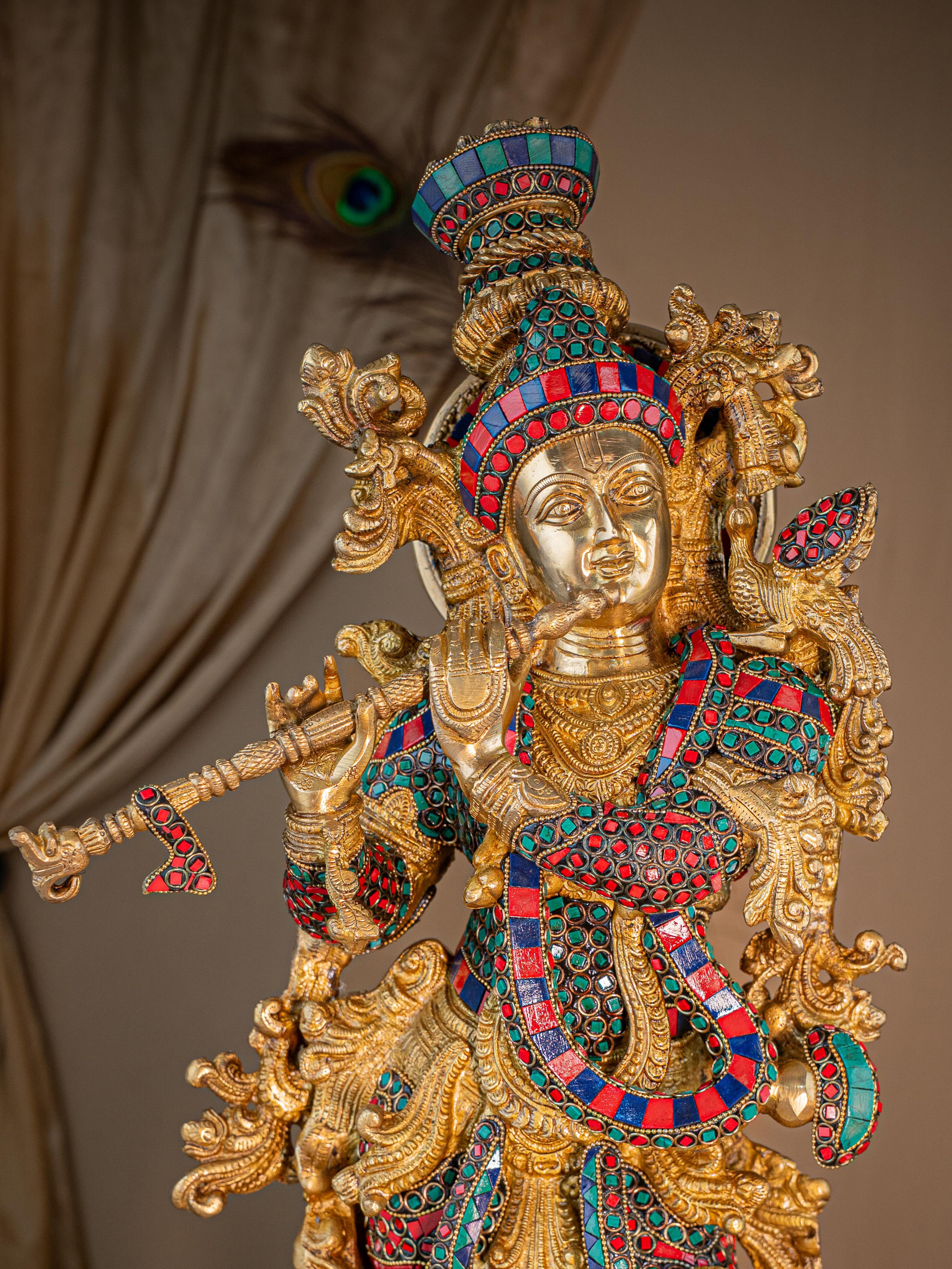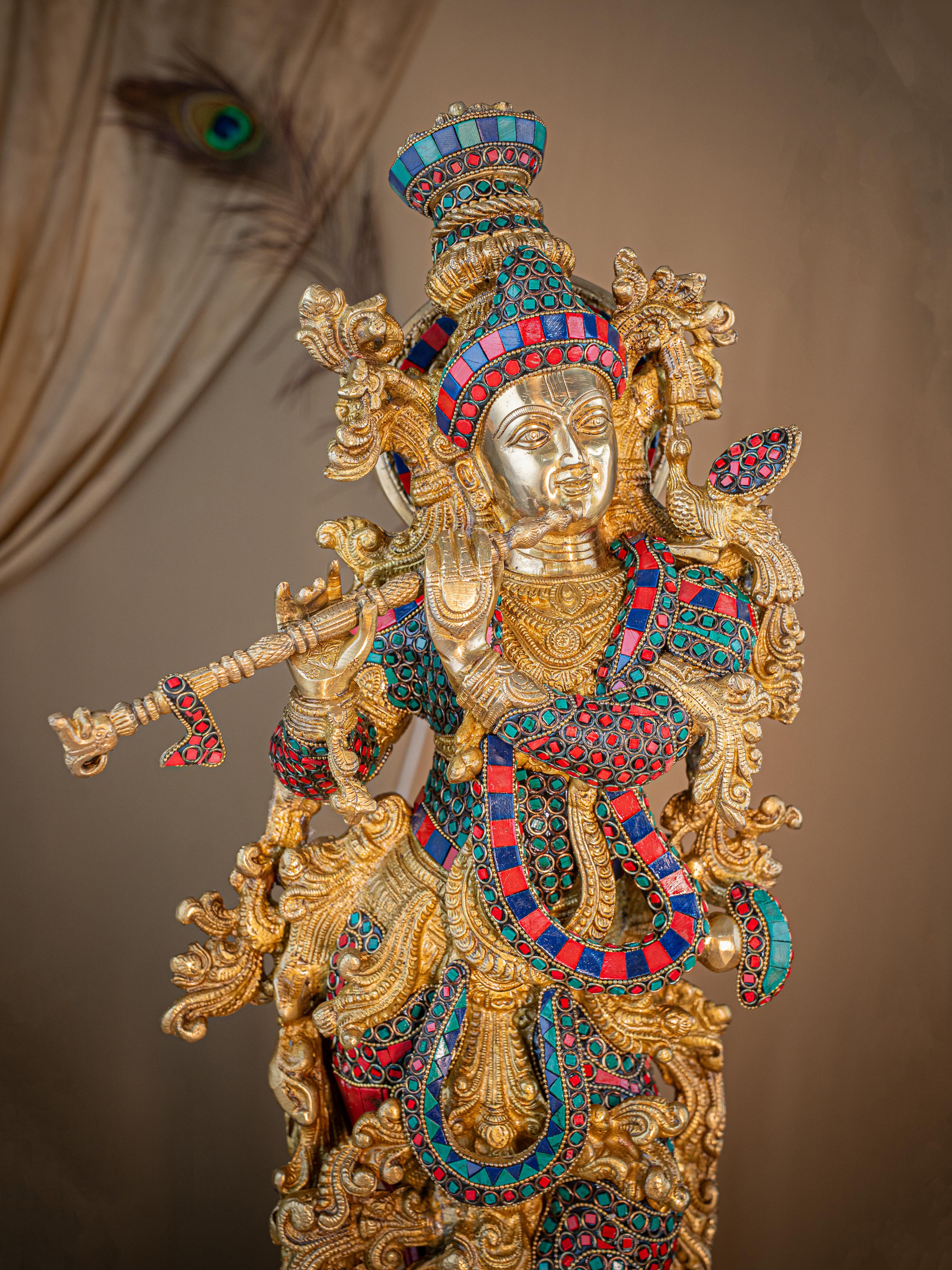- This magnificent figurine of Lord Krishna is handcrafted out of Brass and embellished with Multi Colour Stone Work all throughout.