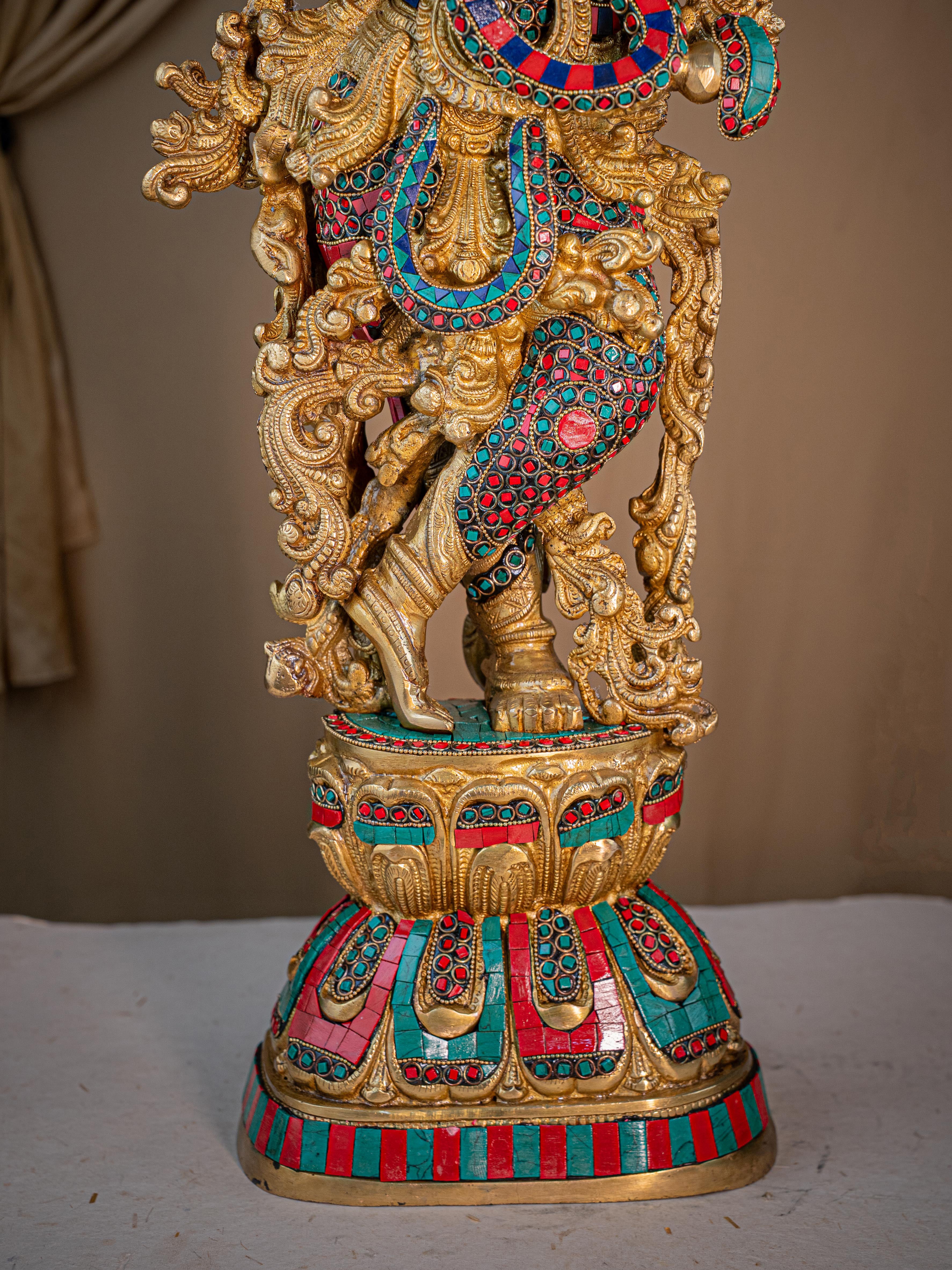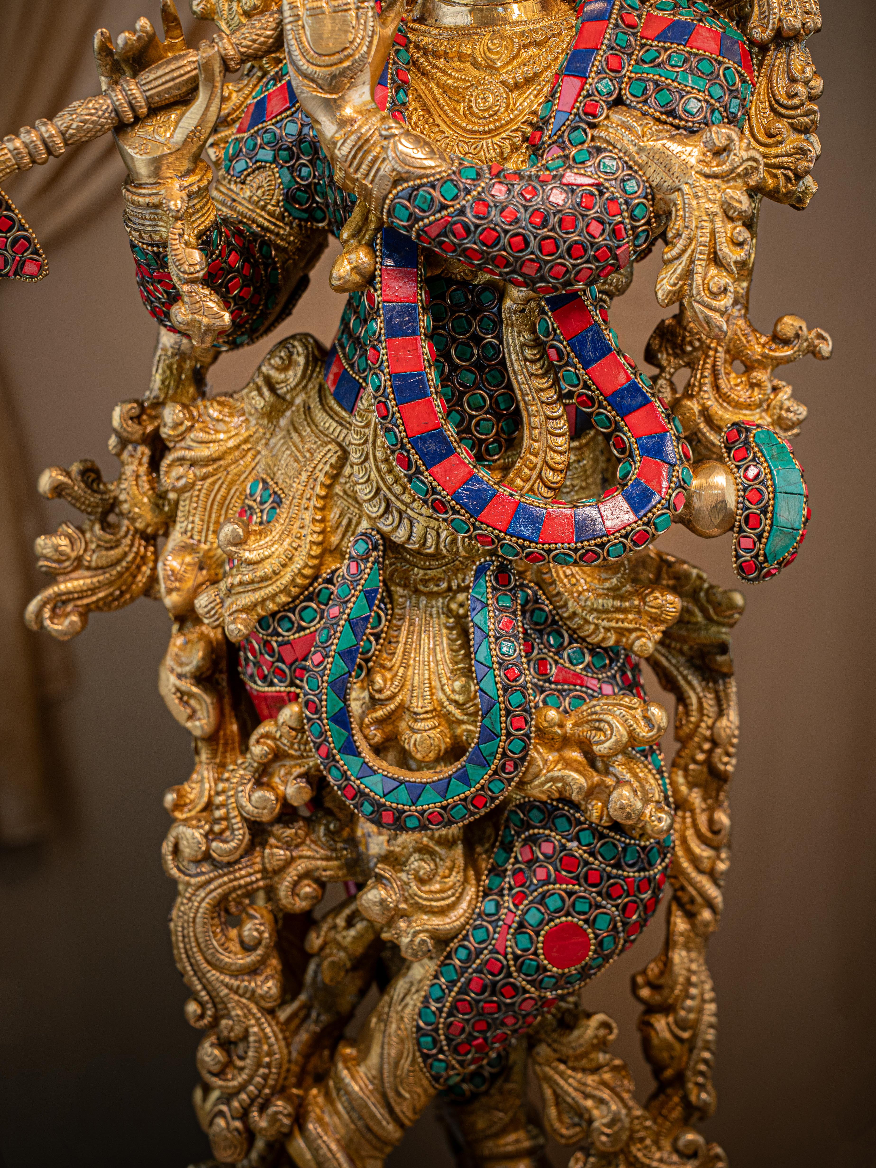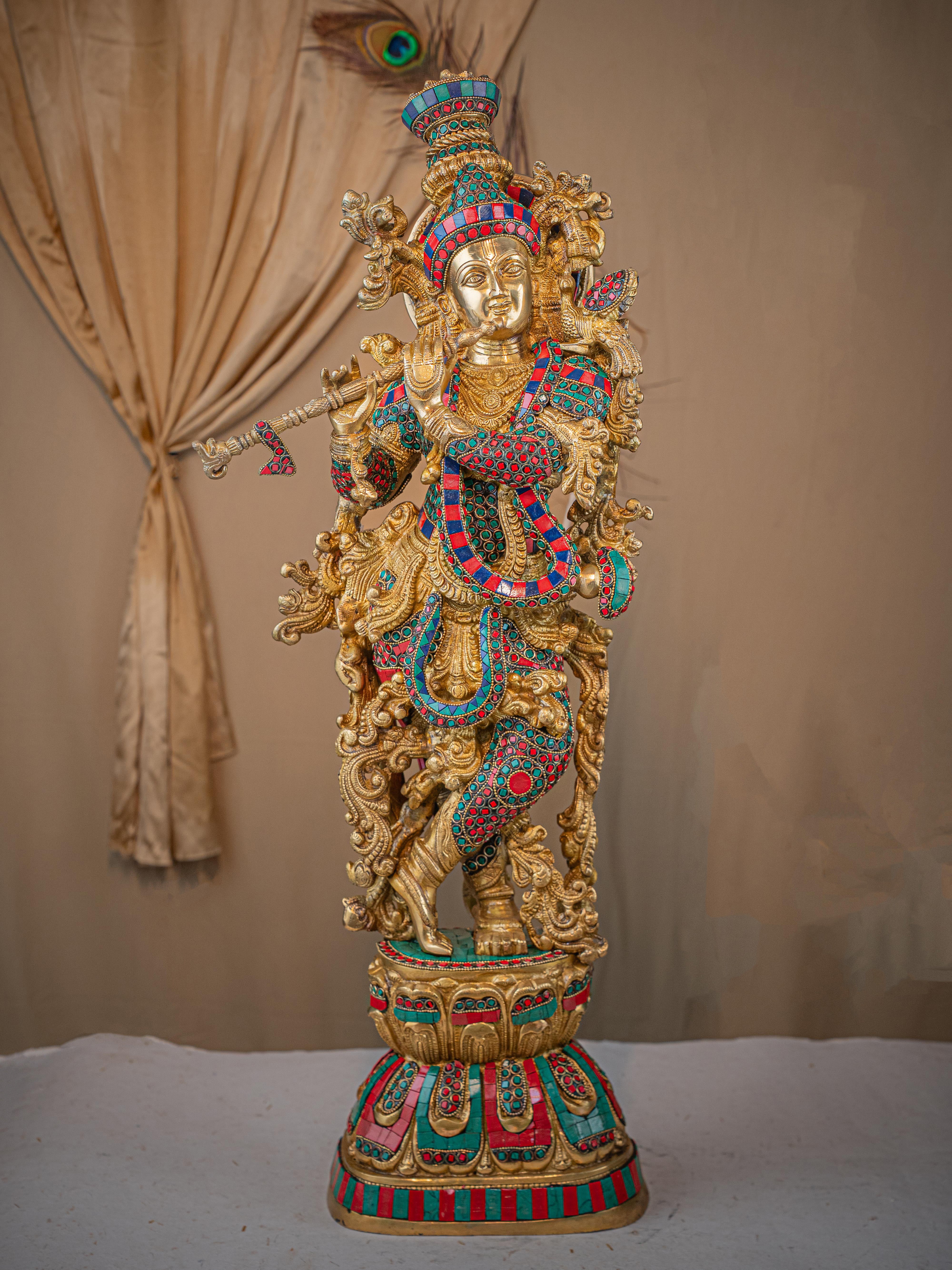 - This magnificent figurine of Lord Krishna is handcrafted out of Brass and embellished with Multi Colour Stone Work all throughout.