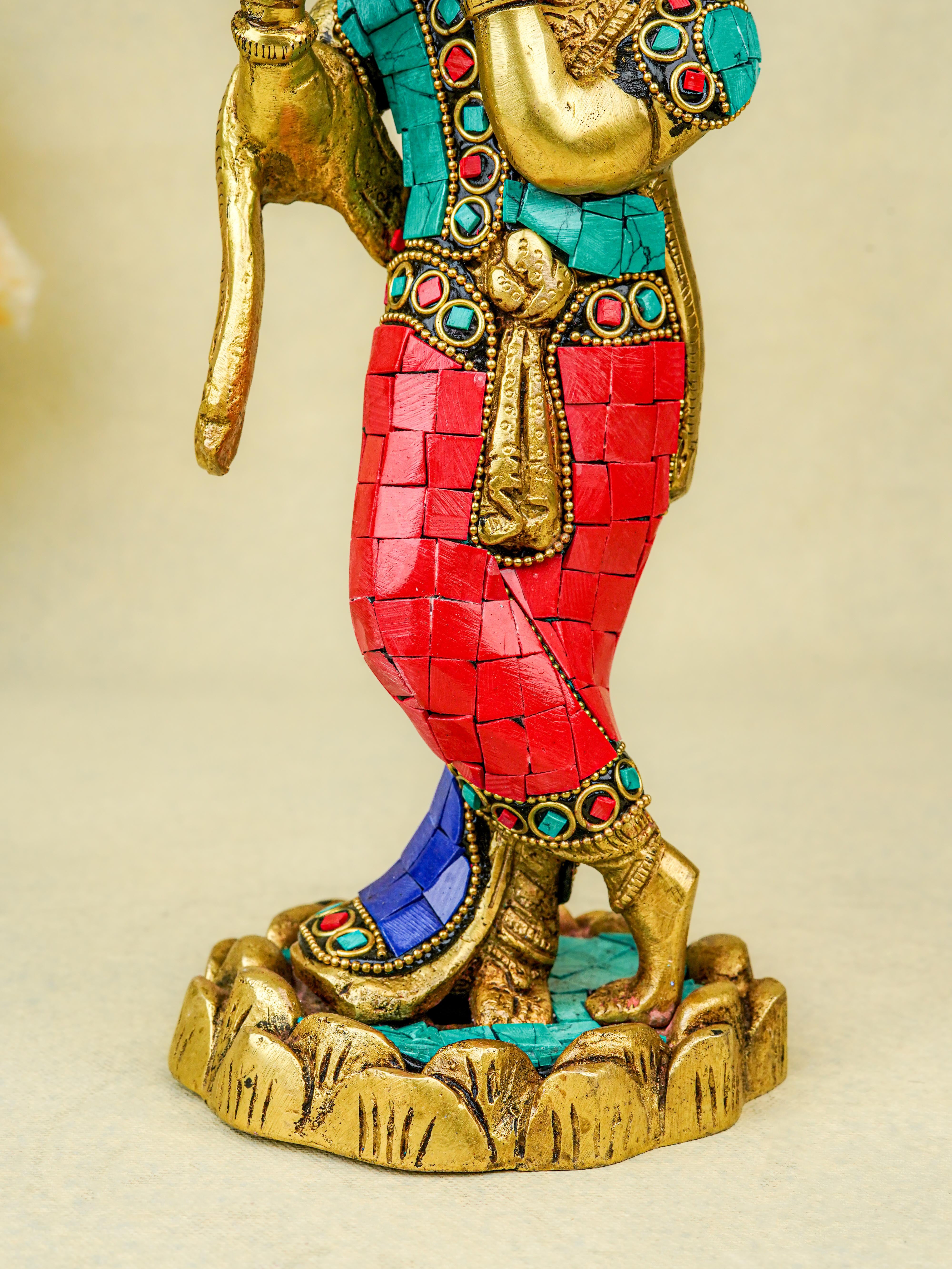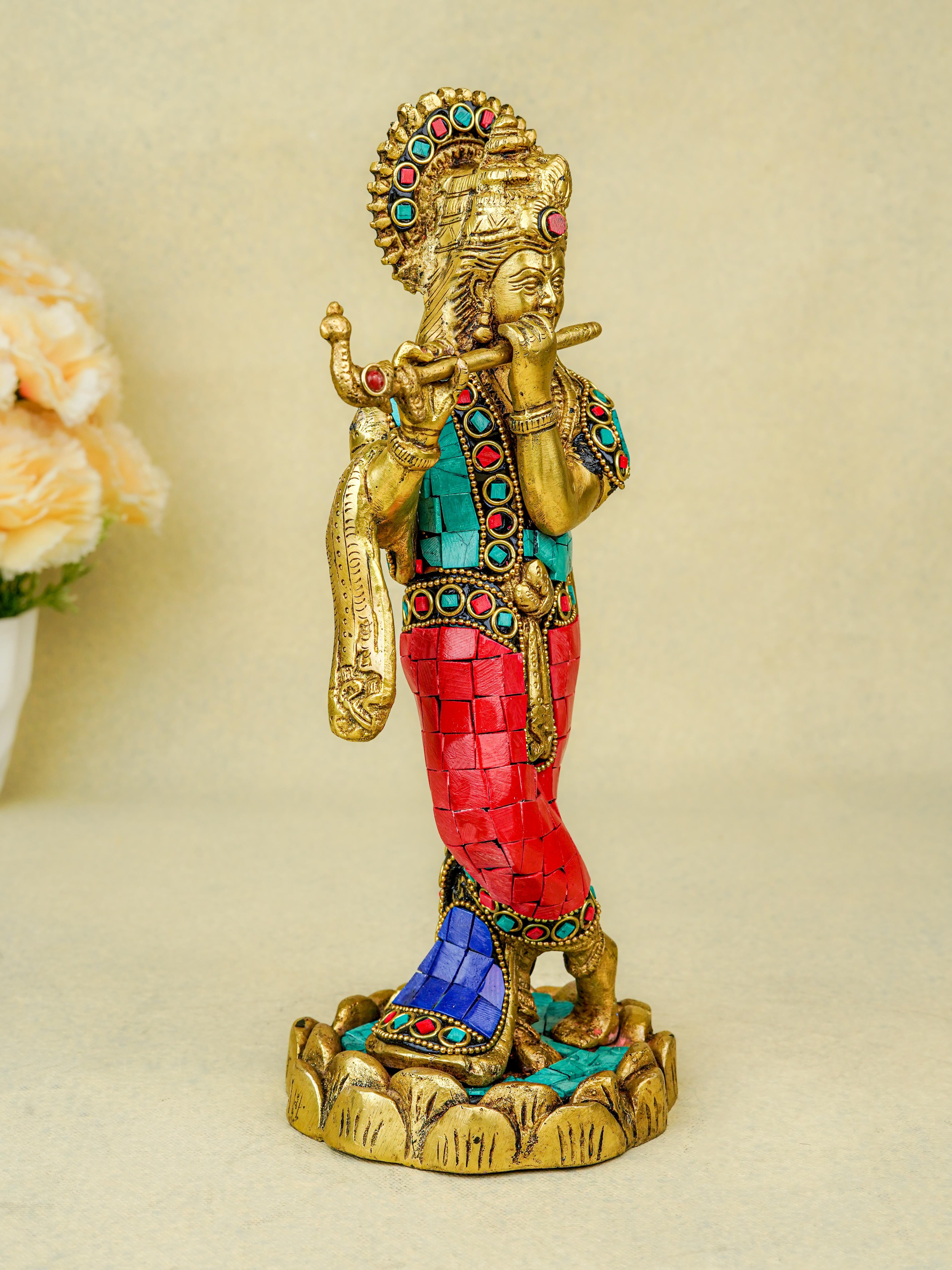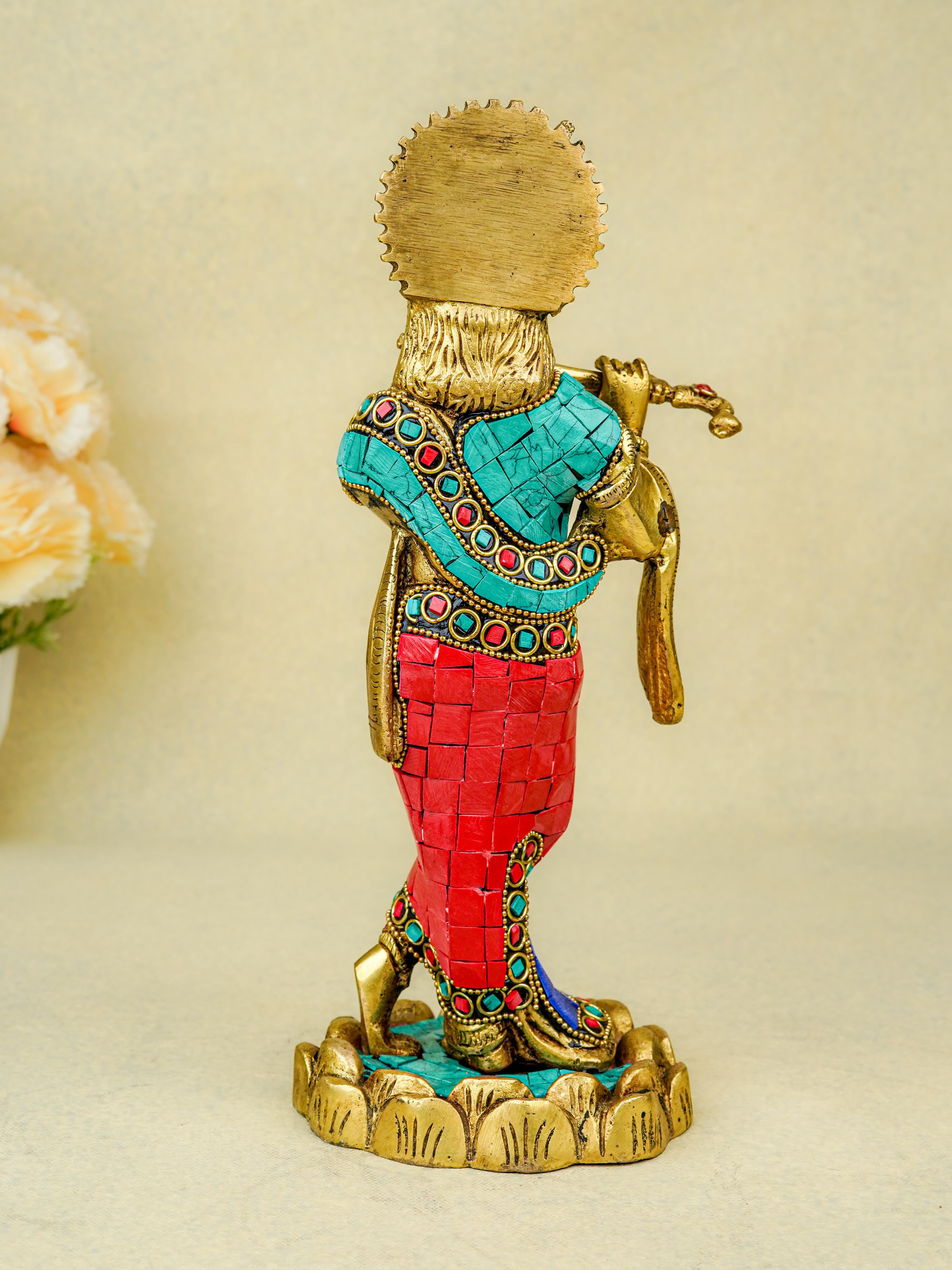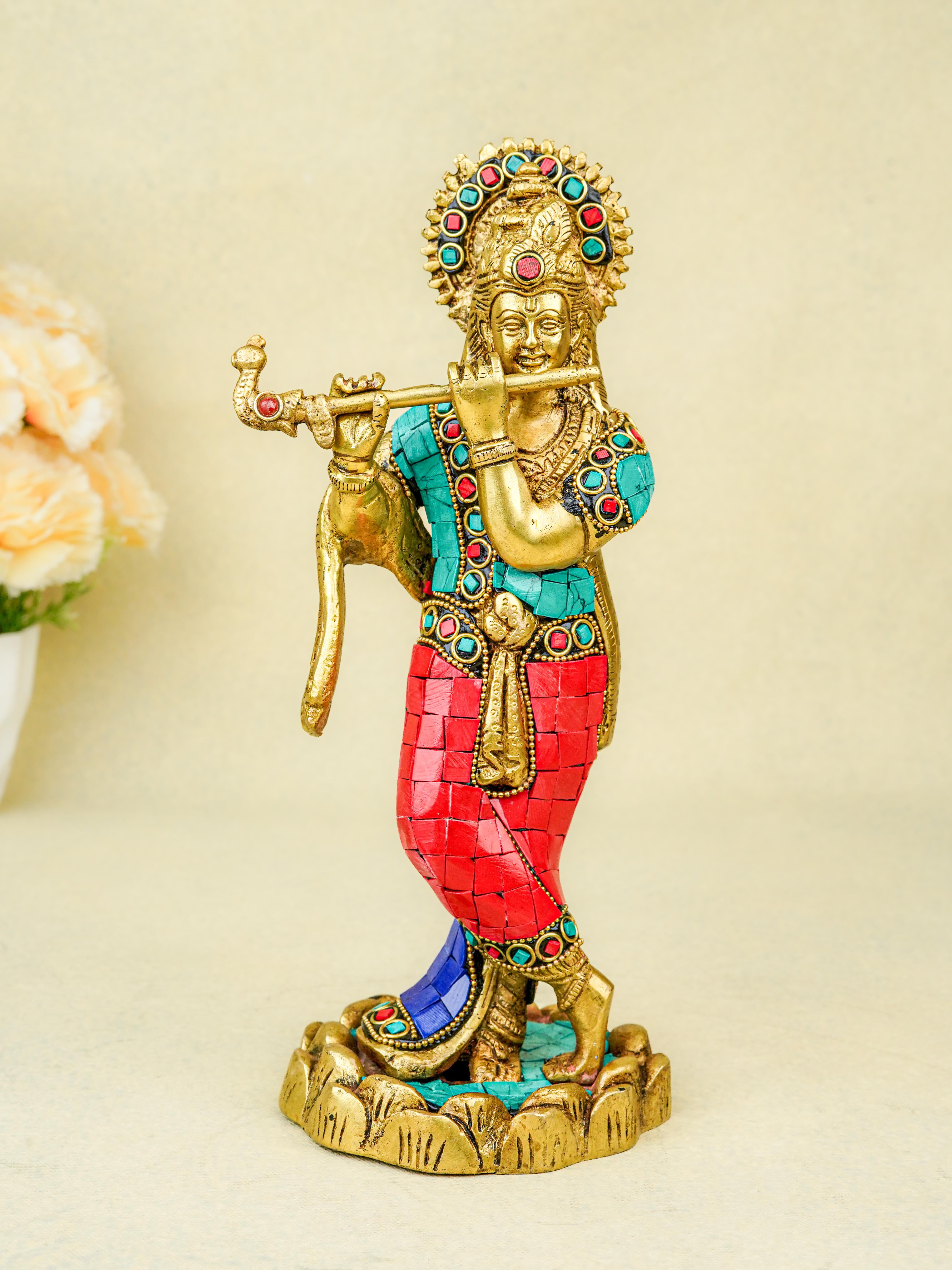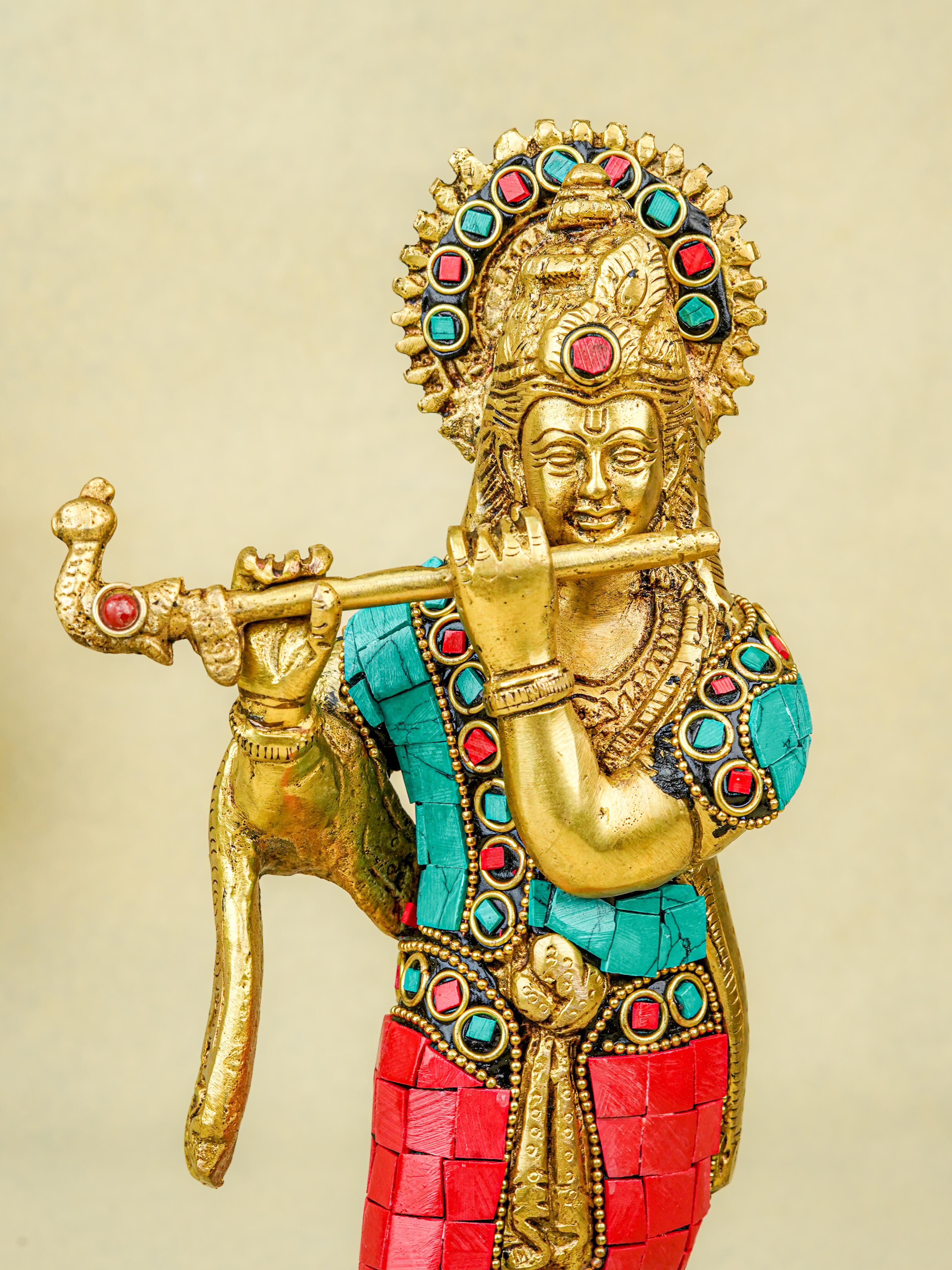 - This magnificent figurine of Lord Krishna is handcrafted out of Brass and embellished with Multi Colour Stone Work all throughout.