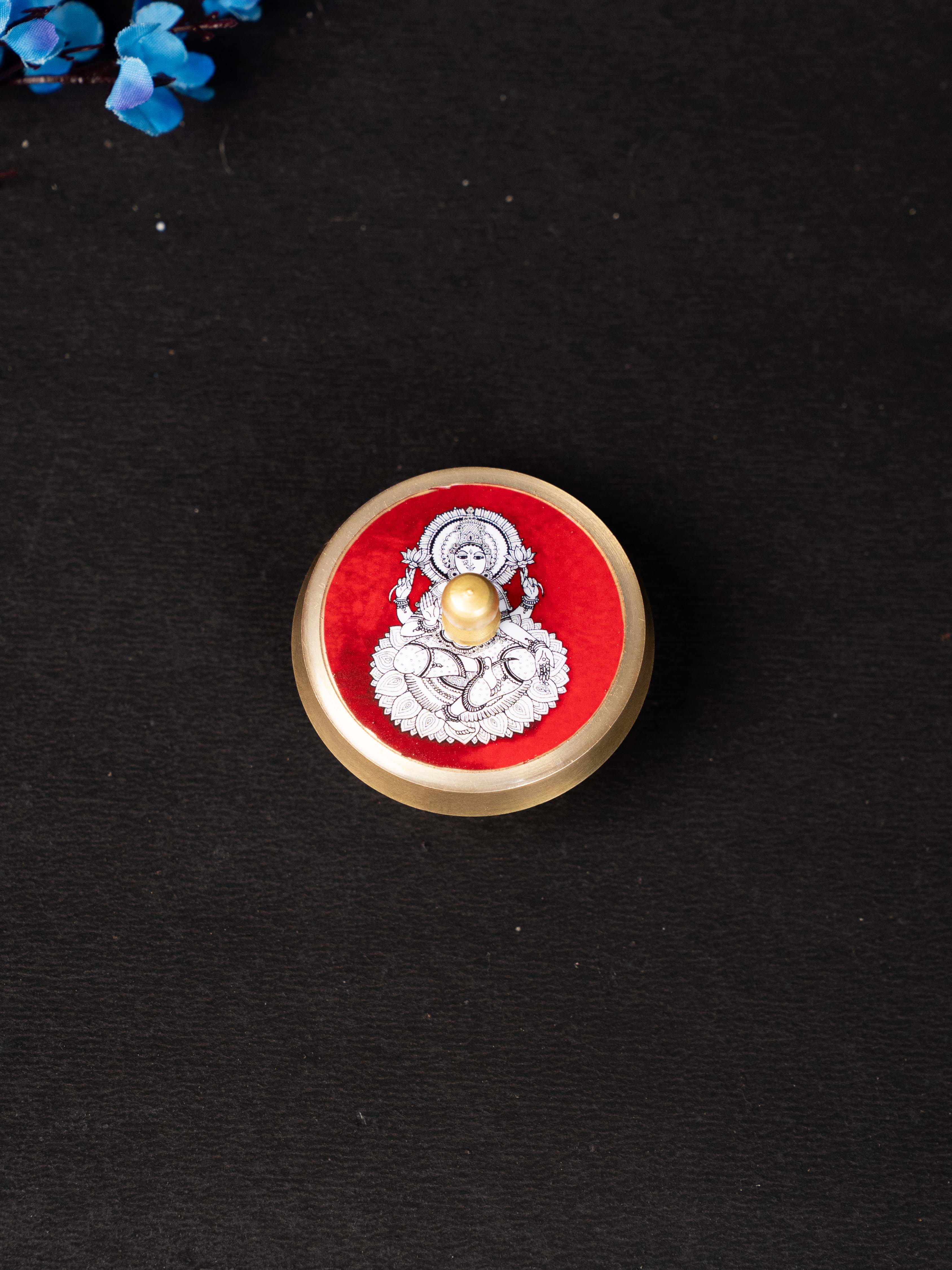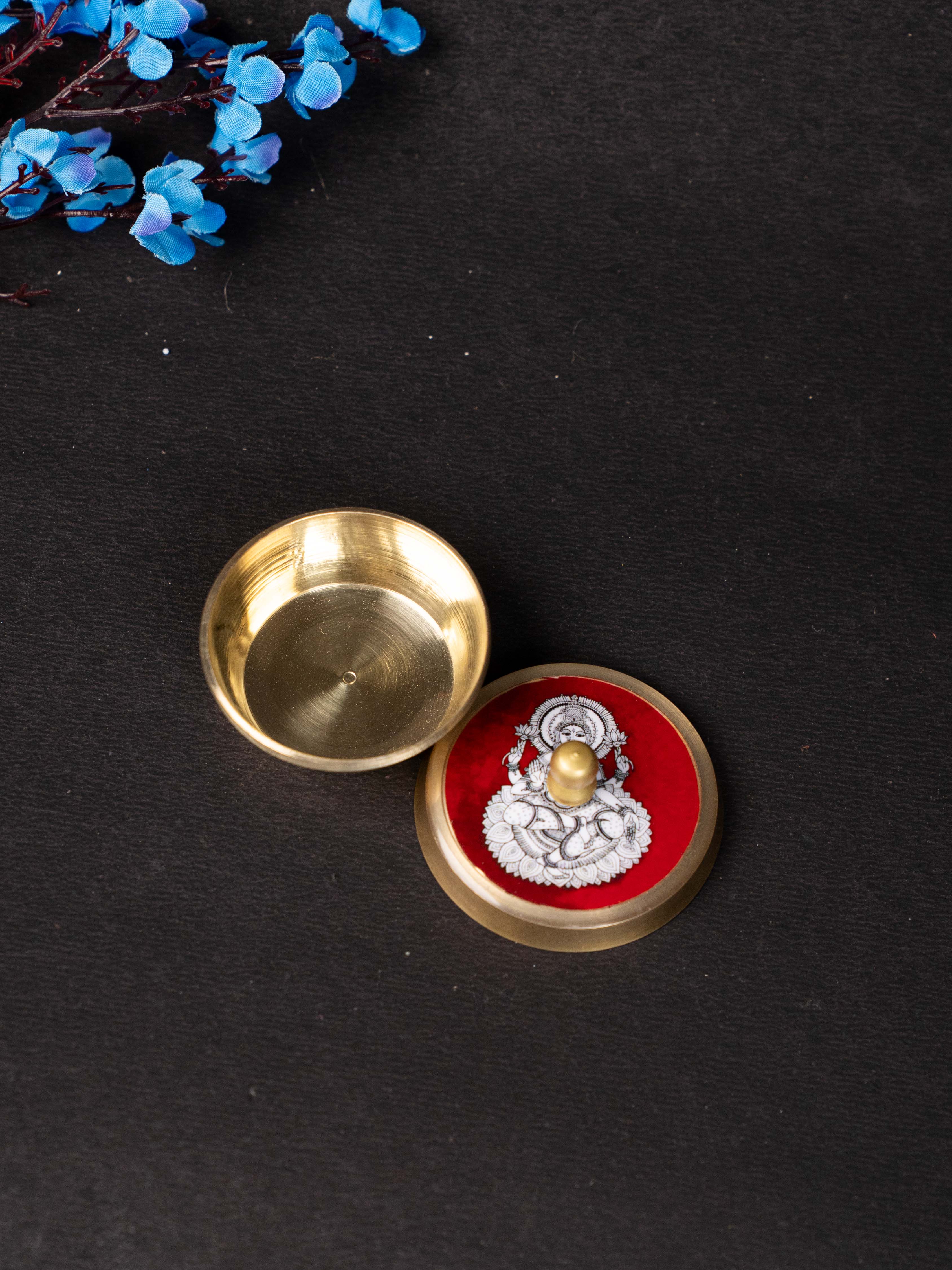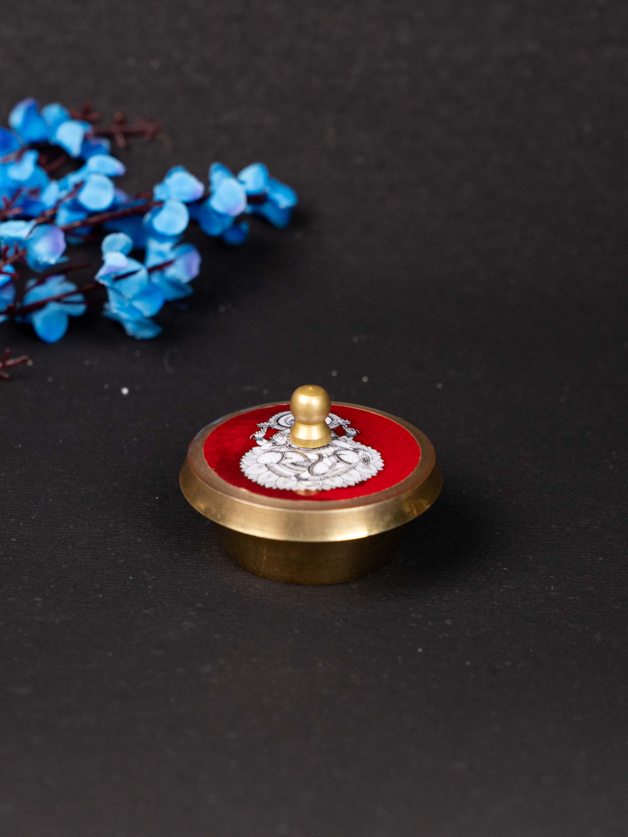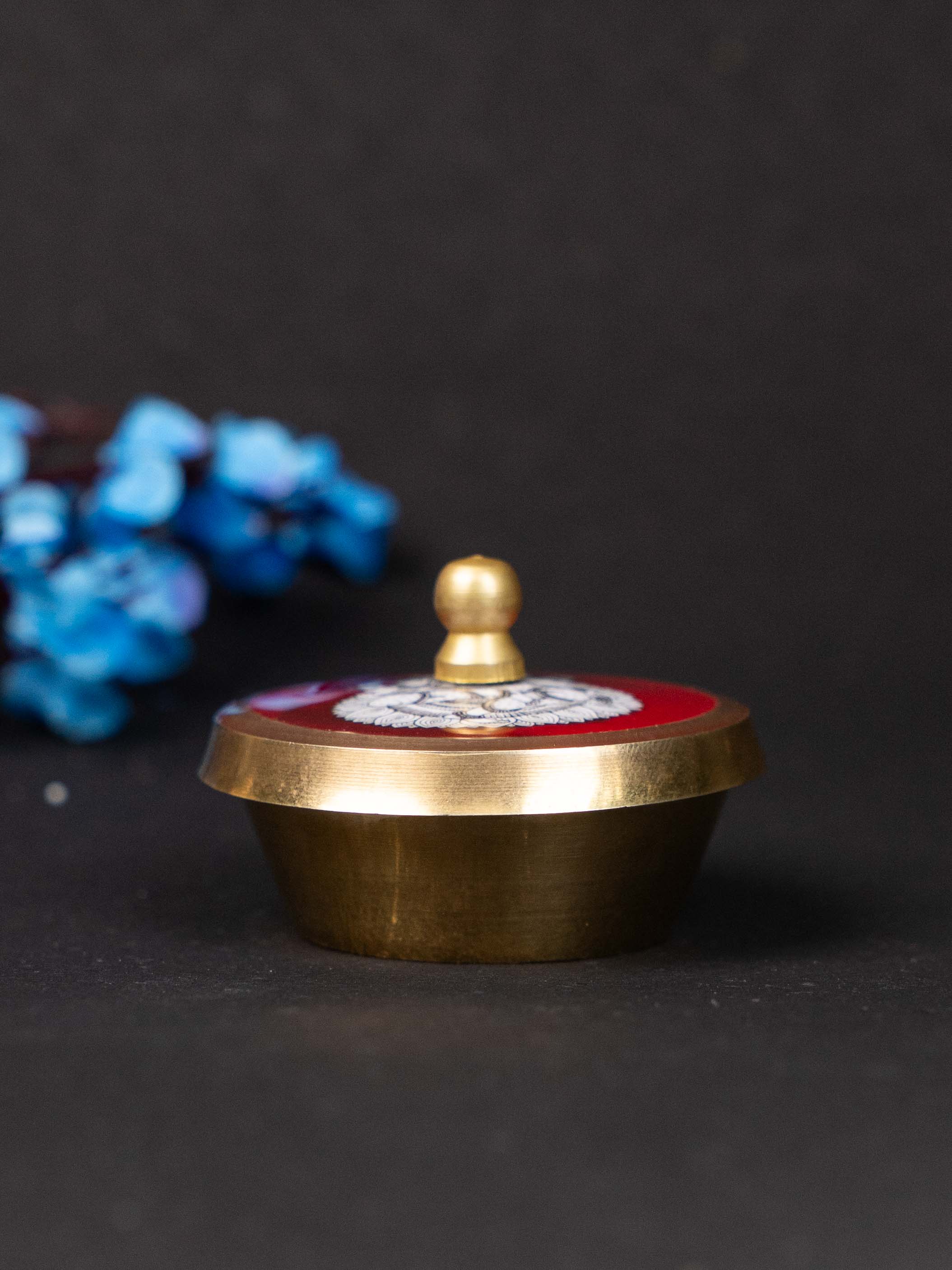 - Brass Kumkum Box with Madhubani Print on Lid.
