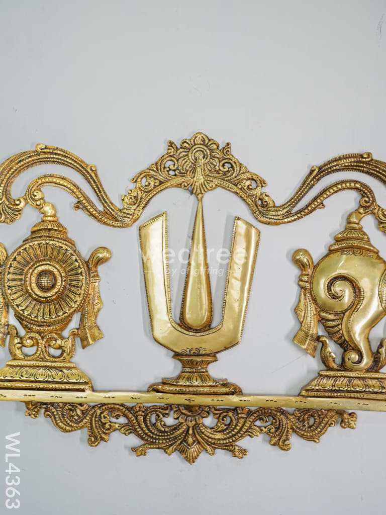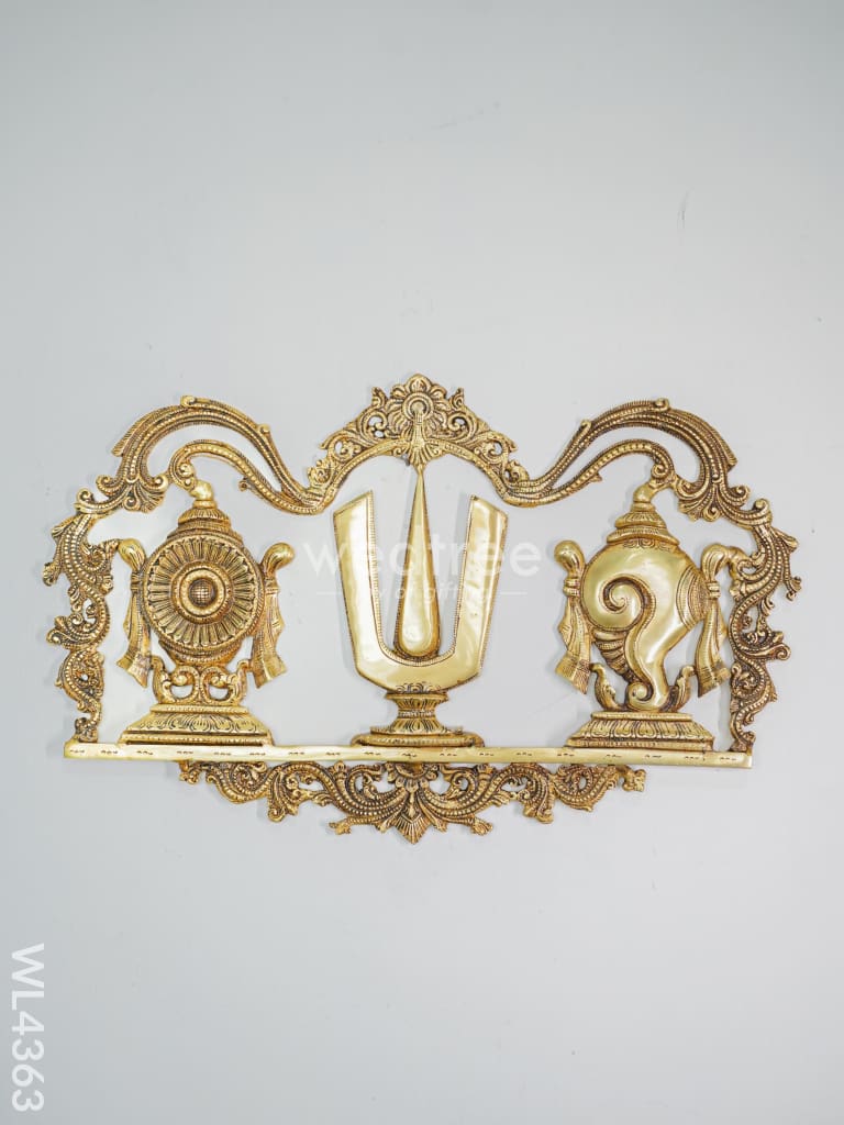 - The Brass Shank Chakra Naama Wall Hanging is a beautiful piece that represents the sacred symbols of Shankha, Chakra, and Naama, which are associated with Lord Vishnu.