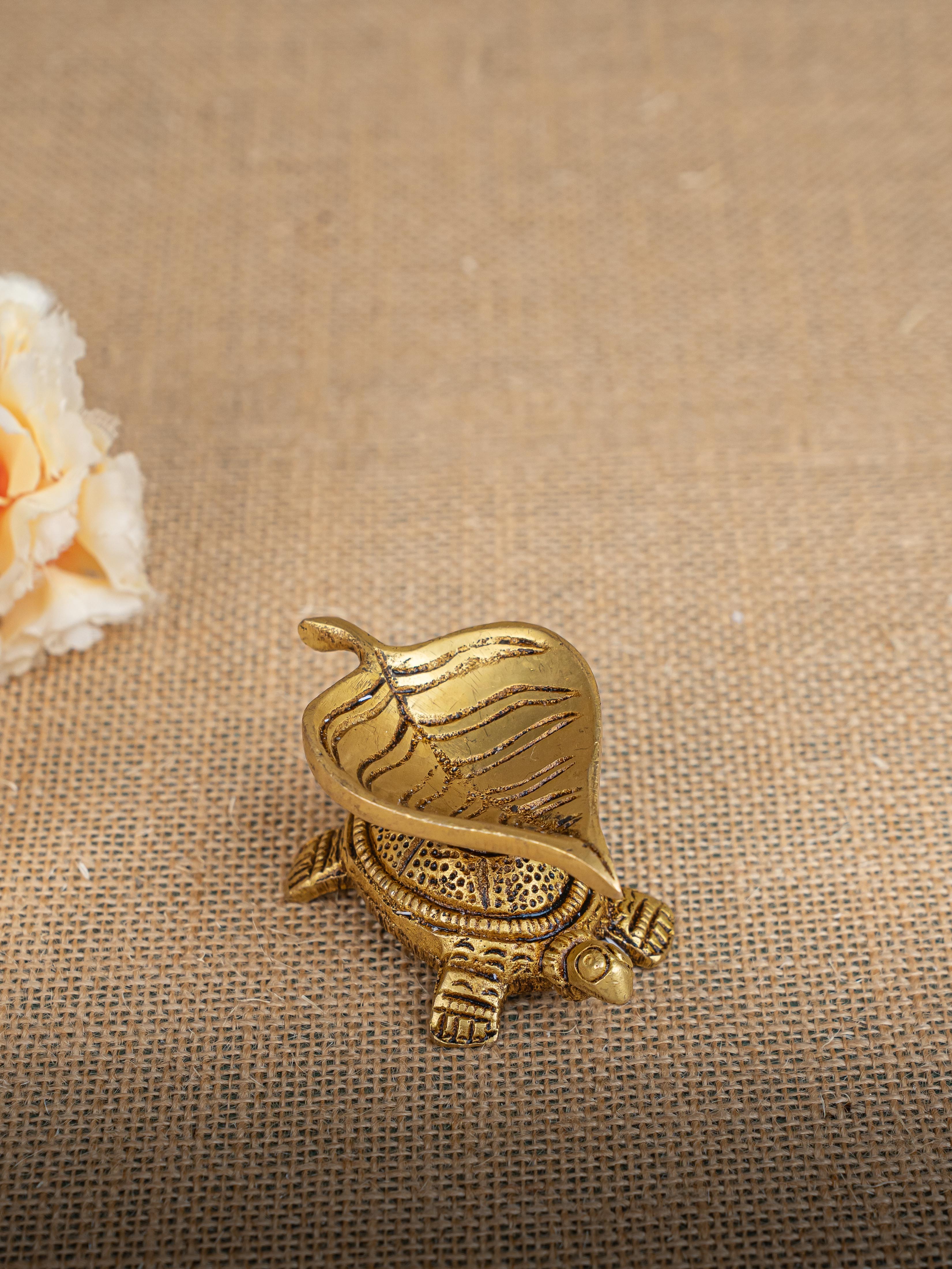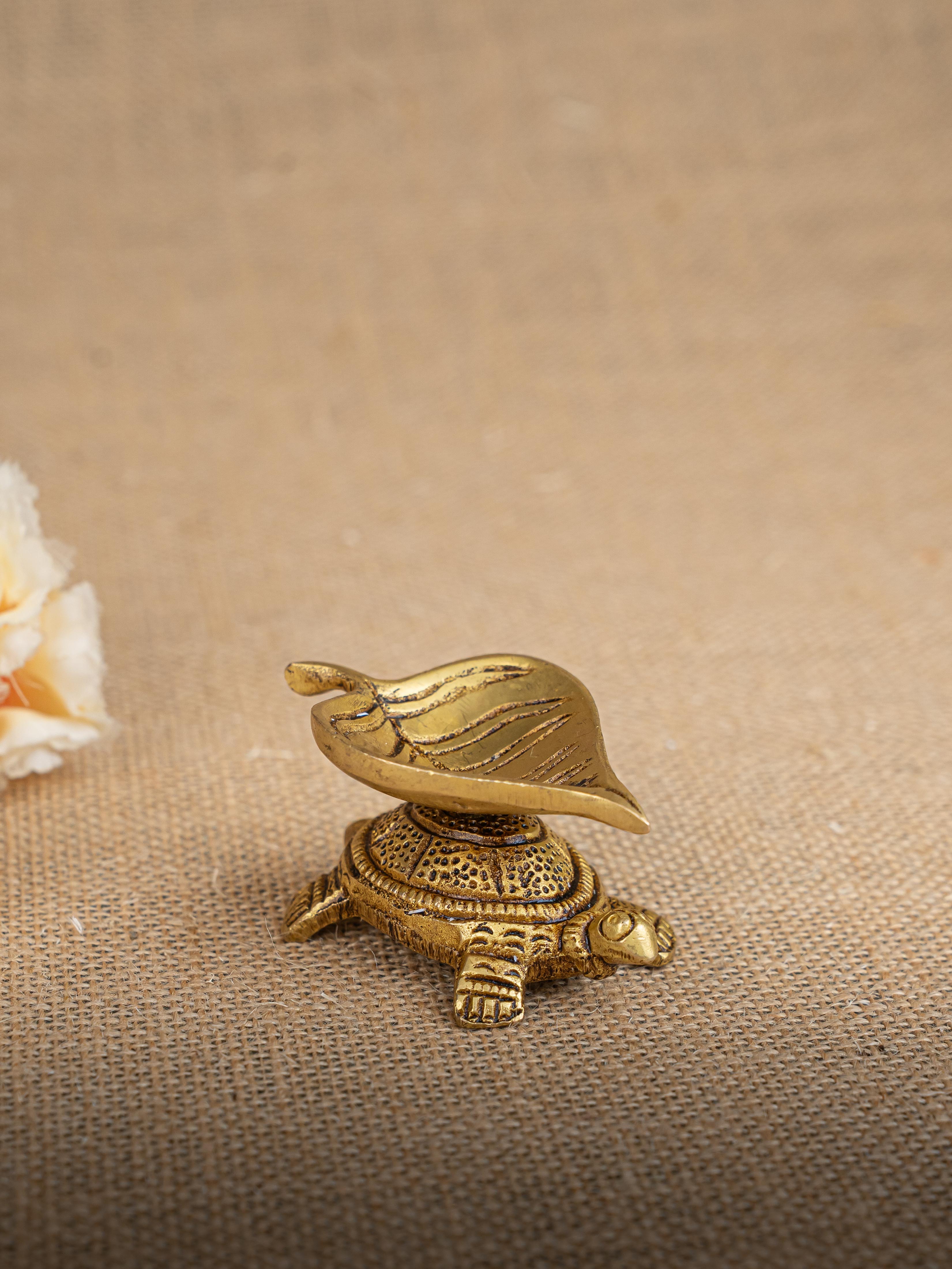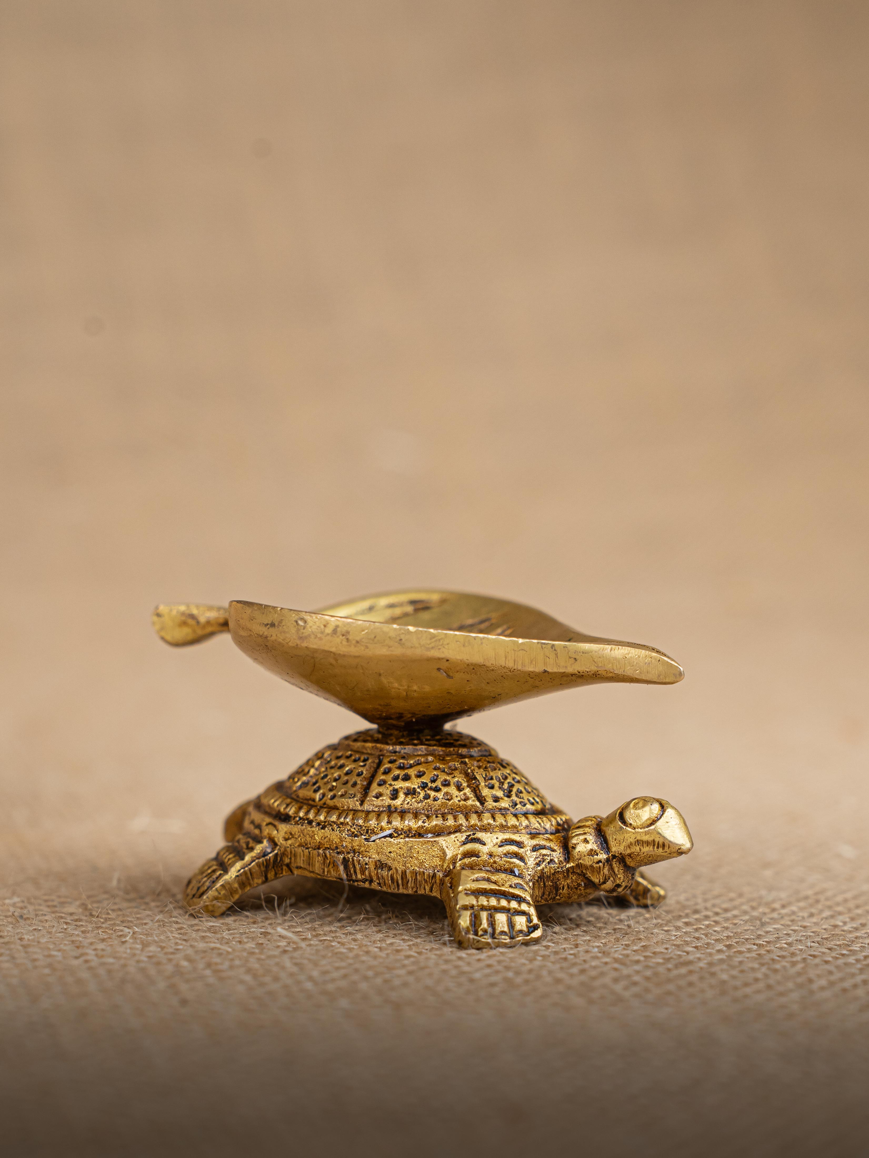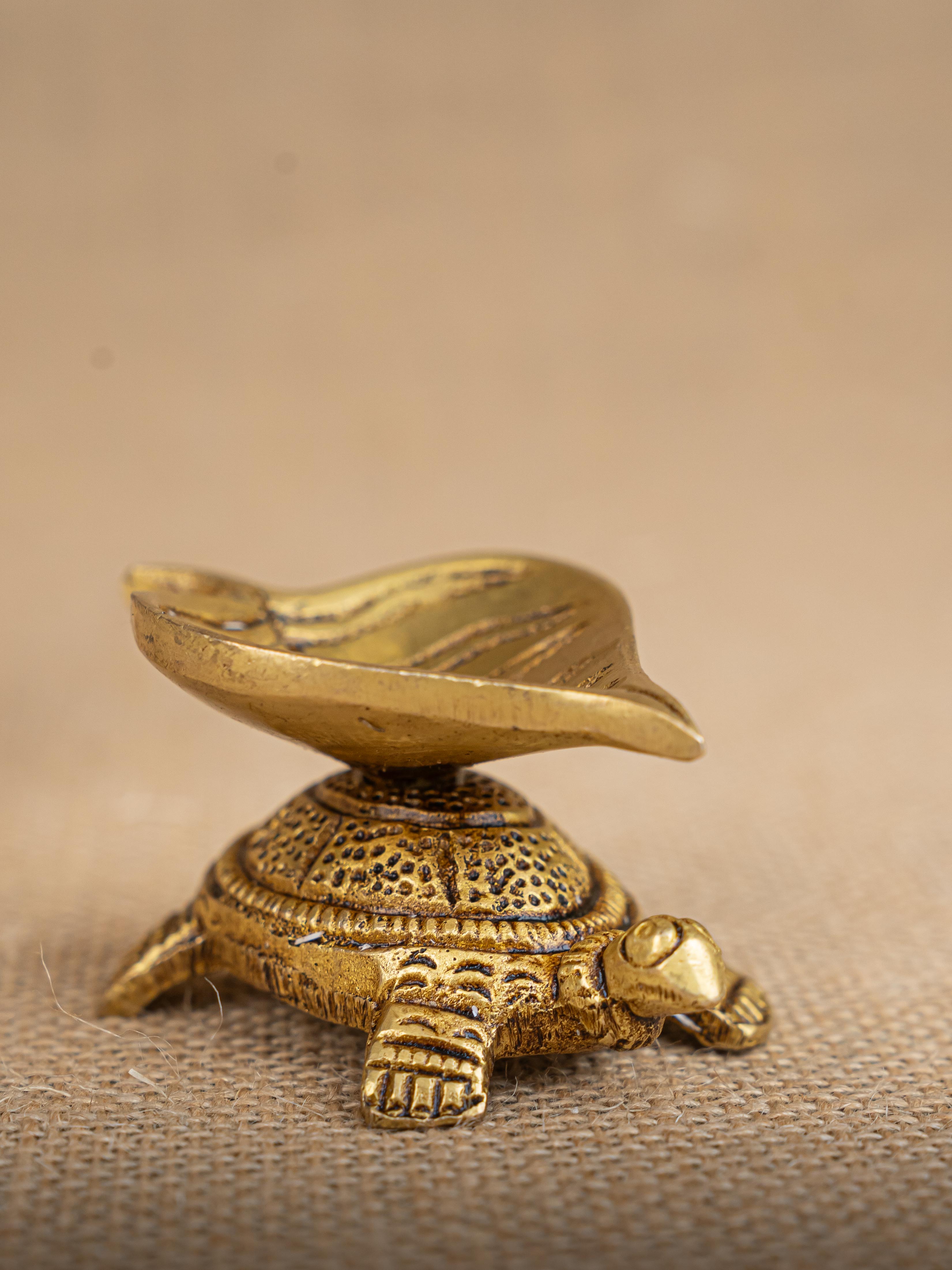 - Here is a cute artifact of a tortoise on top of which a beautiful Leaf Shaped Diya is rested.