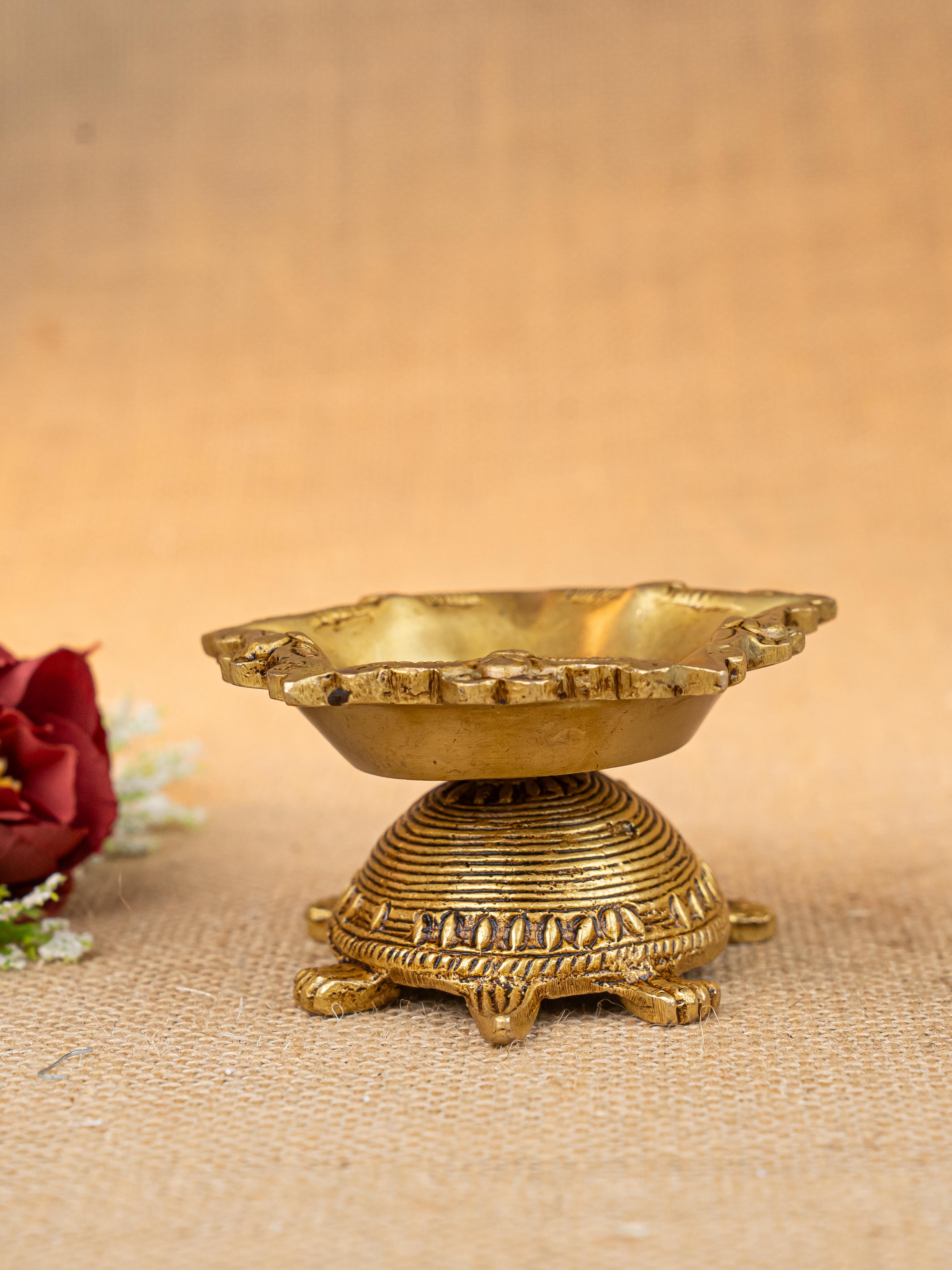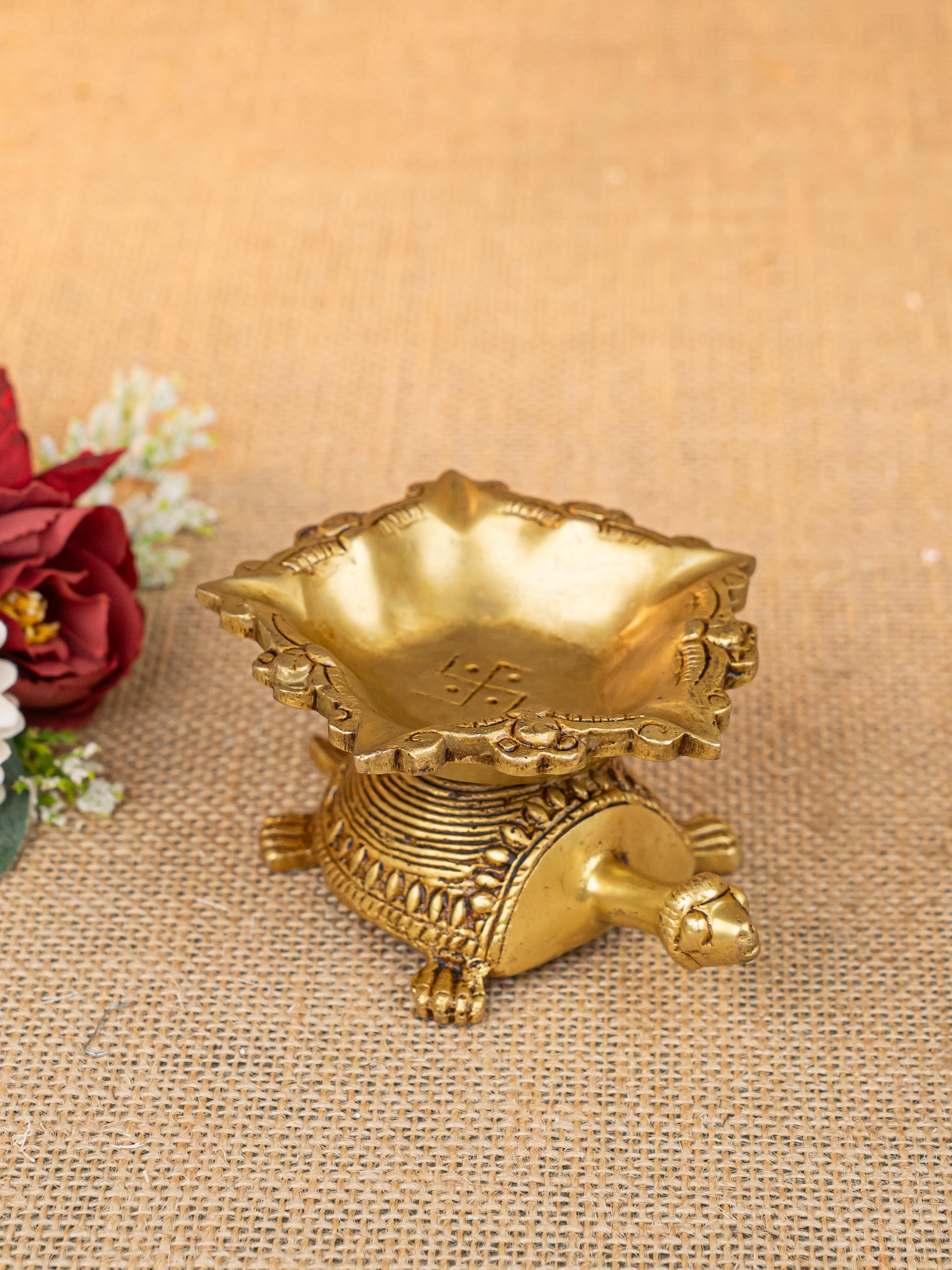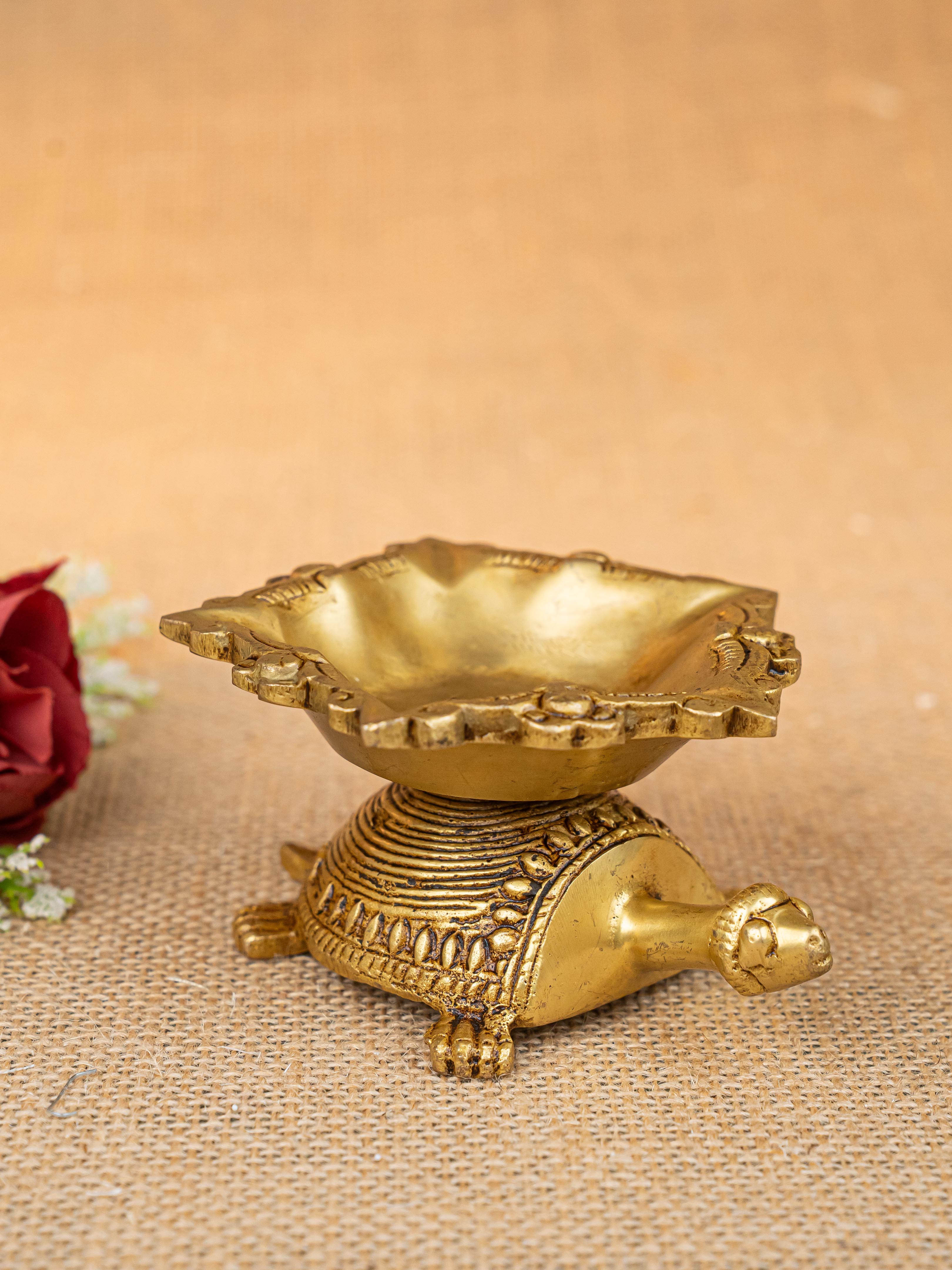 - Here is a cute artifact of a tortoise on top of which a beautiful 5 face Diya is rested.