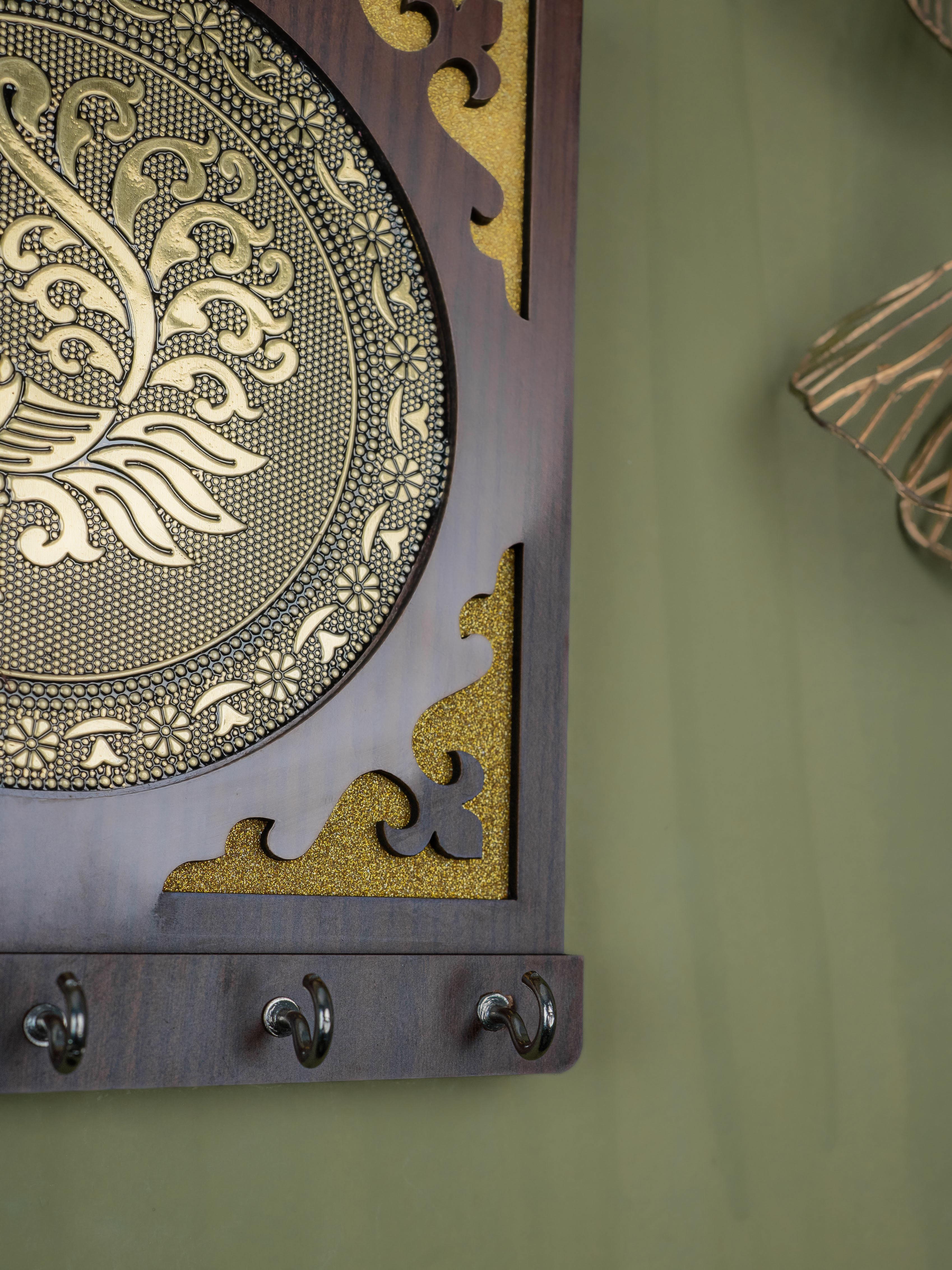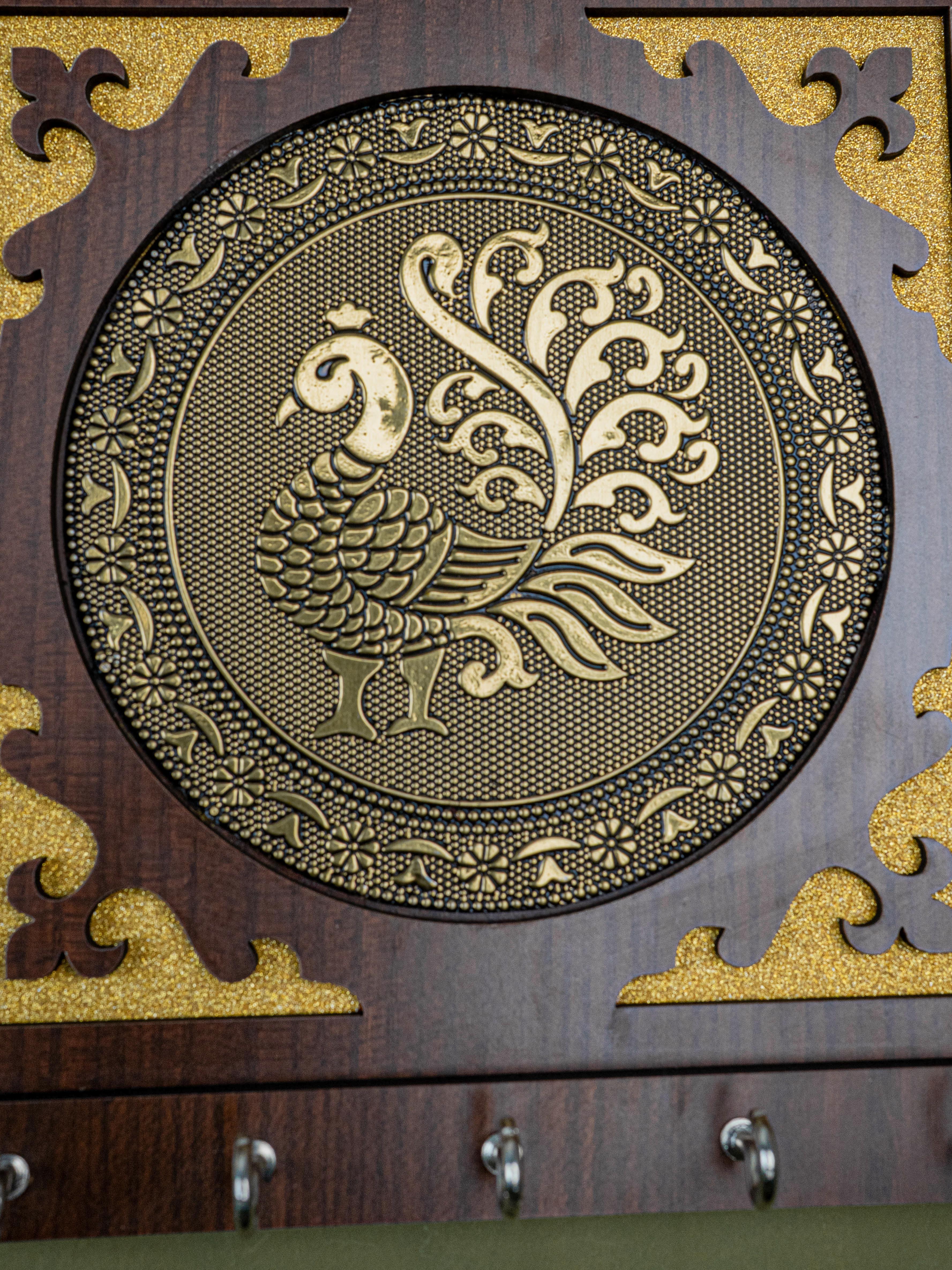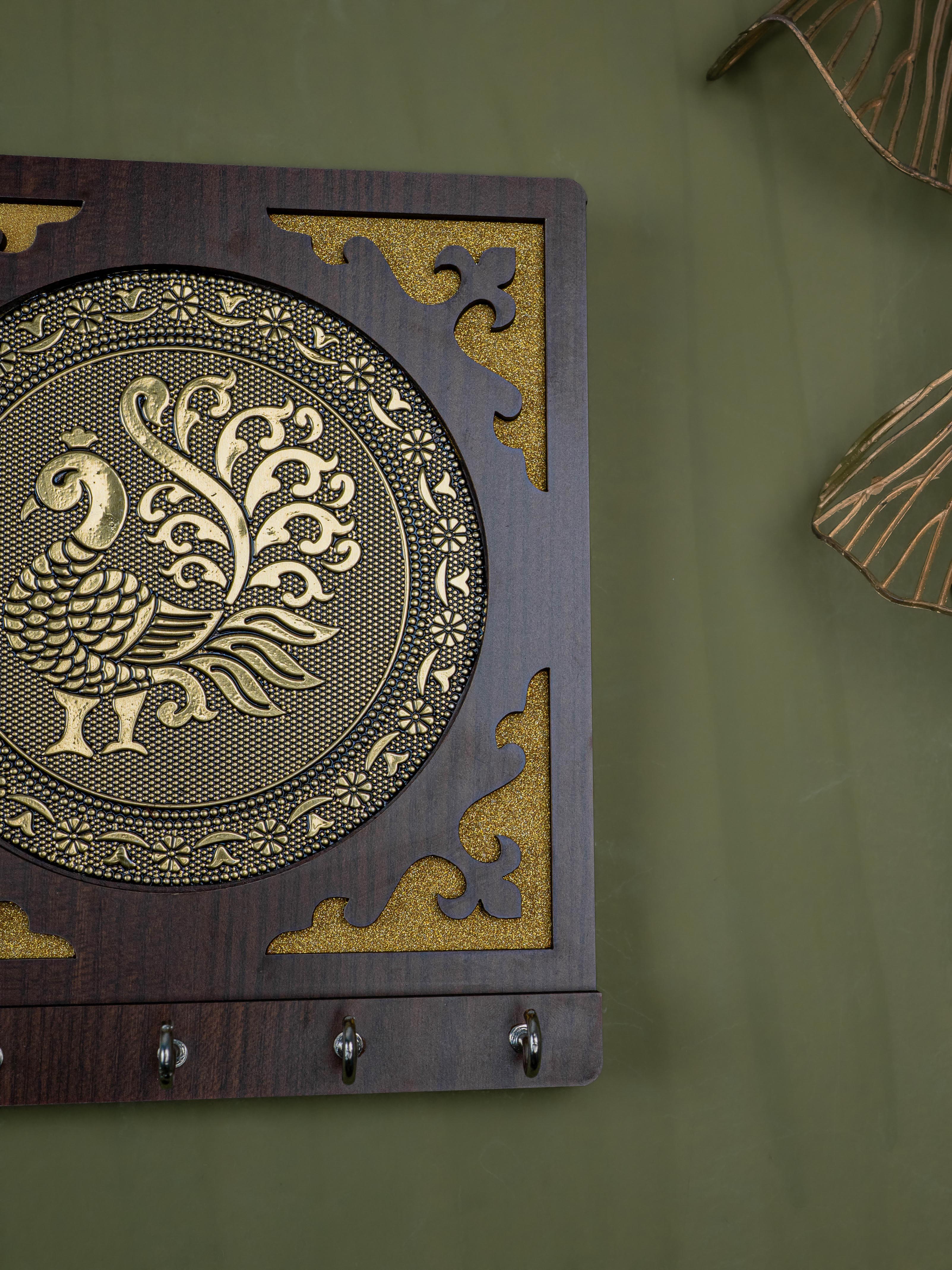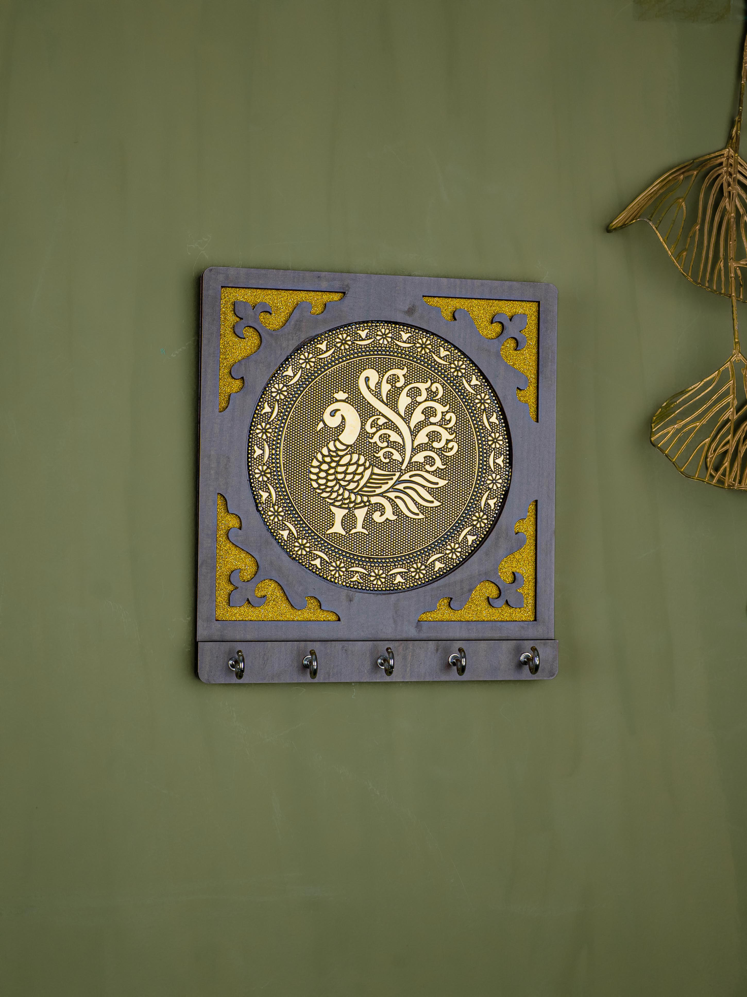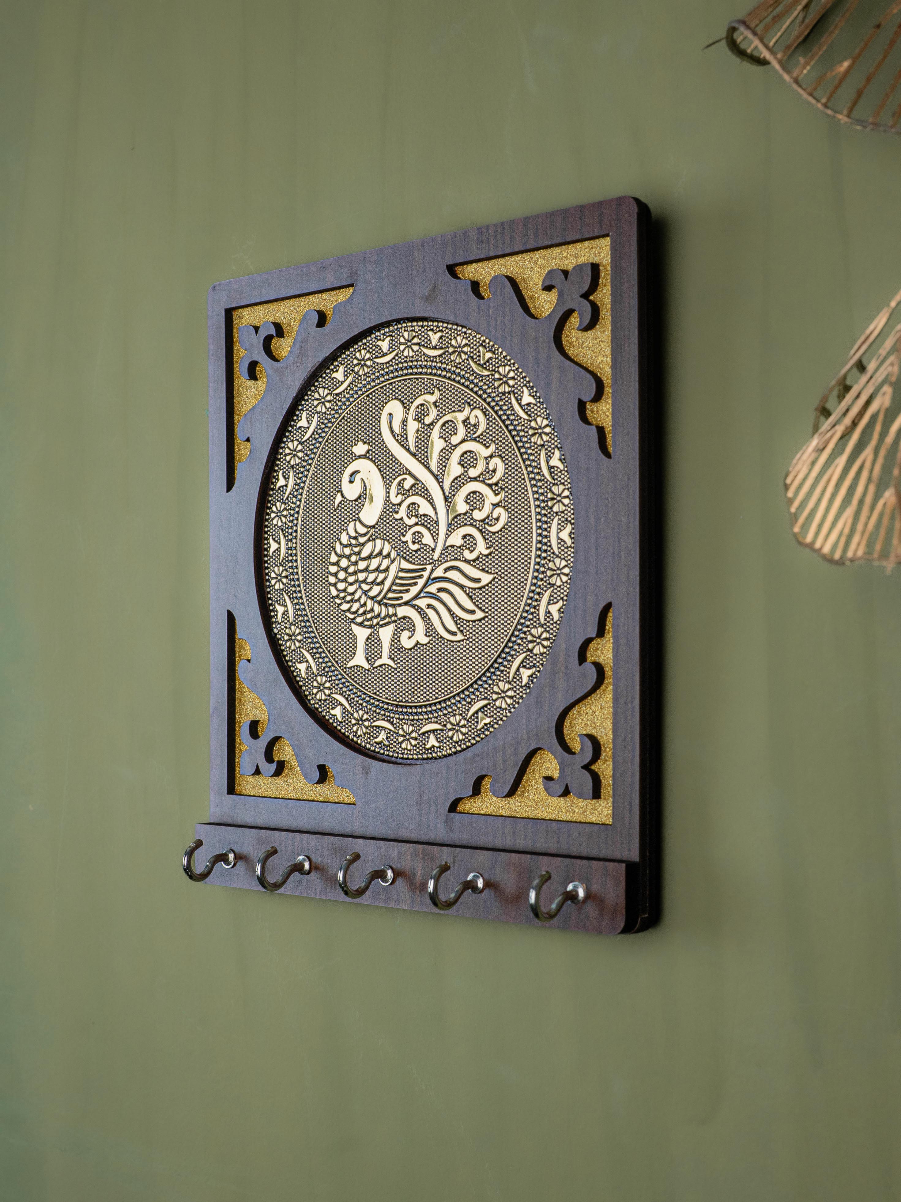 - Beautifully Crafted Wooden Key Hanger Featuring an intricate Annapakshi Design.