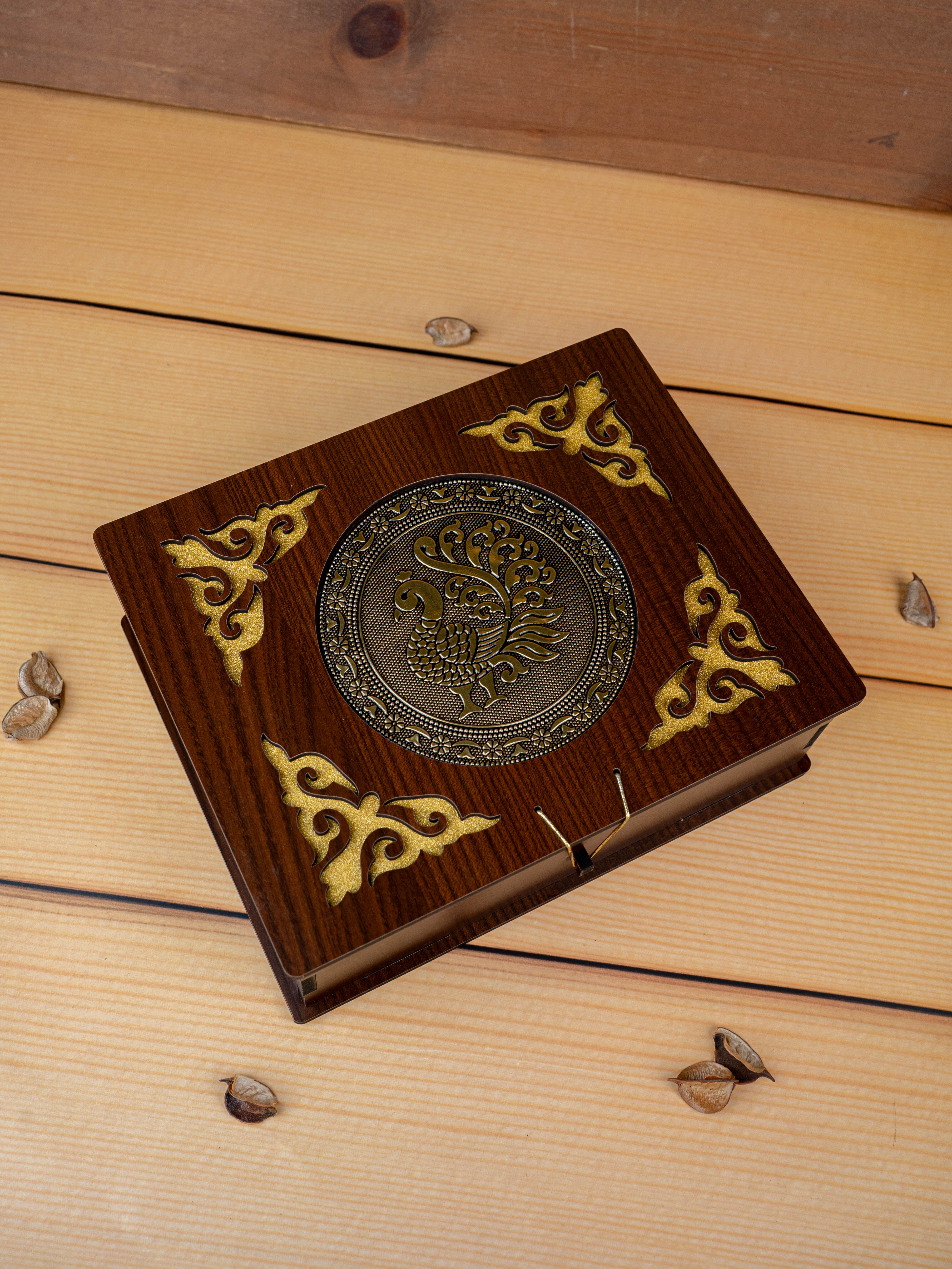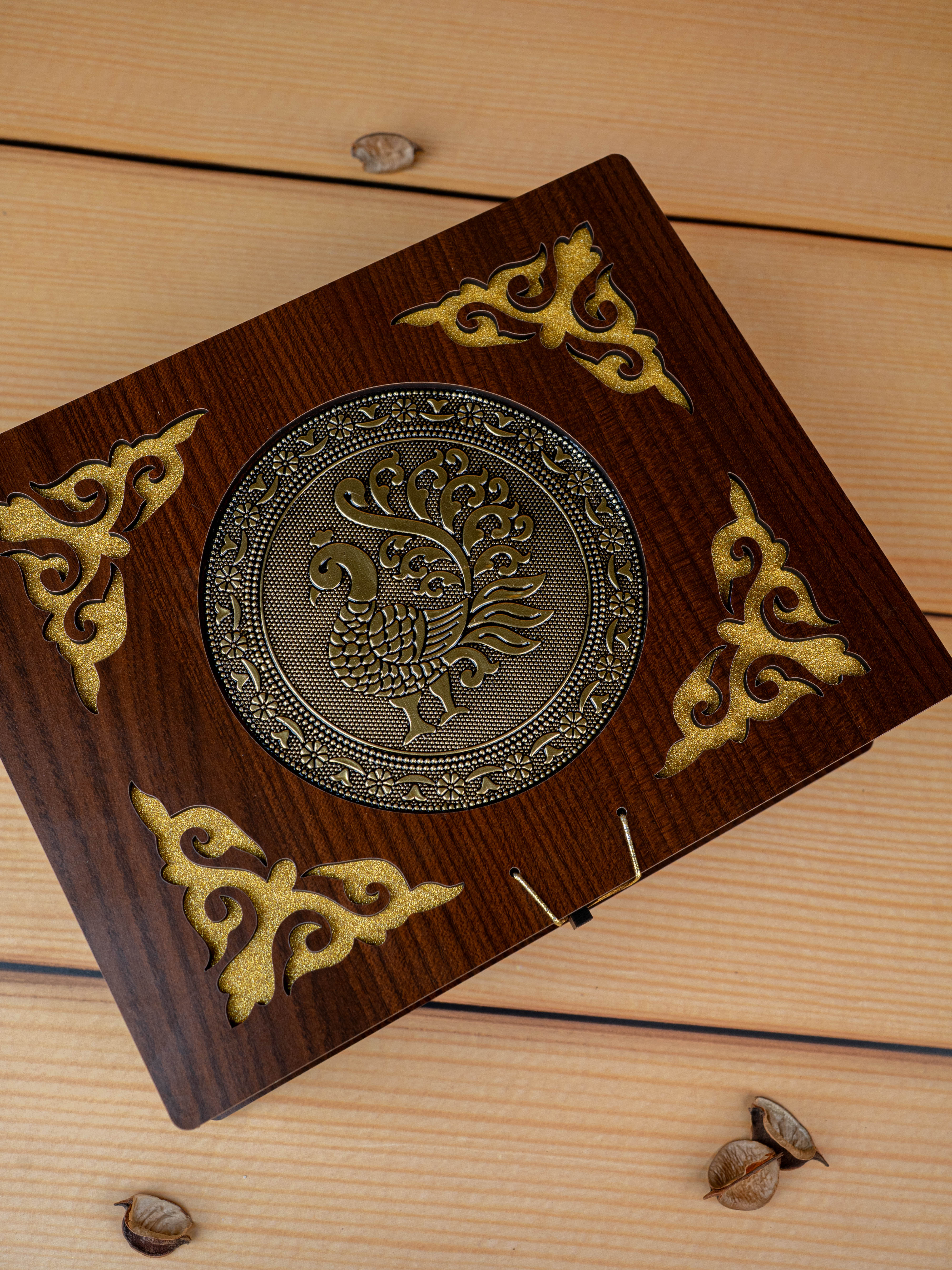 - Intricately Embossed Round Metal at the Center, Showcasing a Detailed Peacock Design Surrounded by Ornate Patterns.