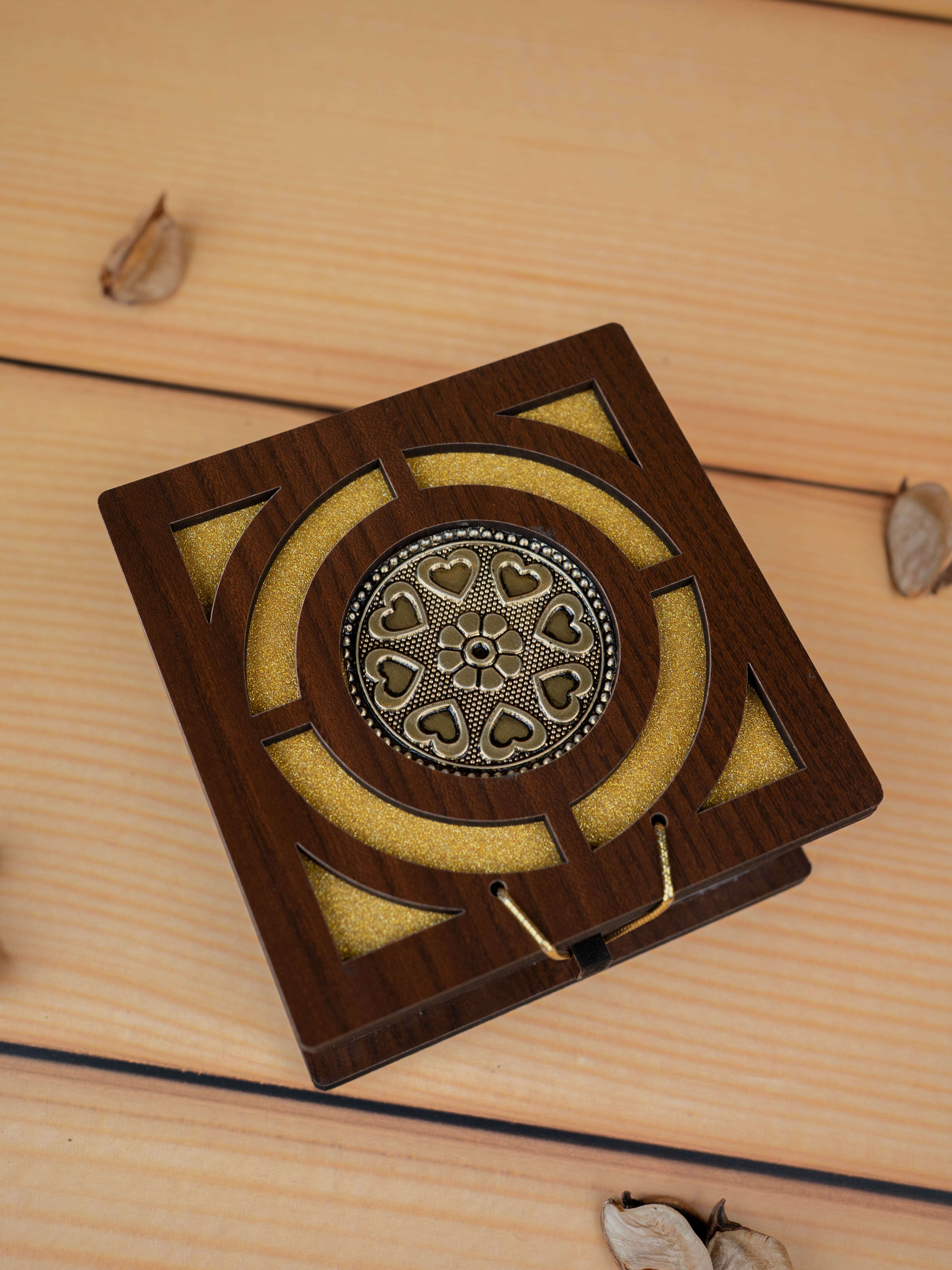 - Semi-Circular and Triangular Inlay Pattern in Golden, forming Decorative Design.