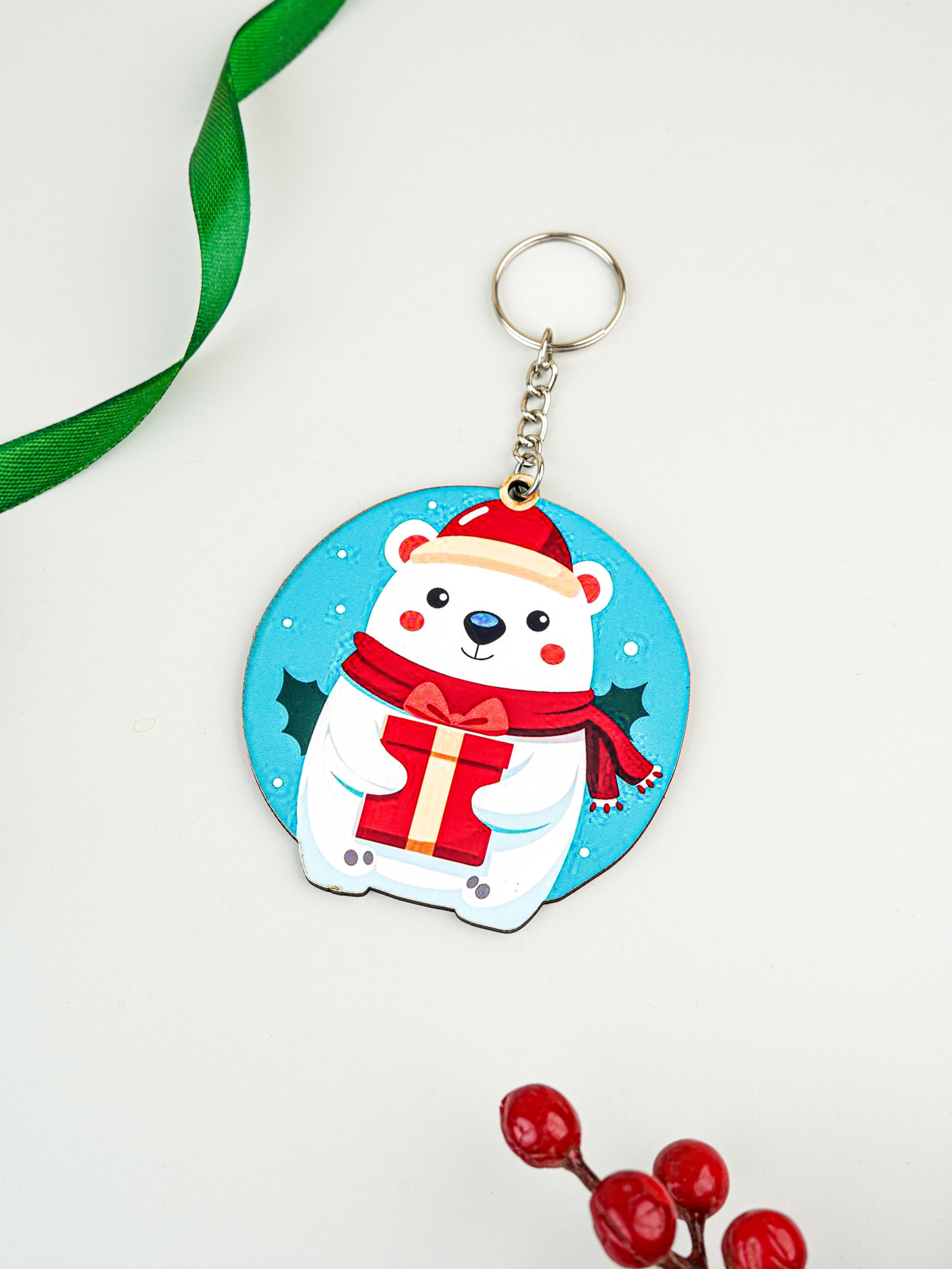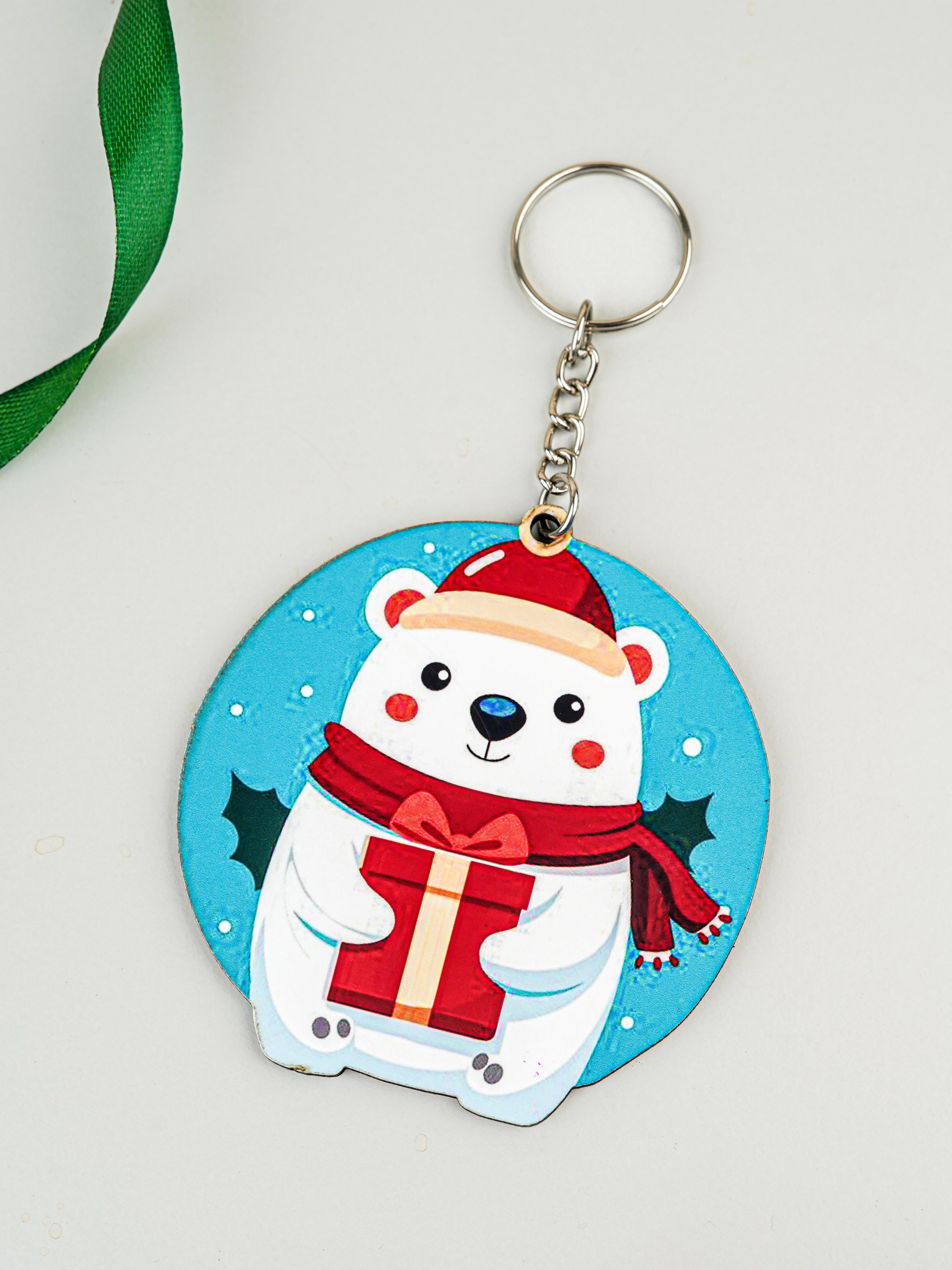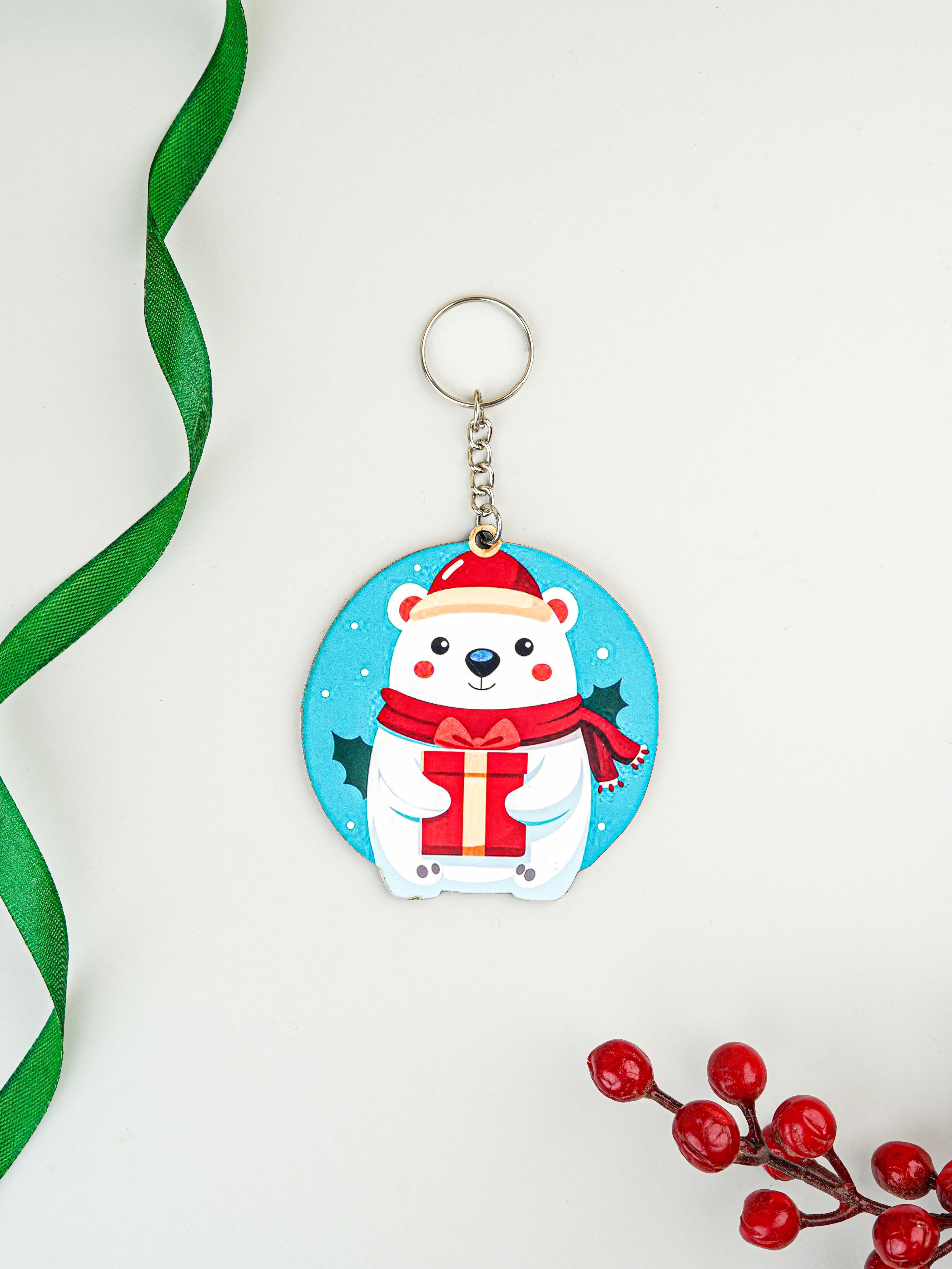 Christmas Keychain featuring a Cute Cartoon Polar Bear in a Festive Design.