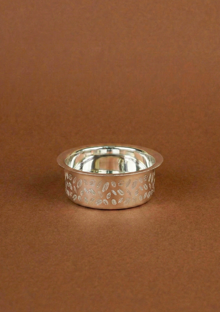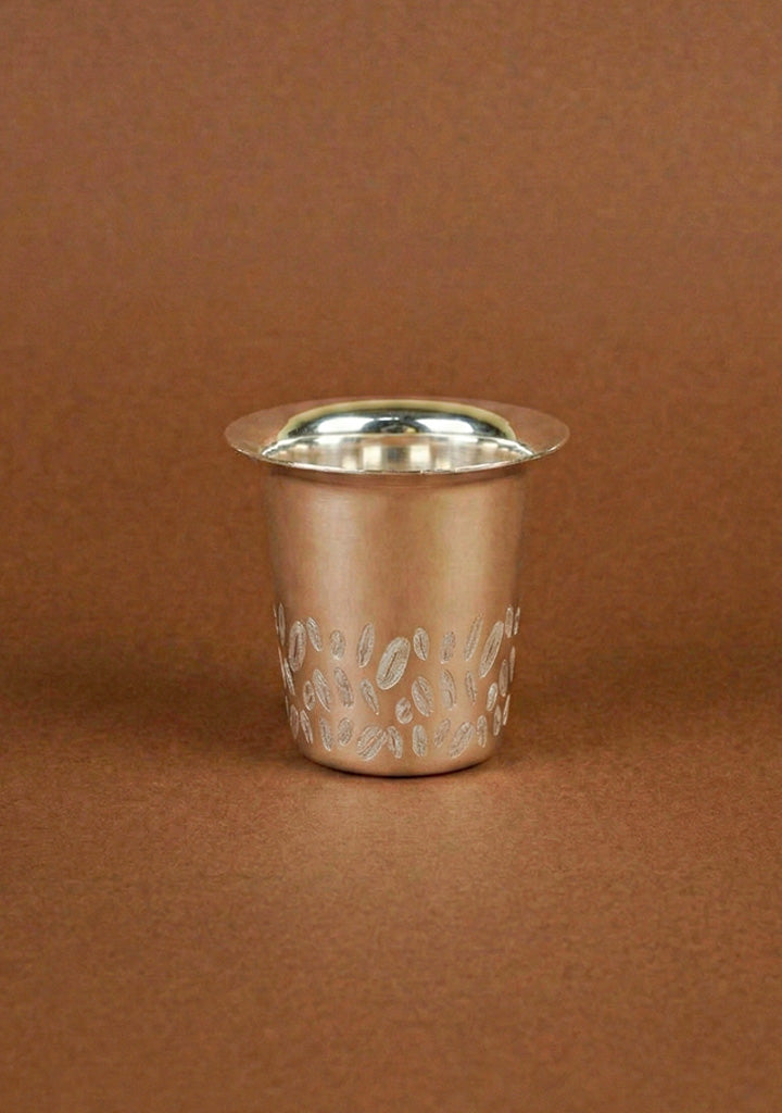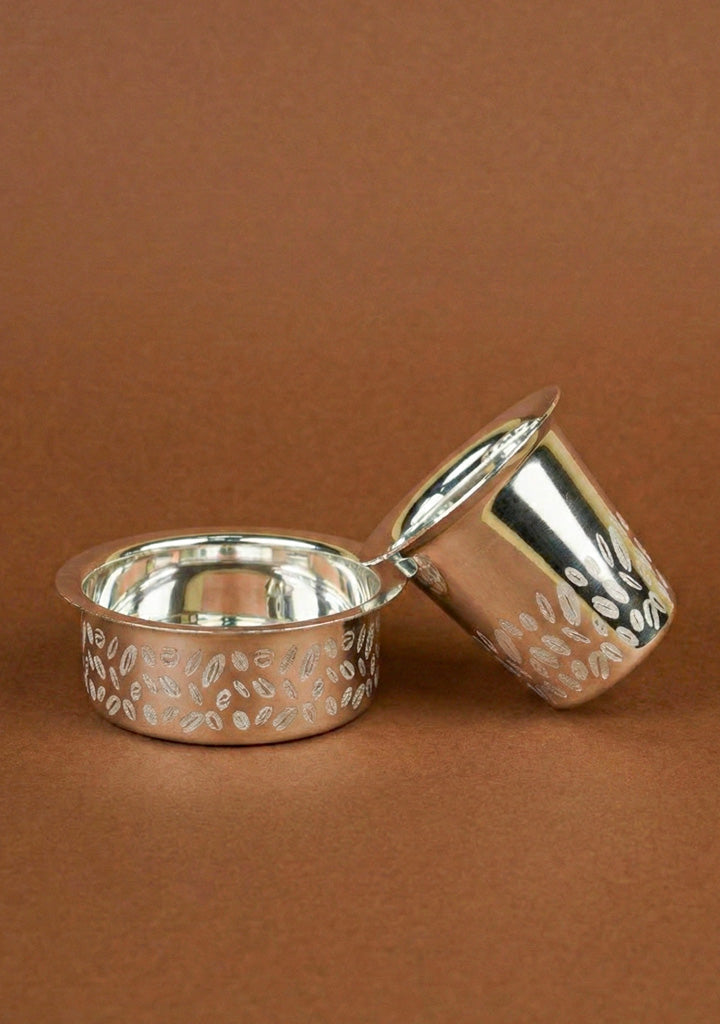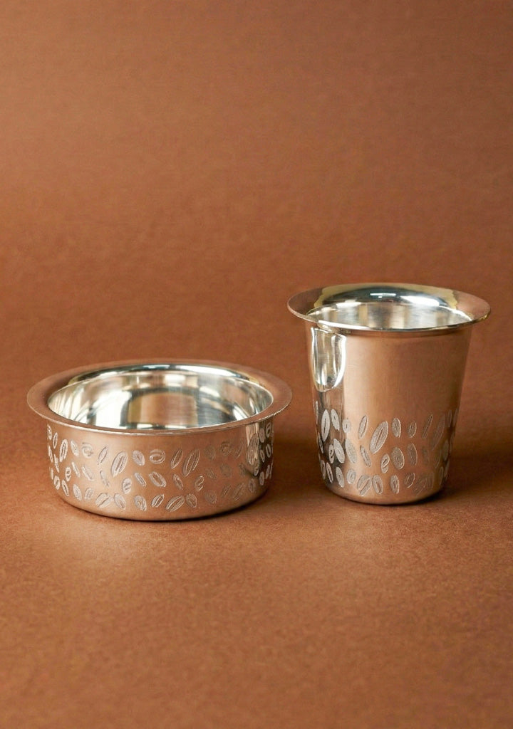 - A Classic South Indian Coffee Dabara Set, Beautifully Crafted with Elegant Coffee Bean Engravings, Celebrating the Rich Tradition of Filter Coffee.