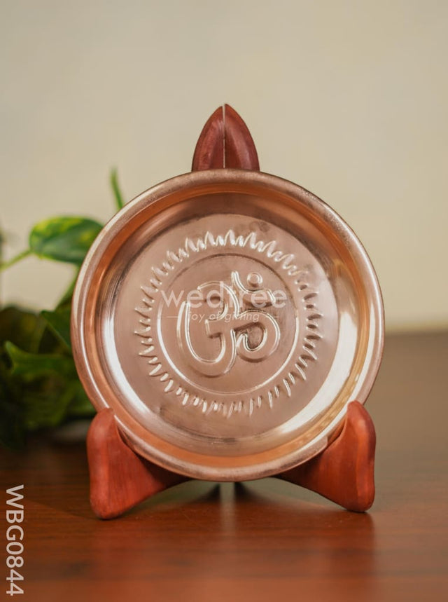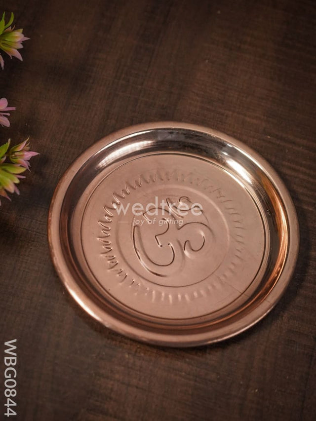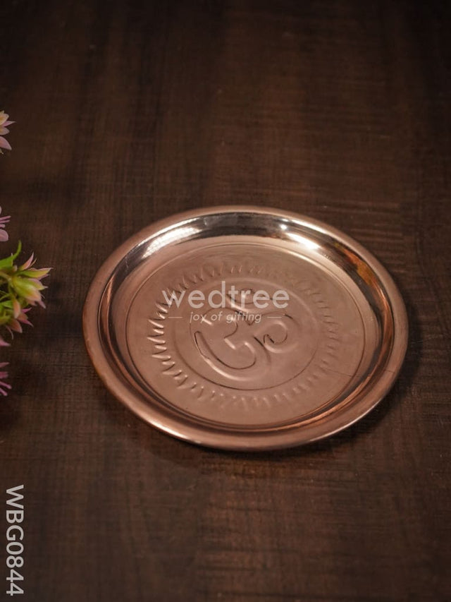- This pooja purpose plate handcrafted out of brass comes with a beautiful engraving of 'OM' in the center.
