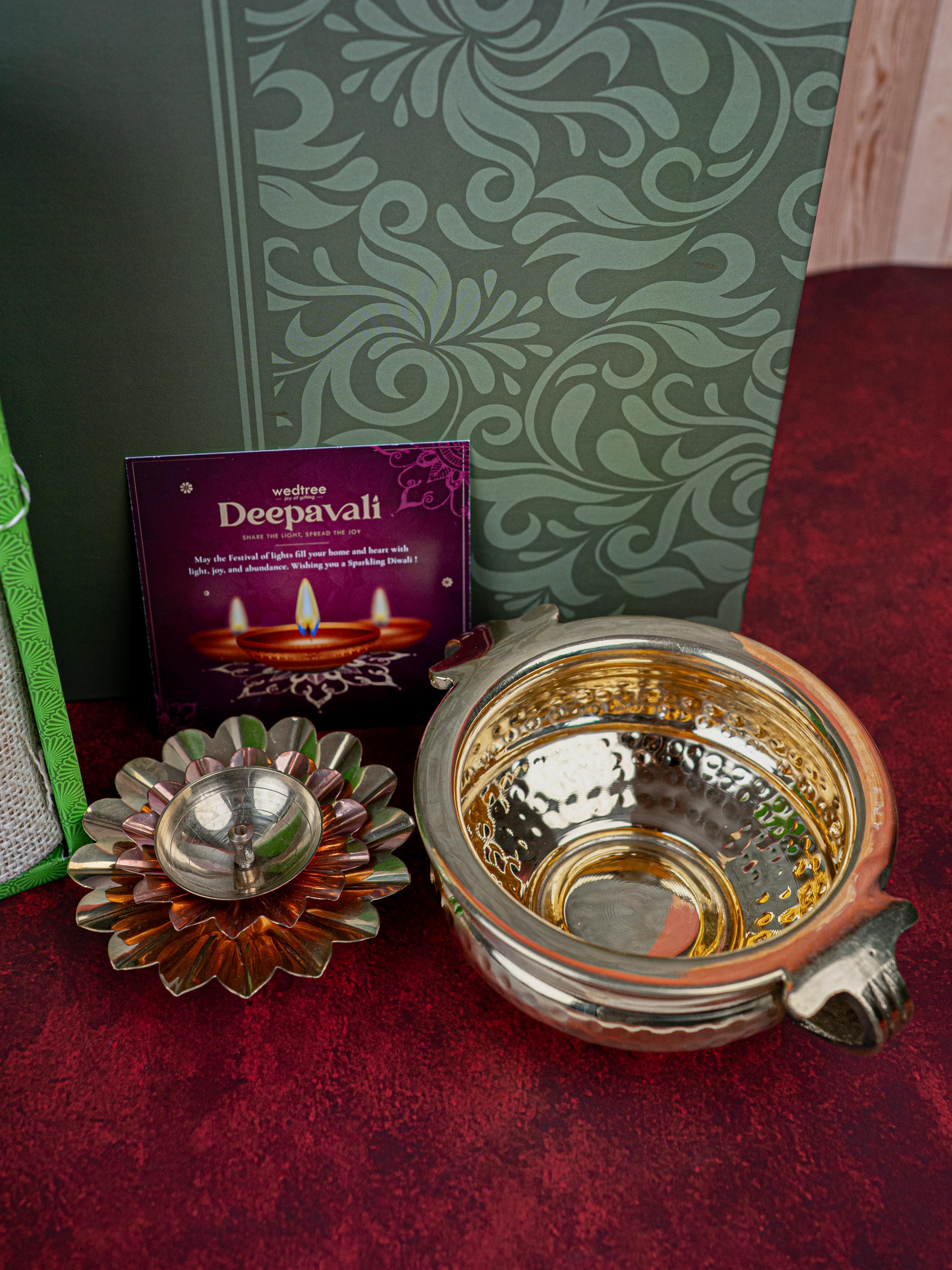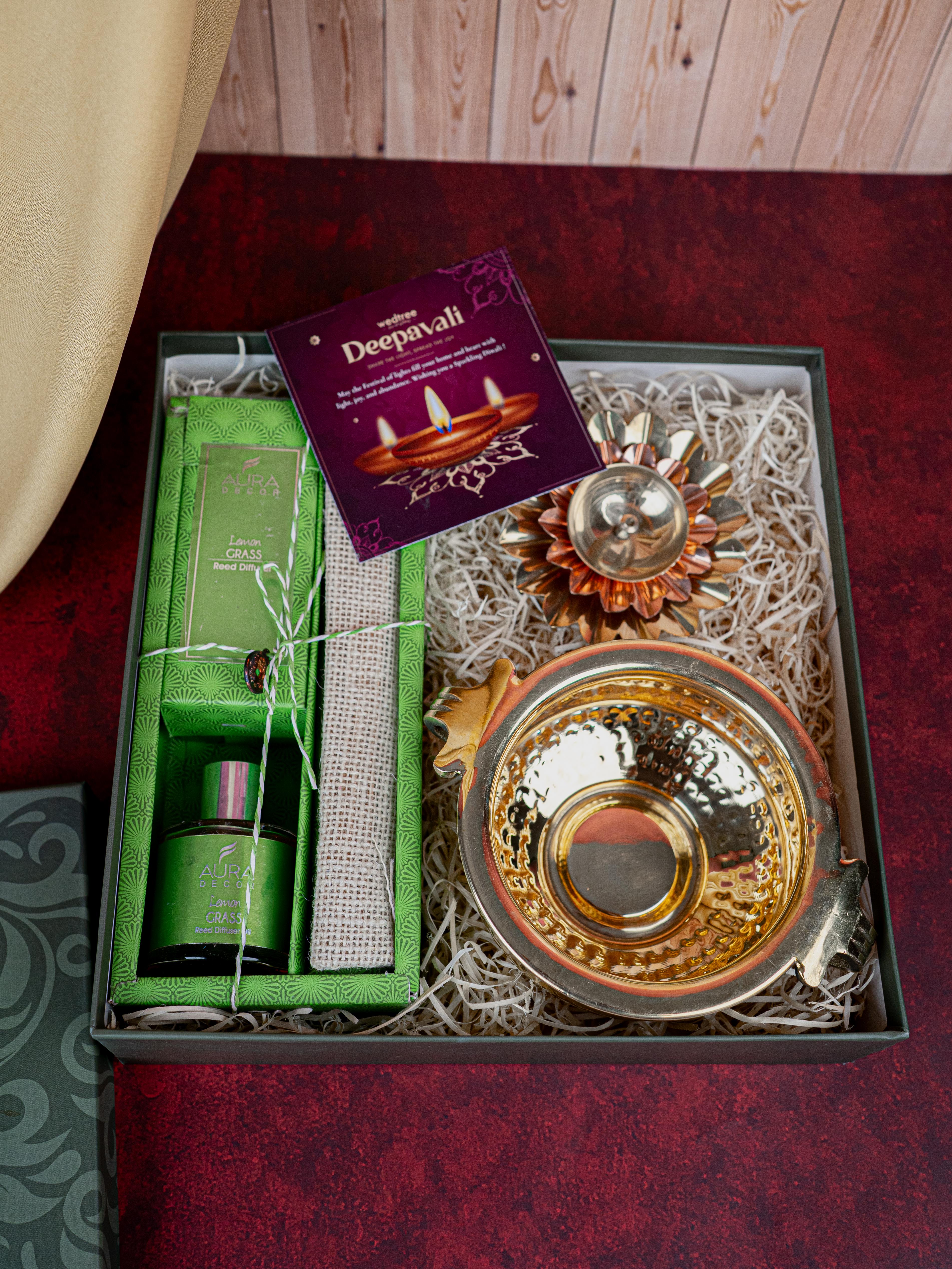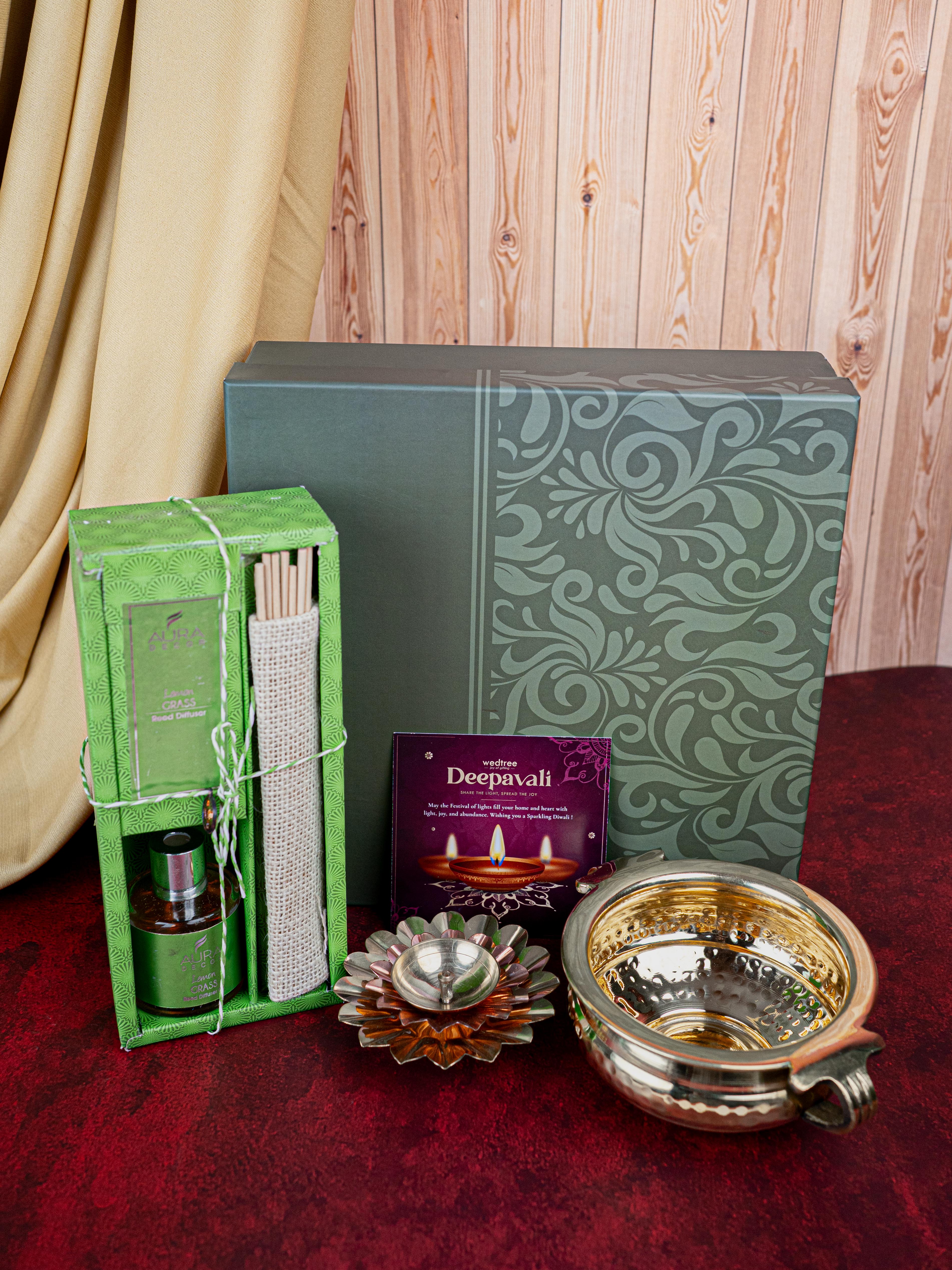 Deepavali: Box with Brass Urli, Flower Diya with Diffuser Oil - WDC0019