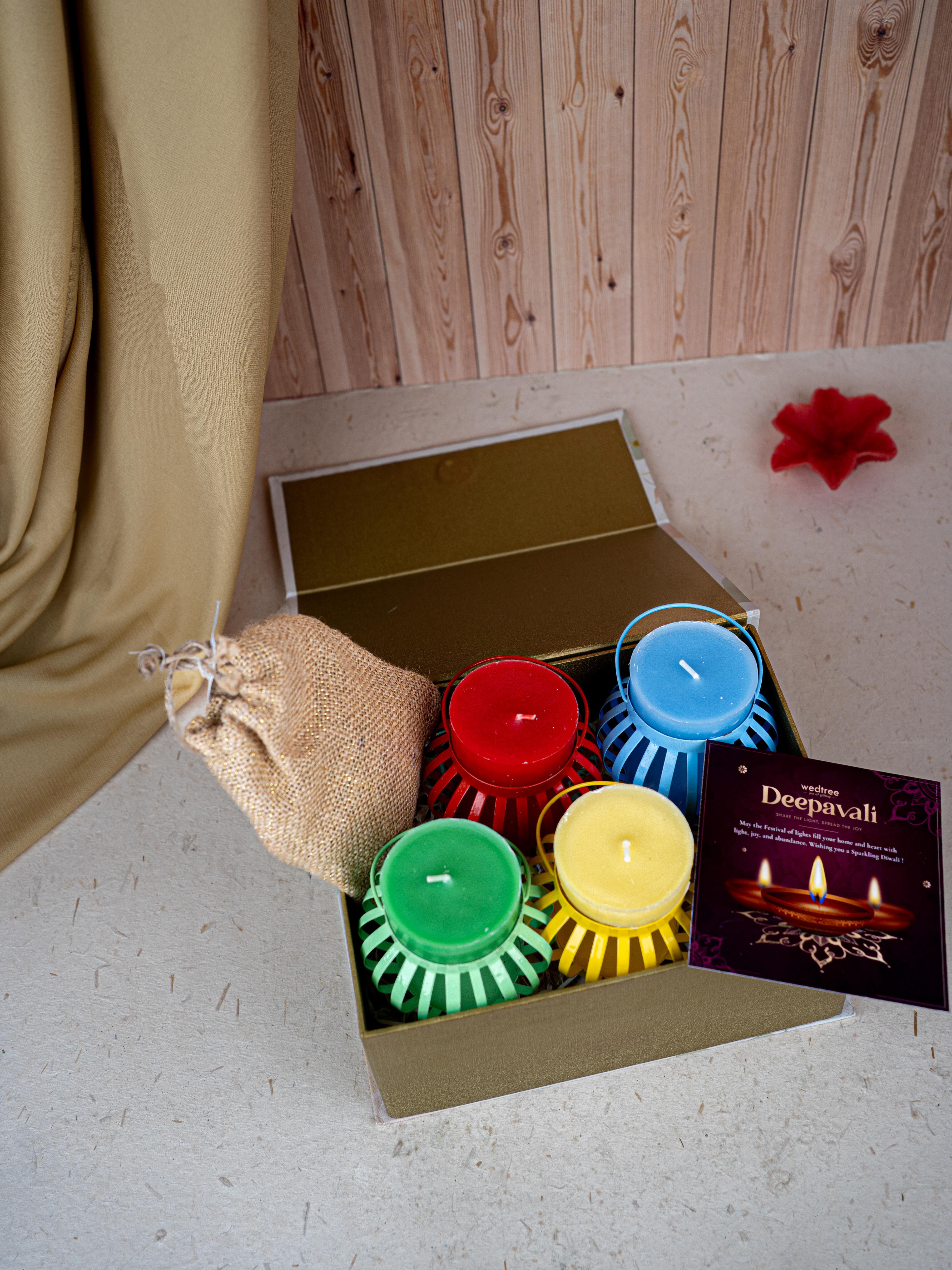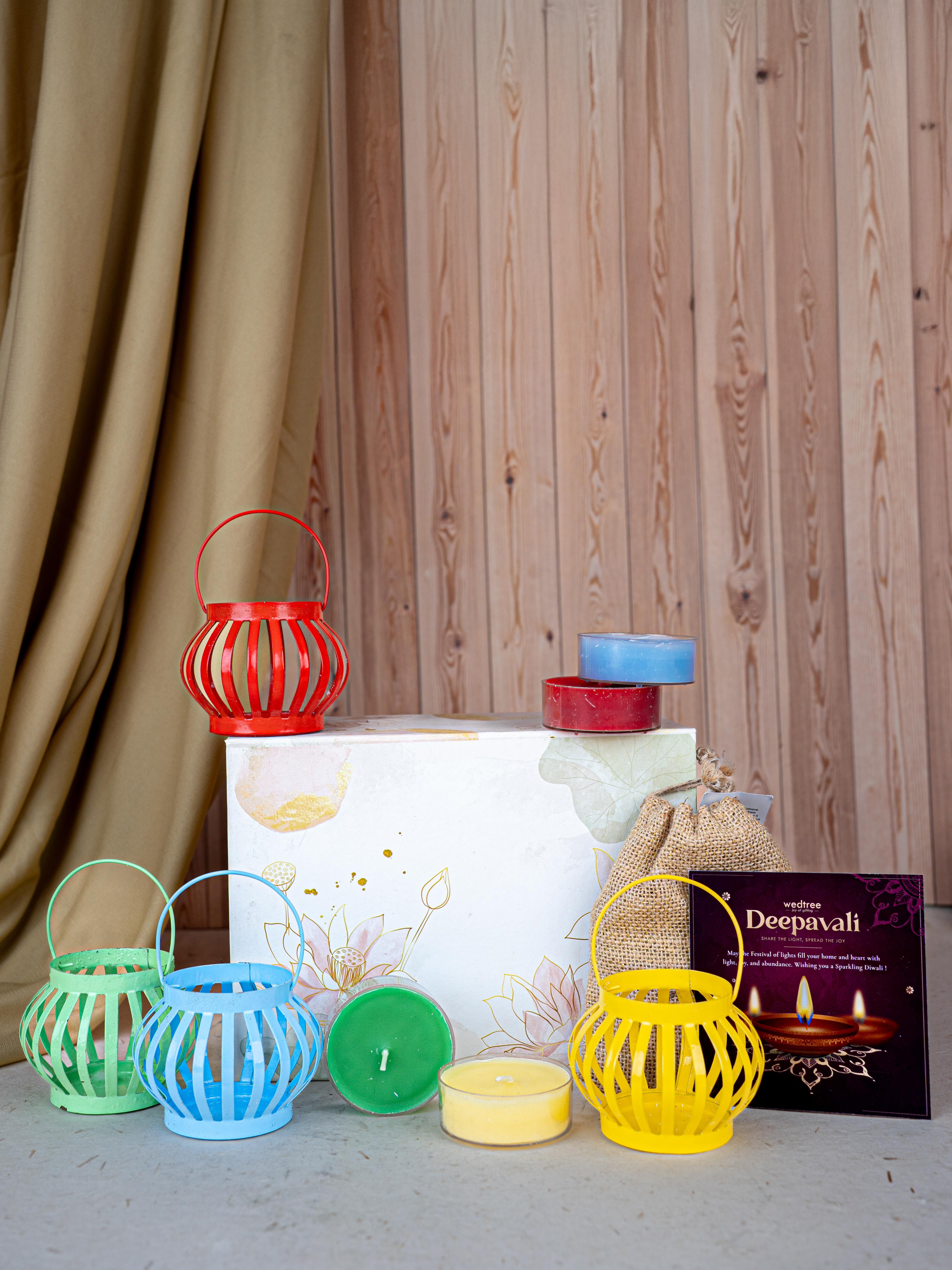 Deepavali: Box with Decorative Metal T-light Holder, 7 Chakra Scented Candle & Natural Fragrance Jute String Bag - WDC0021