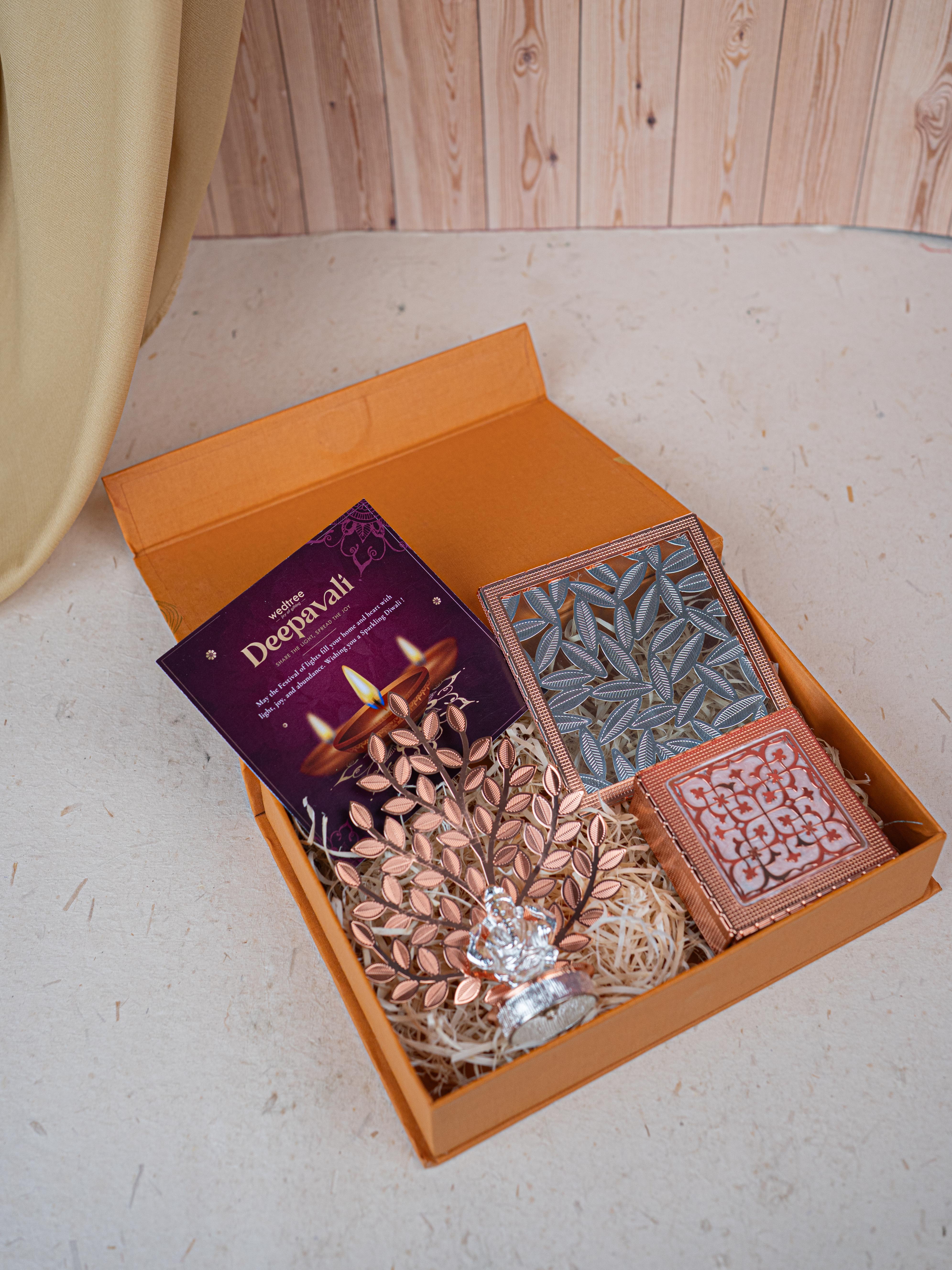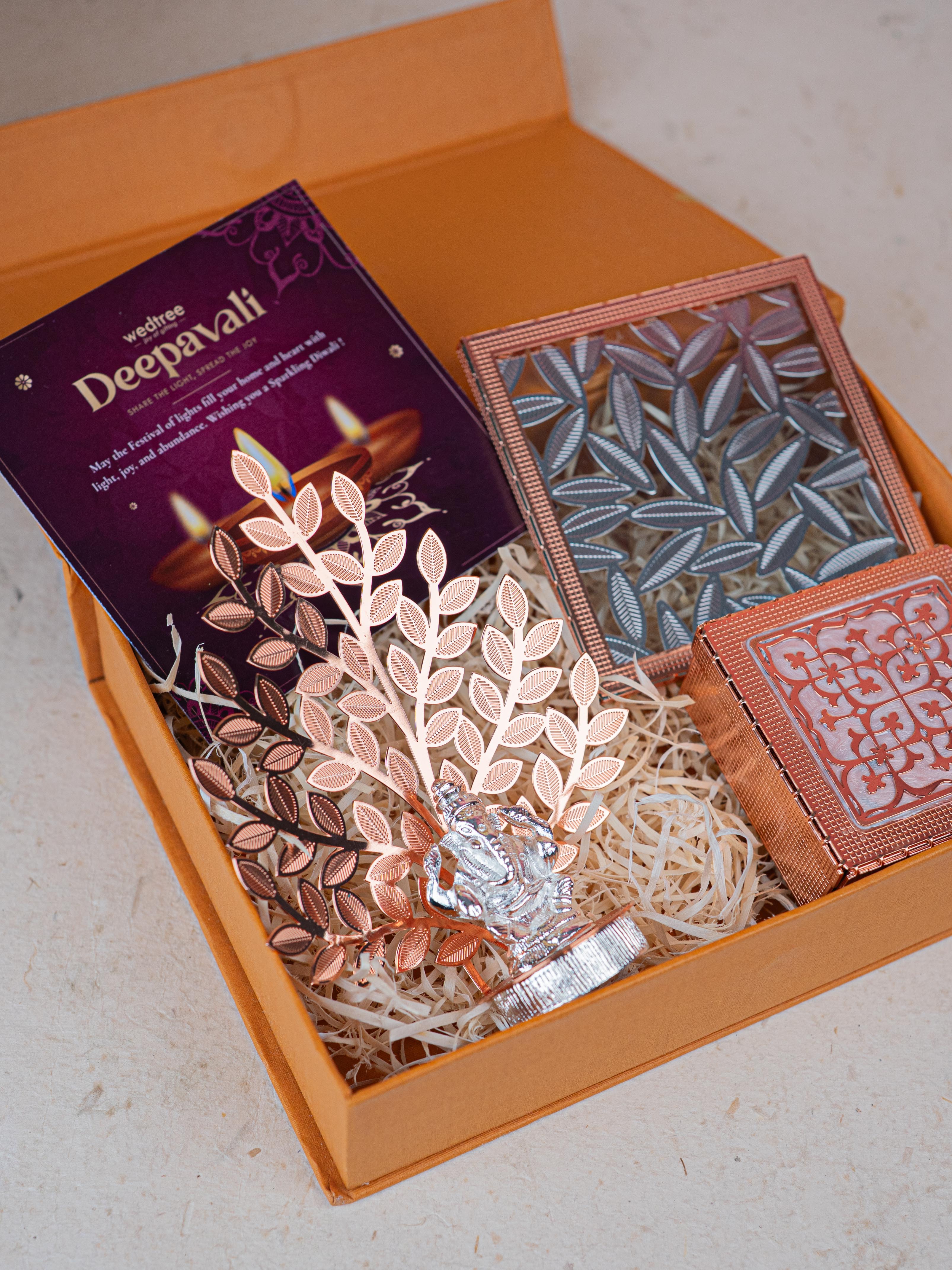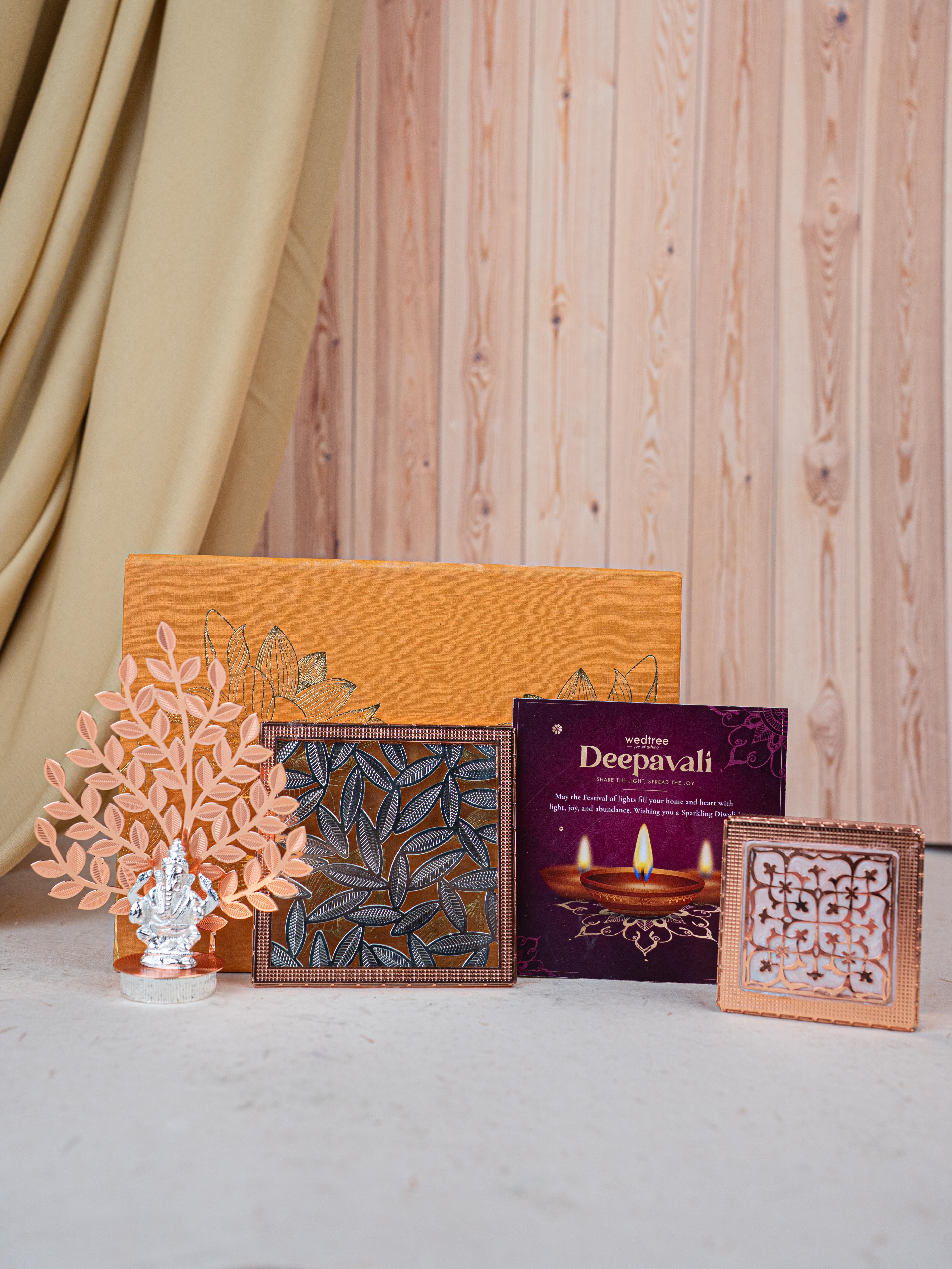 Deepavali: Box with Metal Box, Floral Coaster, Ganesha Idol with Tree - WDC0017