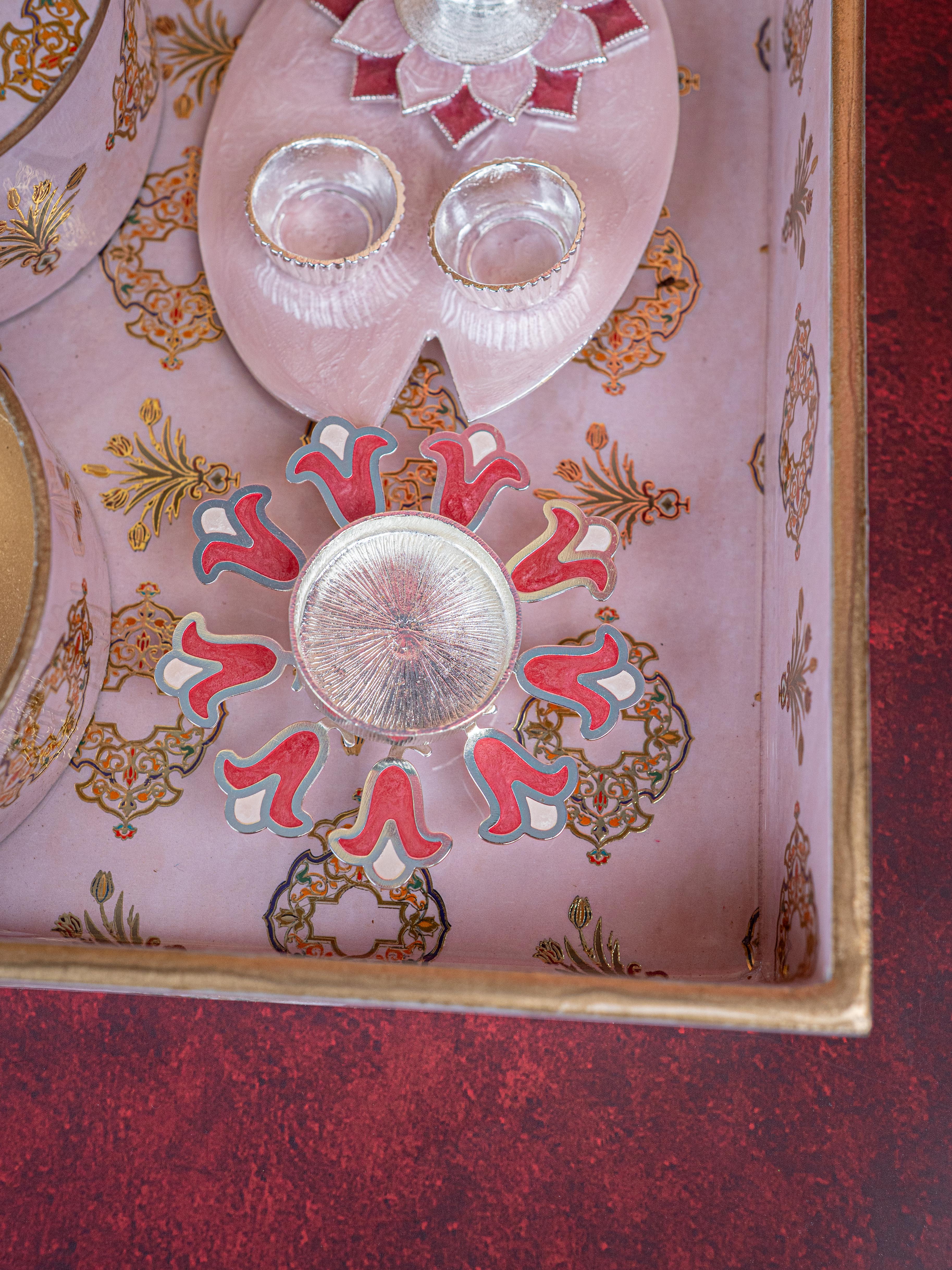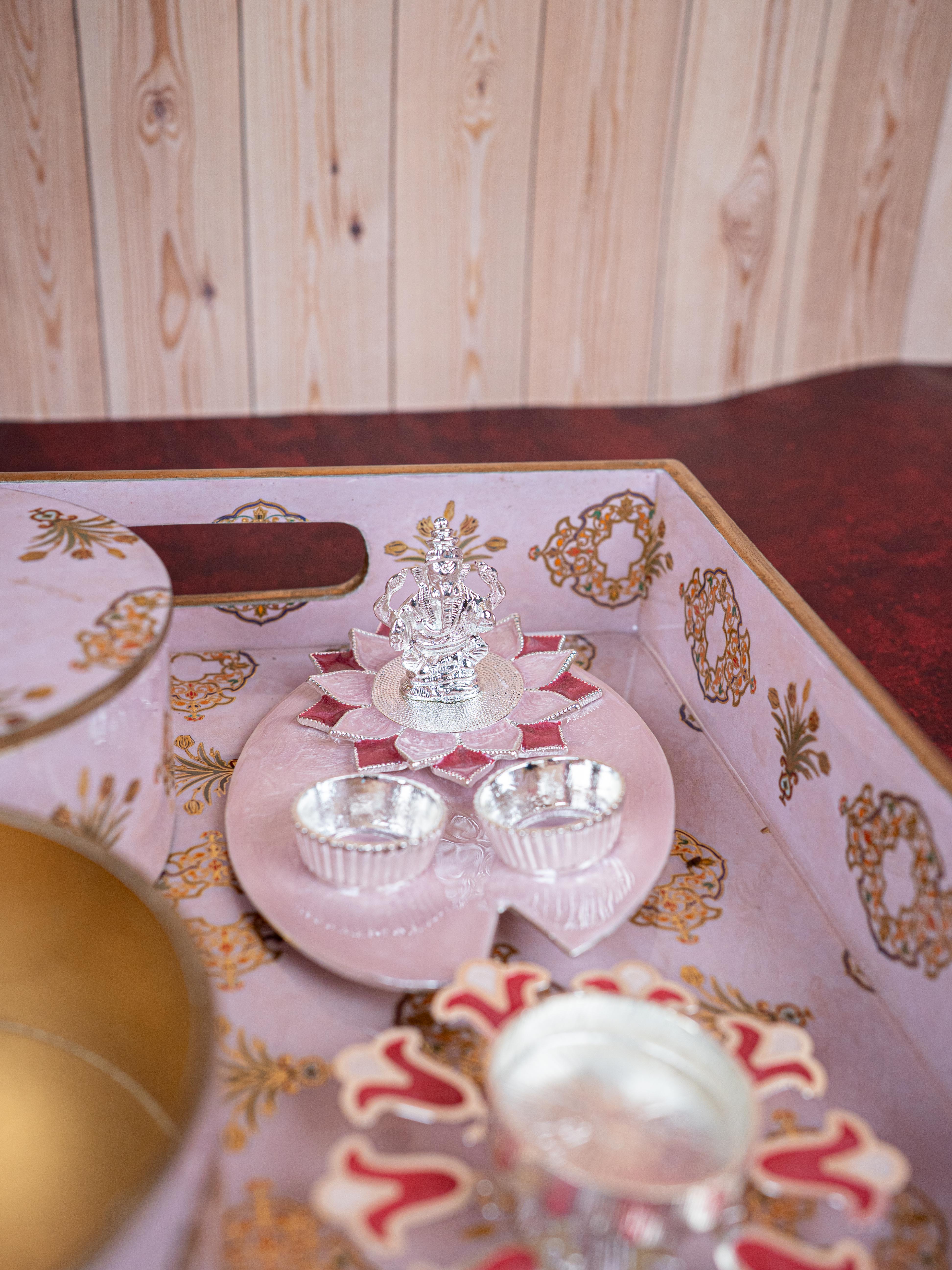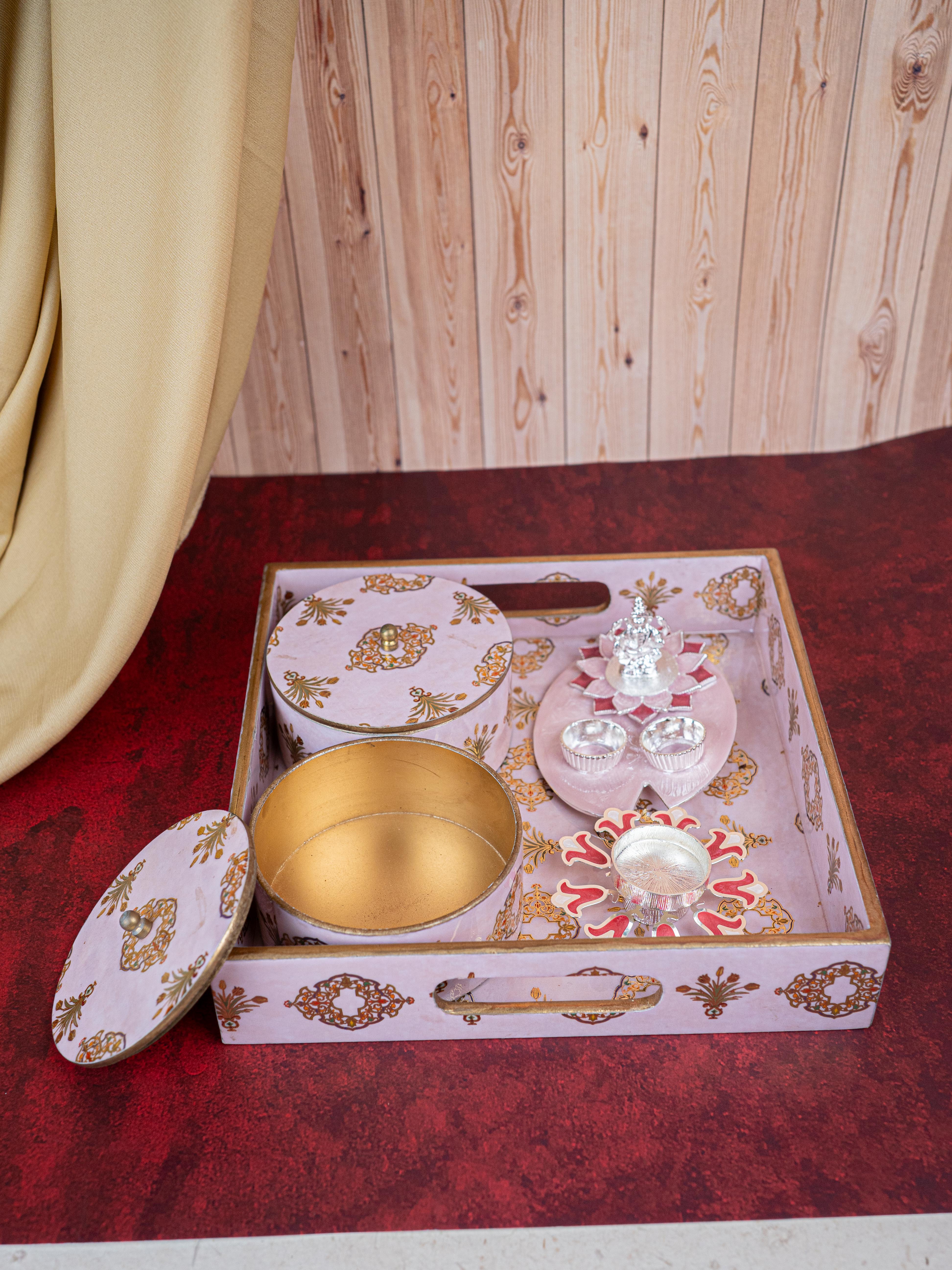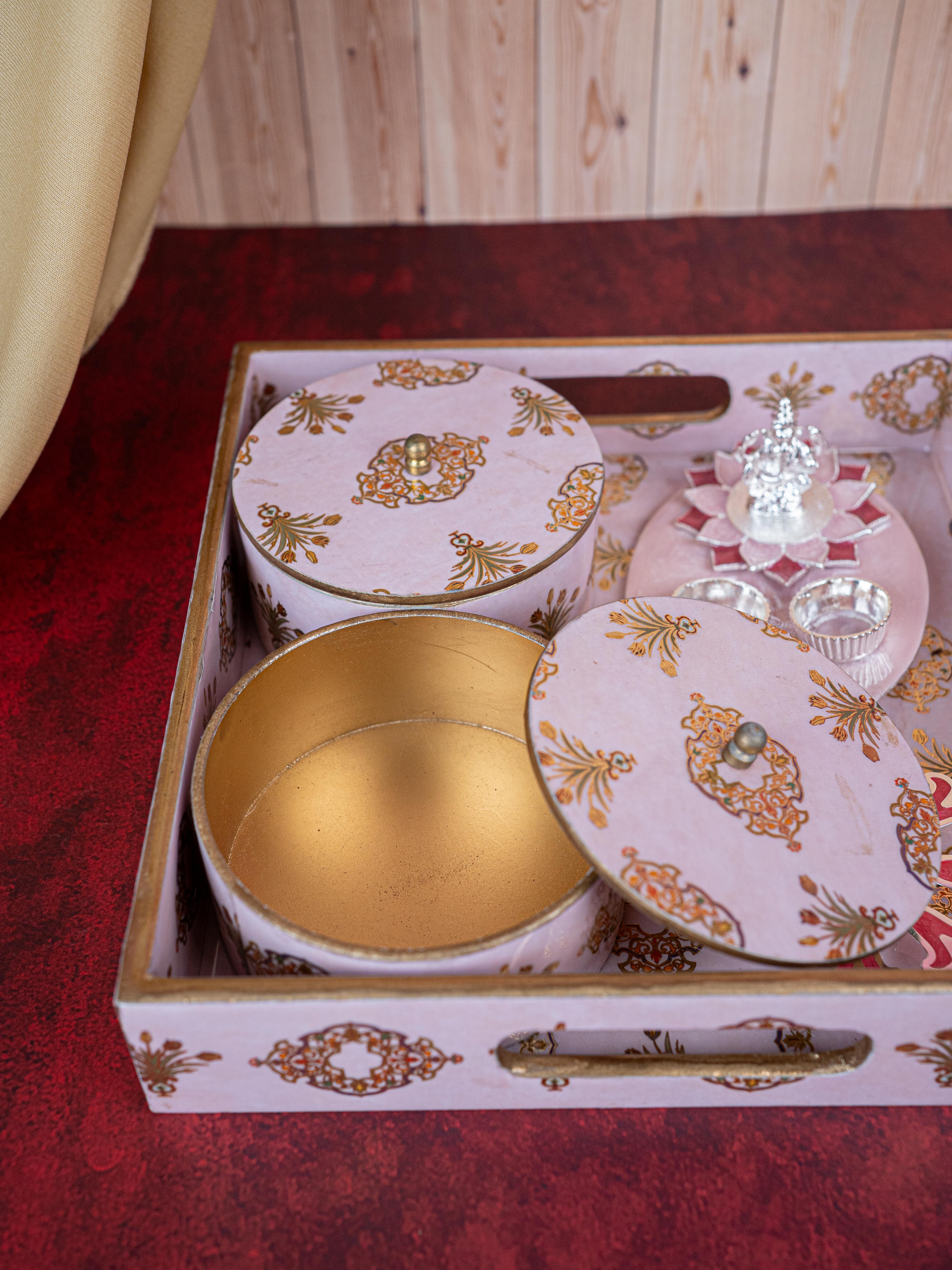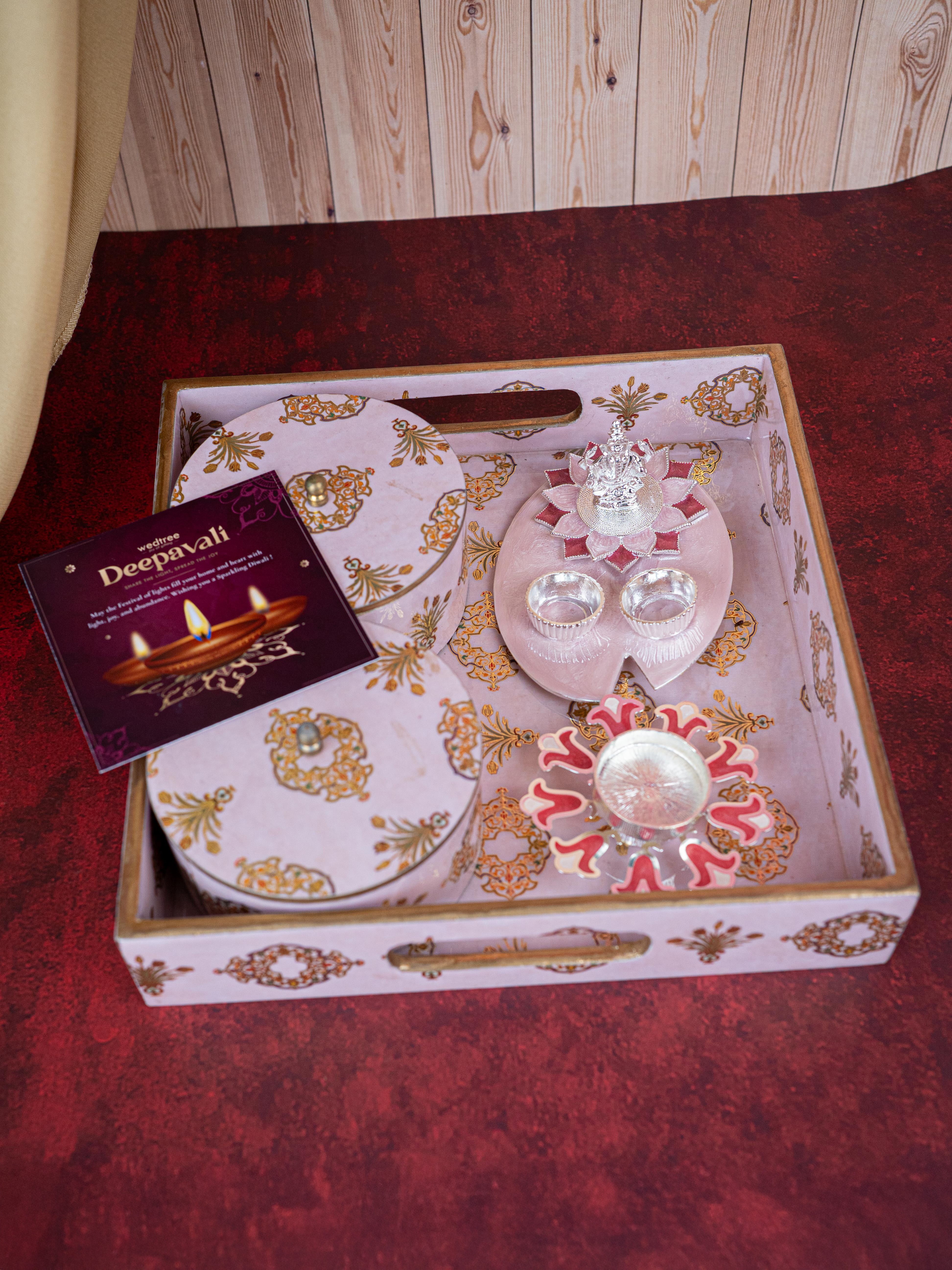 Deepavali: Digital Printed 2 Bowl with Tray, Designer Diya, Ganesha Kumkum Holder & Dry Fruits - WDC0015
