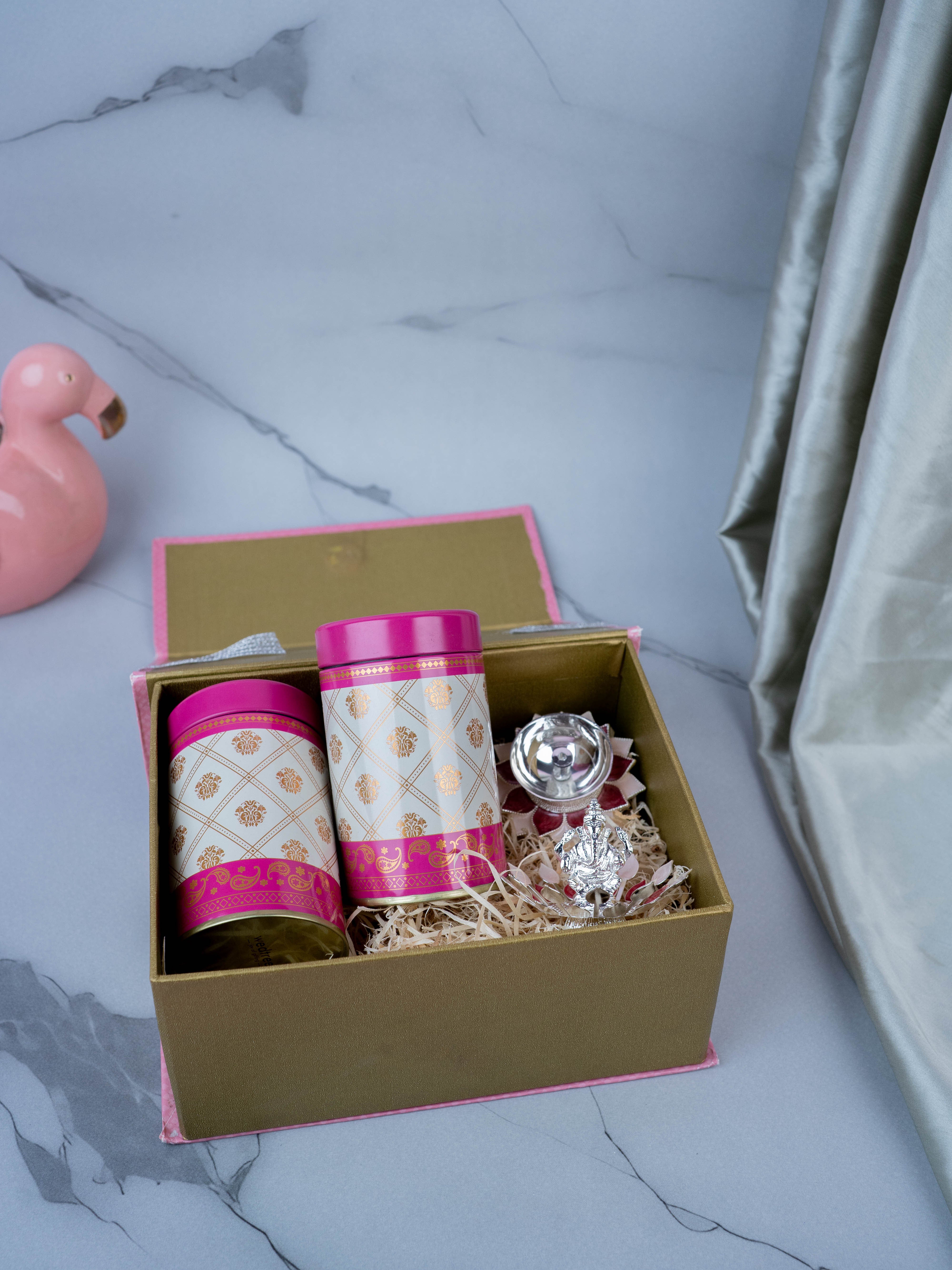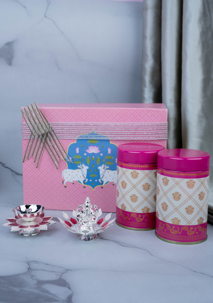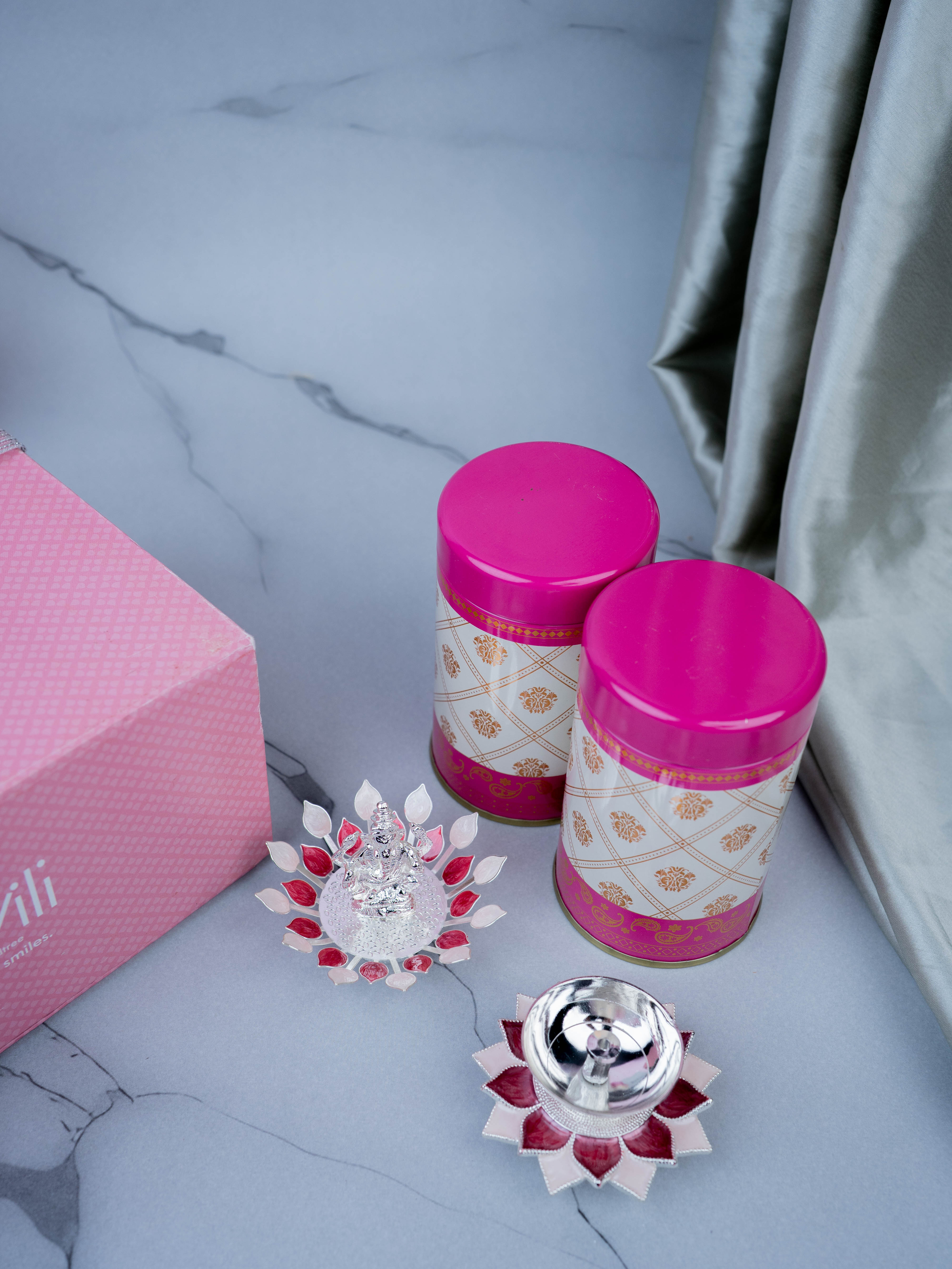 Deepavali: Hamper Box with Set of 2 Tin Jar, German Silver Ganesha on Lotus & Lotus Diya - WDC0006