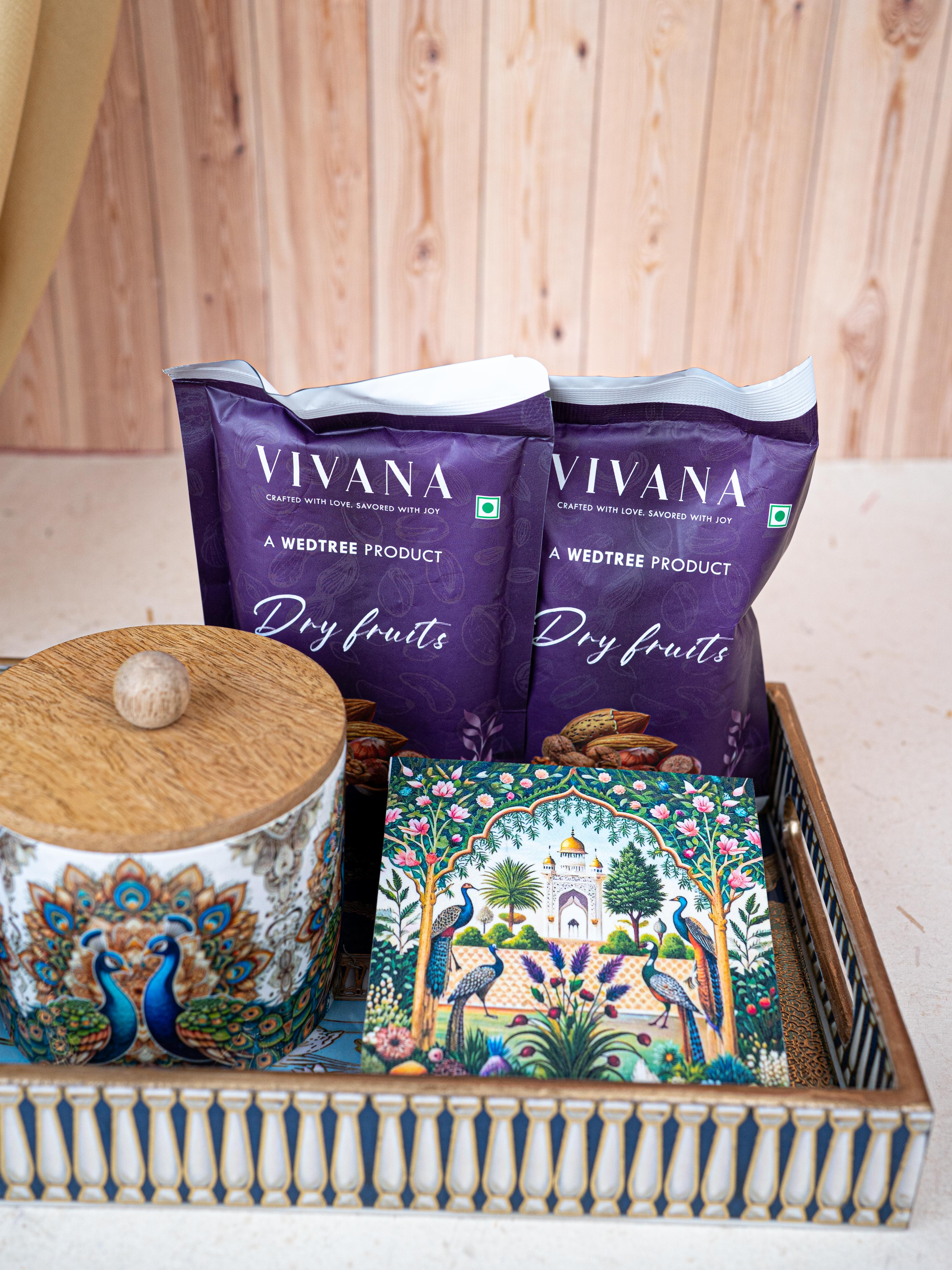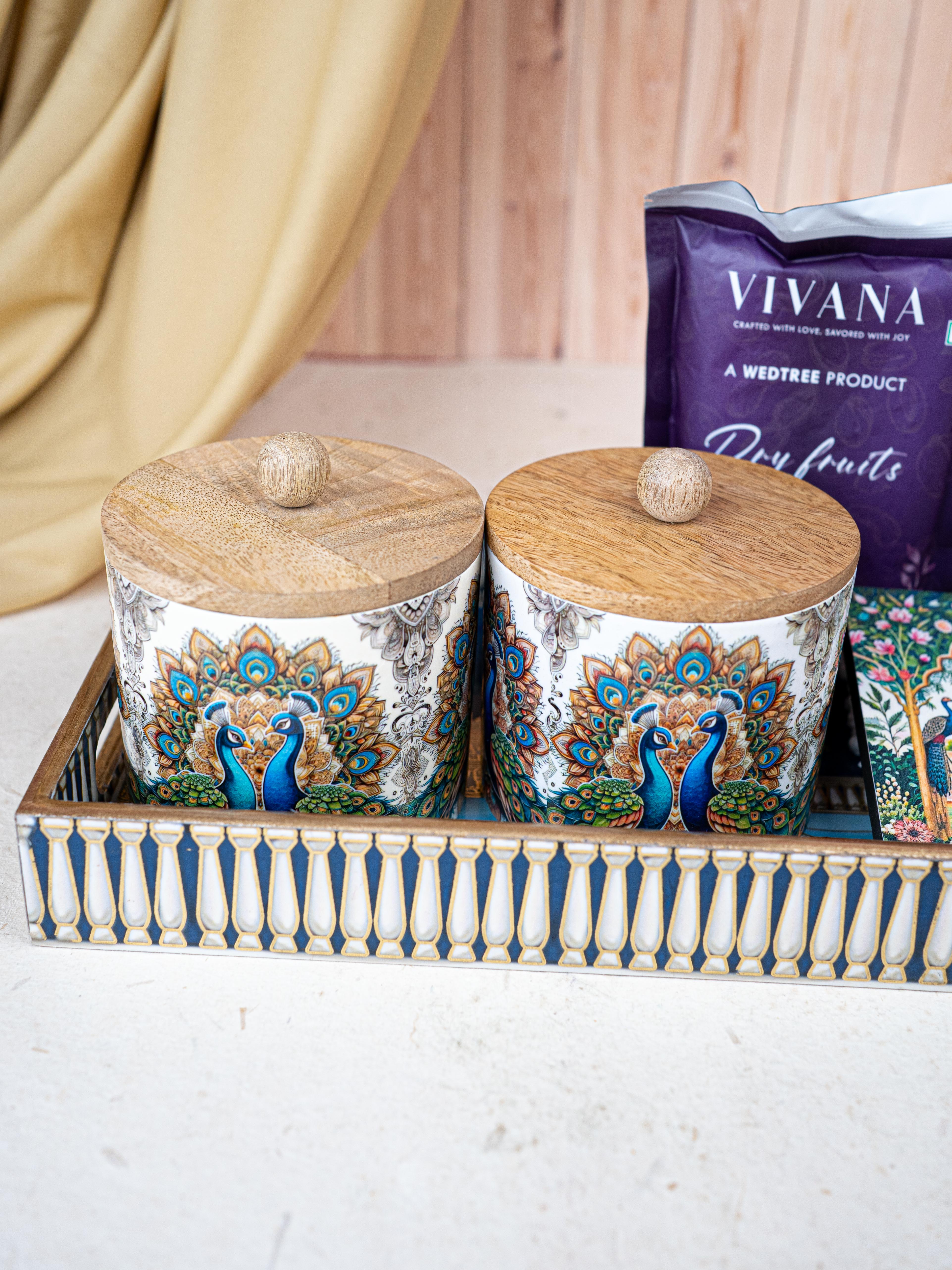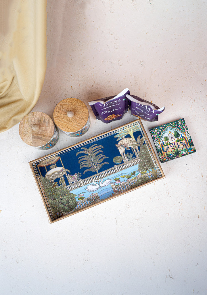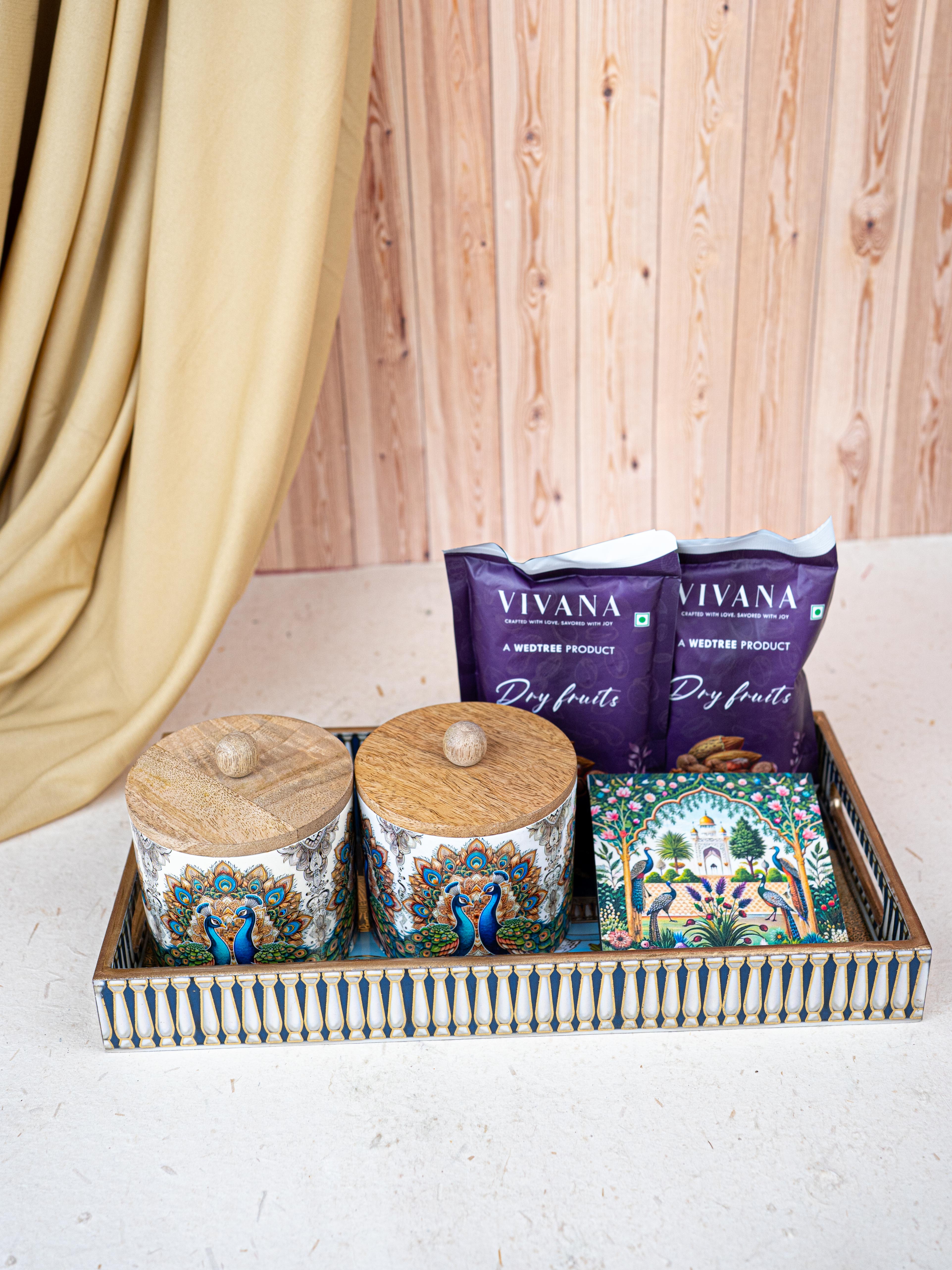 Deepavali: Swan Themed Printed Tray with Dry Fruit Jars, Manai and Dry Fruits - WDC0011