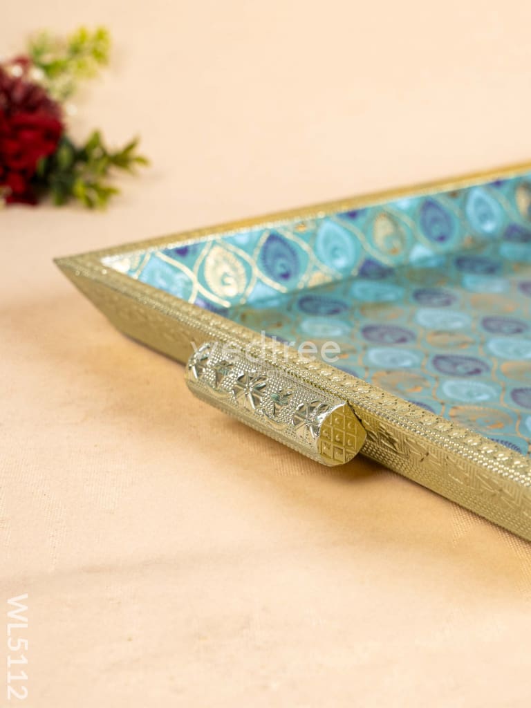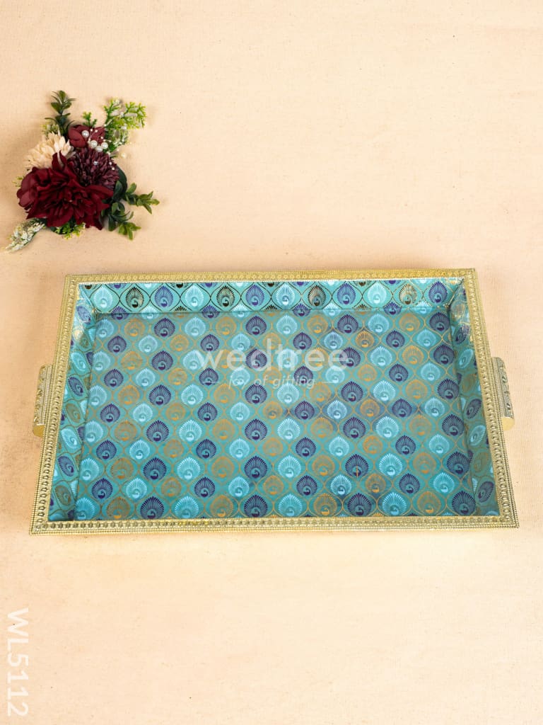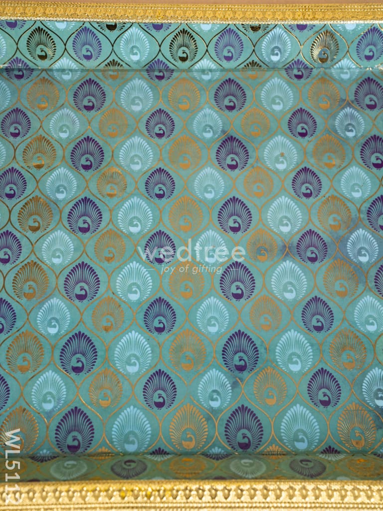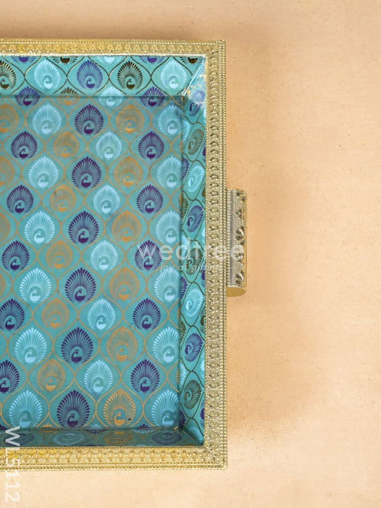 - The Tray Showcases an Intricate Pattern of Stylized Peacock Eyes in Shades of Teal, Blue and Gold Reflecting Elegance and Traditional Charm.