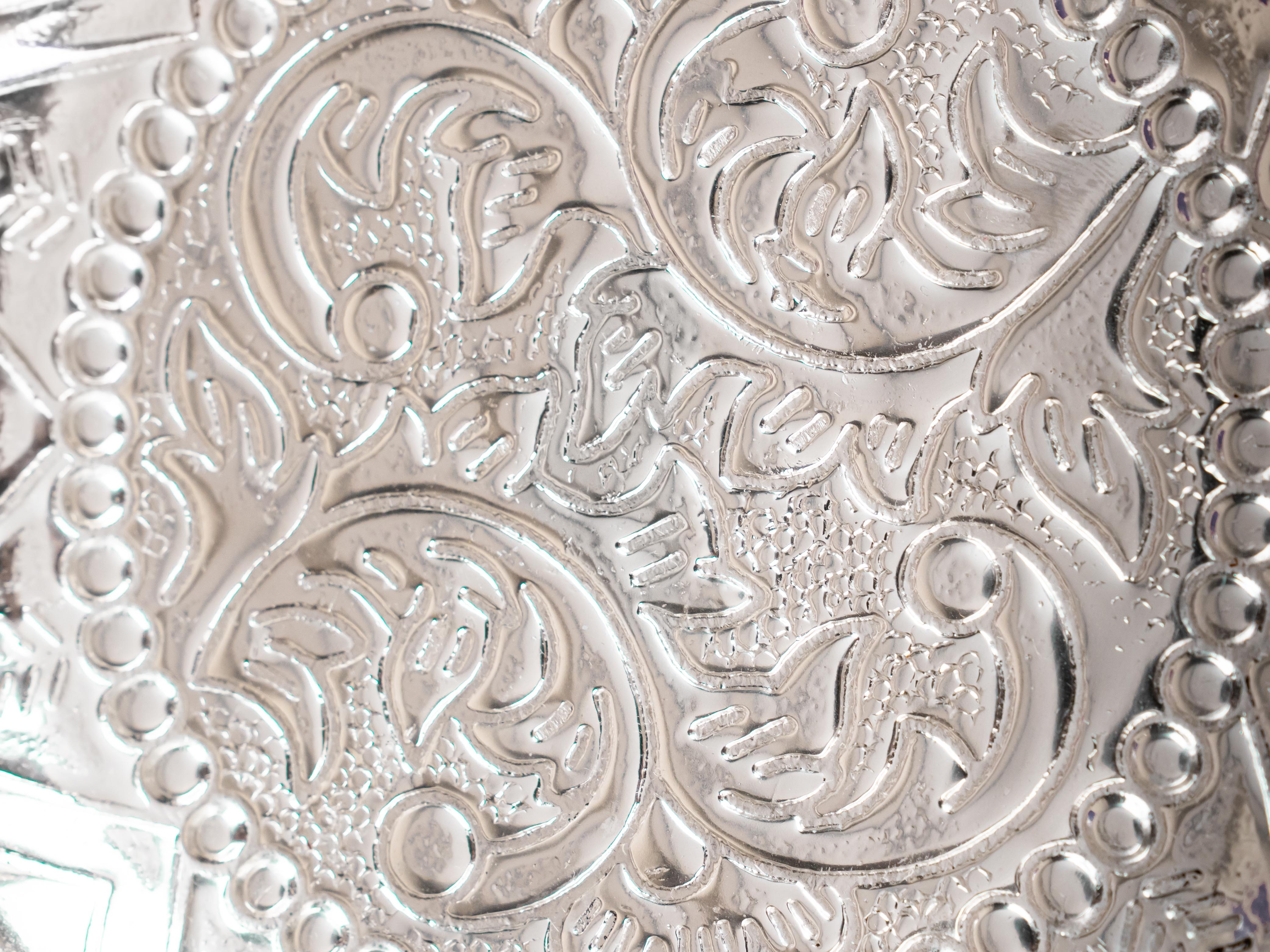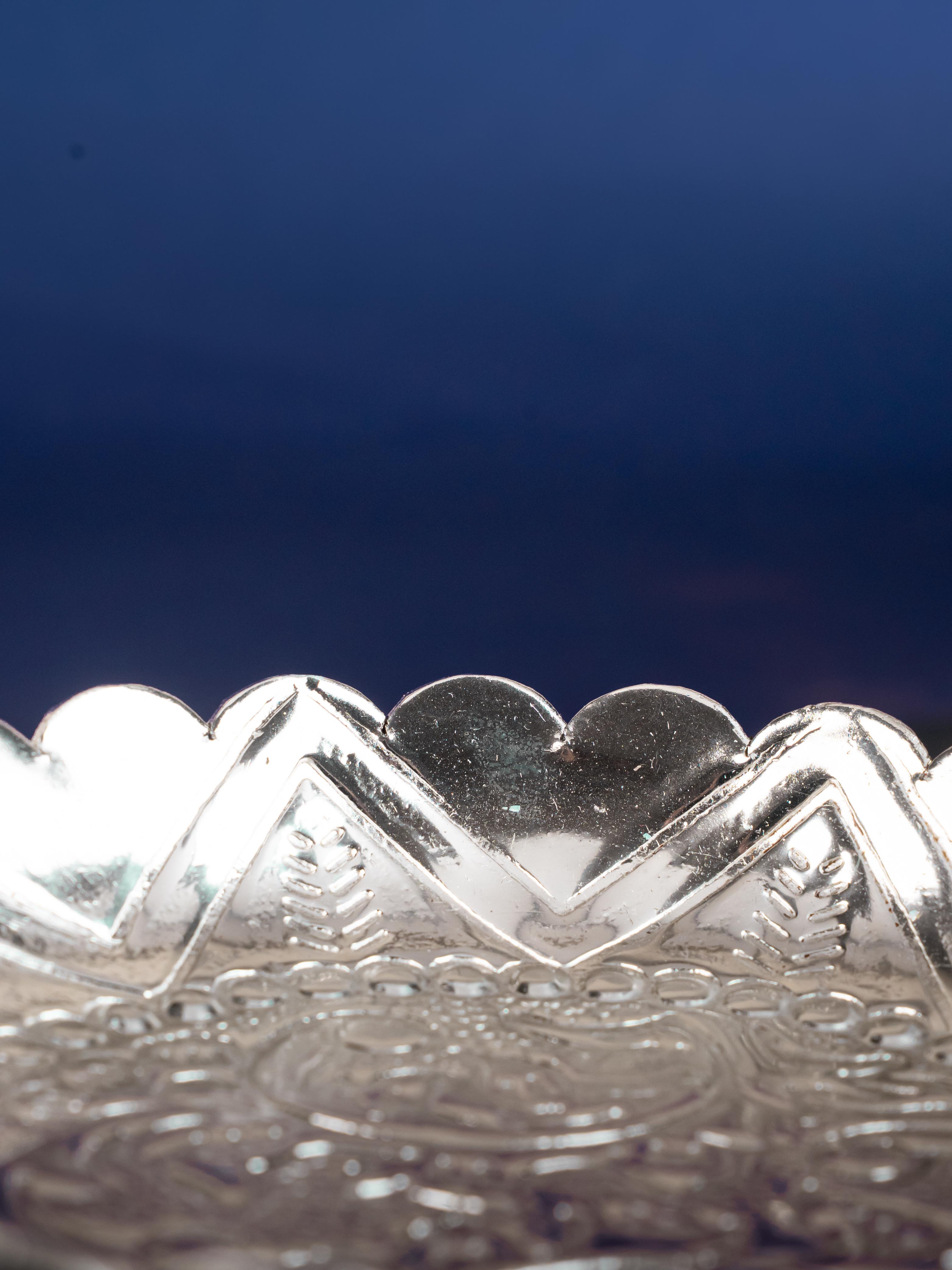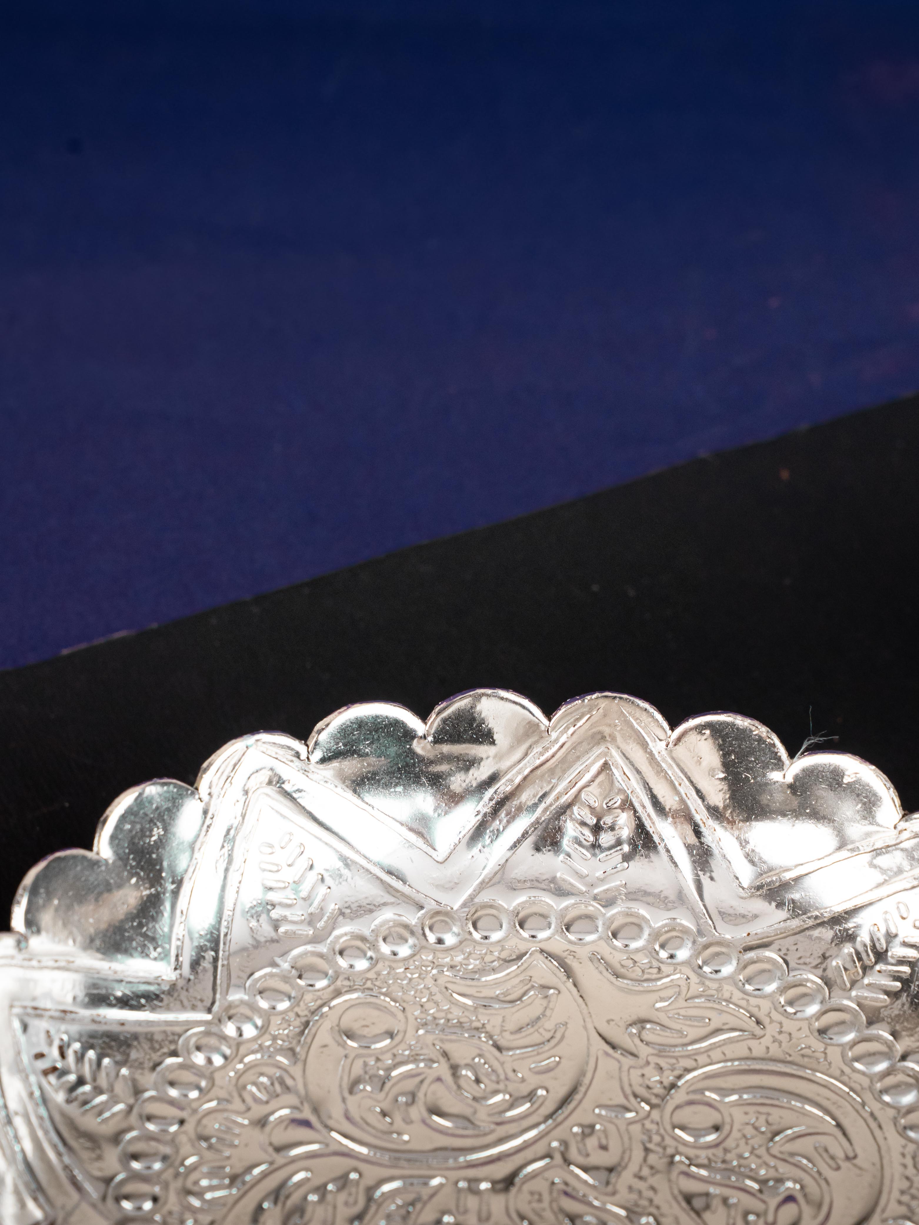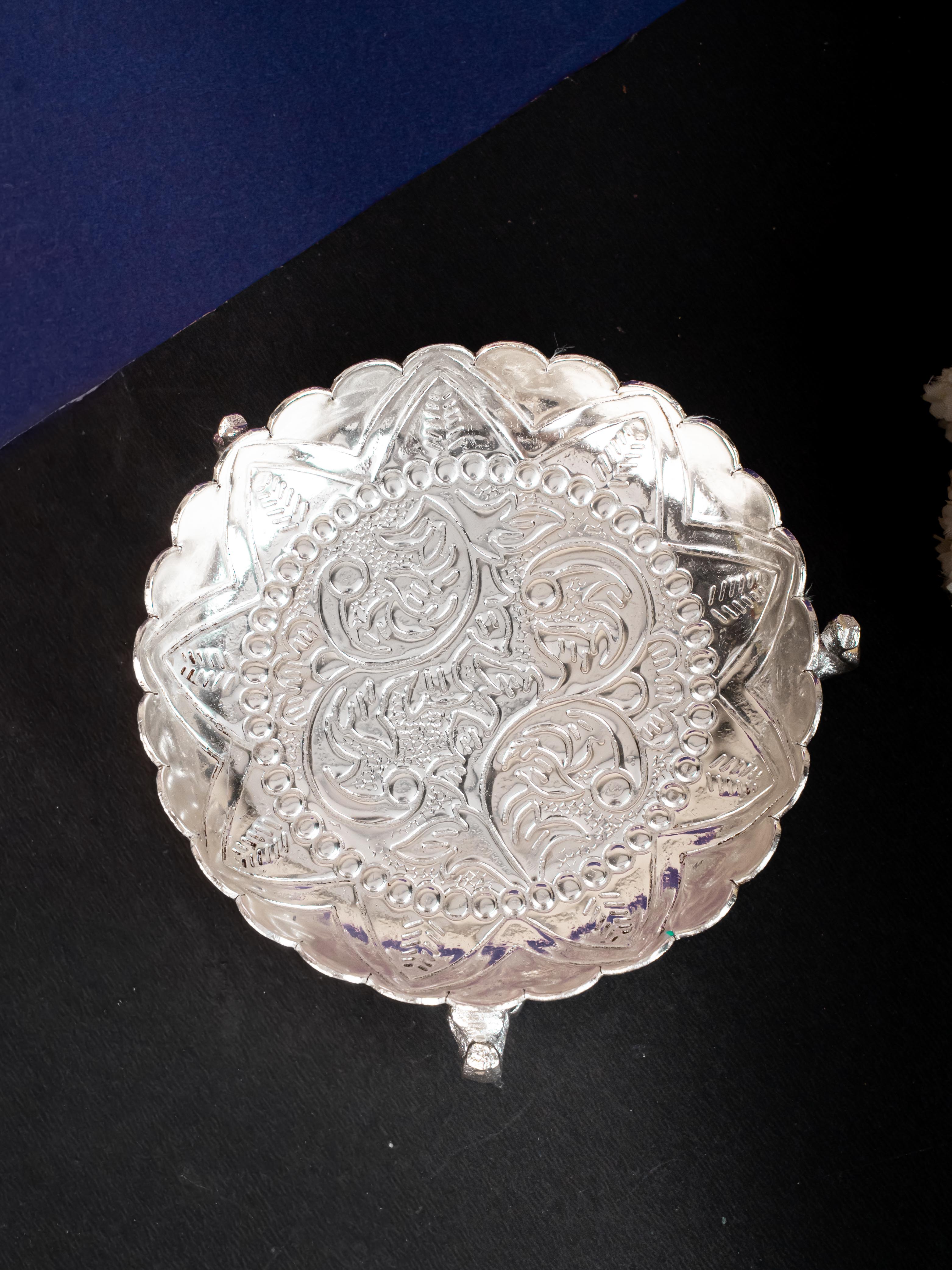 - This 6 inch Silver Coating pooja tray is a marvel to behold! Beautifully carved with intricate floral patterns, it will bring an eye-catching touch of sophistication to your pooja.