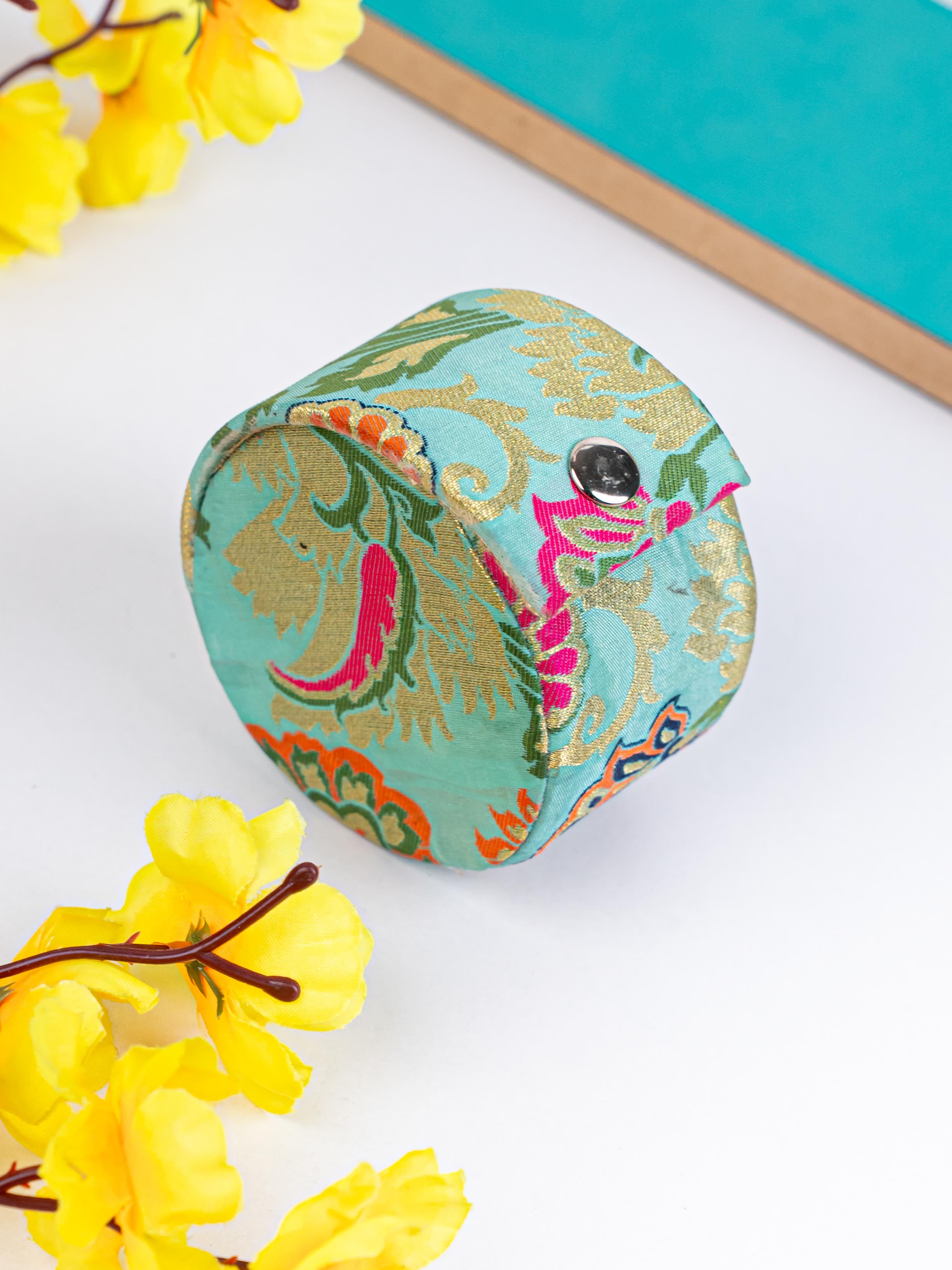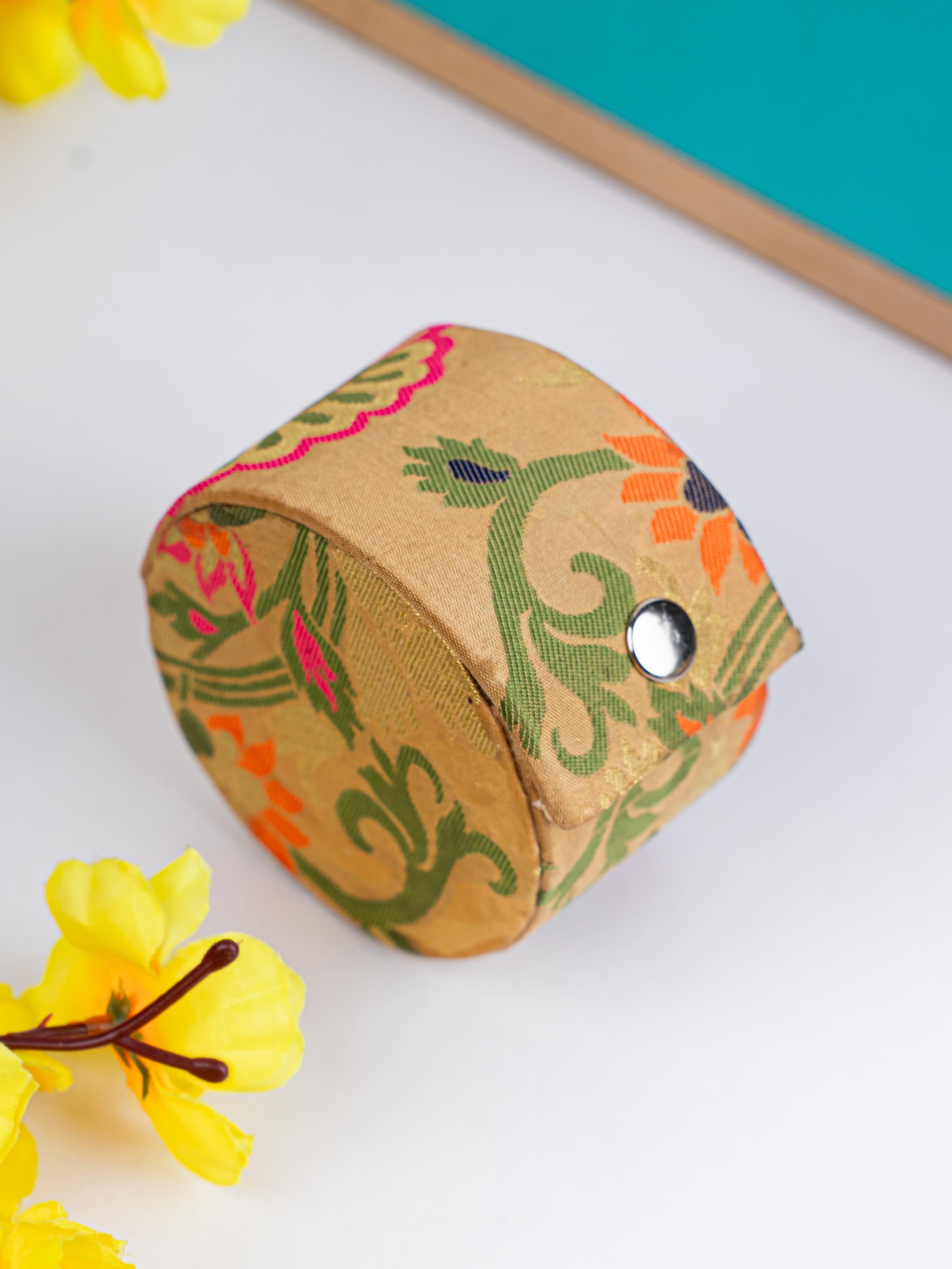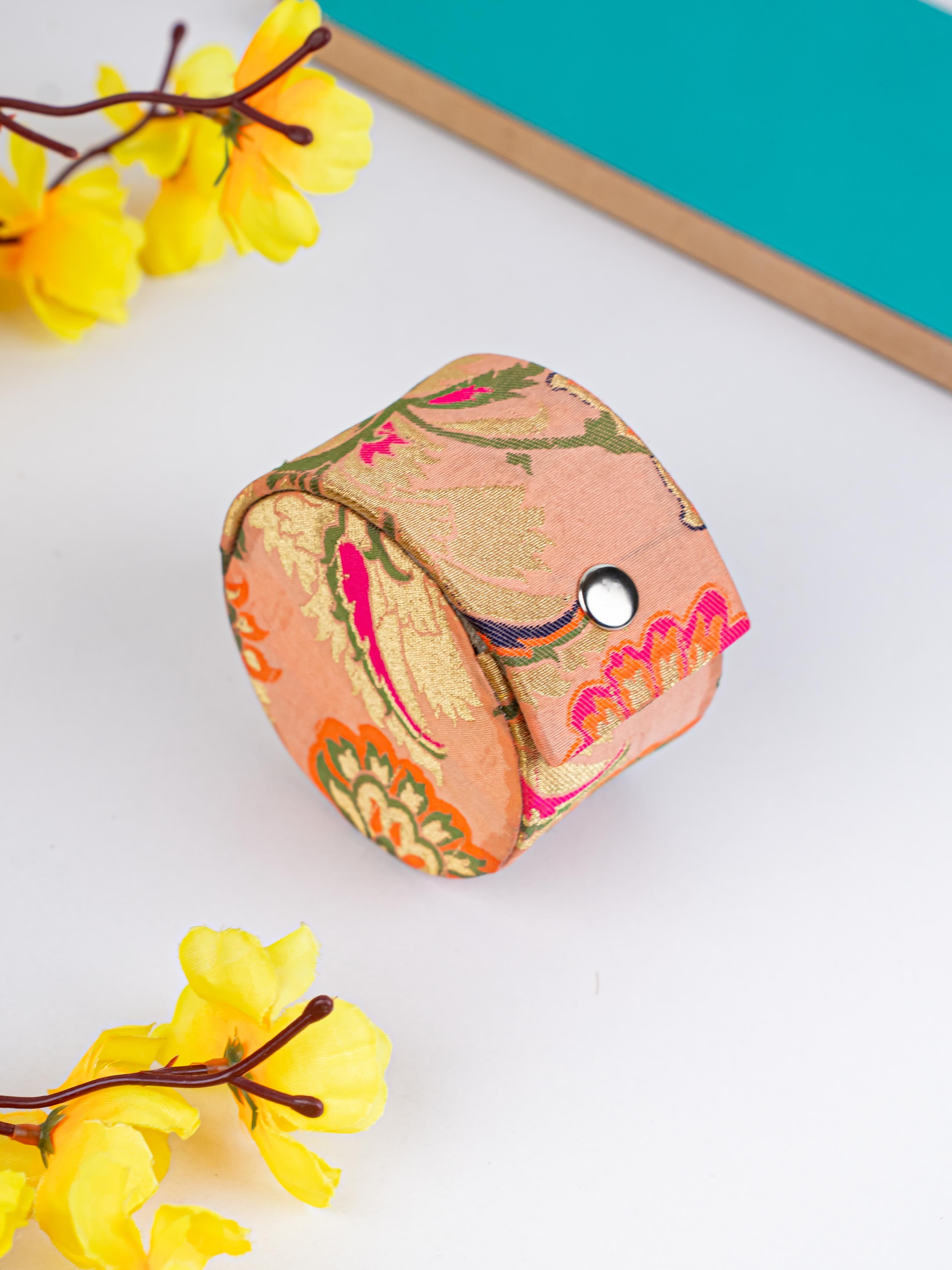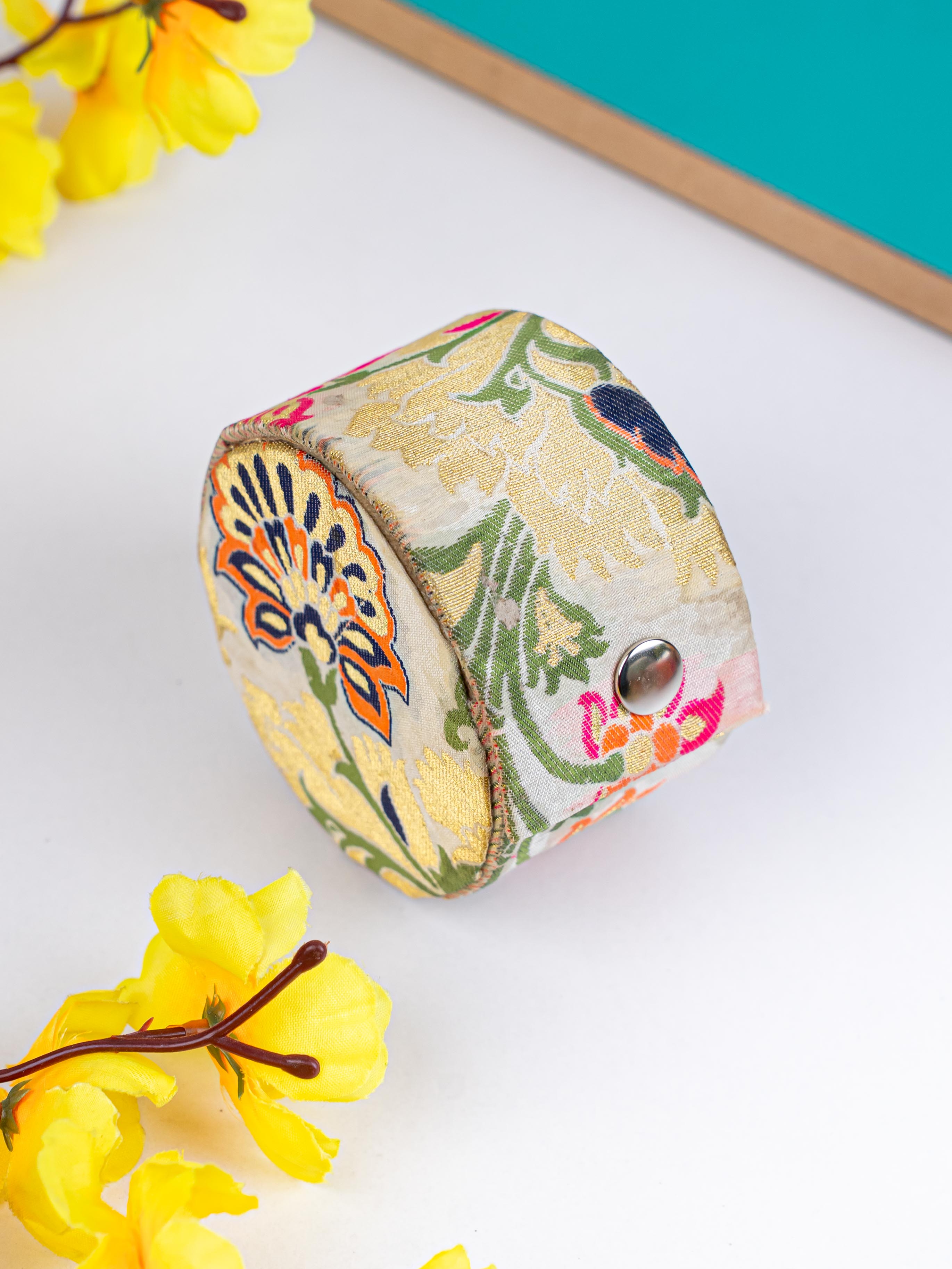 - The bangle holder's fabric is adorned with floral weaves adding touch of elegance.