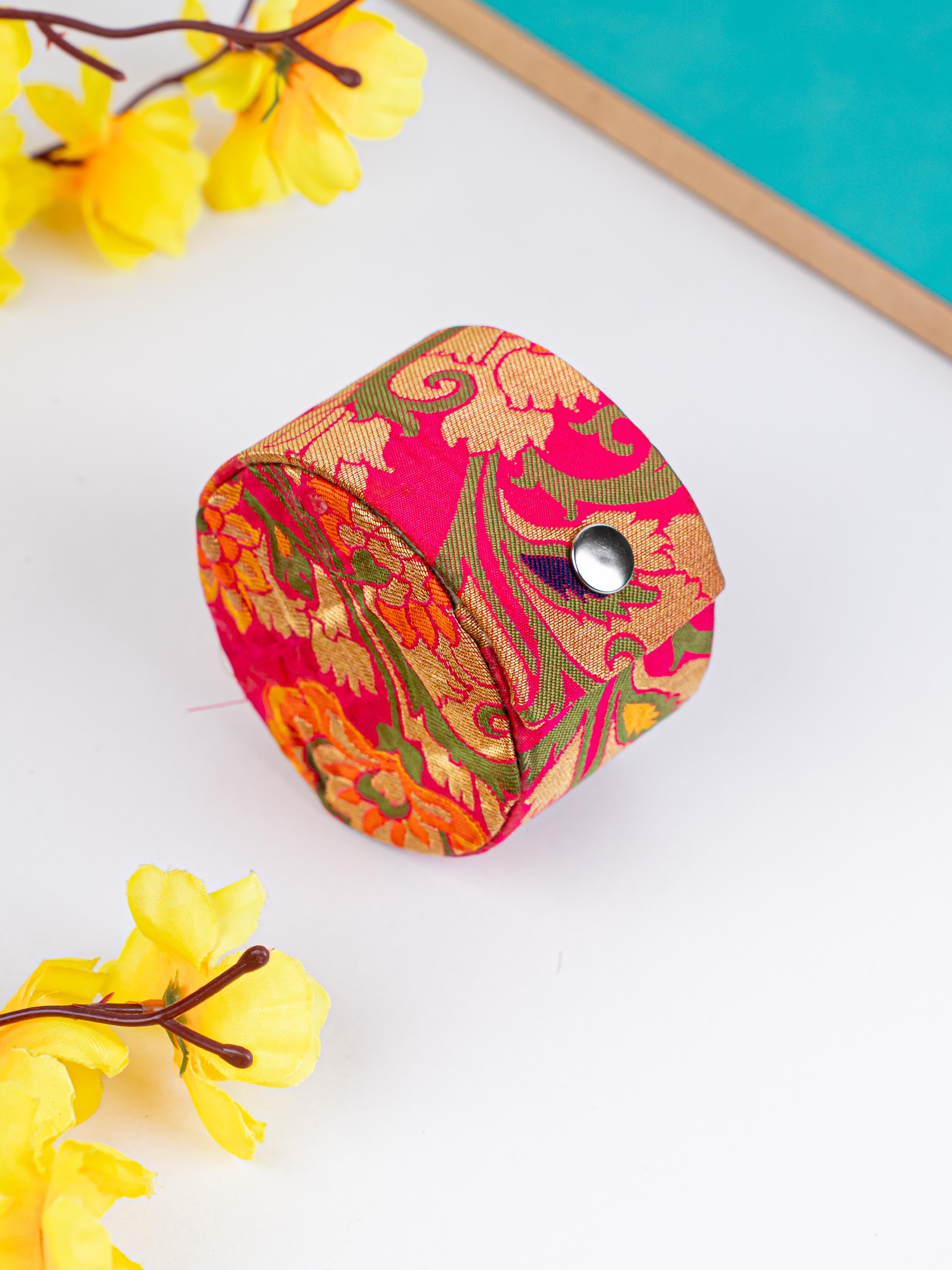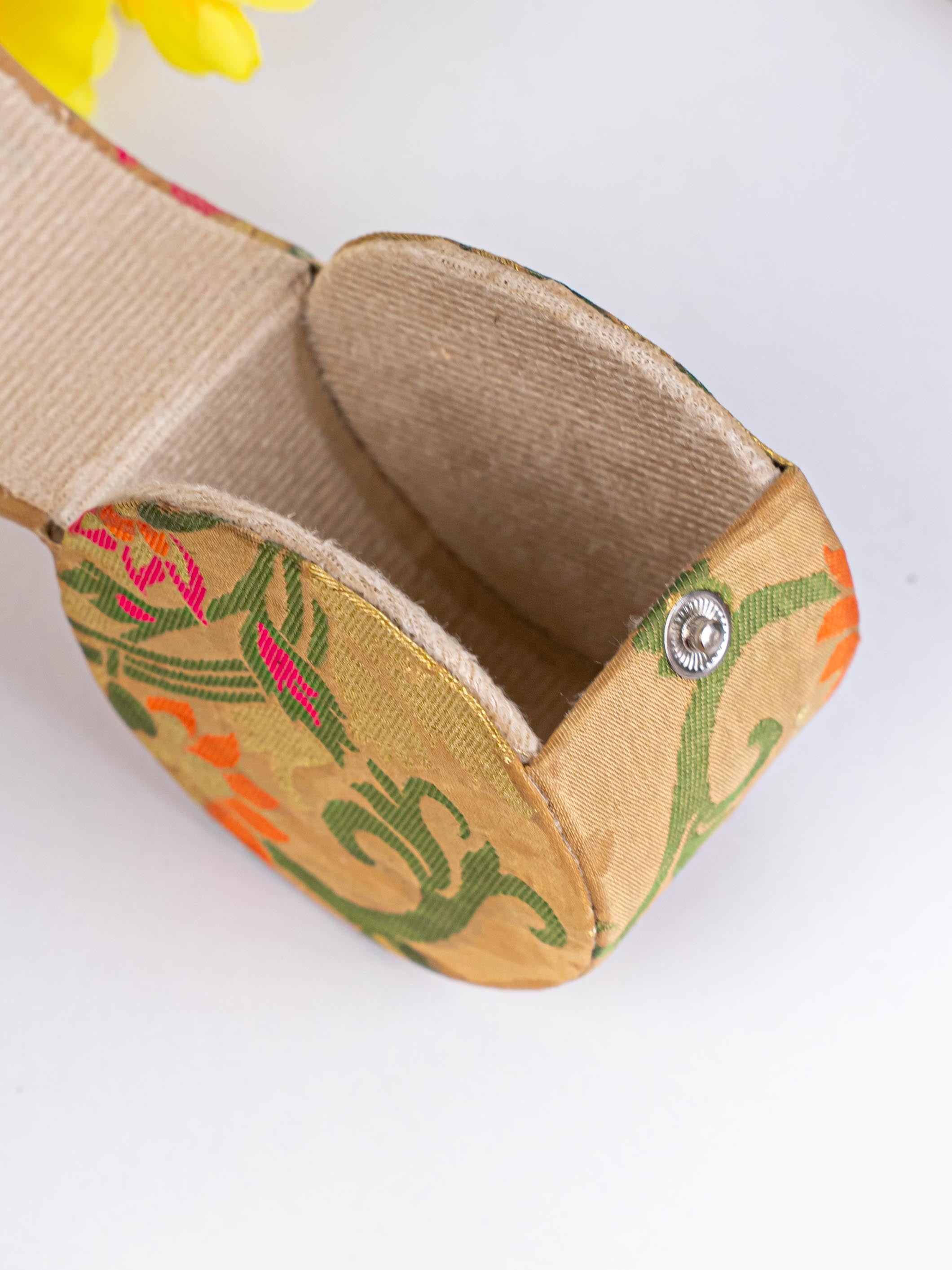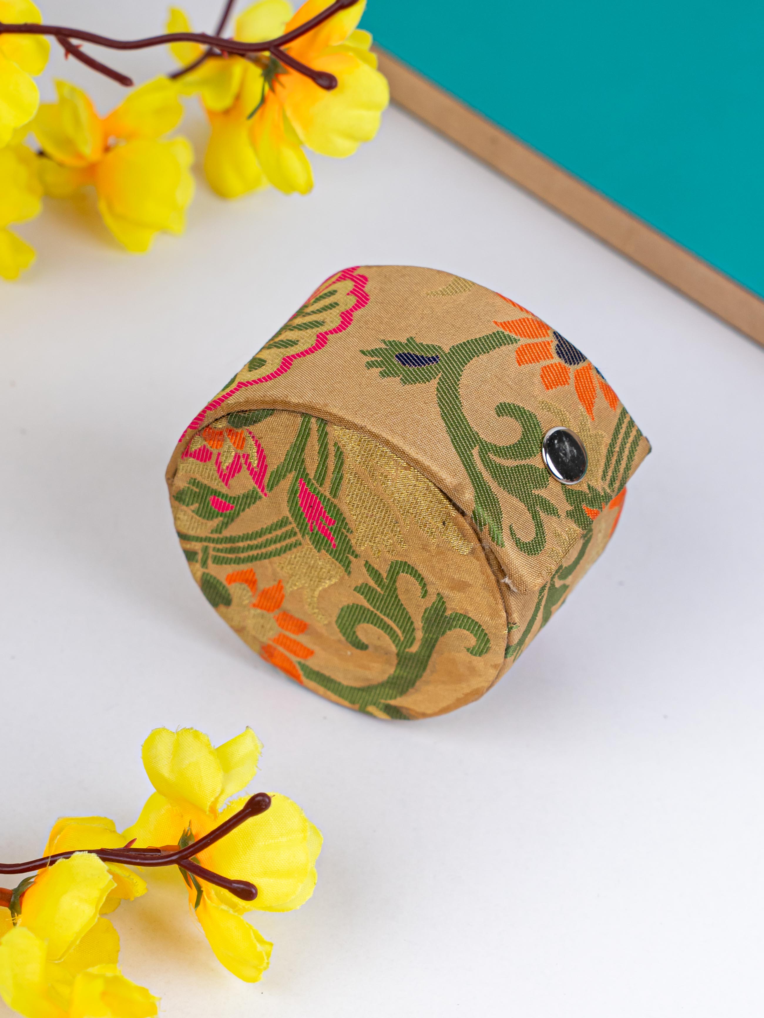 - The bangle holder's fabric is adorned with floral weaves adding touch of elegance.