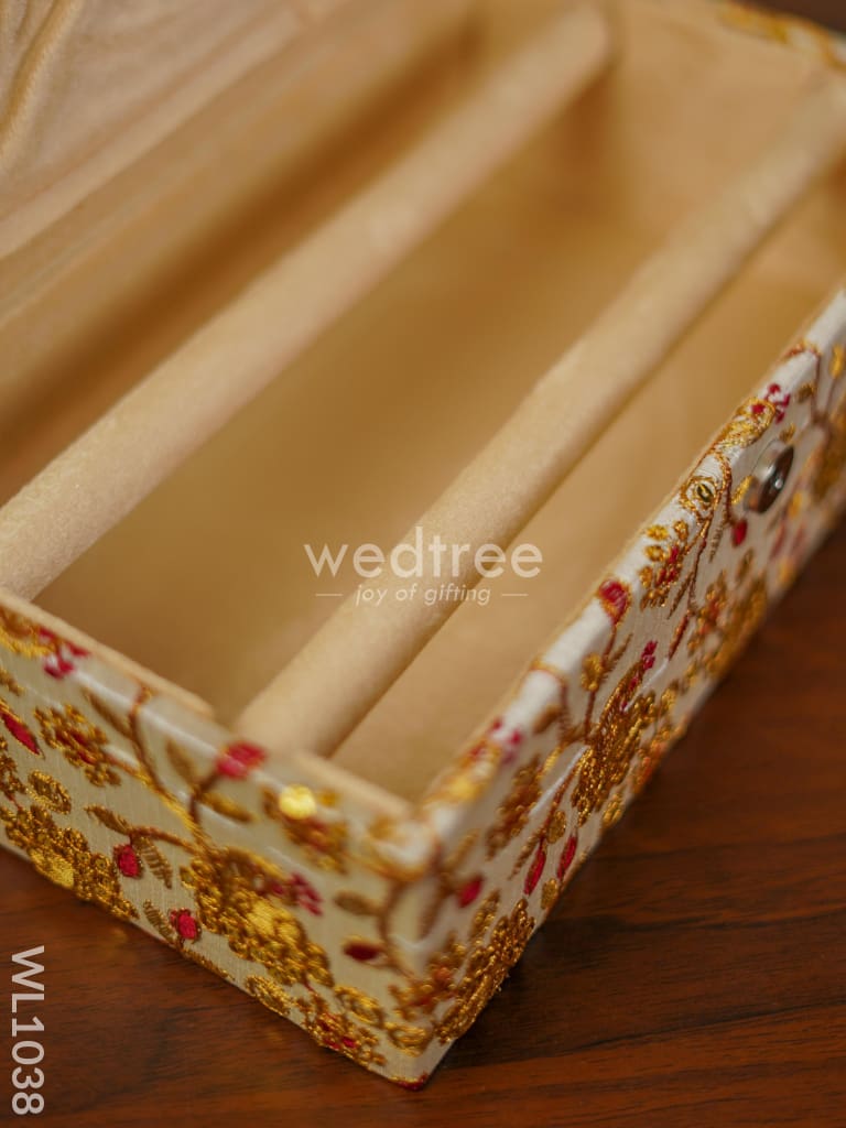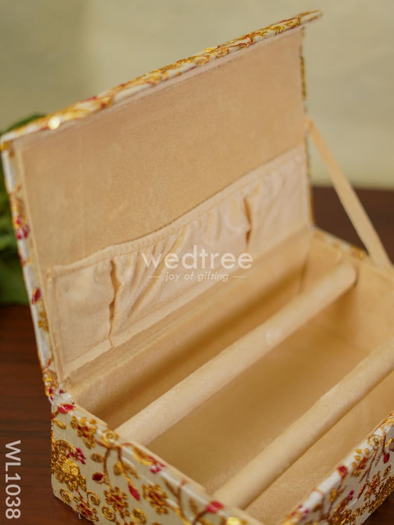 - This rectangular jewel box has 2 bangle rod holders and a slip pouch on the top.