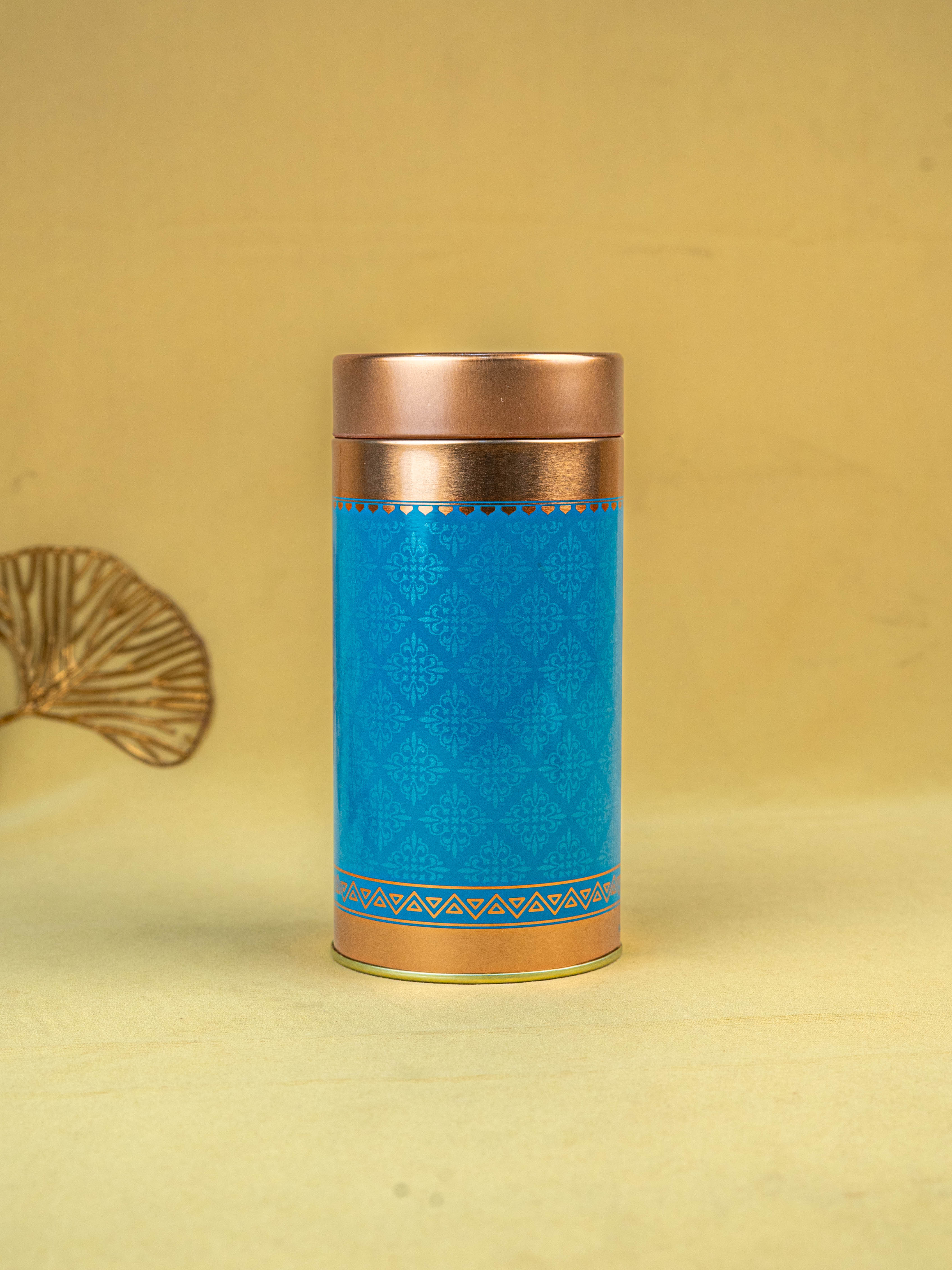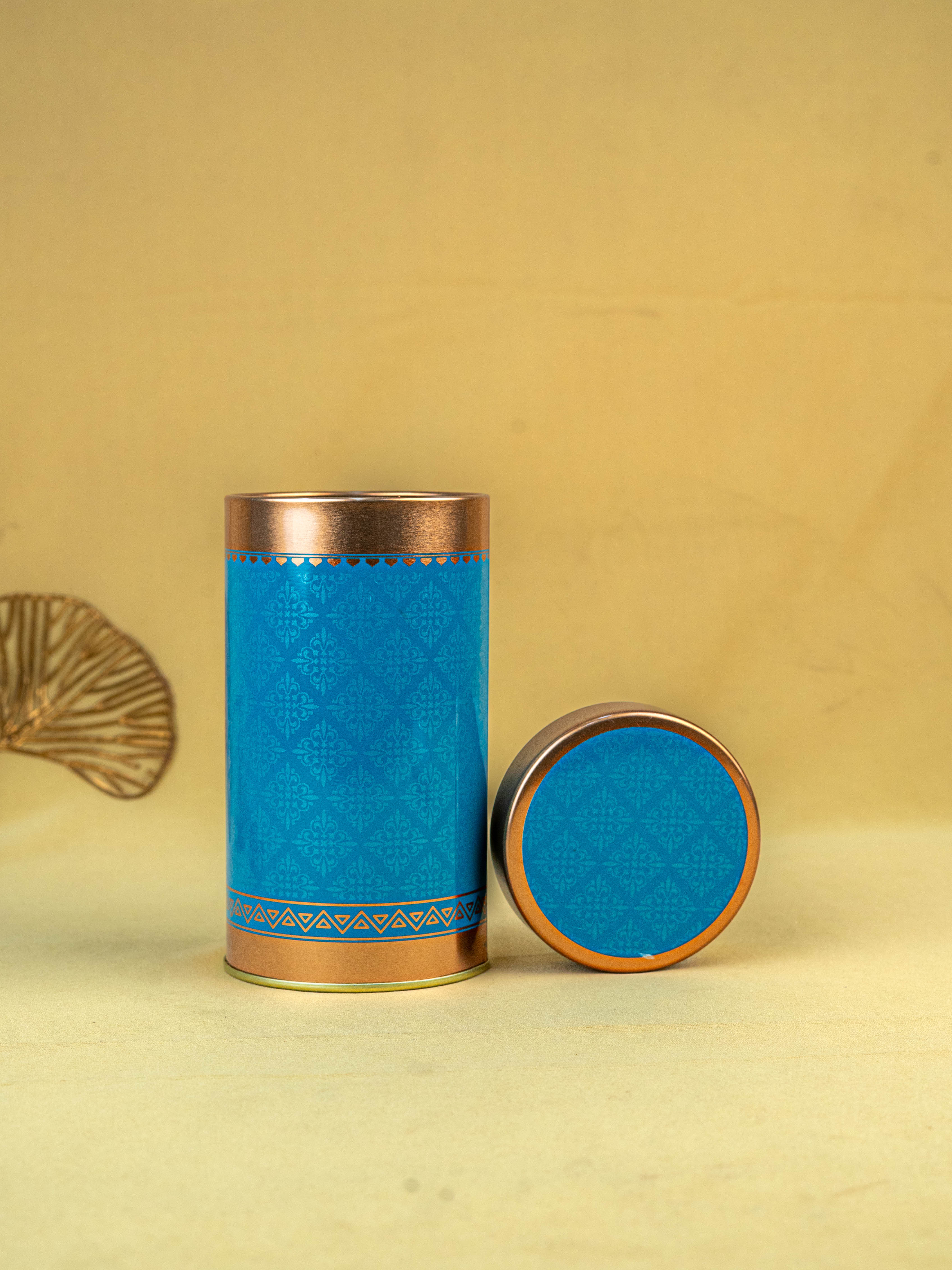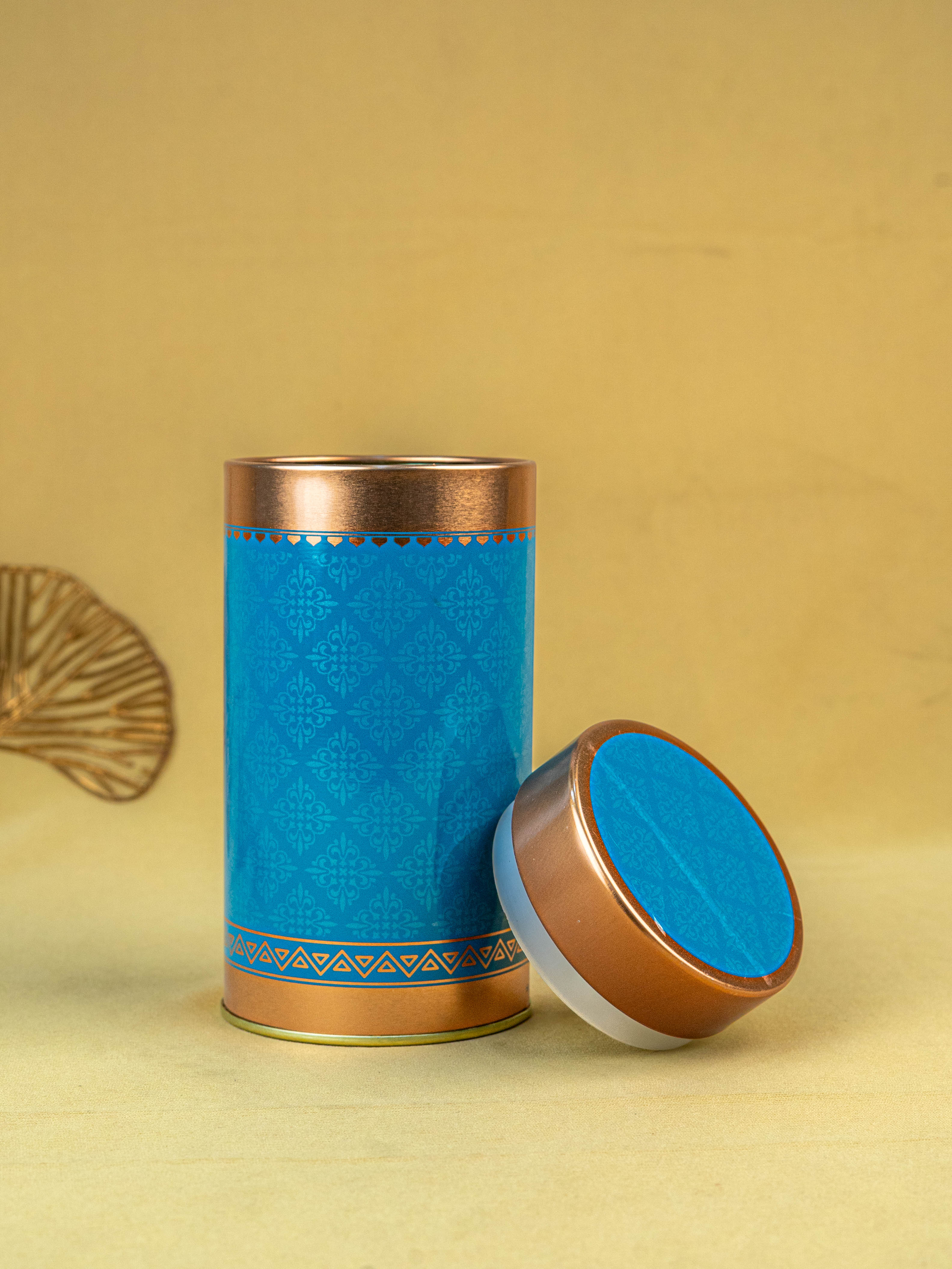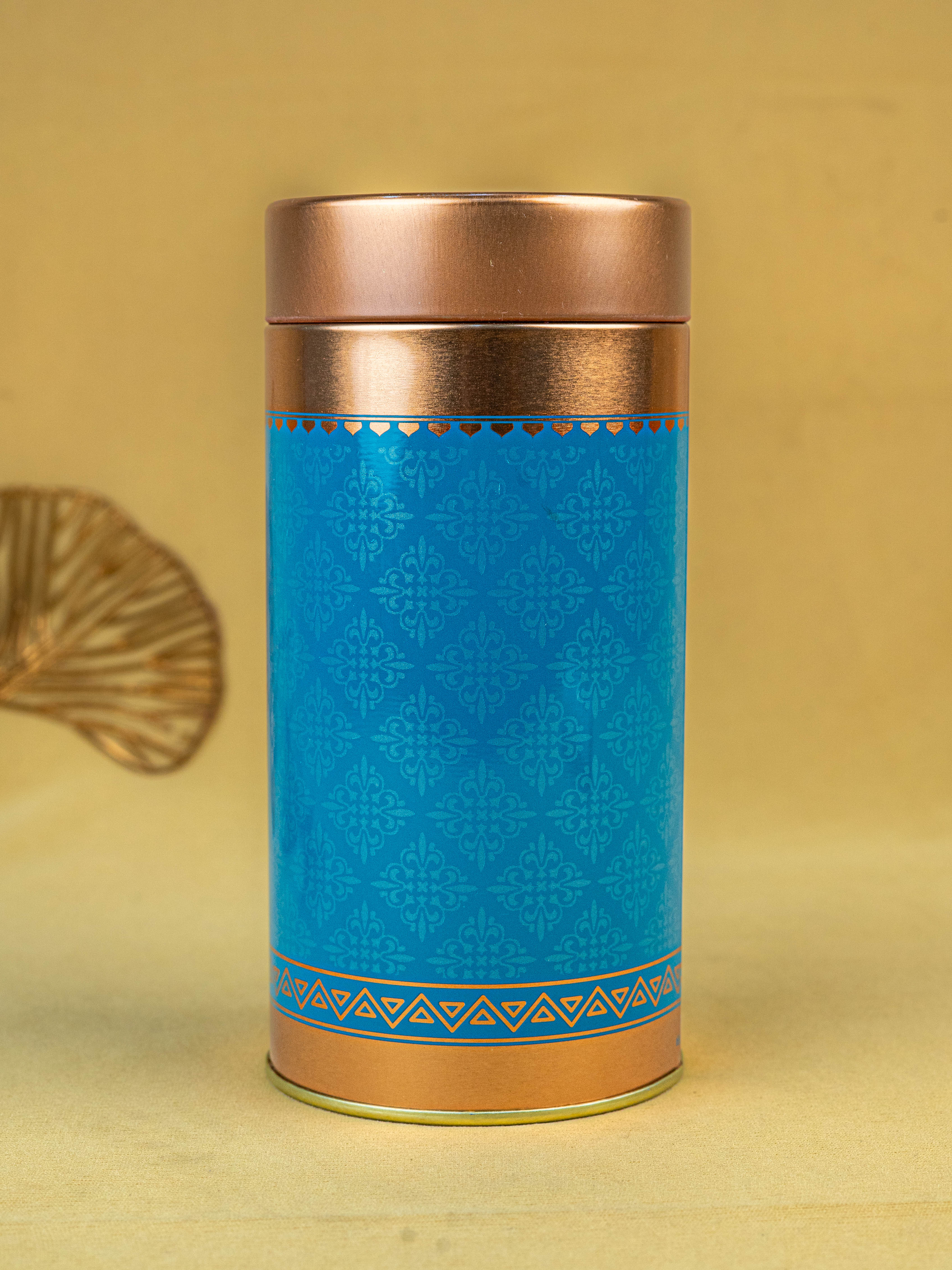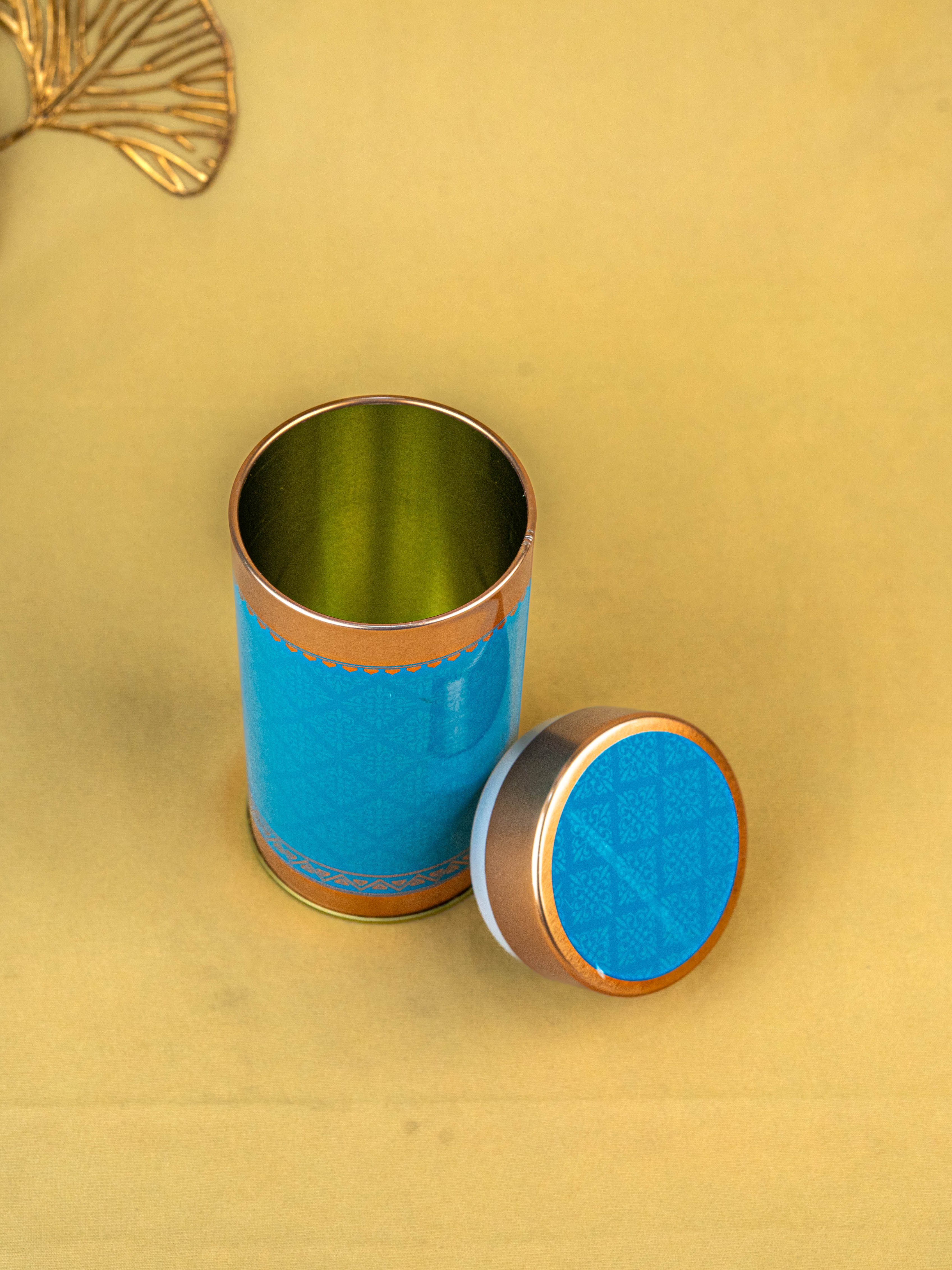 - The Body of the Tin Jar is Finished in a Teal Blue Color with Intricate Golden Design Arranged in a Patterned Style, giving it a Traditional and Luxurious Look.