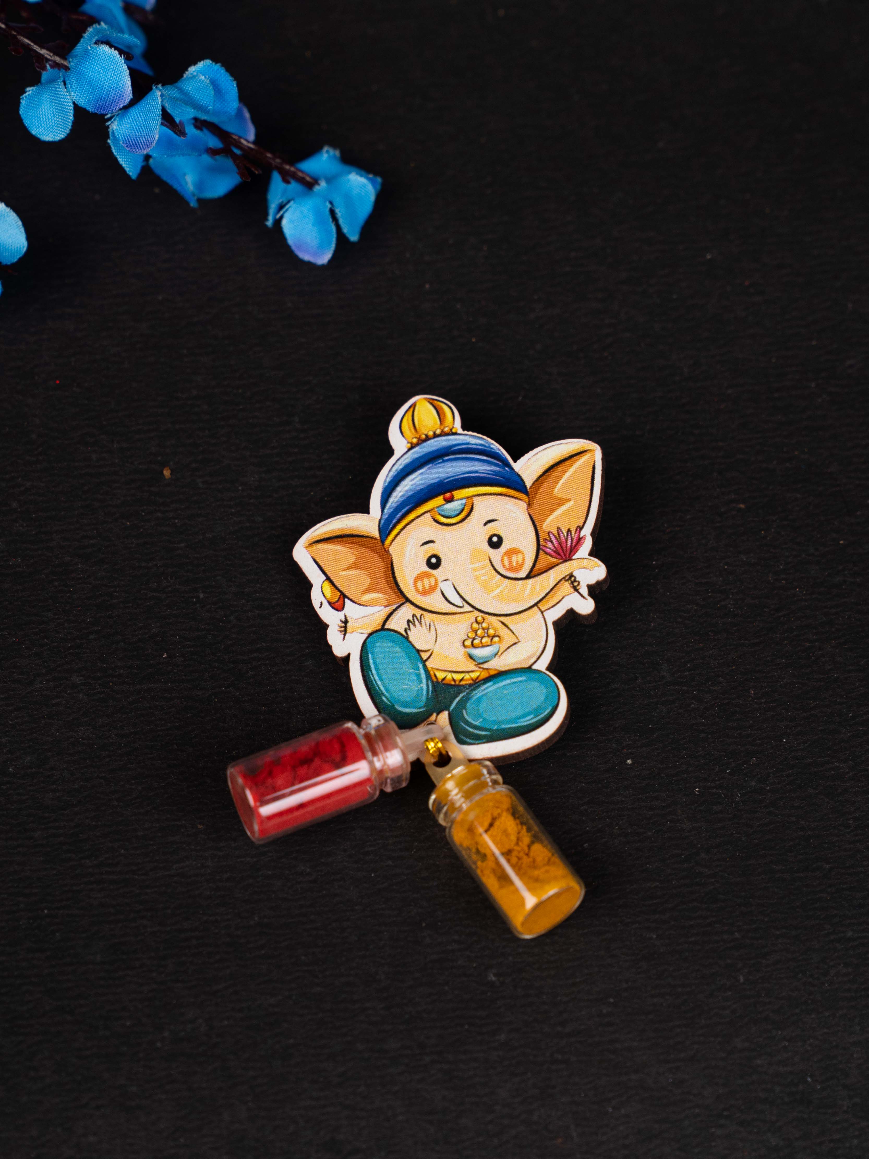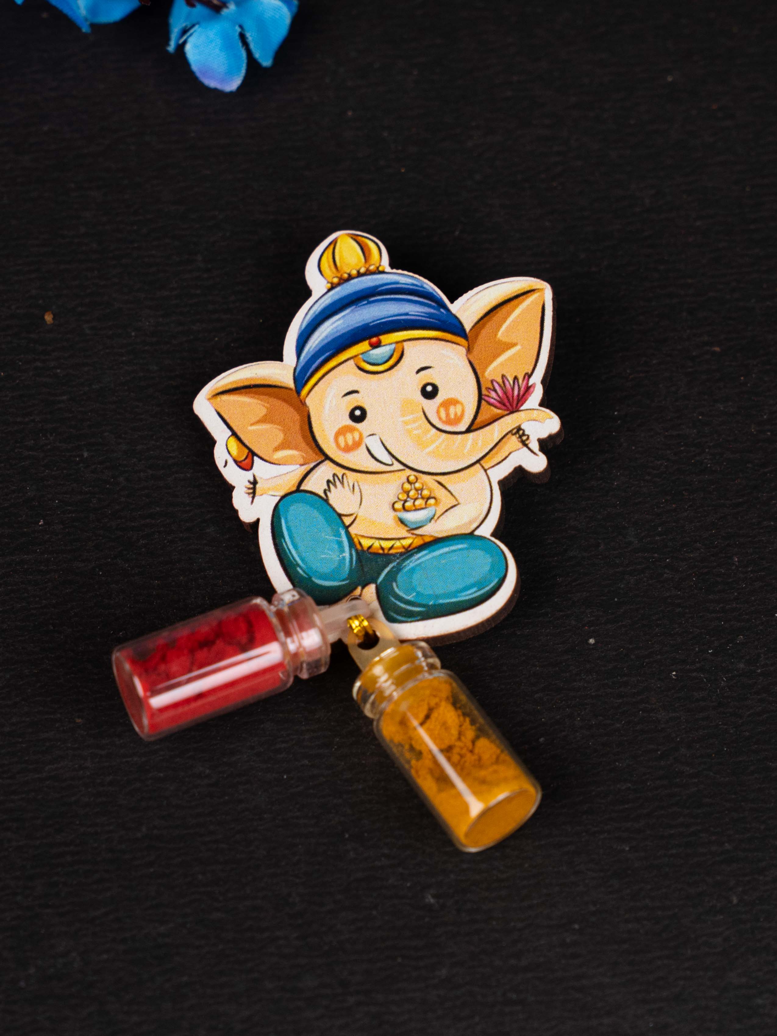 - Cute and Colorful Fridge Magnet with Haldi Kumkum featuring a Baby Ganesha.