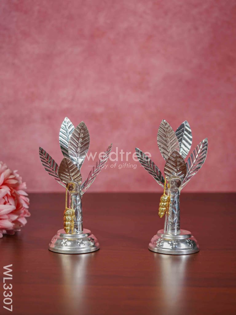 • Made of German Silver, this set of banana tree with flowers is a beautiful addition to your pooja mandir.