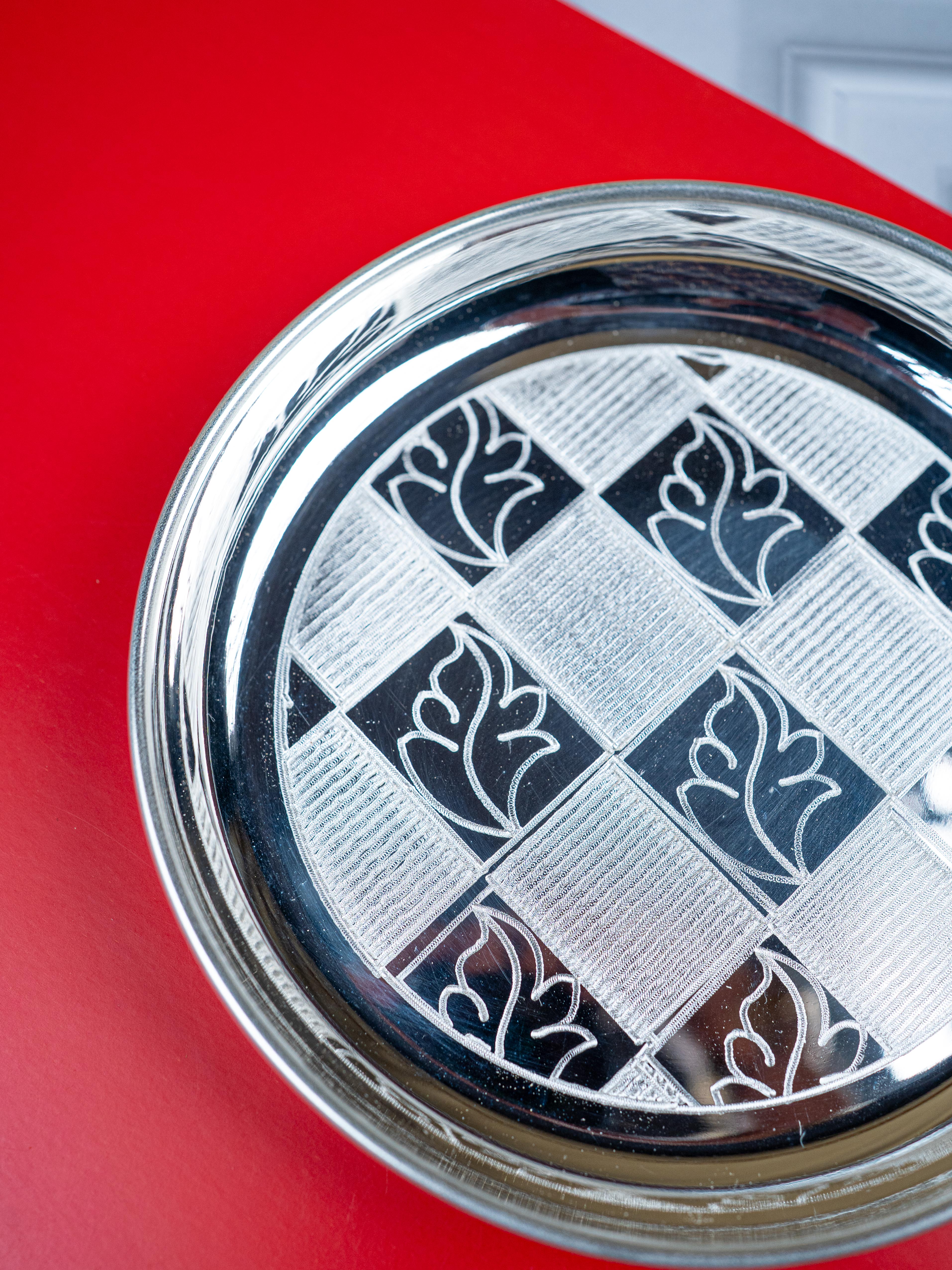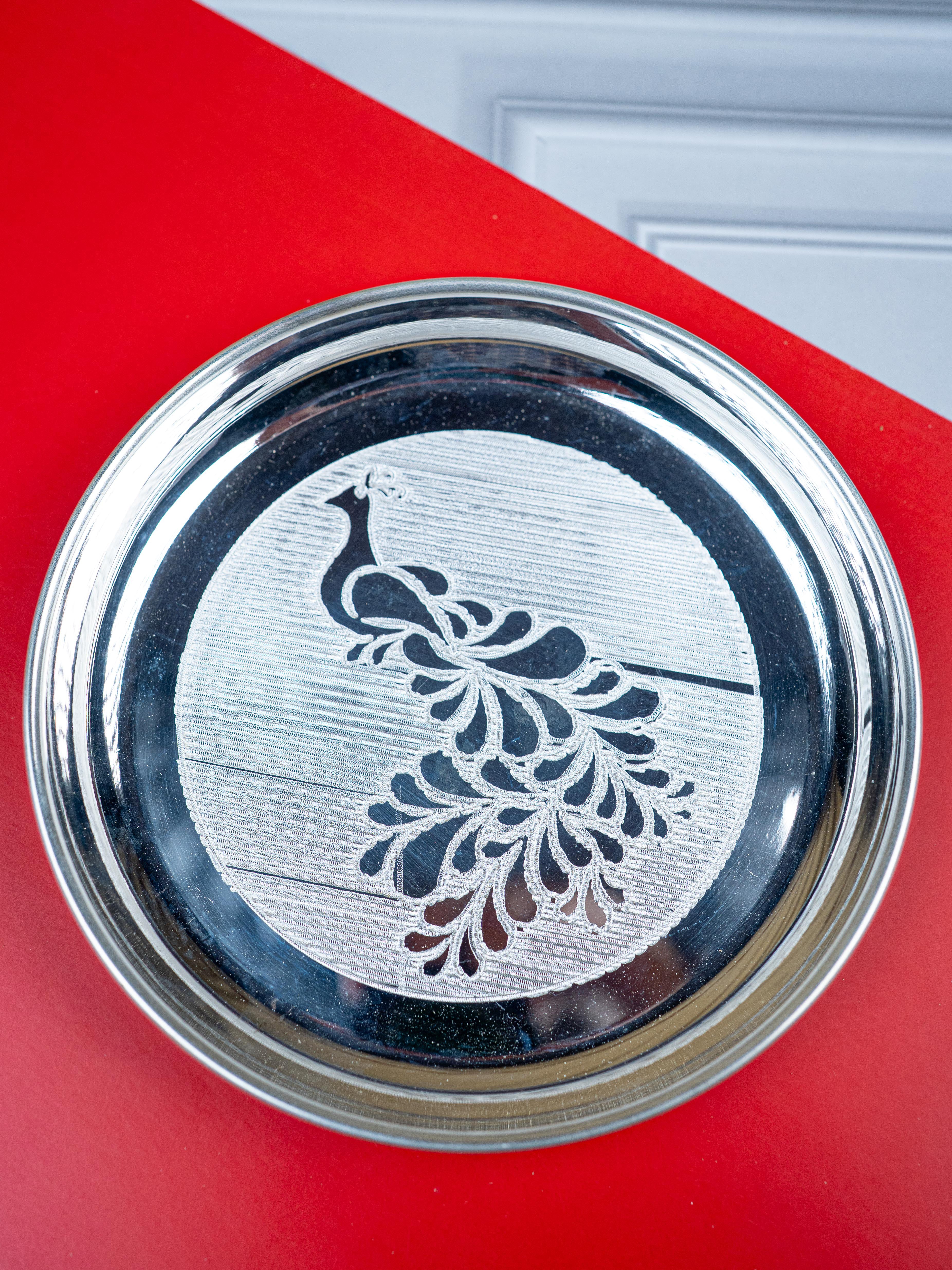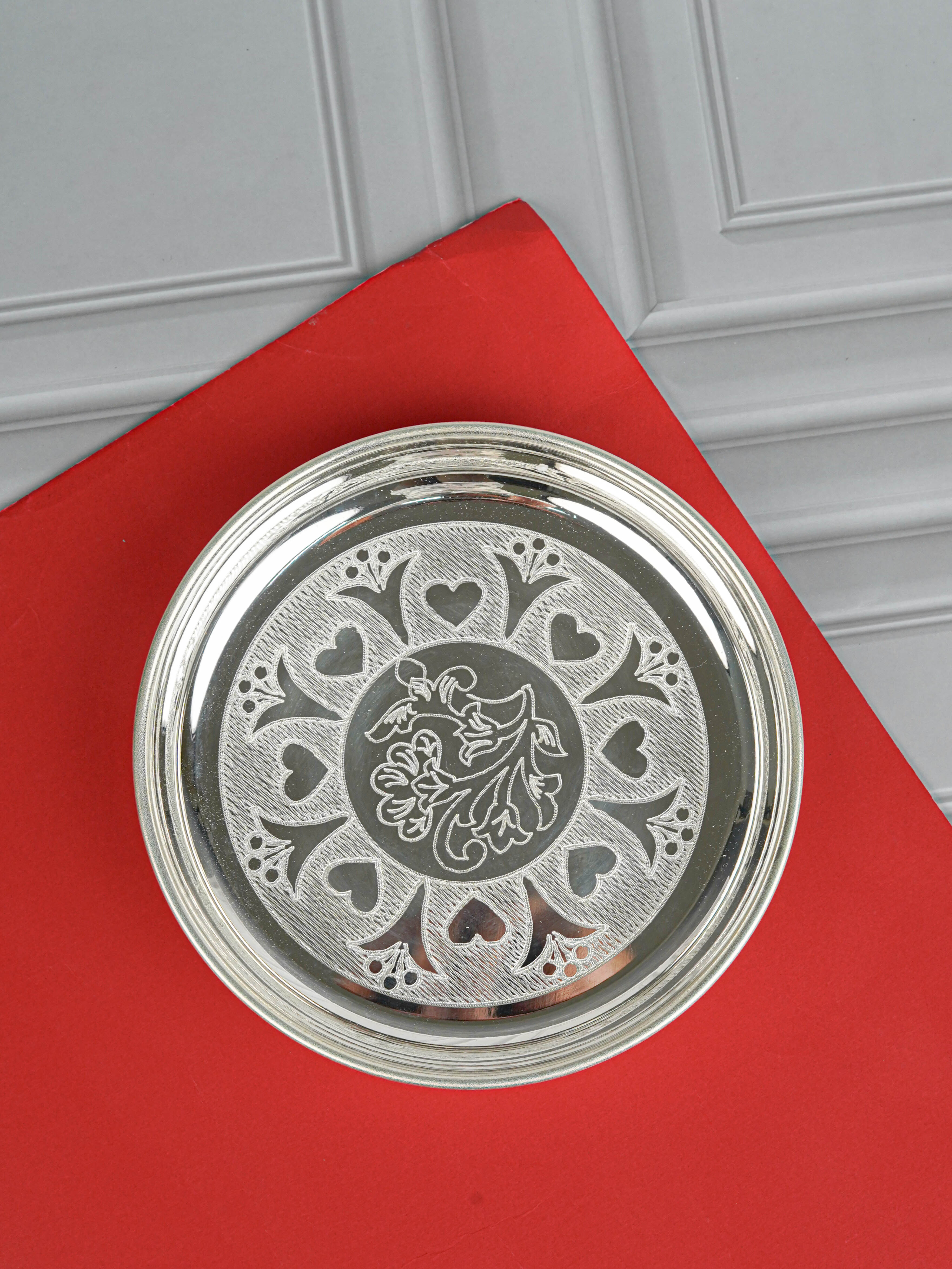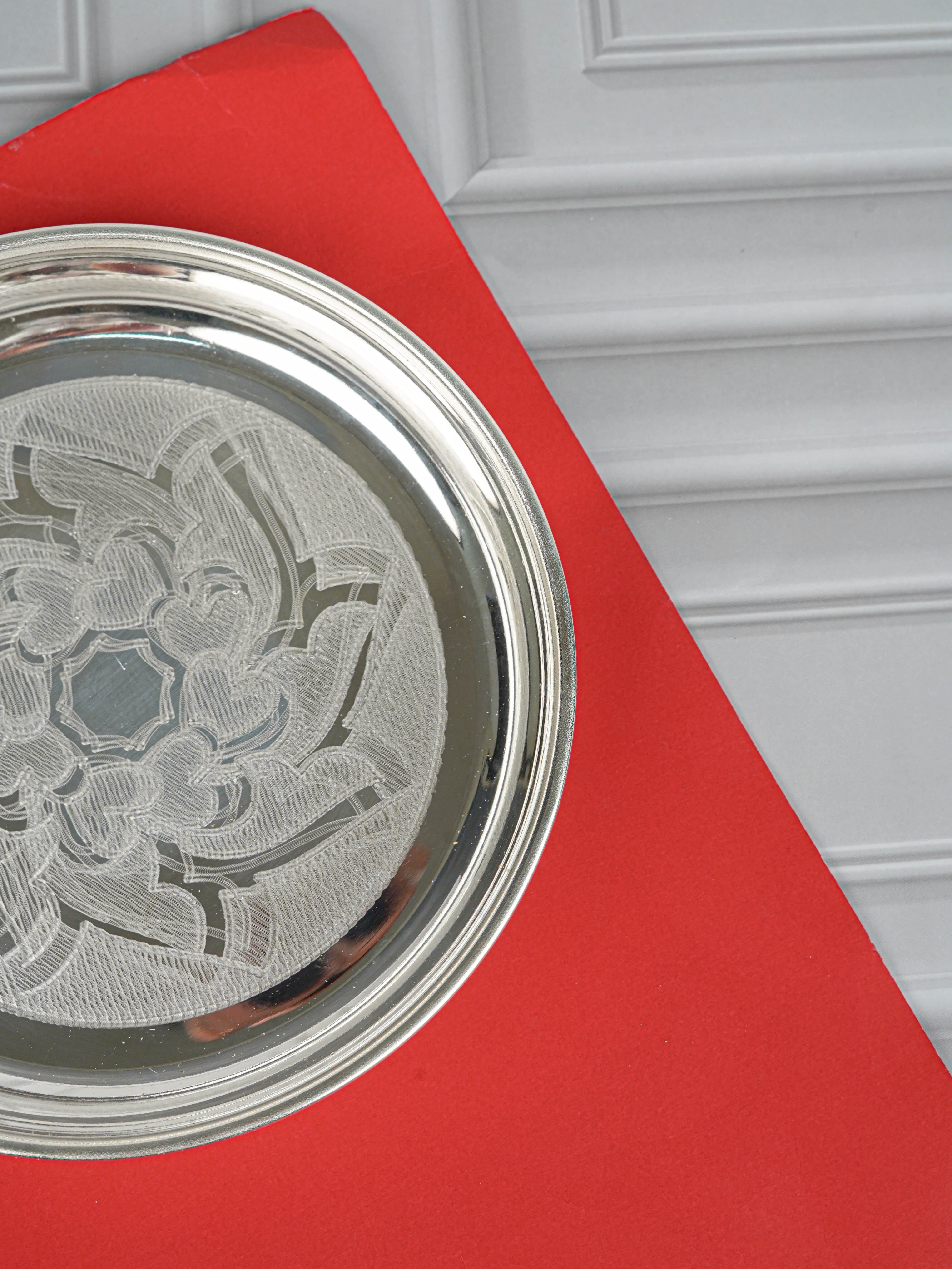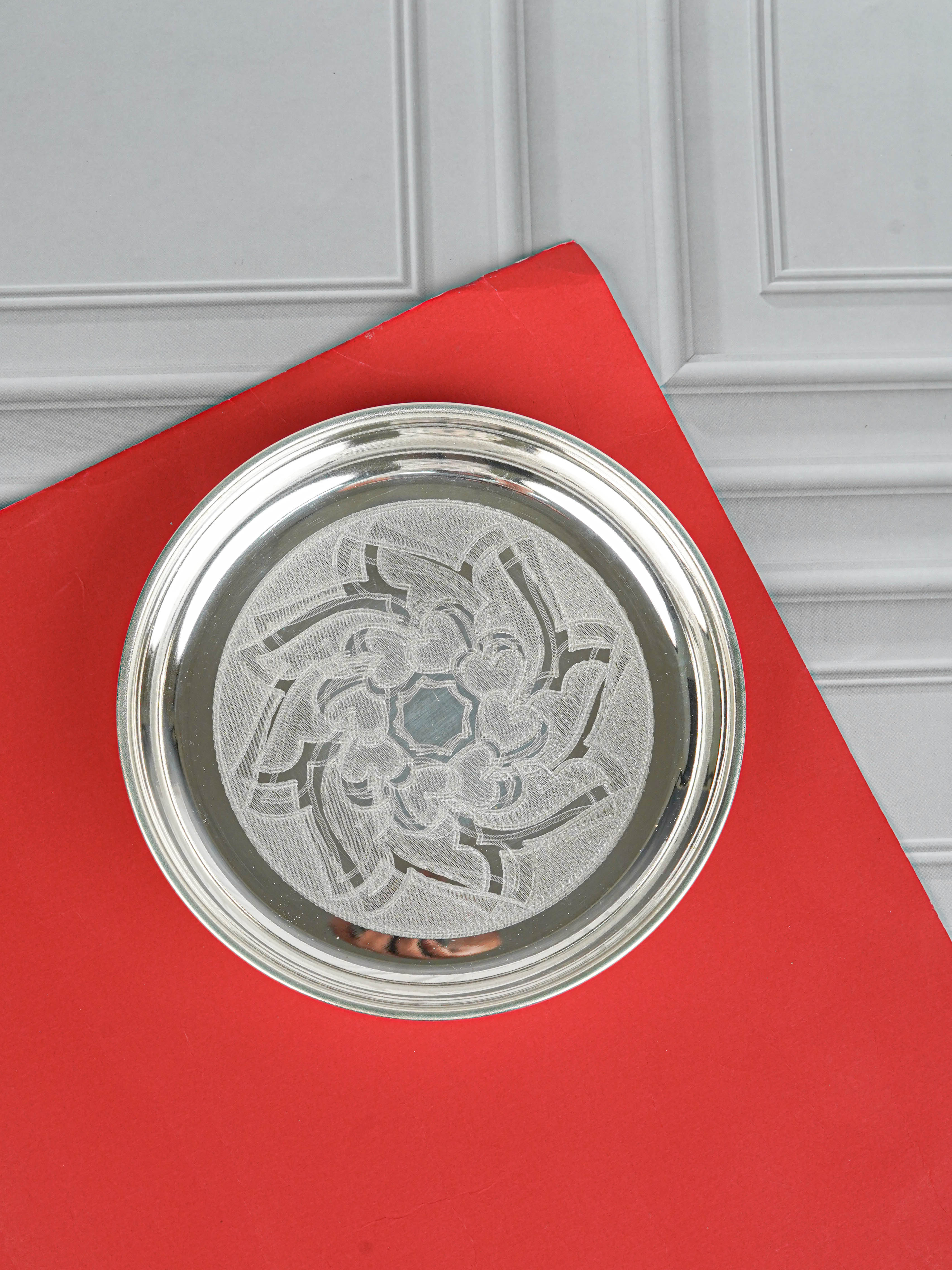 - Featured is a lovely plate crafted from premium German silver apt for your everyday Pooja!