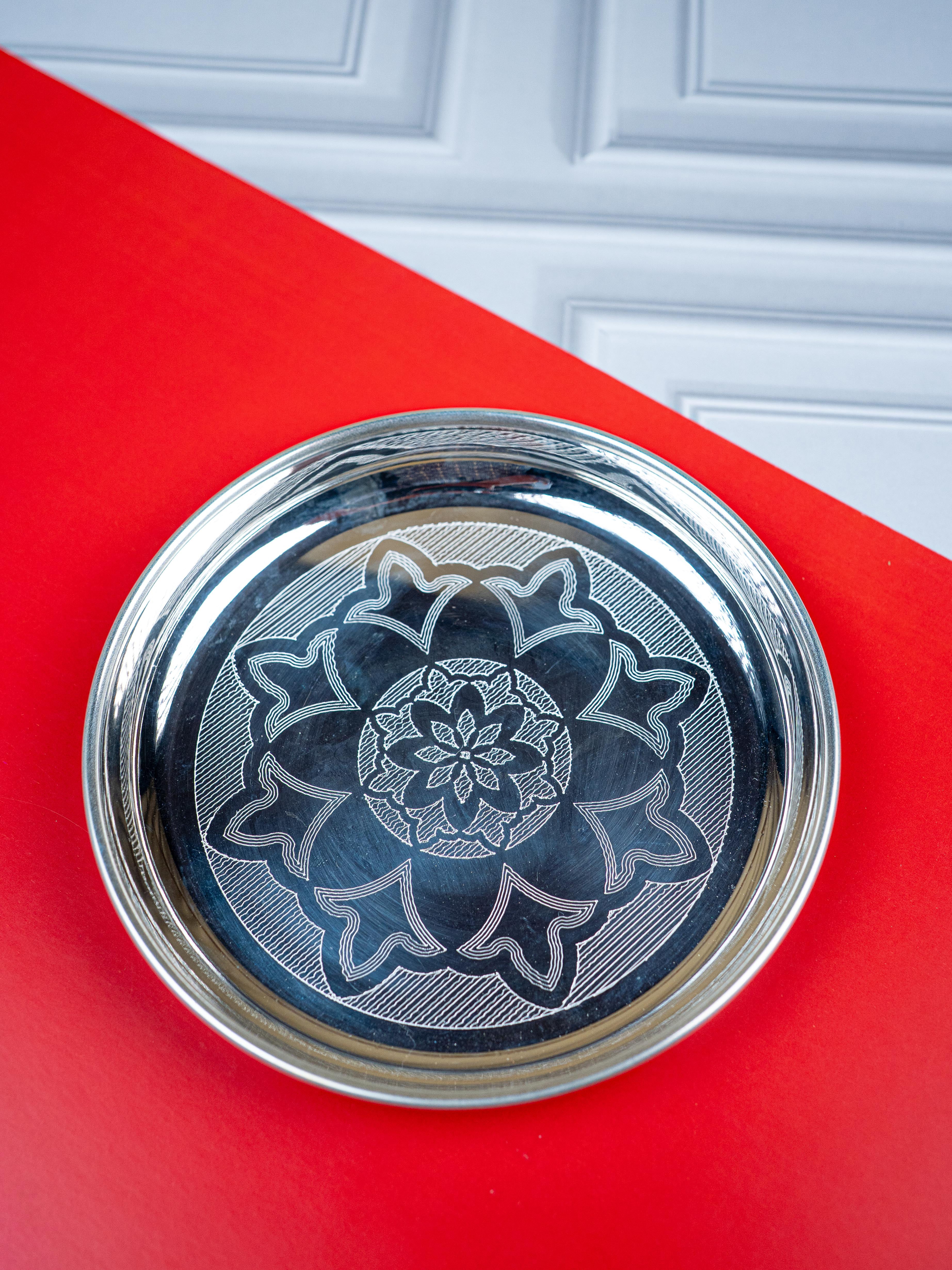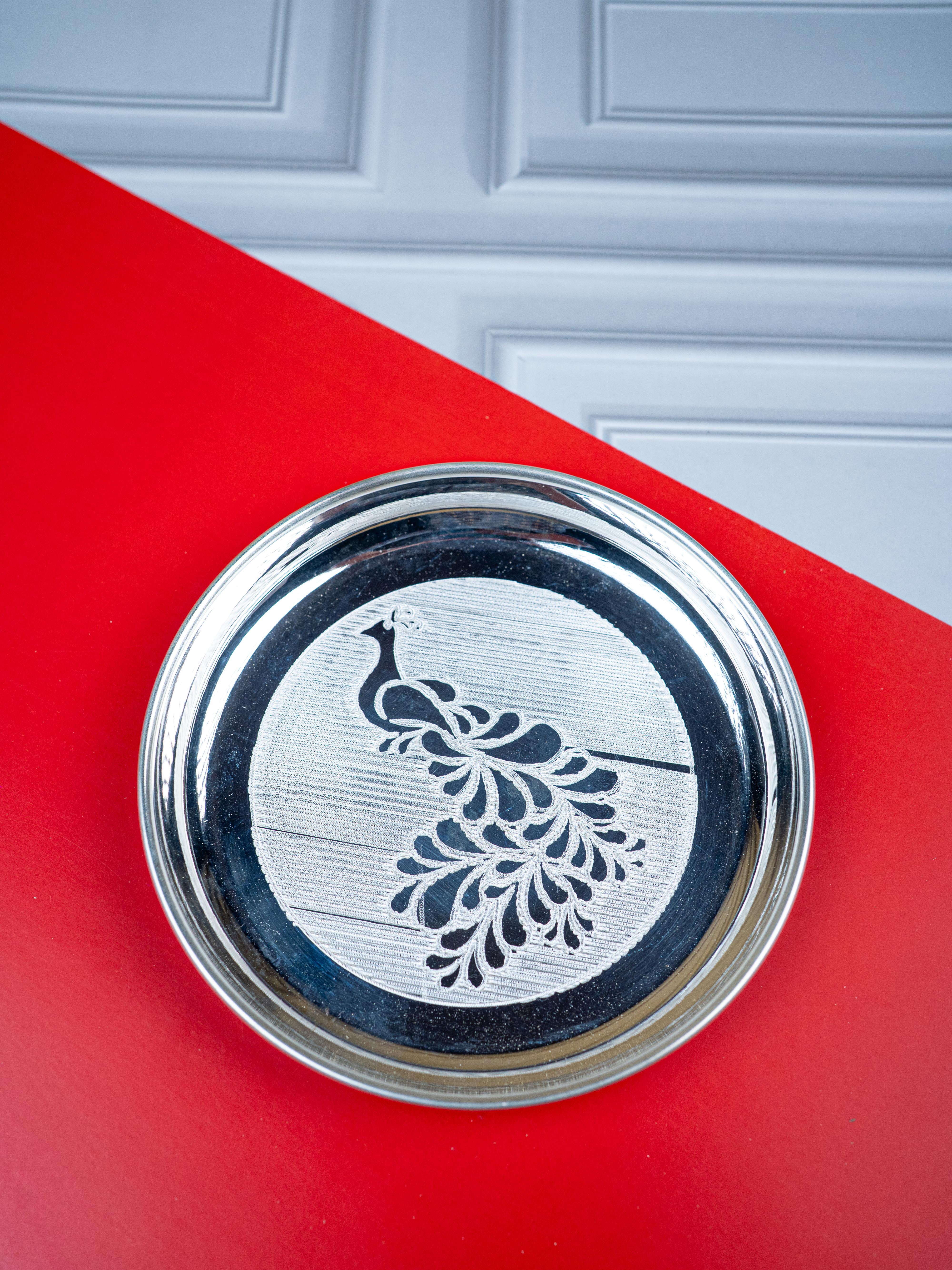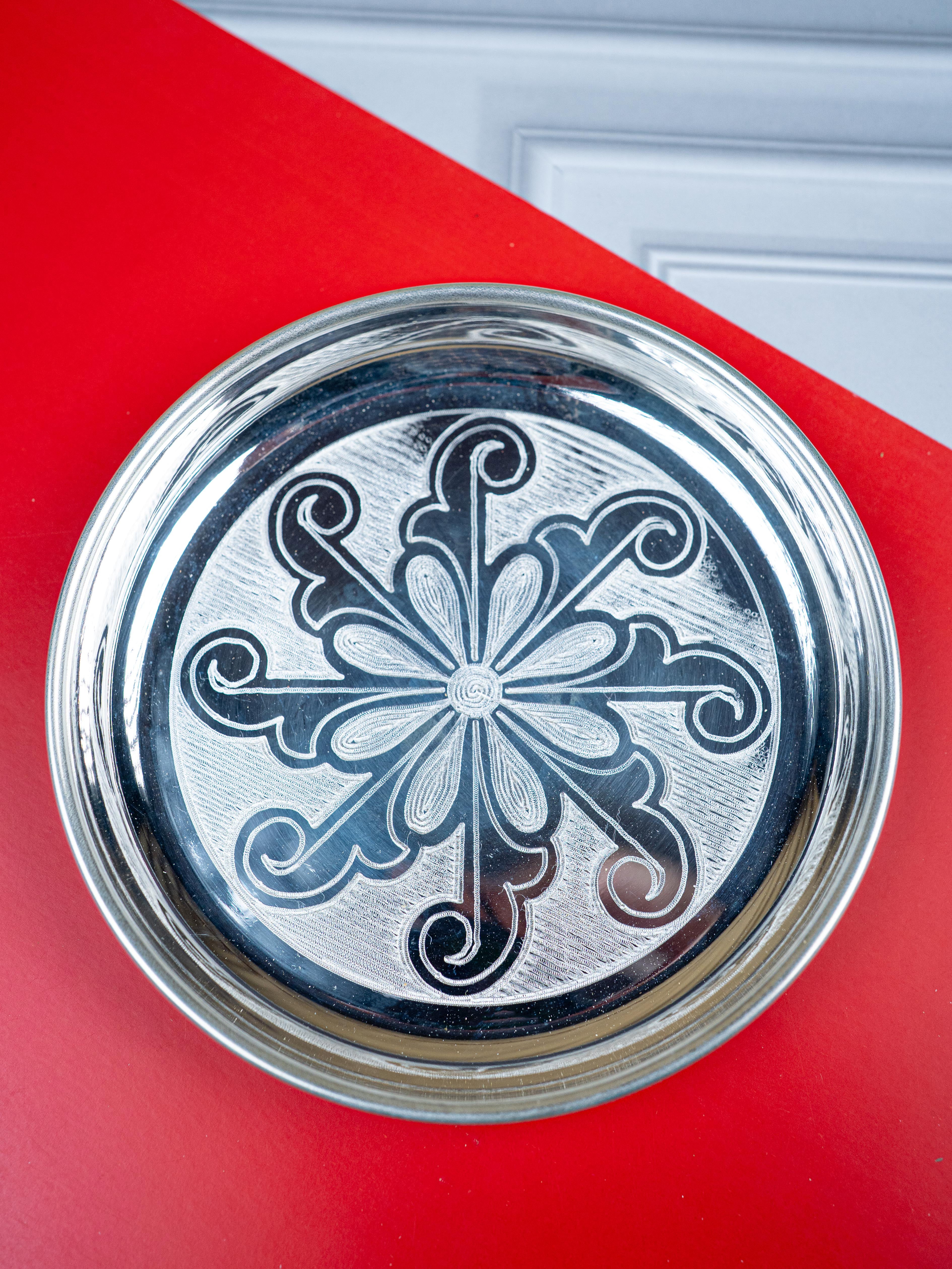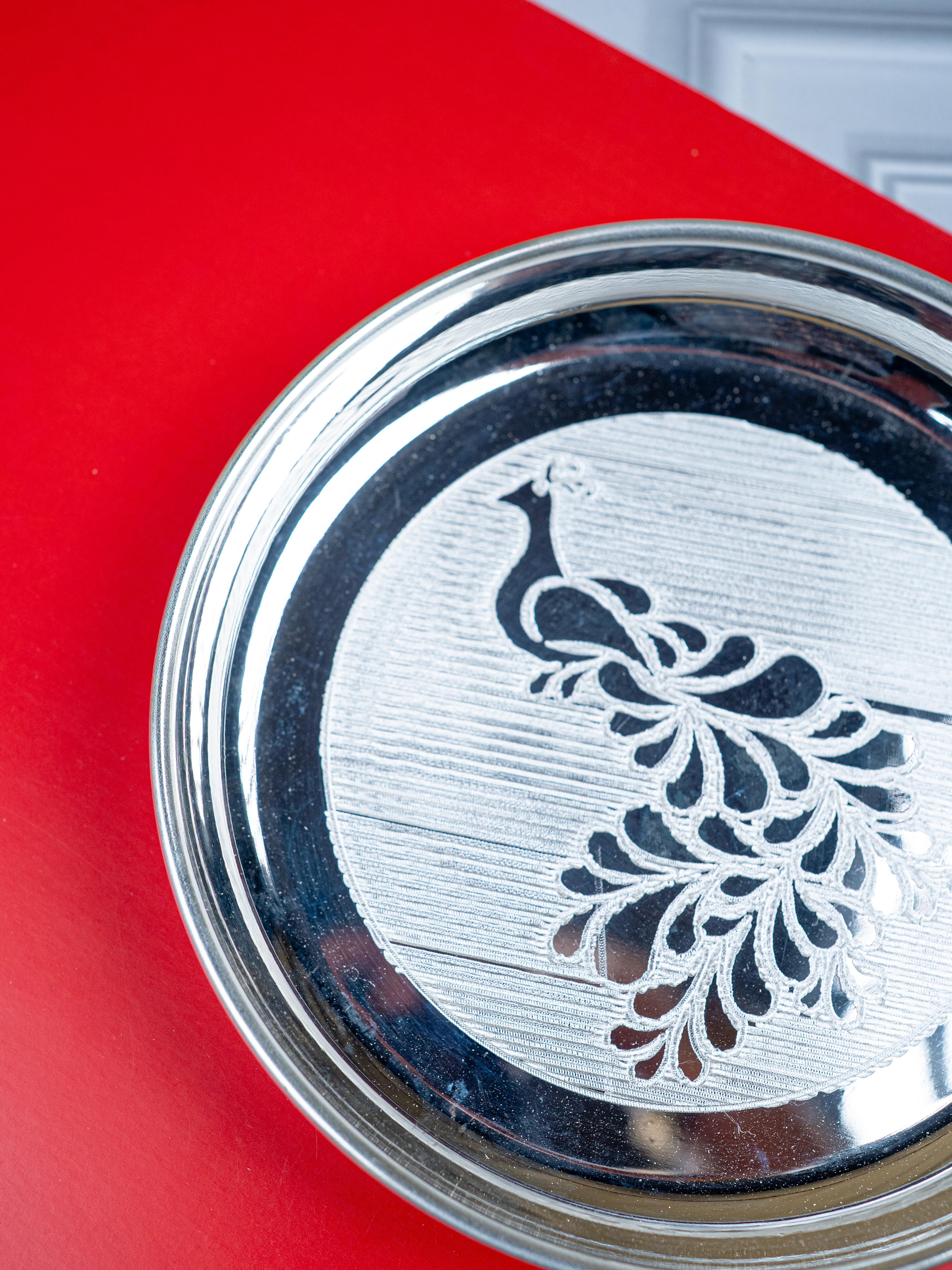 - Featured is a lovely plate crafted from premium German silver apt for your everyday Pooja!