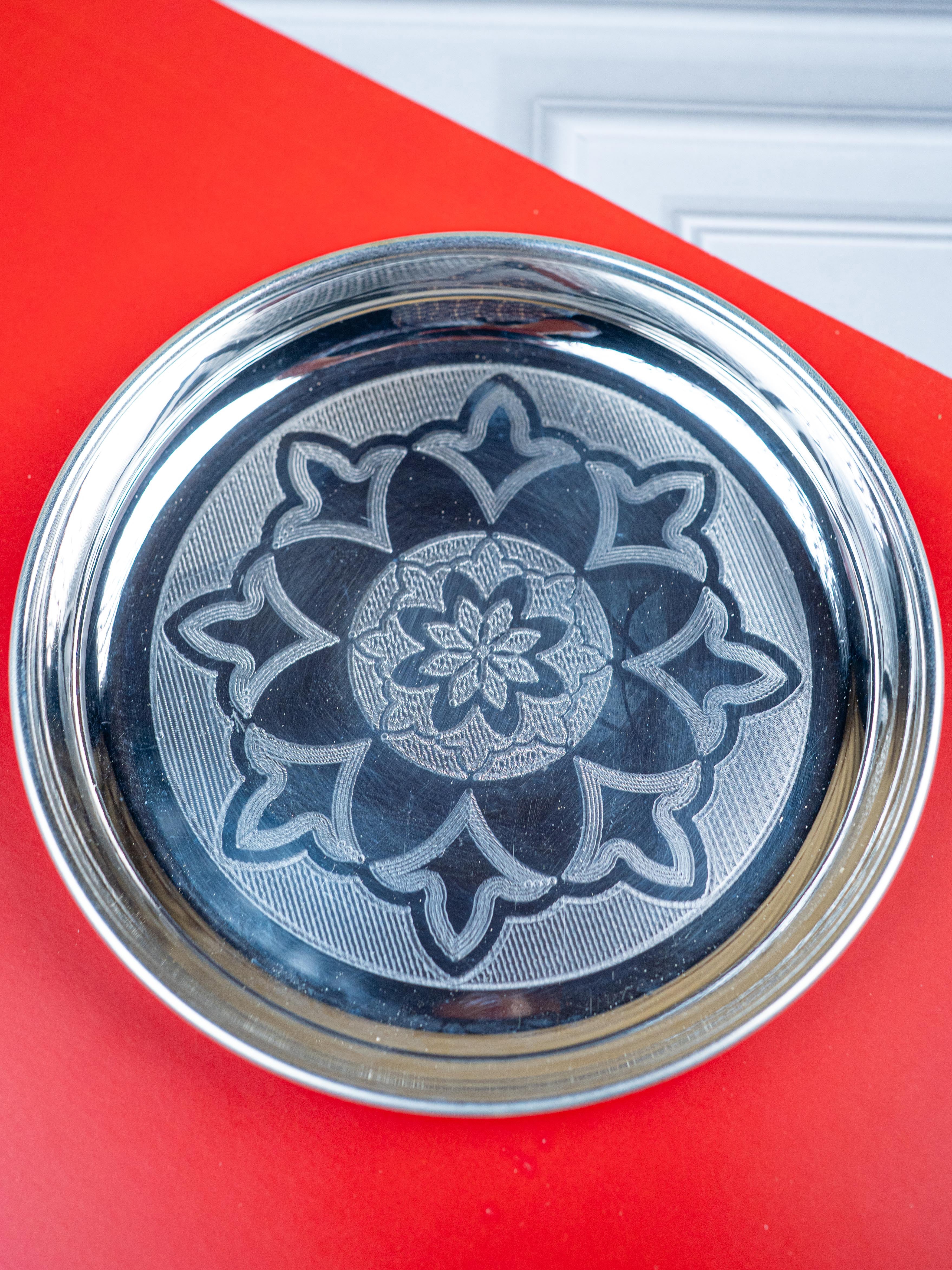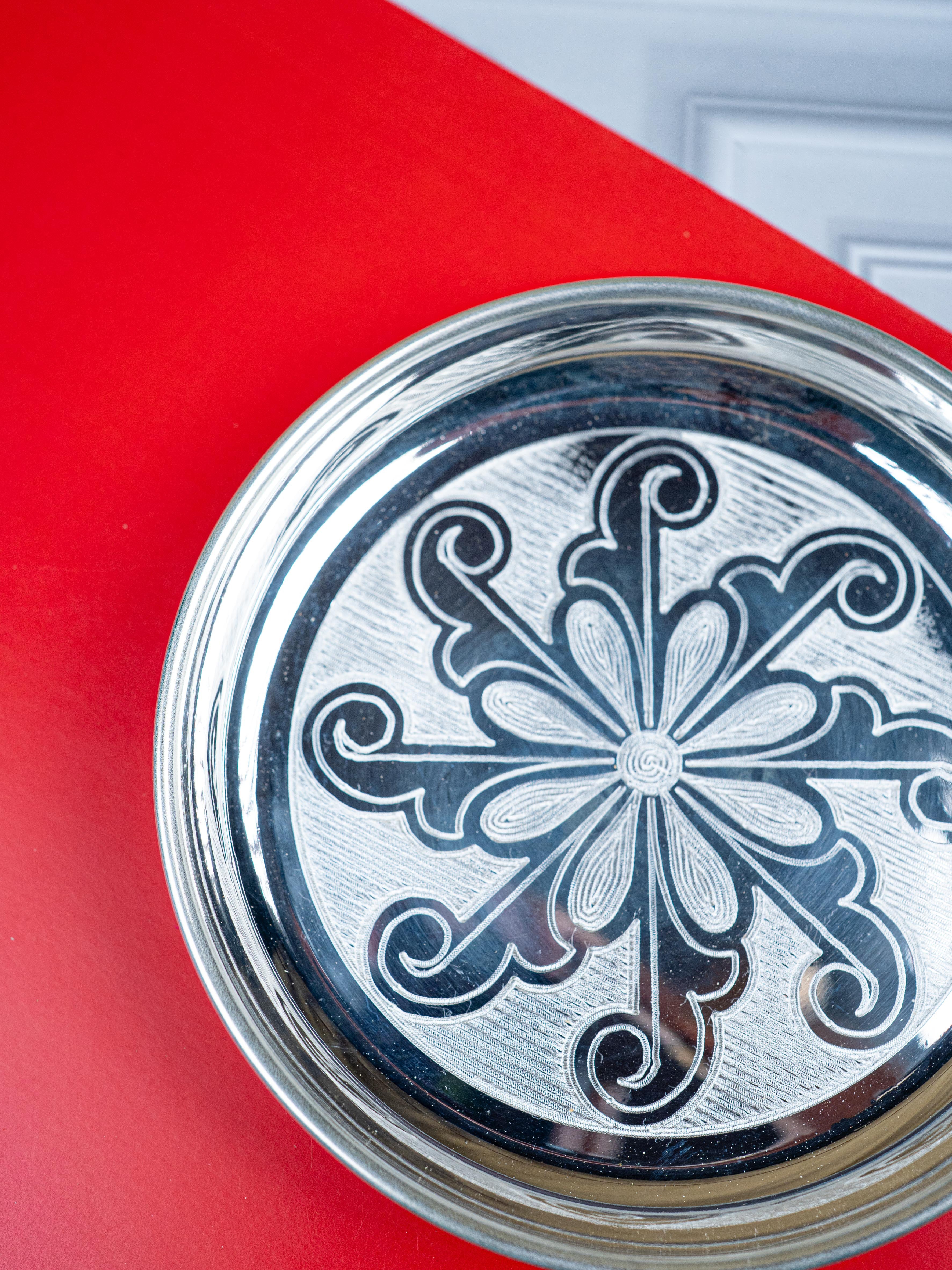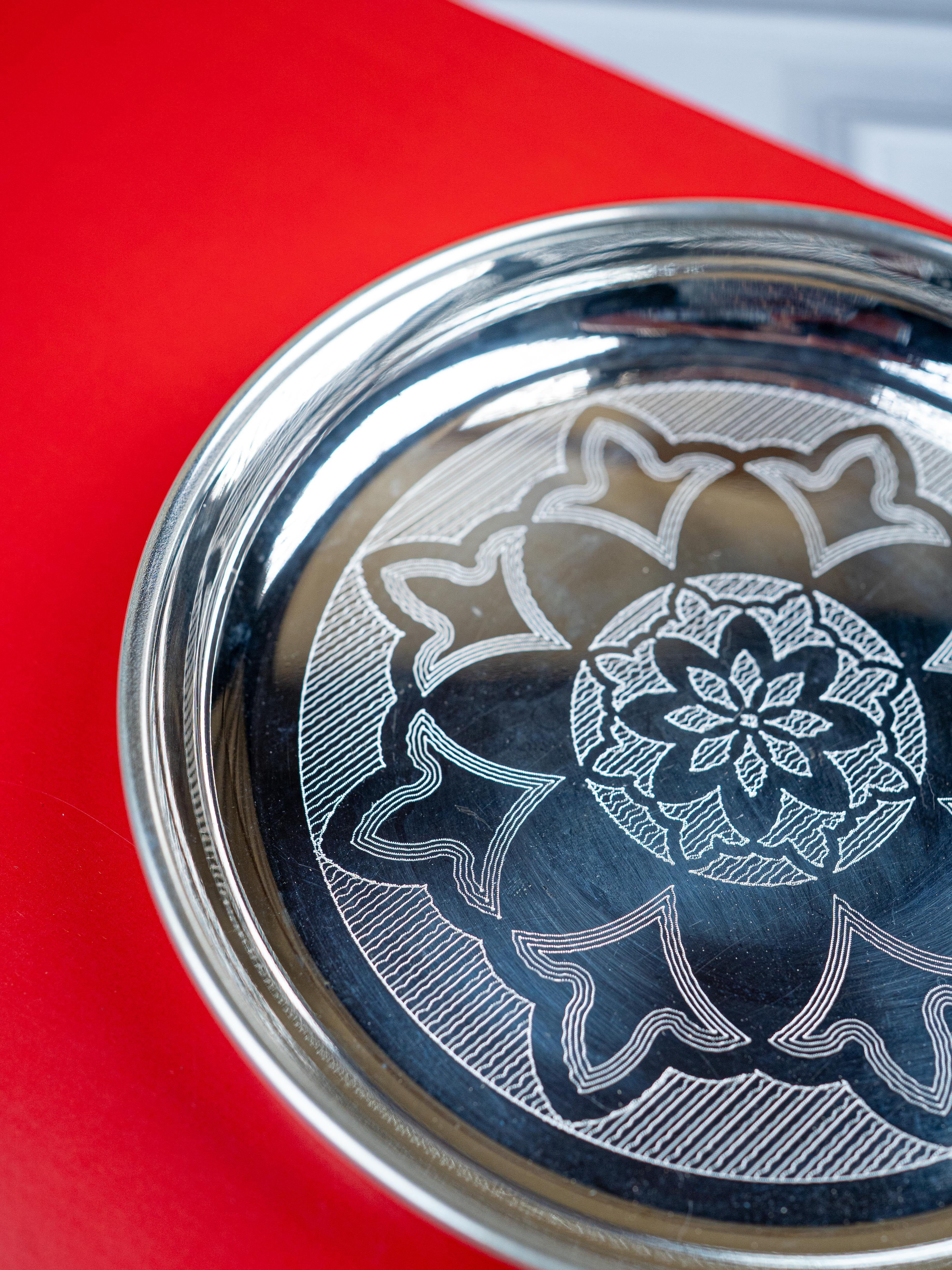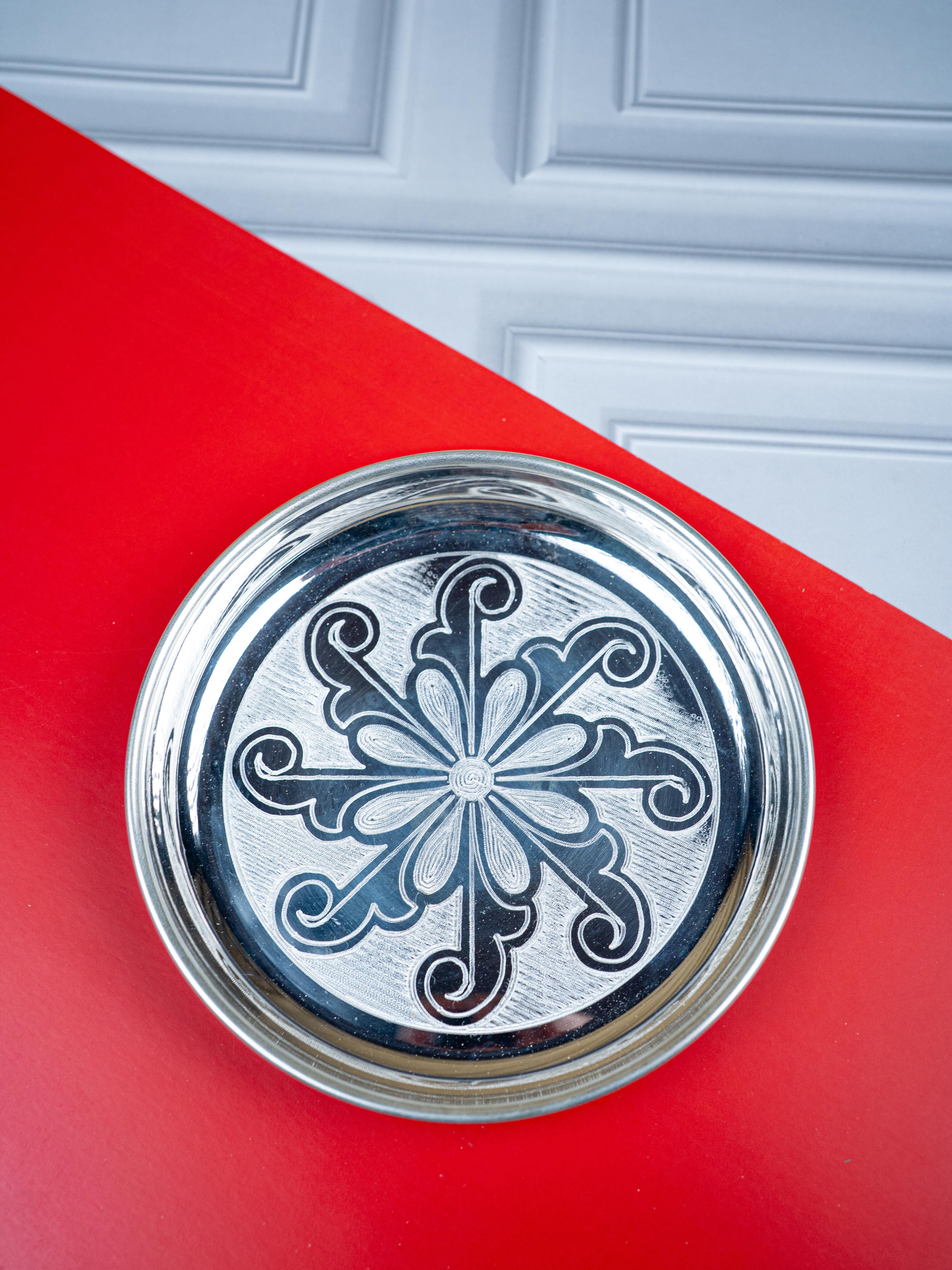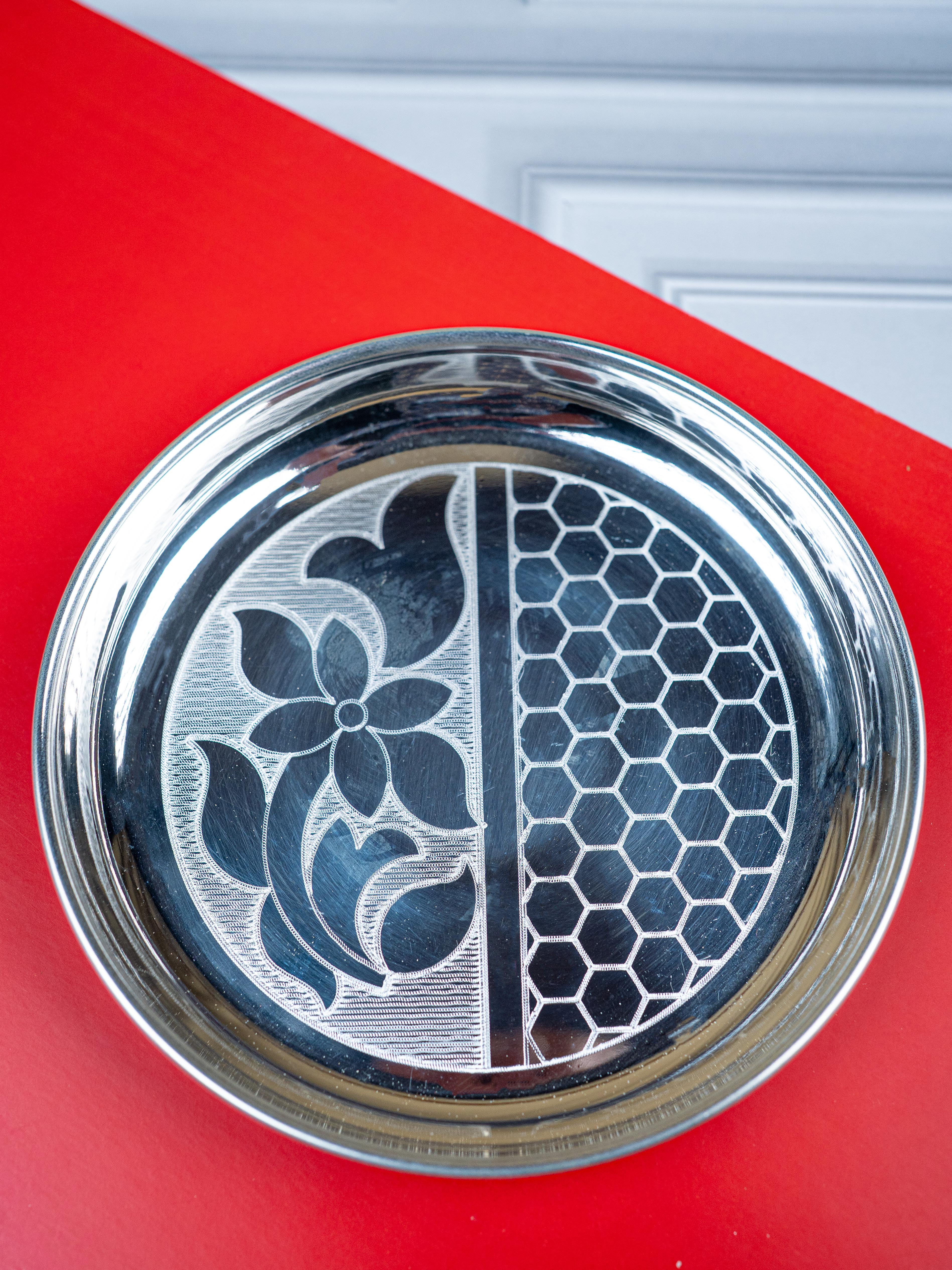 - Featured is a lovely plate crafted from premium German silver apt for your everyday Pooja!