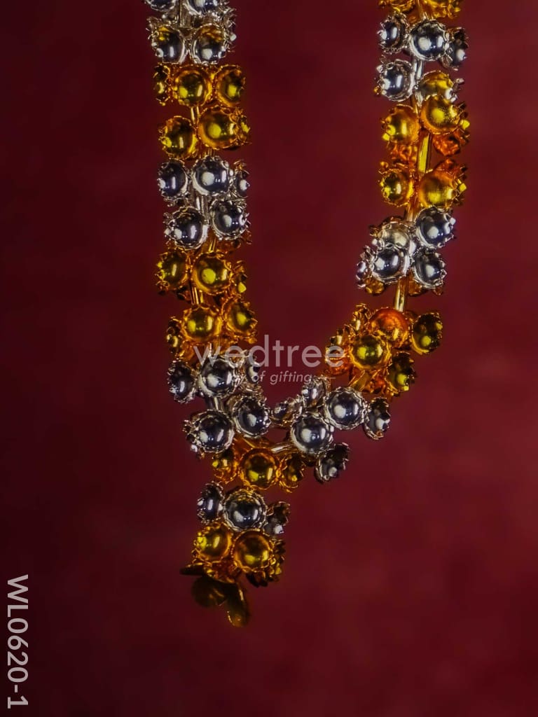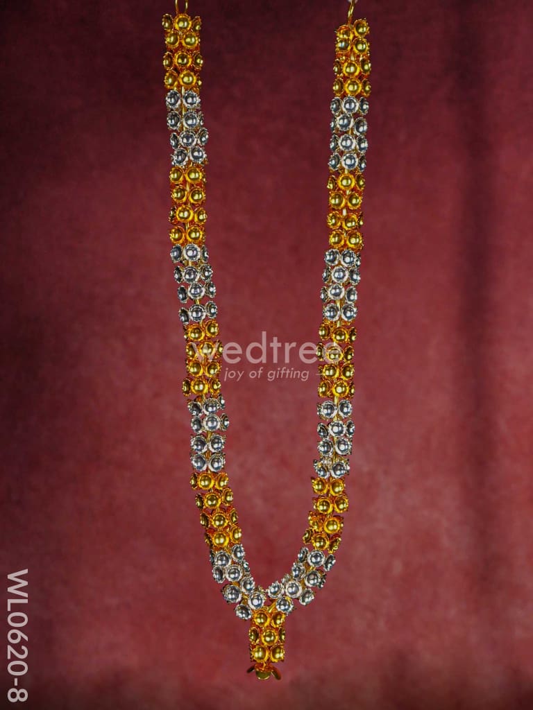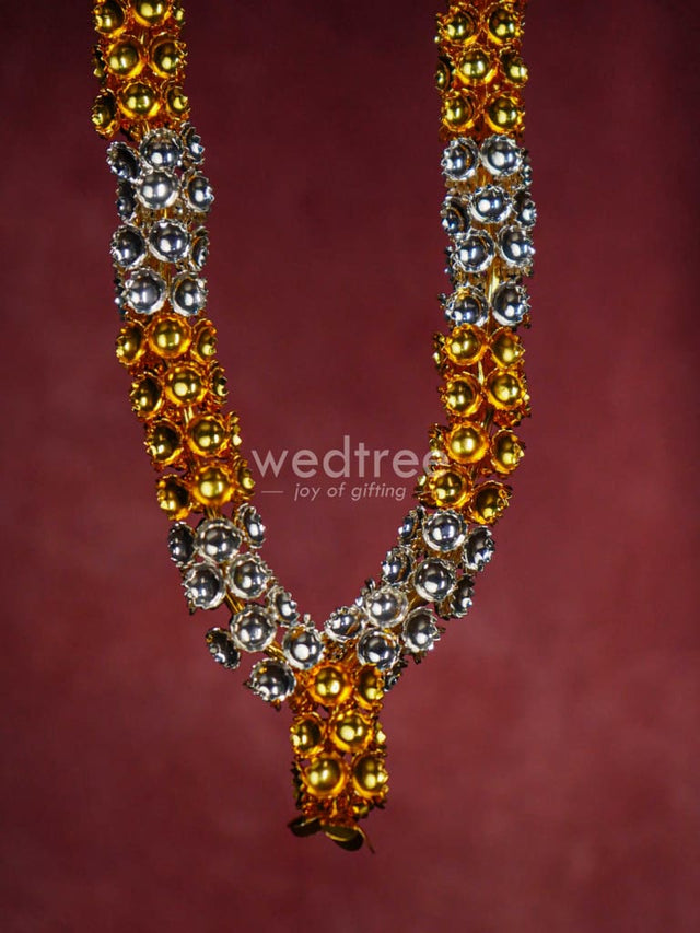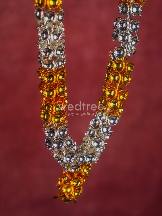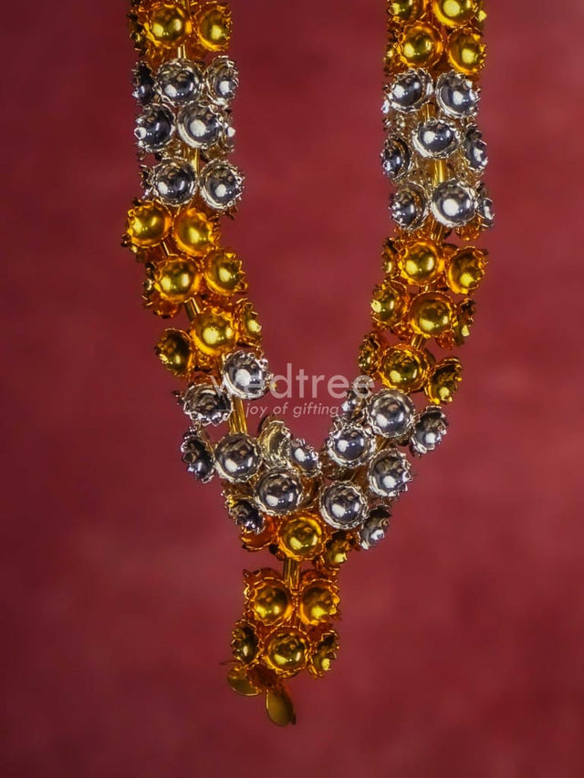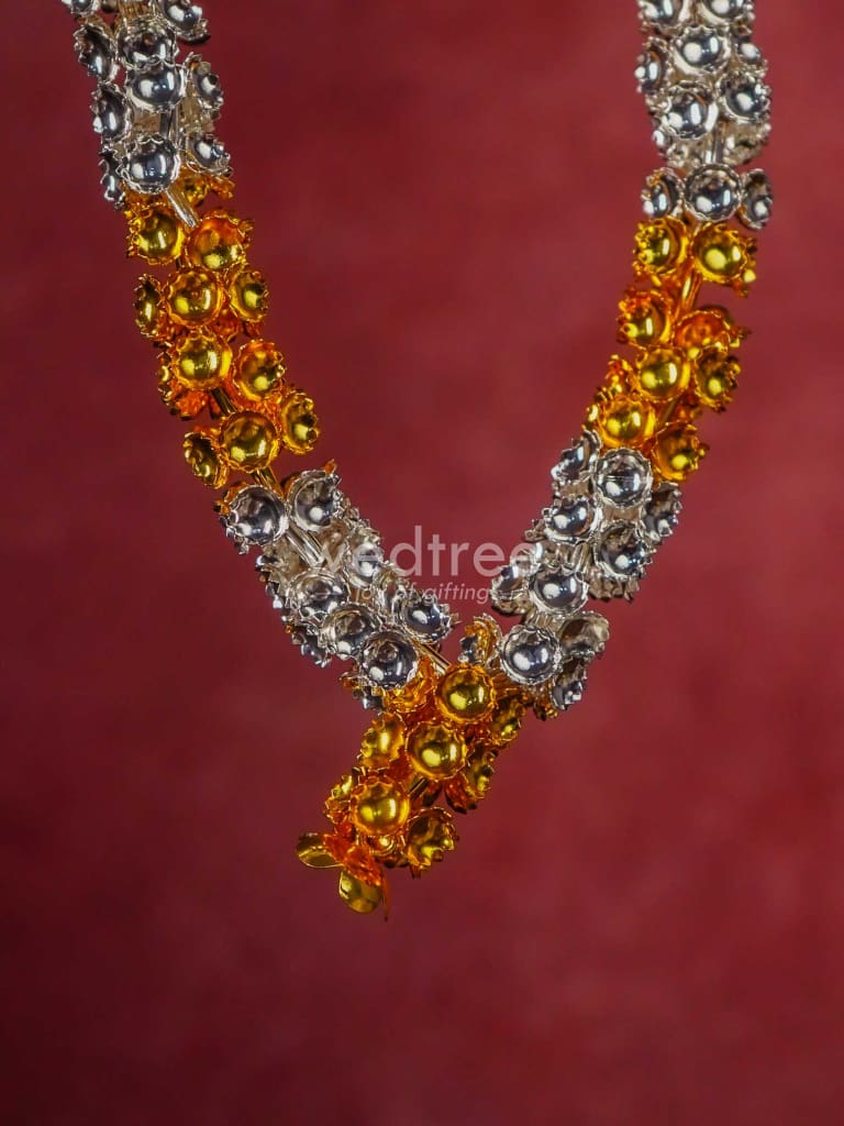 - This sacred malai is made of German silver and comes with golden and silver plating in an alternate pattern. The garland (malai) is handcrafted with cute tiny flowers closely strung.