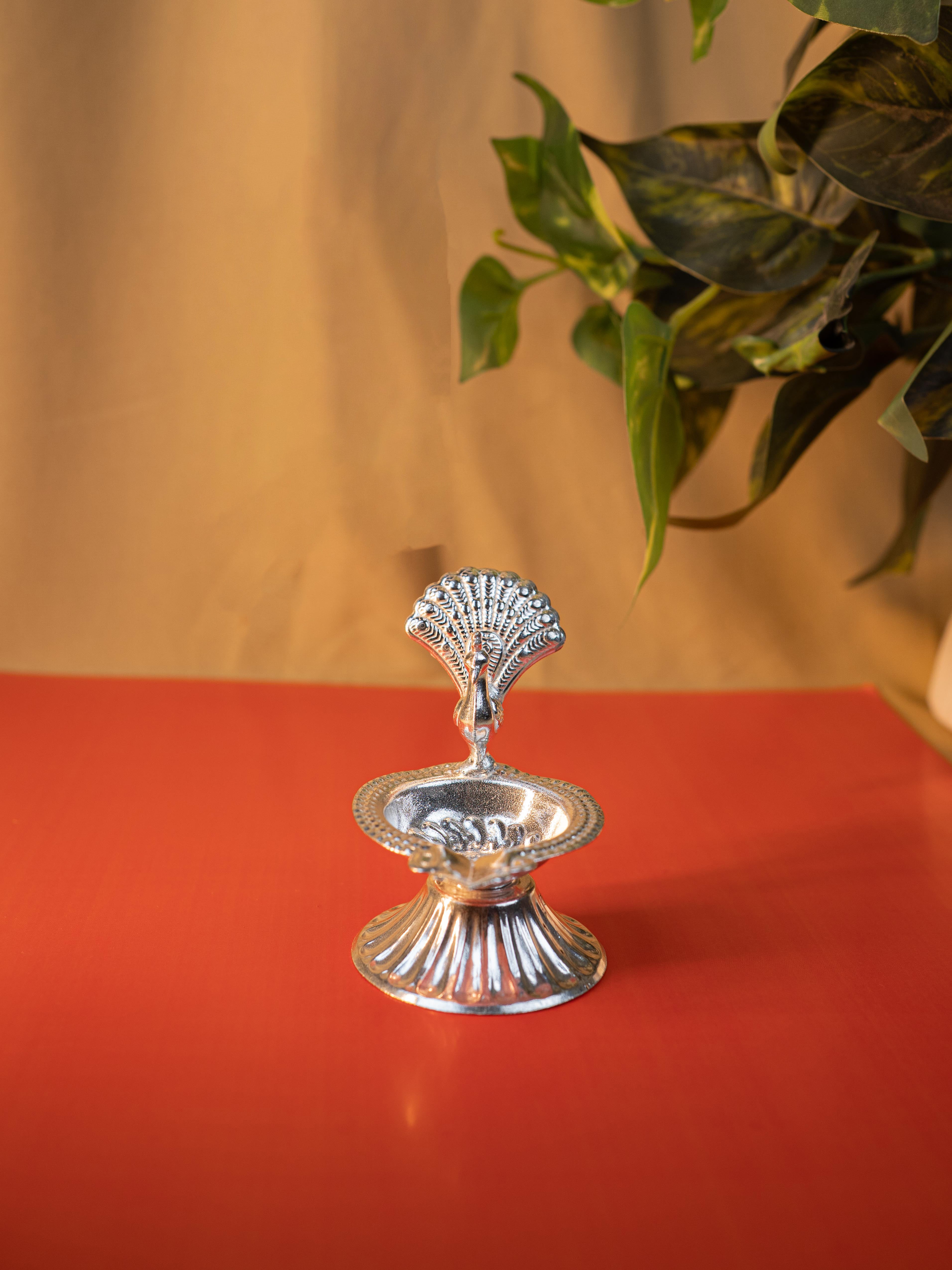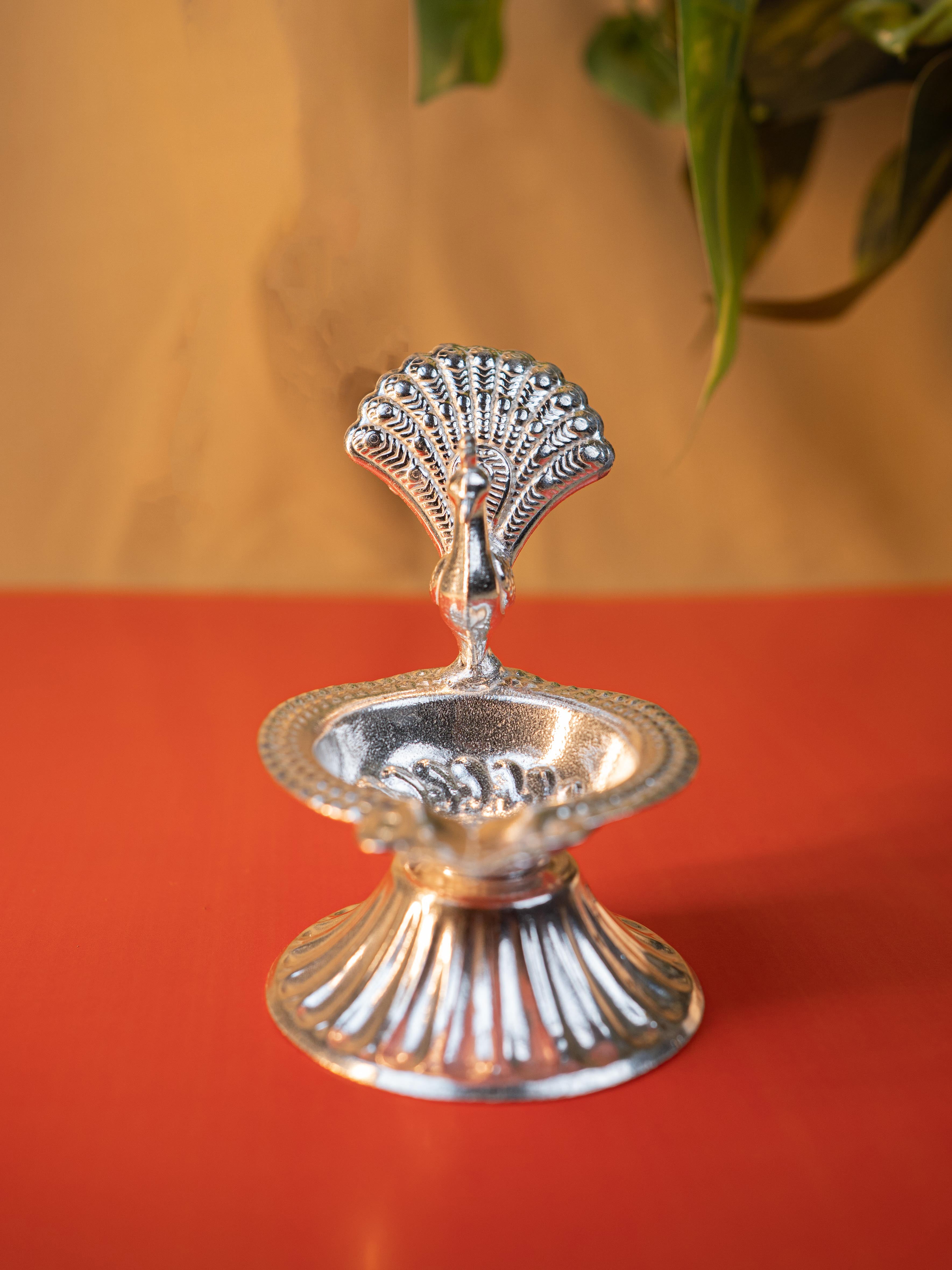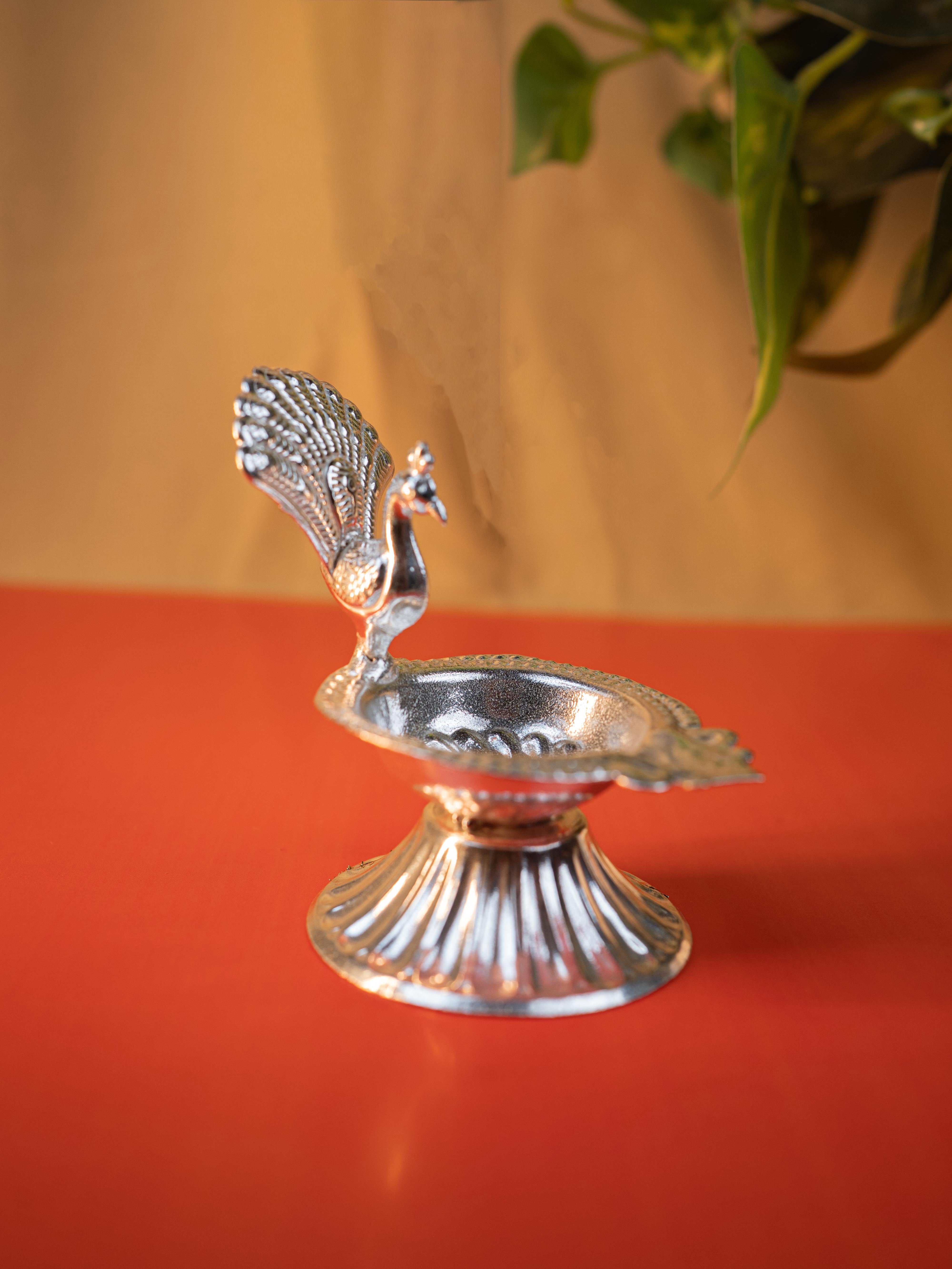 - German Silver Diya is Beautifully Designed in the Shape of a Peacock, Showcasing Intricate Craftsmanship and Fine Detailing.