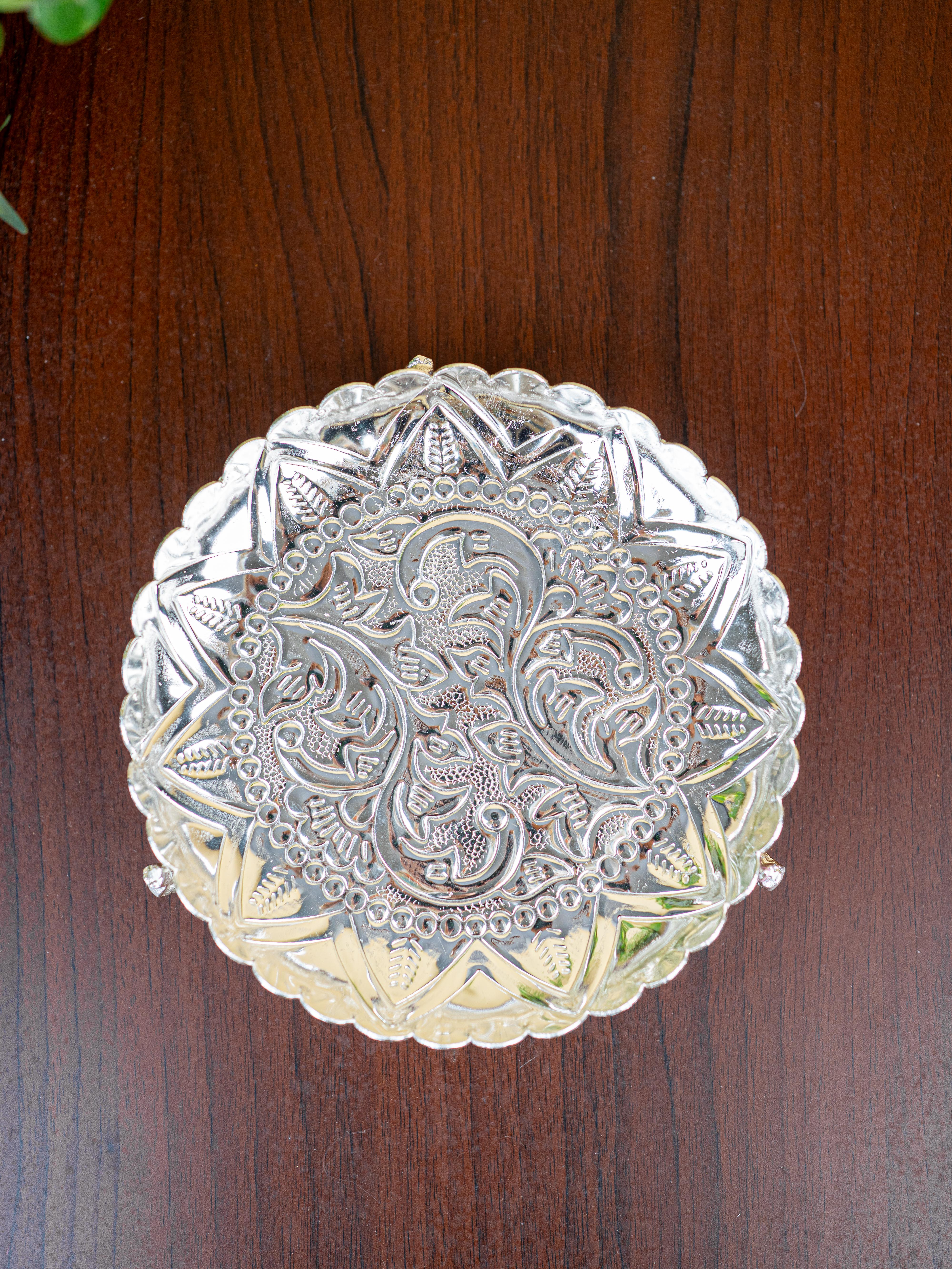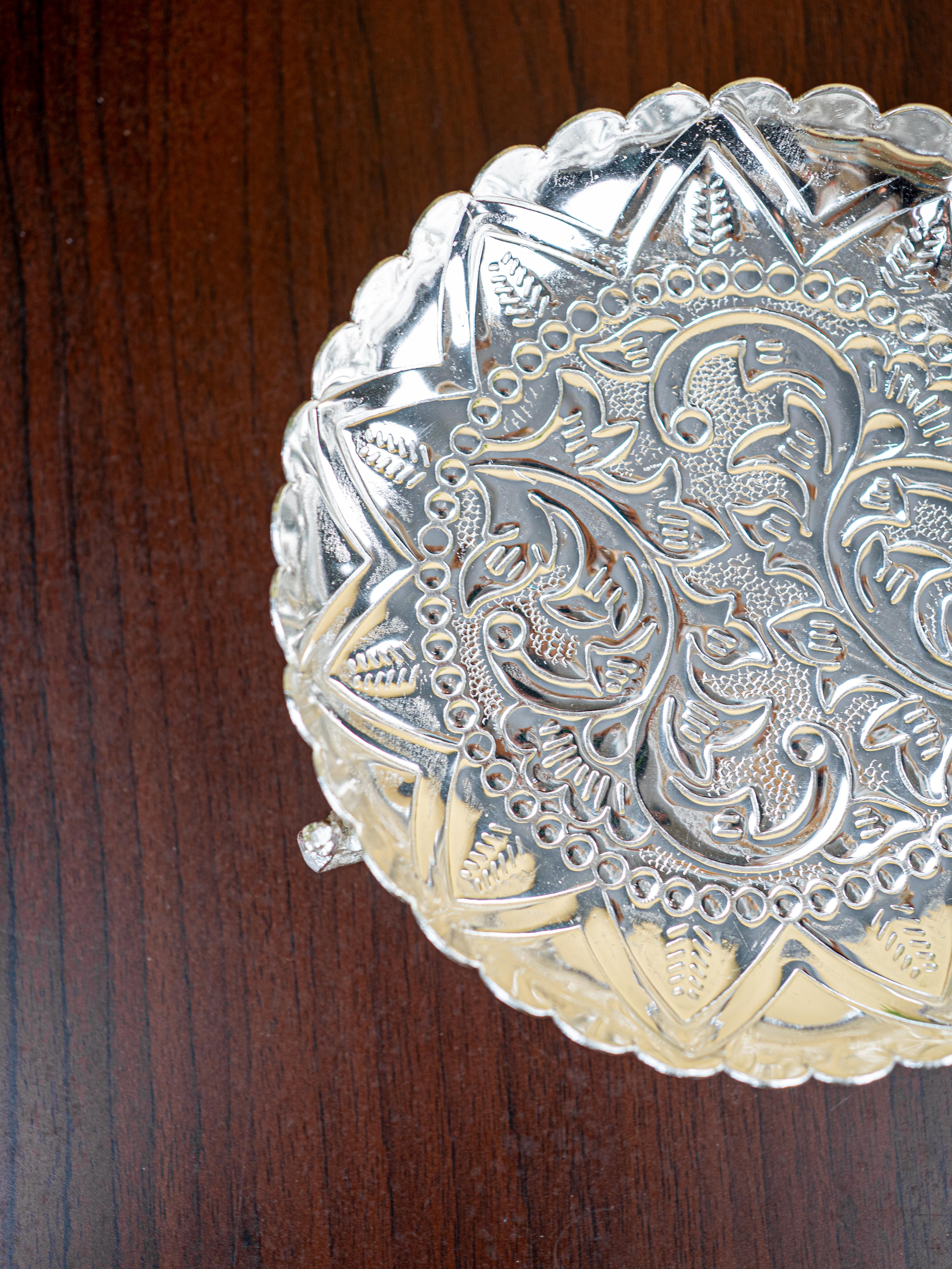 - This 12 inch Silver Coating pooja tray is a marvel to behold! Beautifully carved with intricate floral patterns, it will bring an eye-catching touch of sophistication to your pooja.