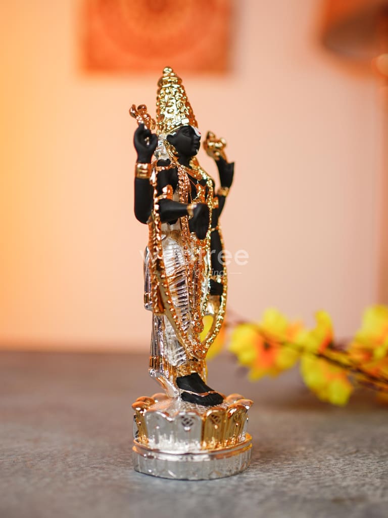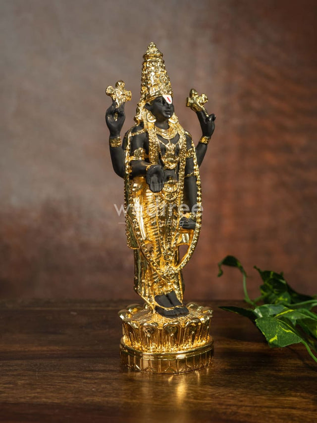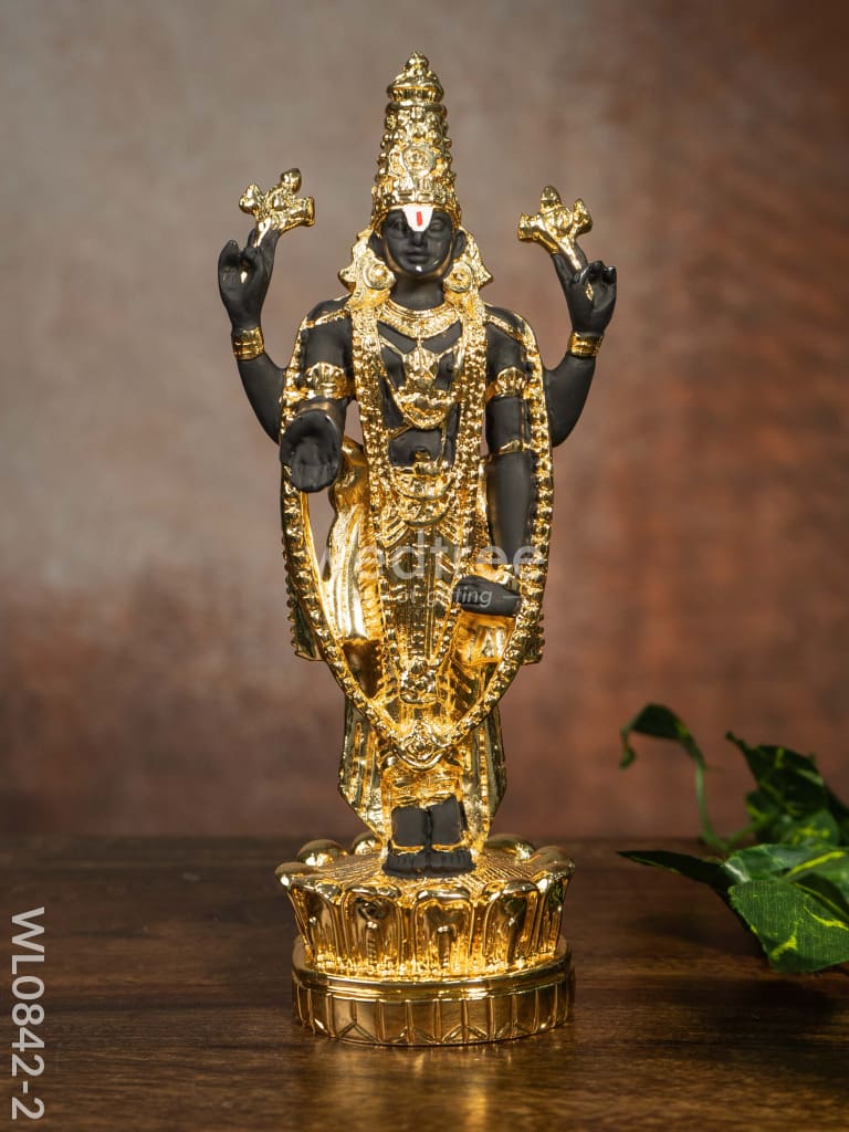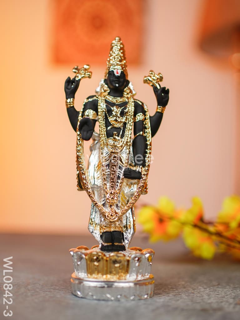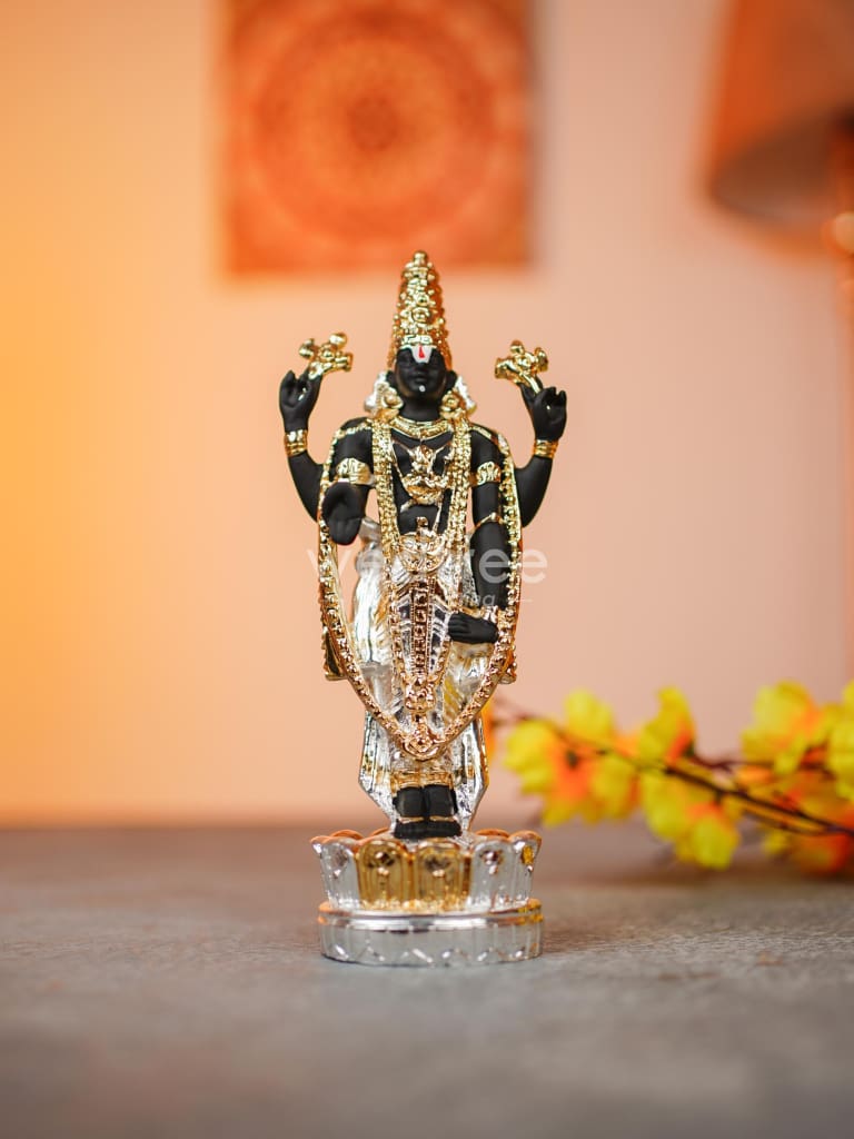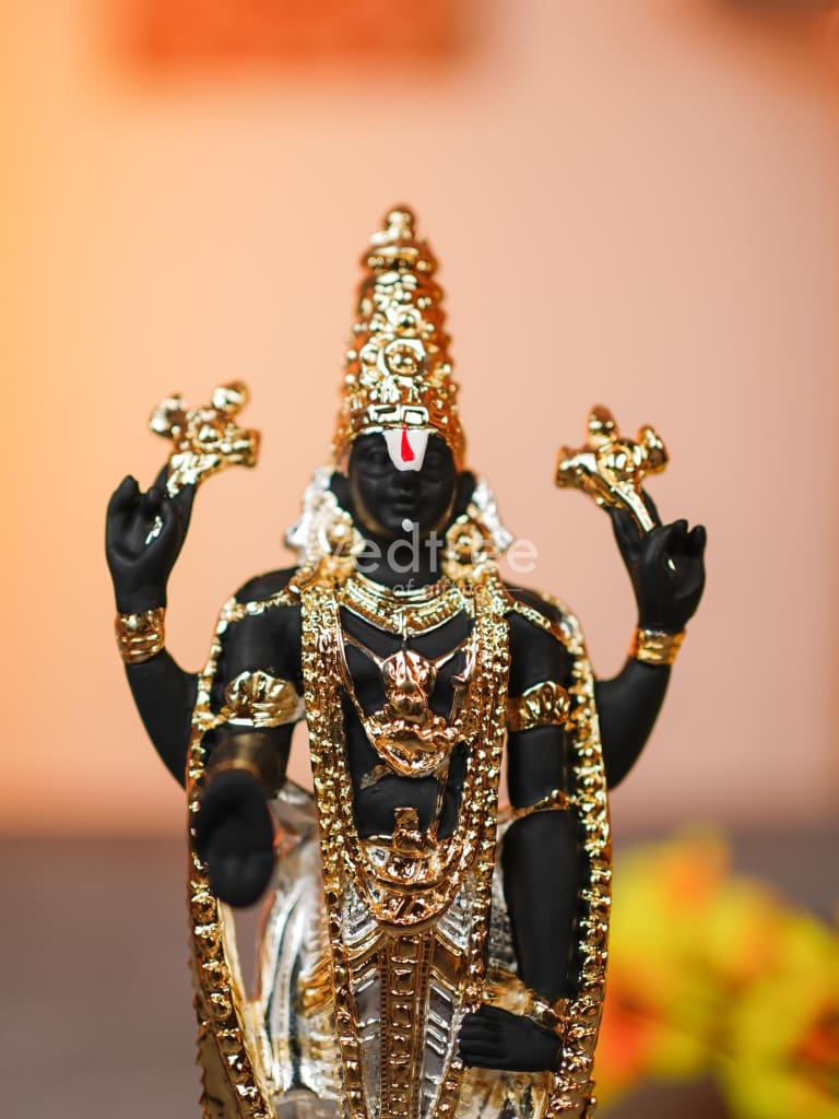 - It features Lord Balaji standing on a round podium with his divine weapons, shank and chakra.