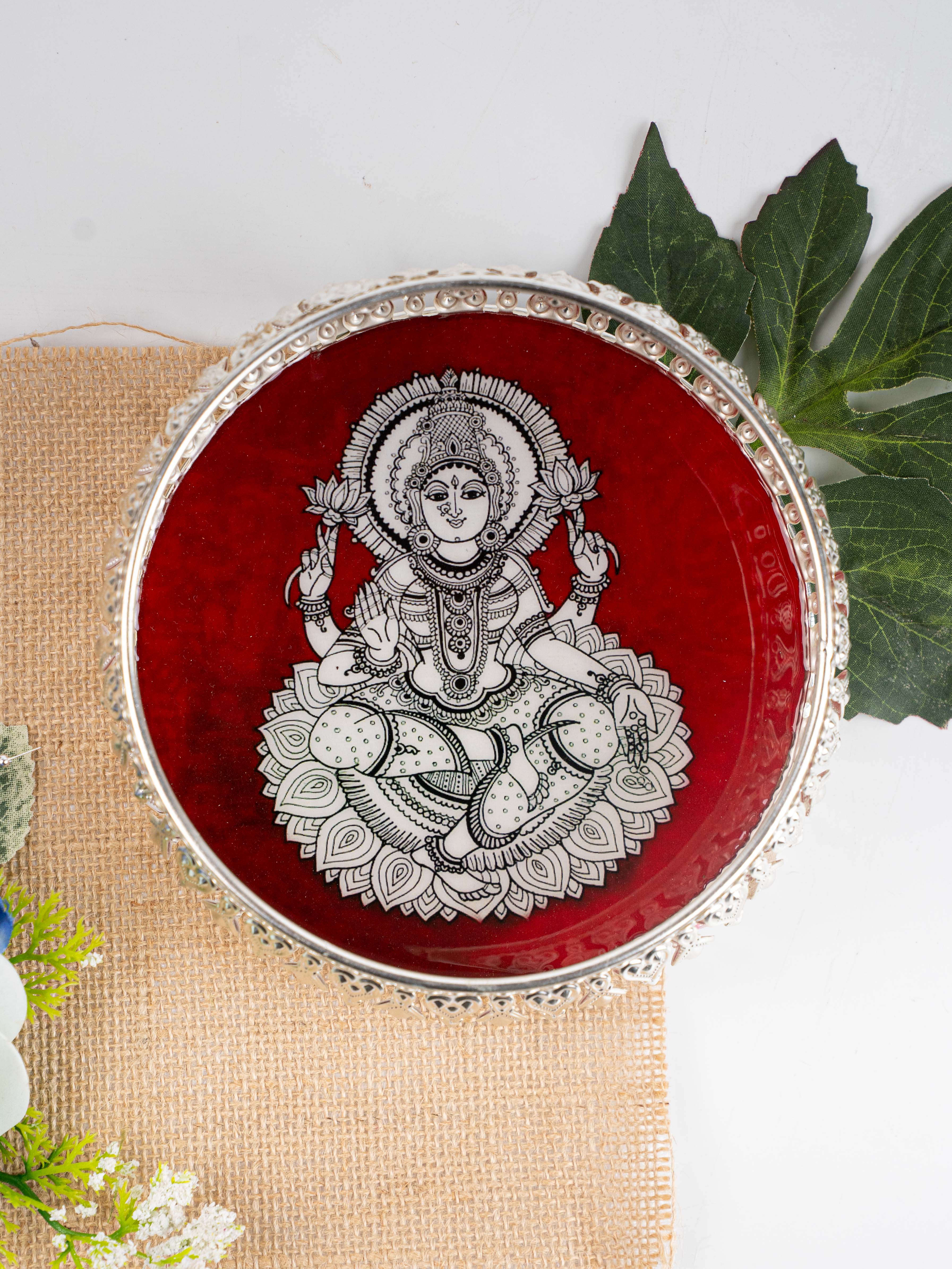 This Beautifully Crafted Silver-Finish Decorative Tray, showcasing Madhubani Print.