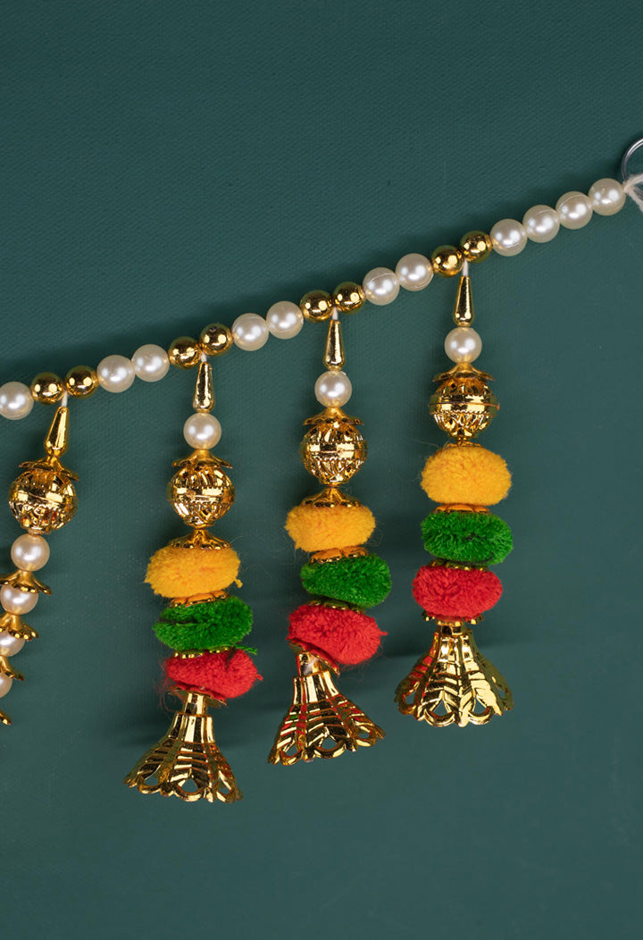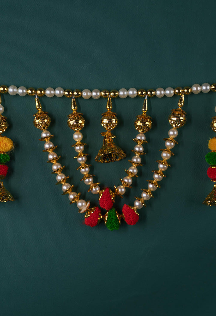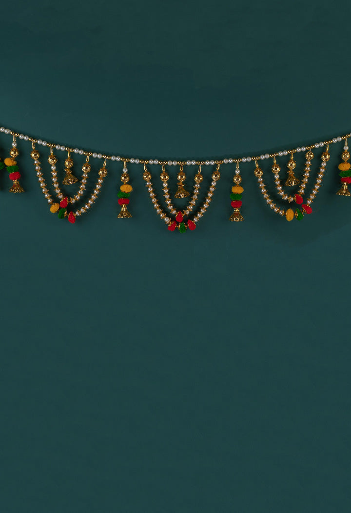 - This Thoran Features Rows of Pearl-like Beads Arranged in Graceful U-shaped Loops, interspersed with Gold-toned Elements and intricately Designed Bells.