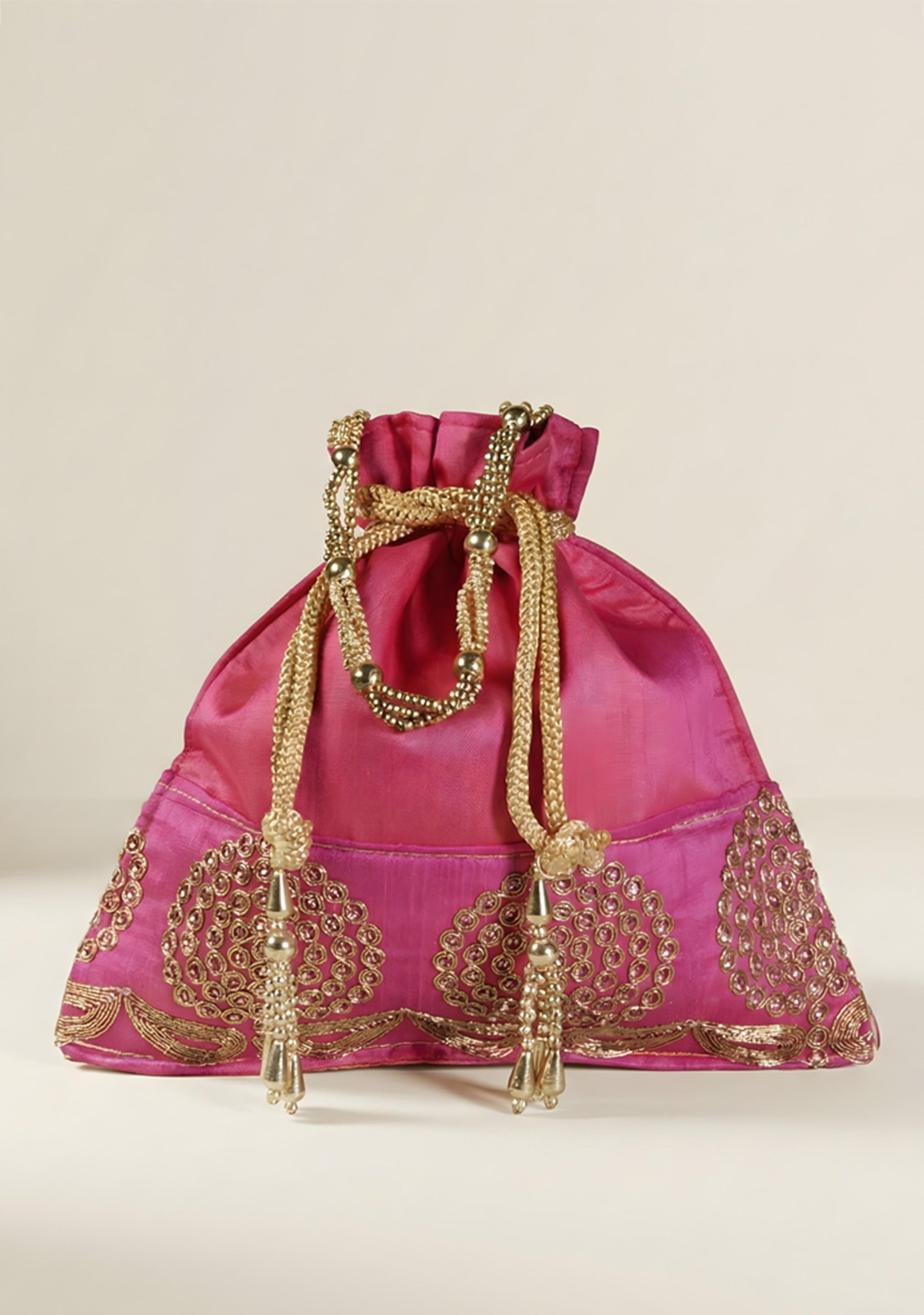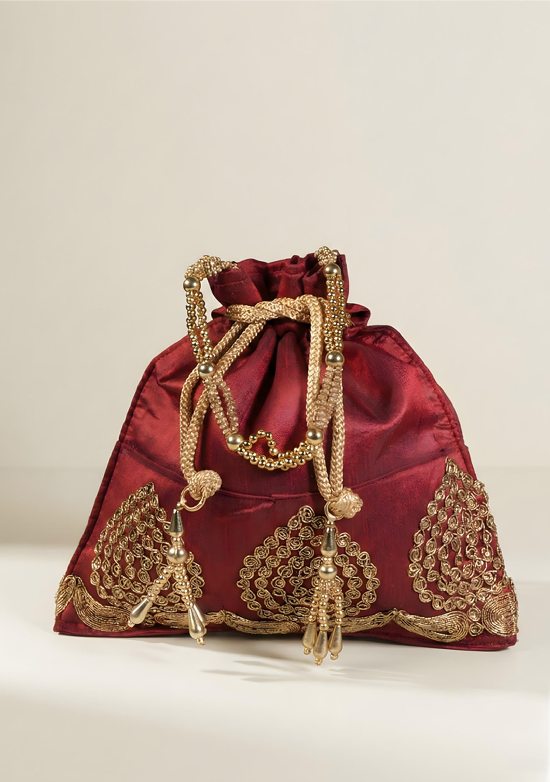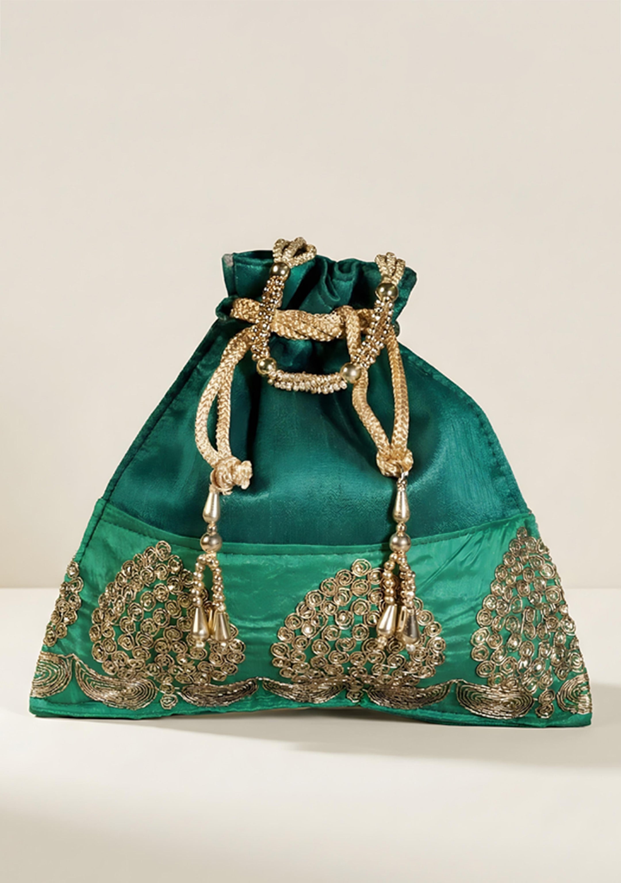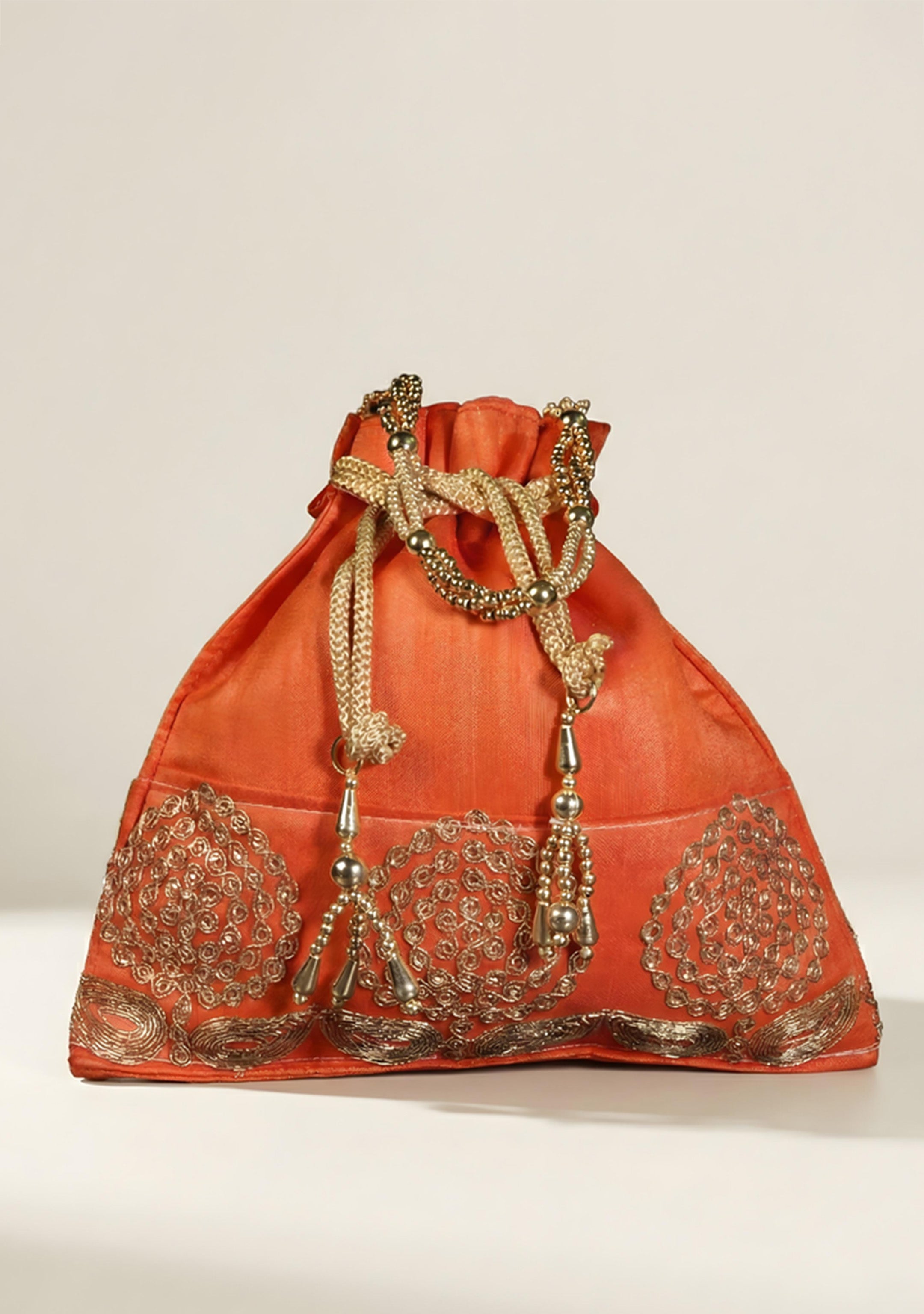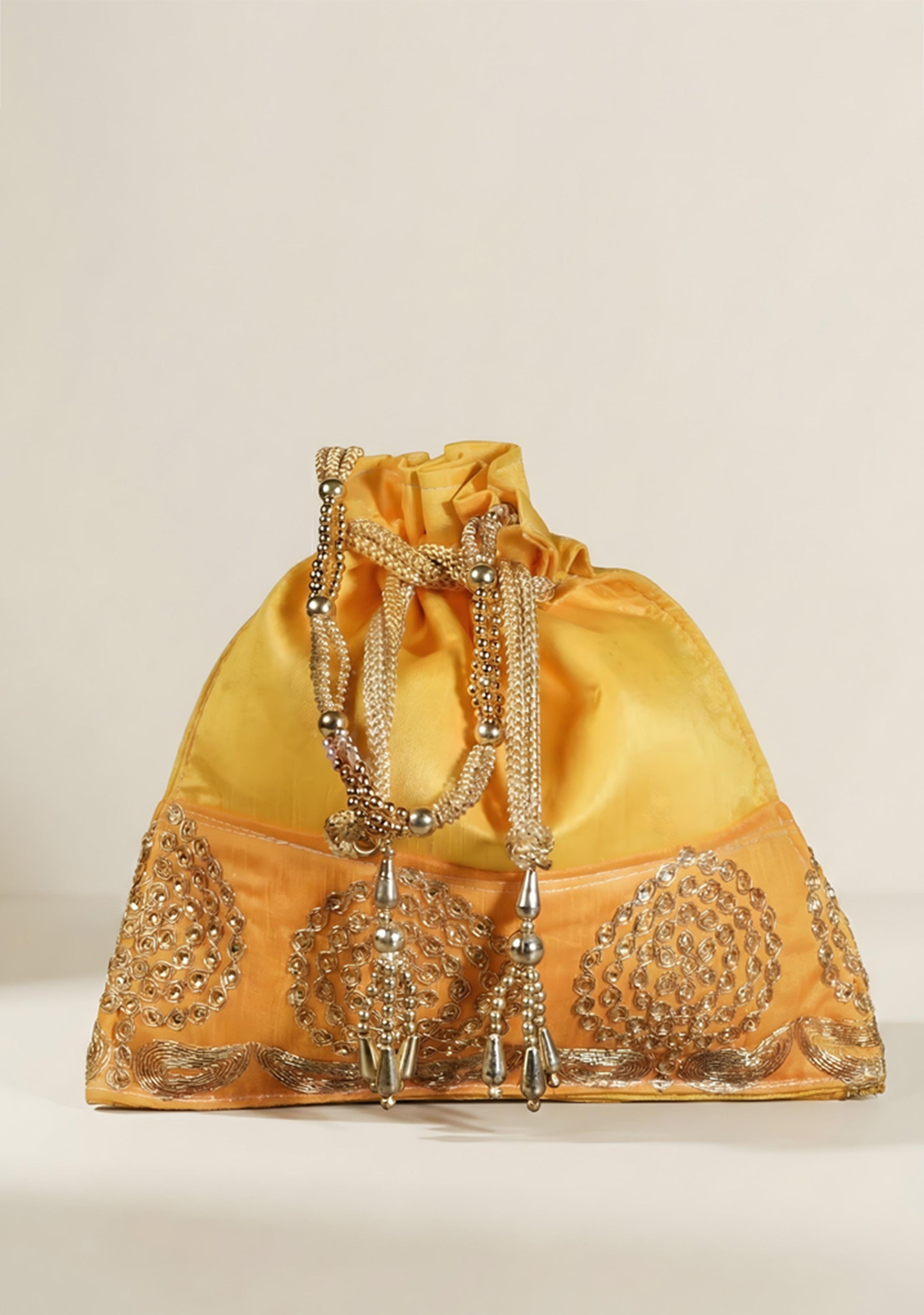 - An attractive polti bag woven out of raw silk with golden embroidery.
