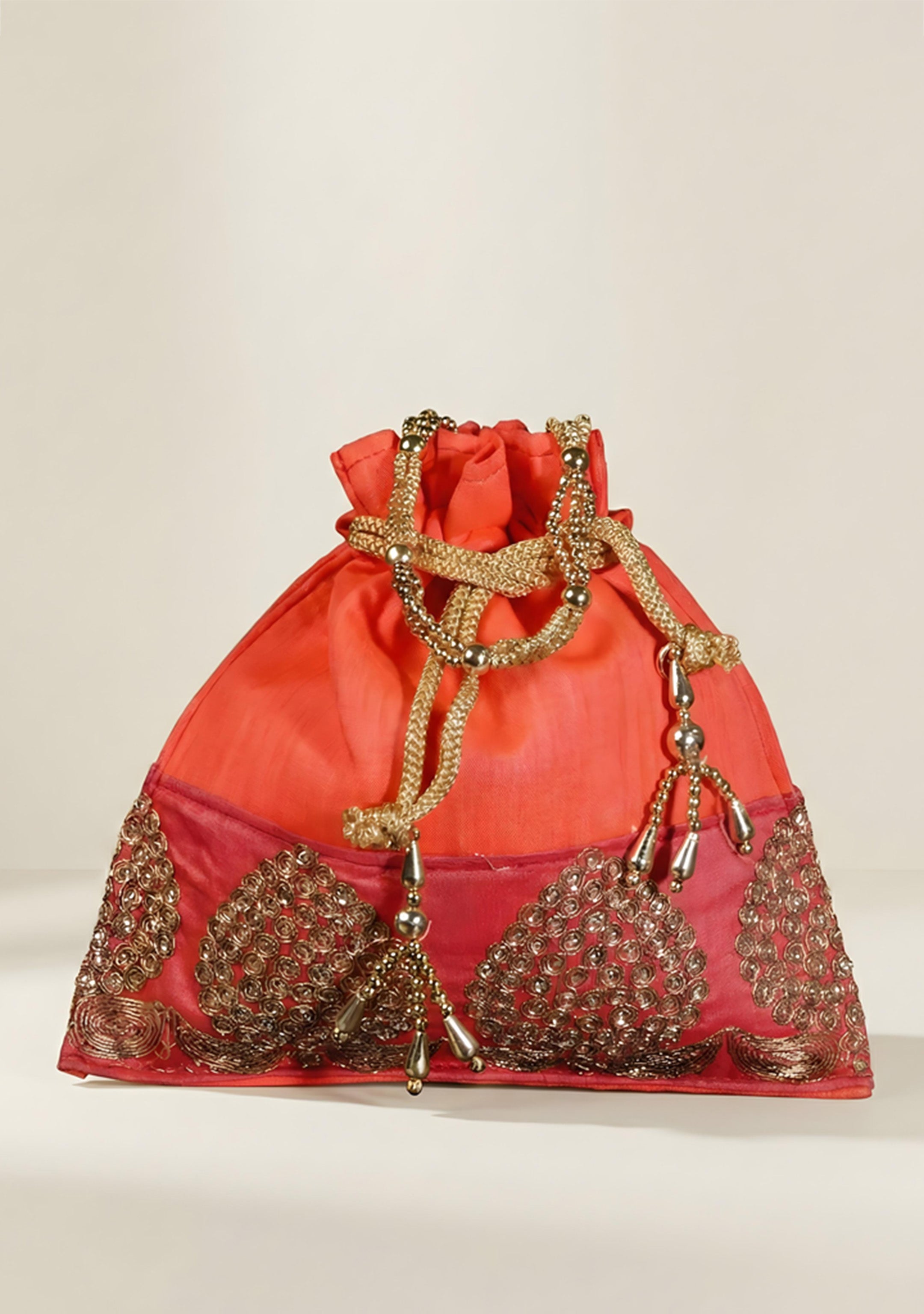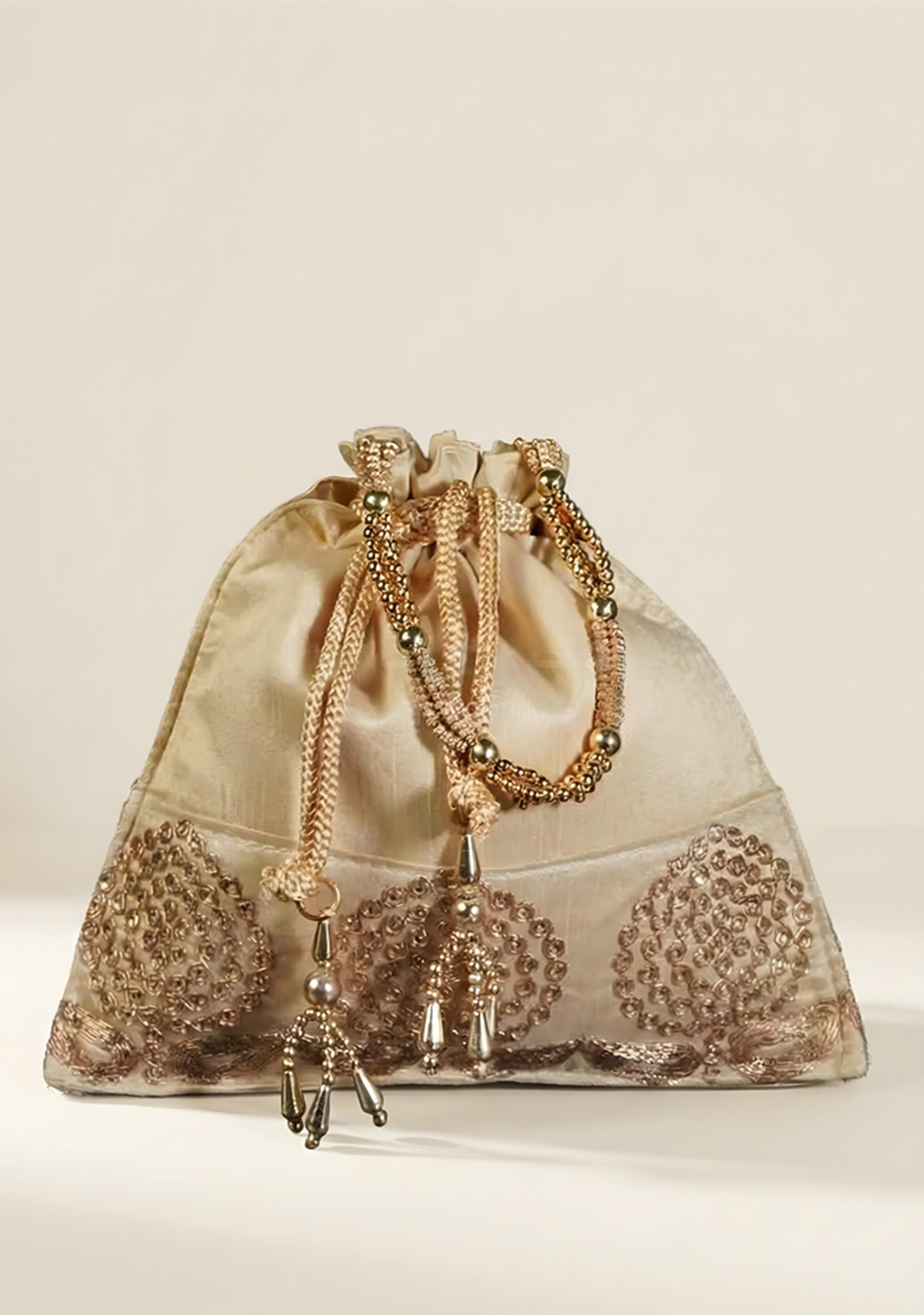 - It has a beautiful golden beaded handle and a drawstring for closure.