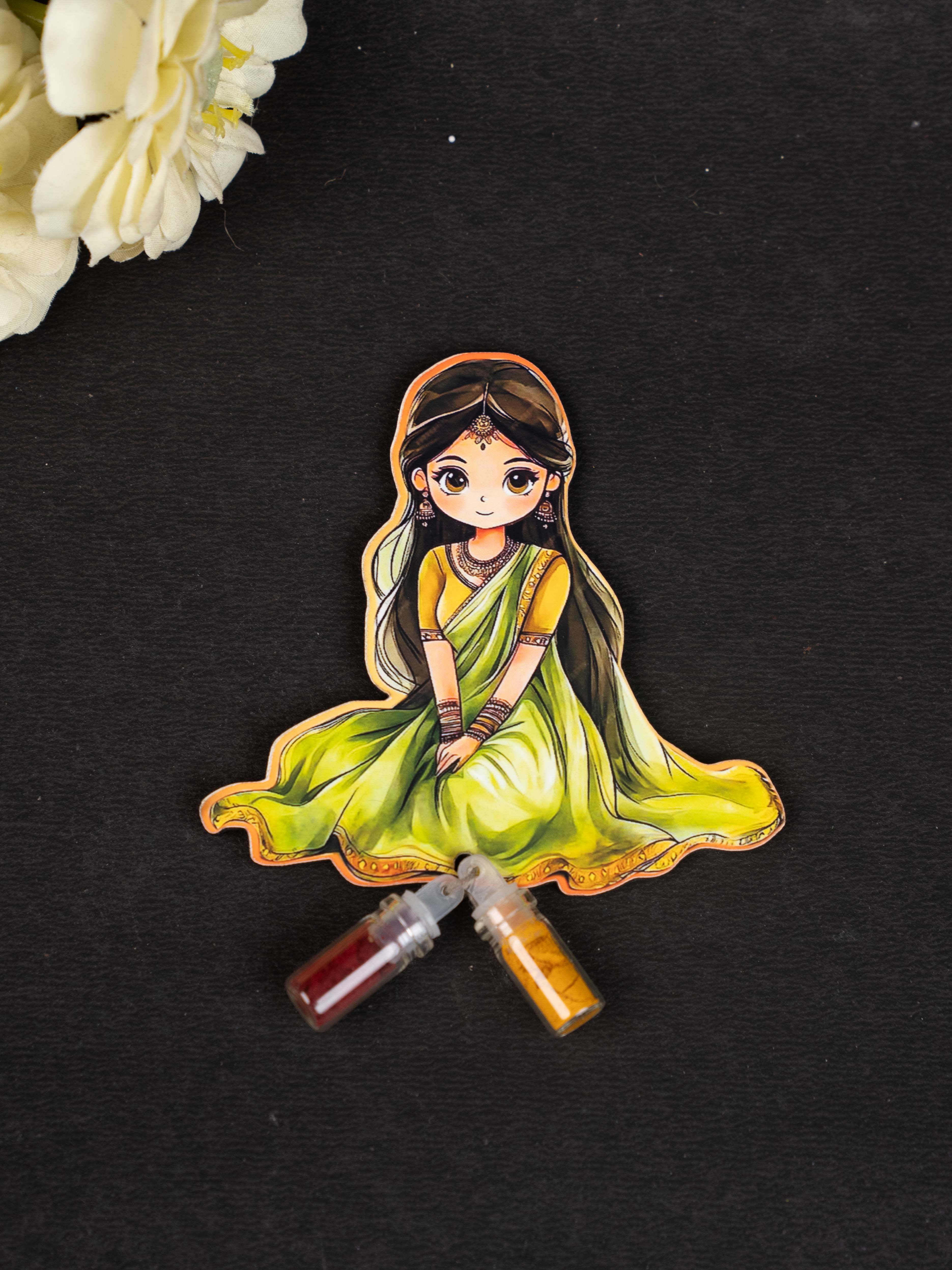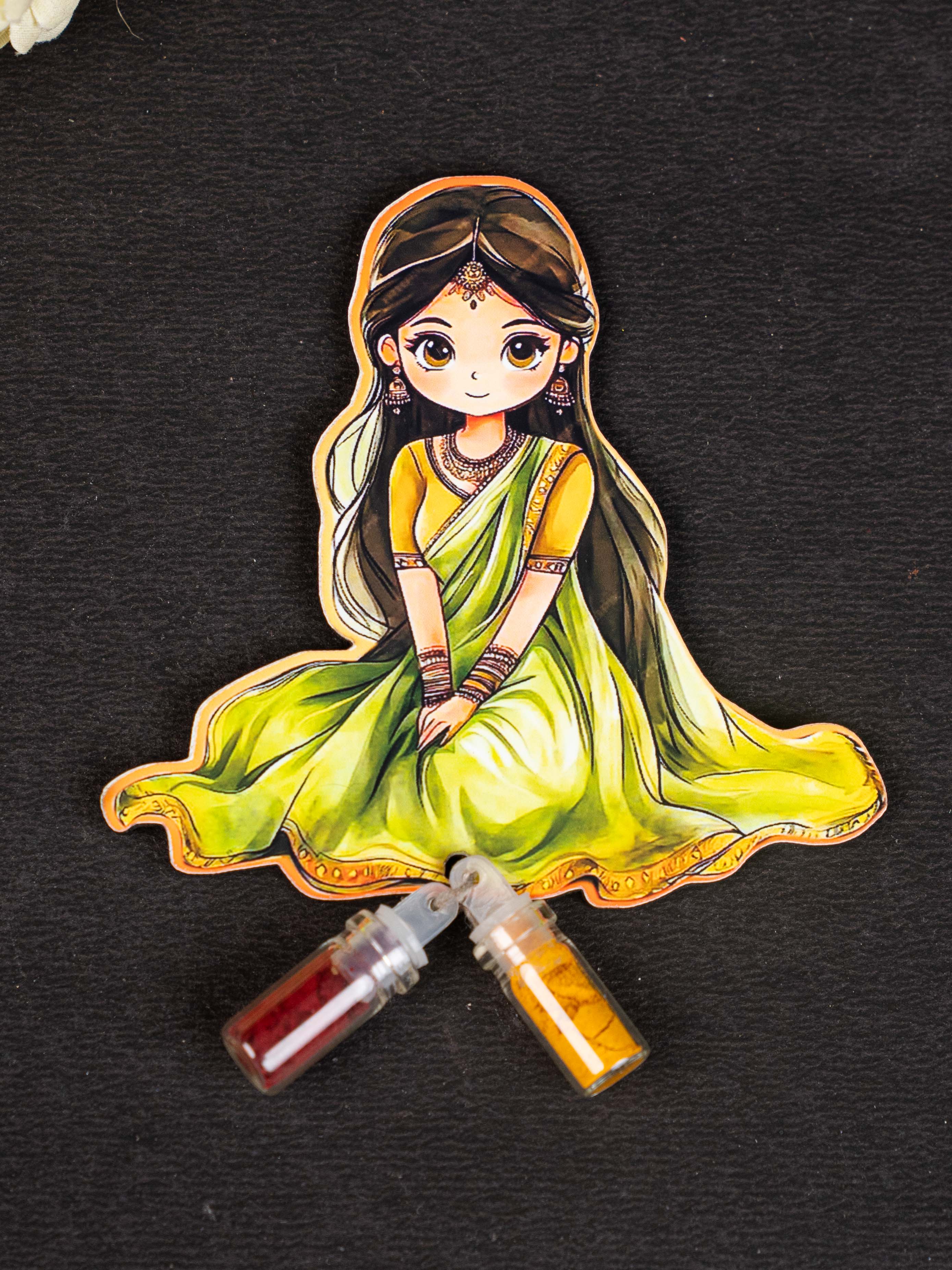 - This Charming Kumkum Holder Features a Beautifully Illustrated Girl in traditional attire, dressed in a Vibrant Green Saree with Intricate Jewelry and a Warm Smile.