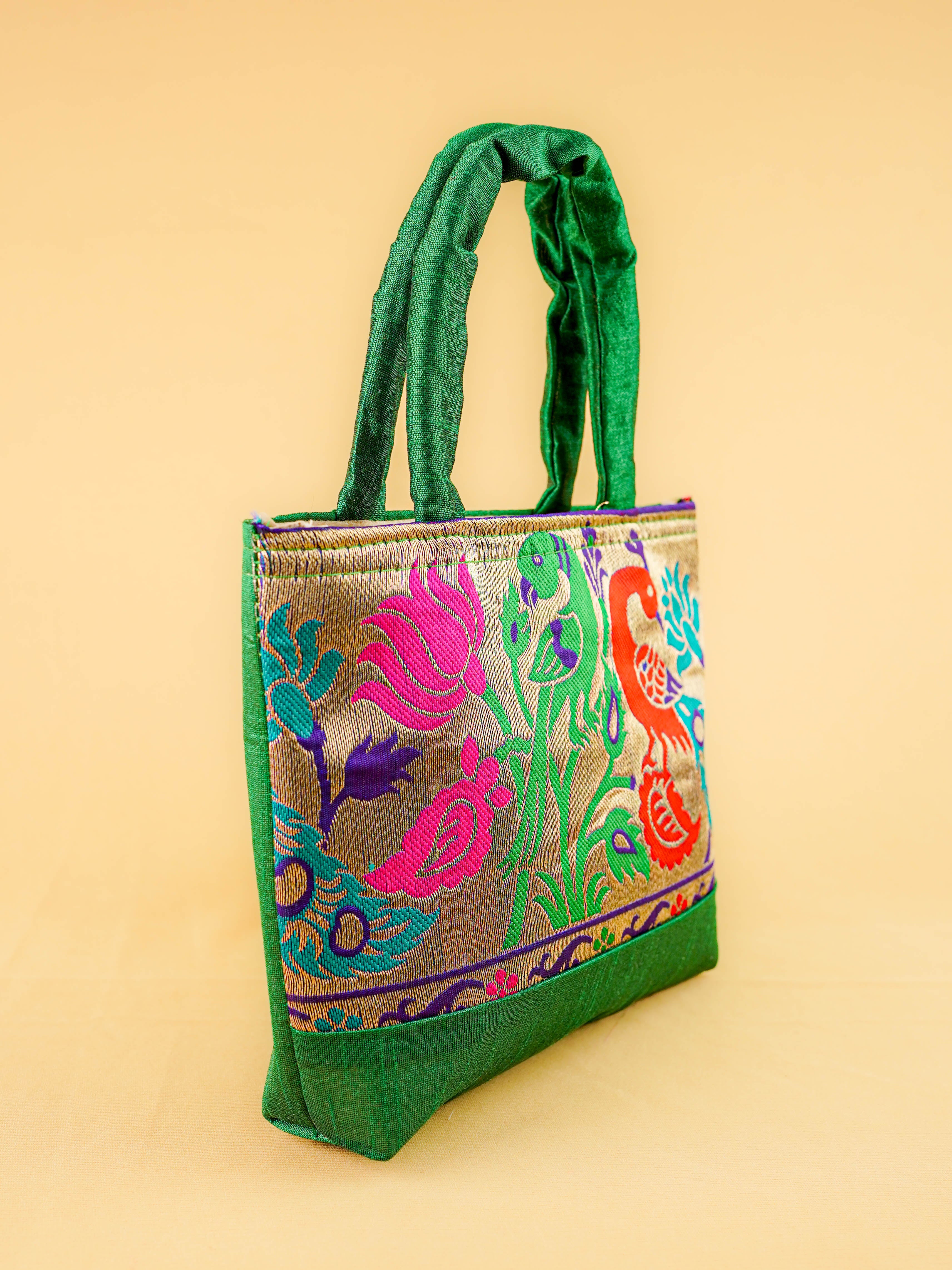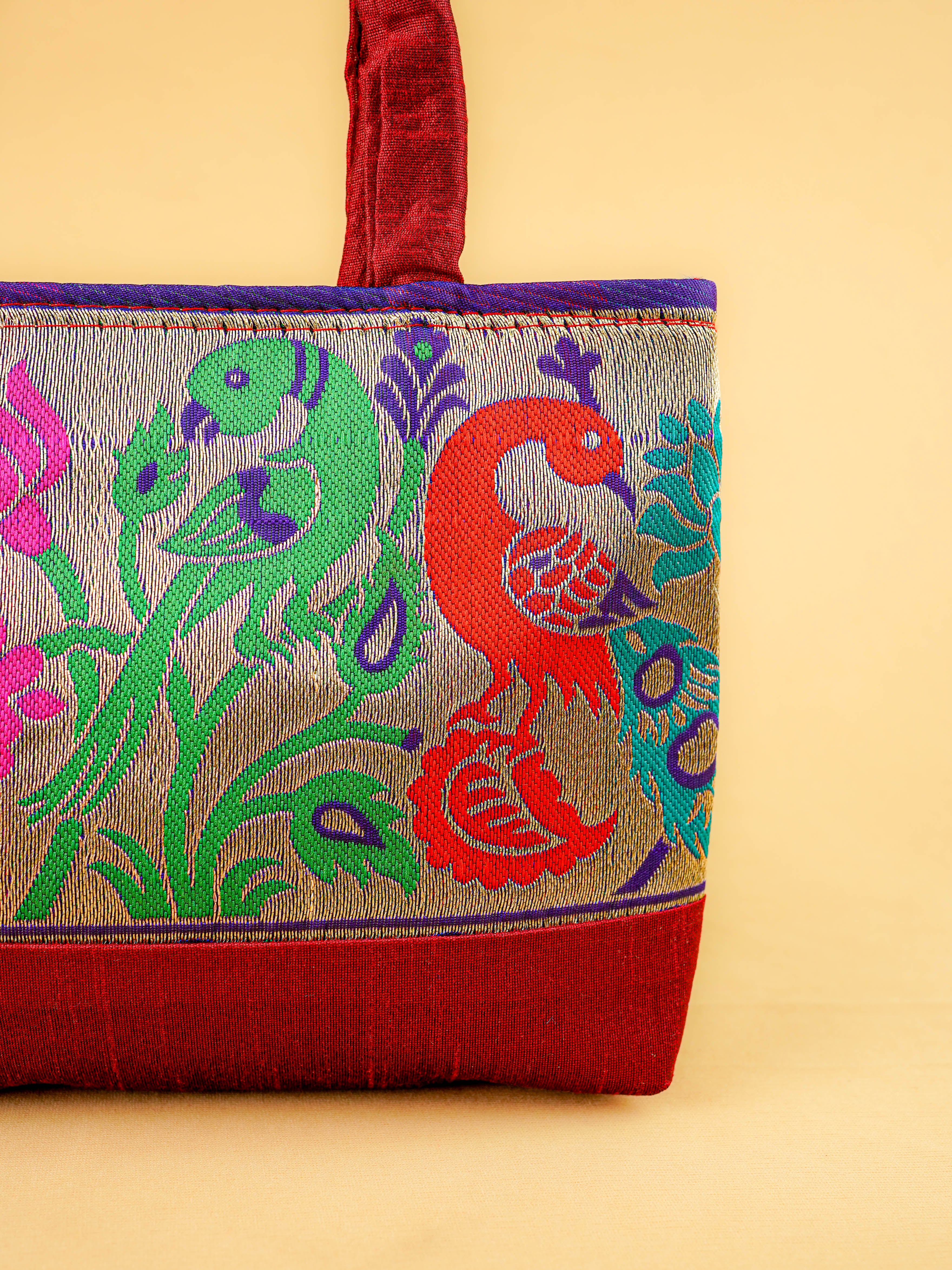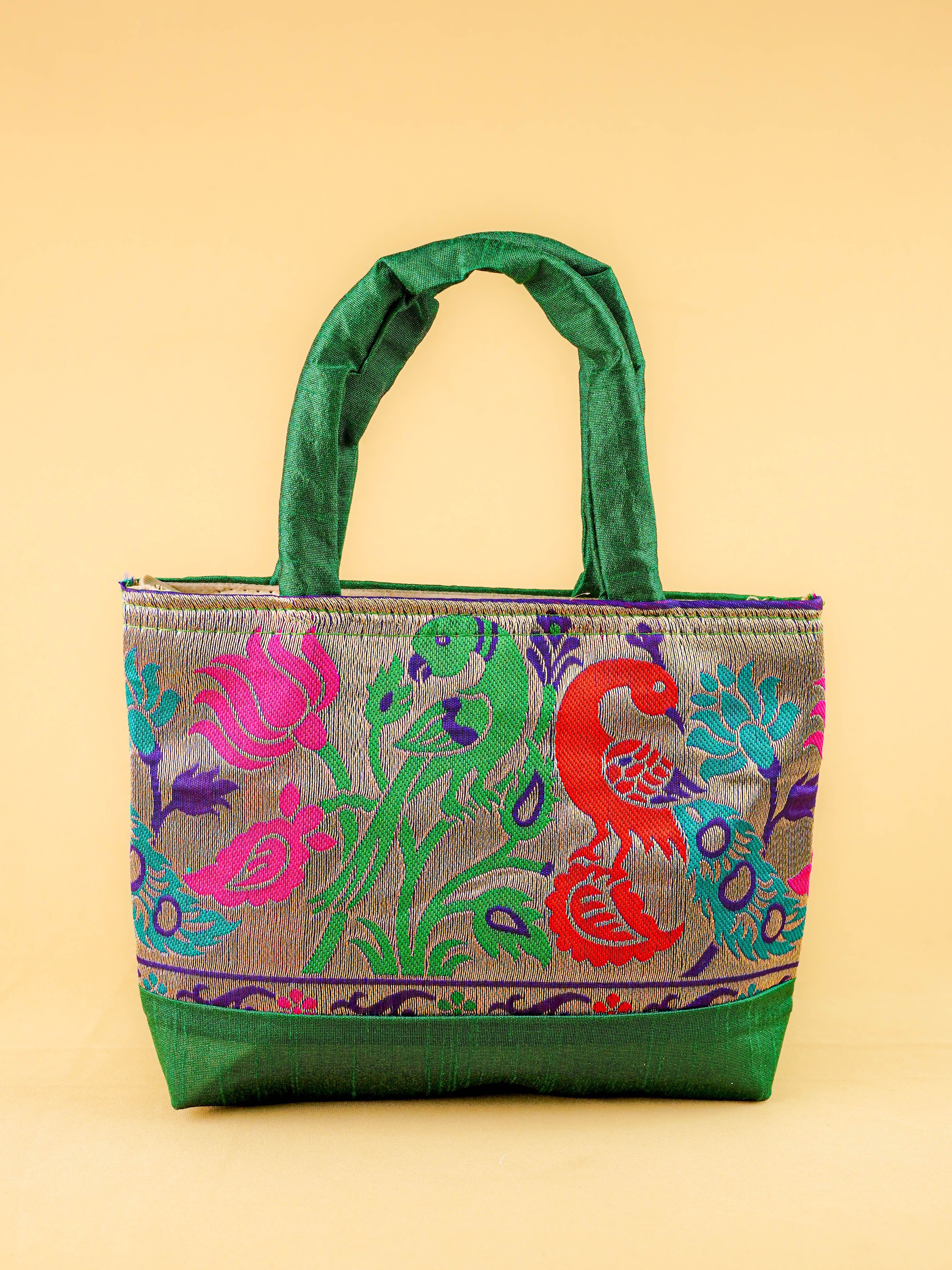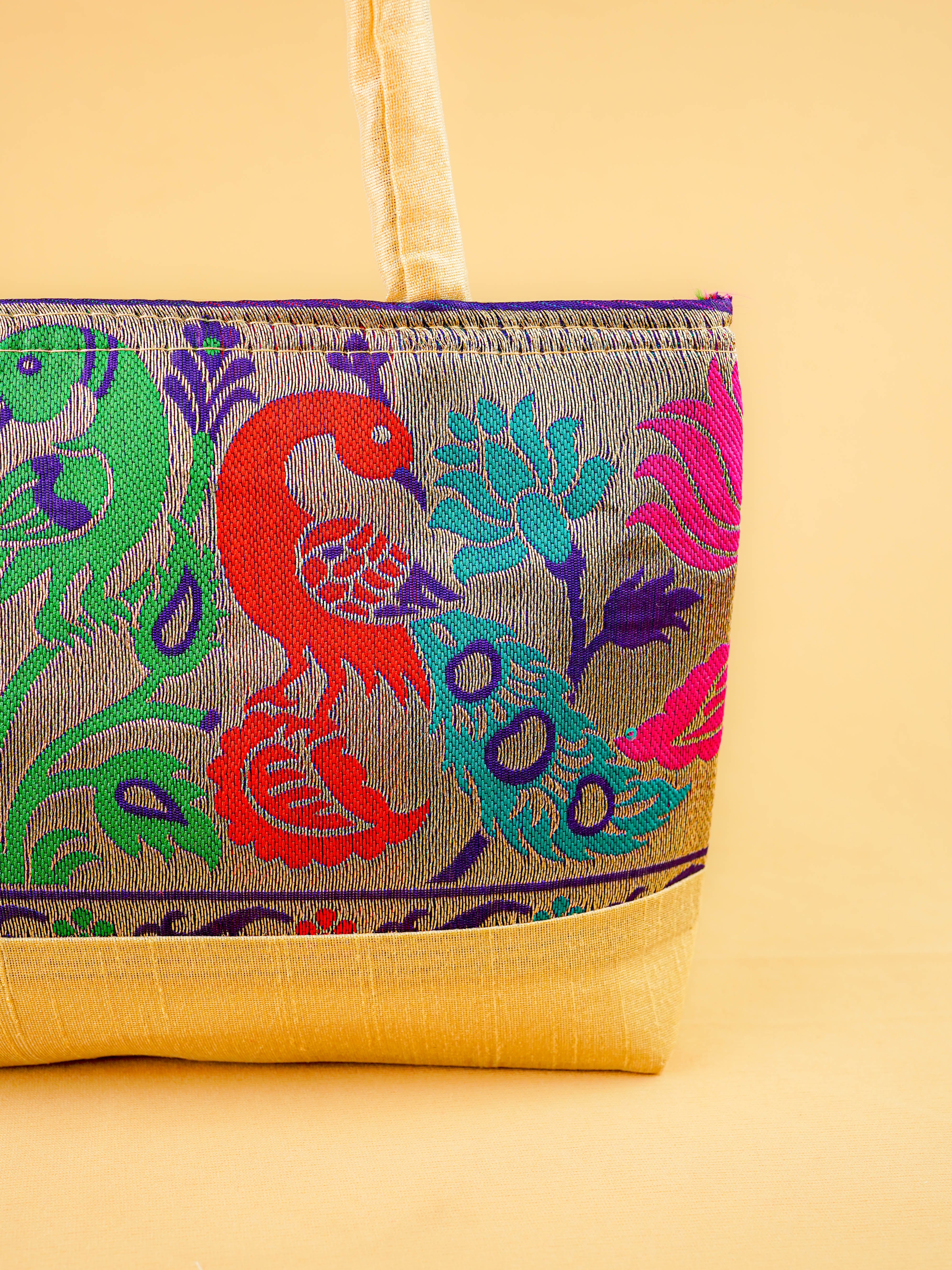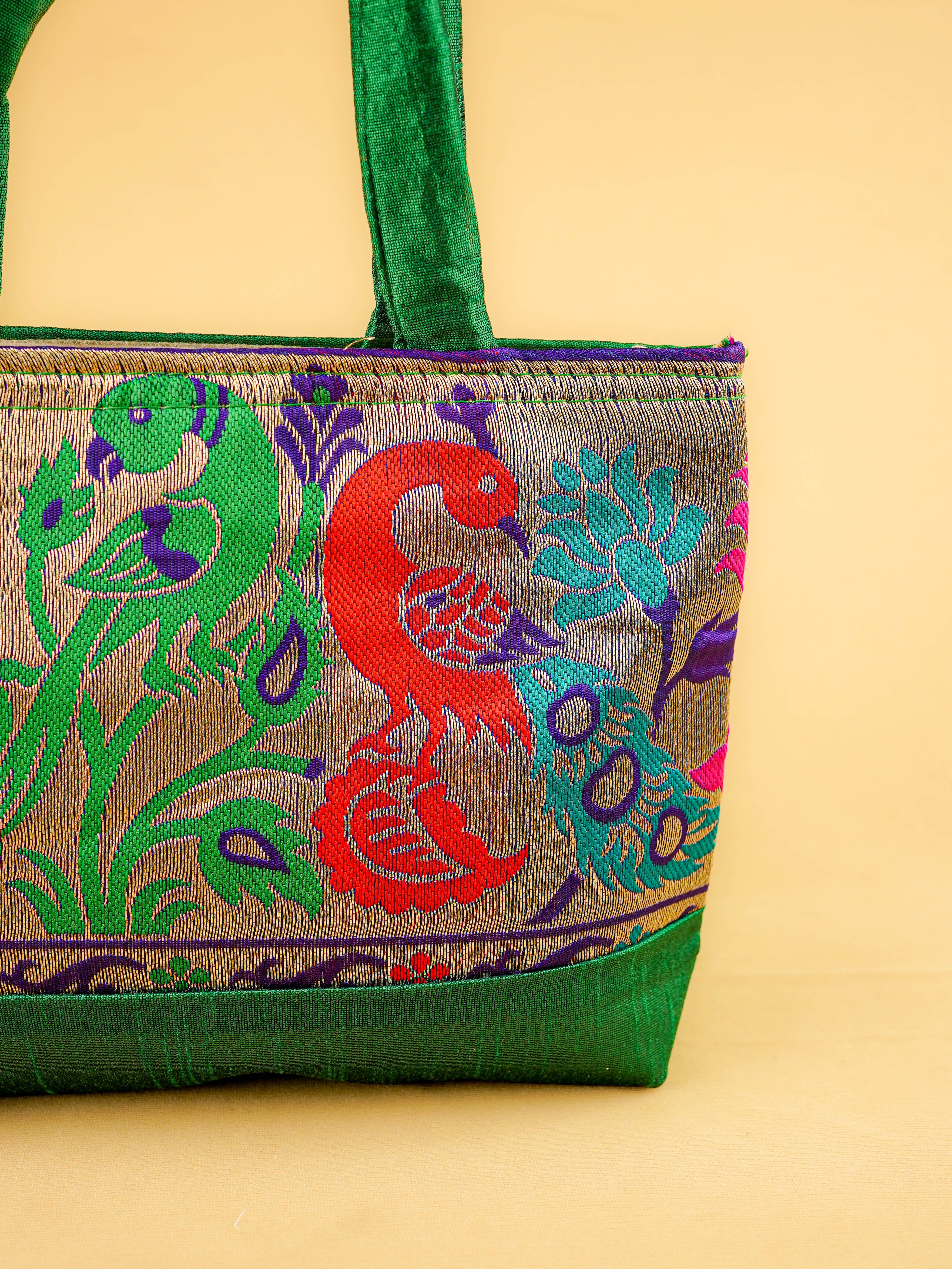 Hand bag raw silk with Peacock design - W3826